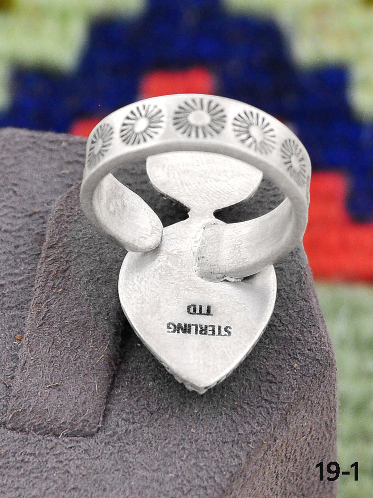 Southwest Made Multi Stone & Sterling Sliver Adjustable Ring. It measures 1 1/8 inches long and 5/8 of an inch wide. Signed by the artist and stamped sterling silver.
