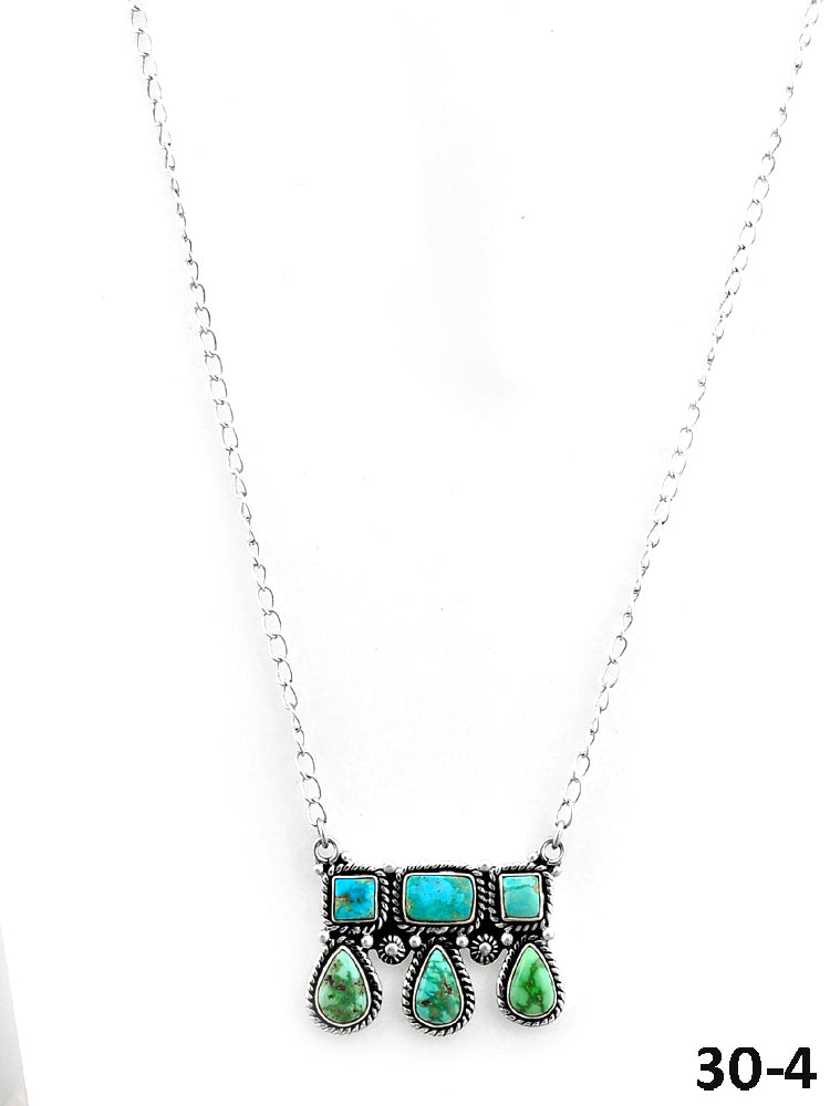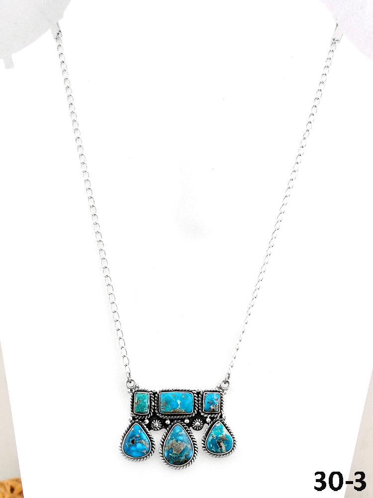 Southwest Made Multistone Turquoise & Sterling Silver Necklace. It measures 20 inches long with hang while the chain measures 18 inches long, and the stones vary. They are 2/8 of an inch, up to 1/2 an inch wide. Signed by the artist and stamped sterling silver.