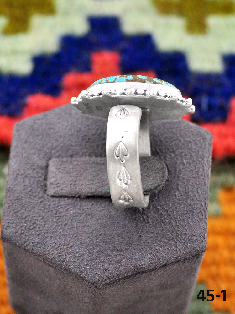 Southwest Made No.8 Turquoise & Sterling Sliver Adjustable Ring. It measures 1 inch long and 3/4 inch wide.