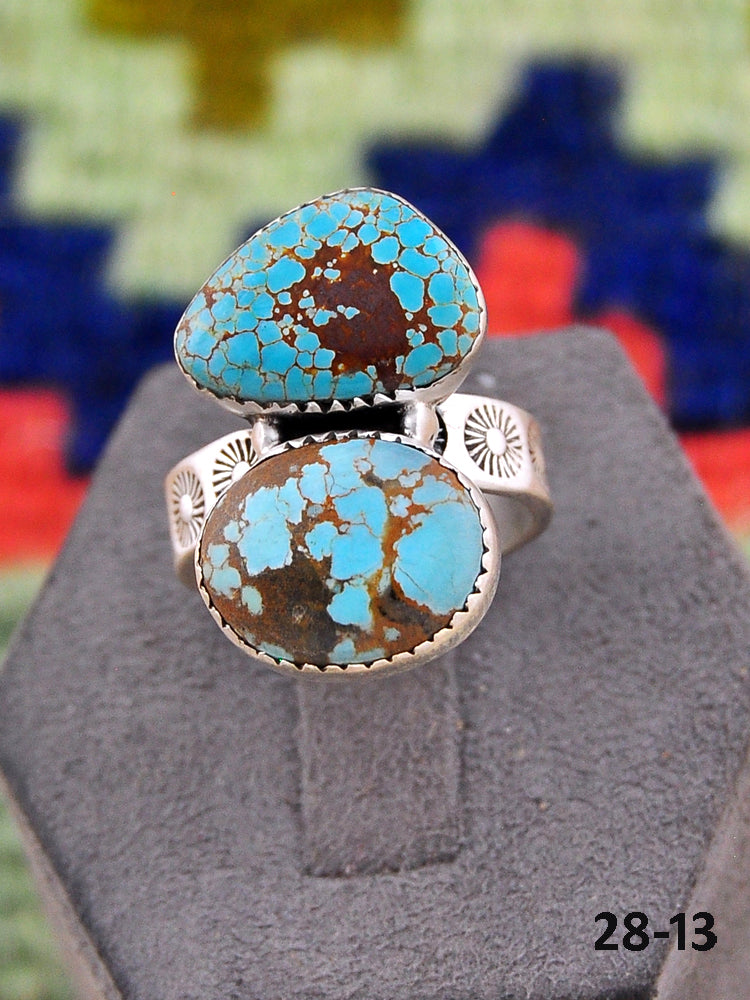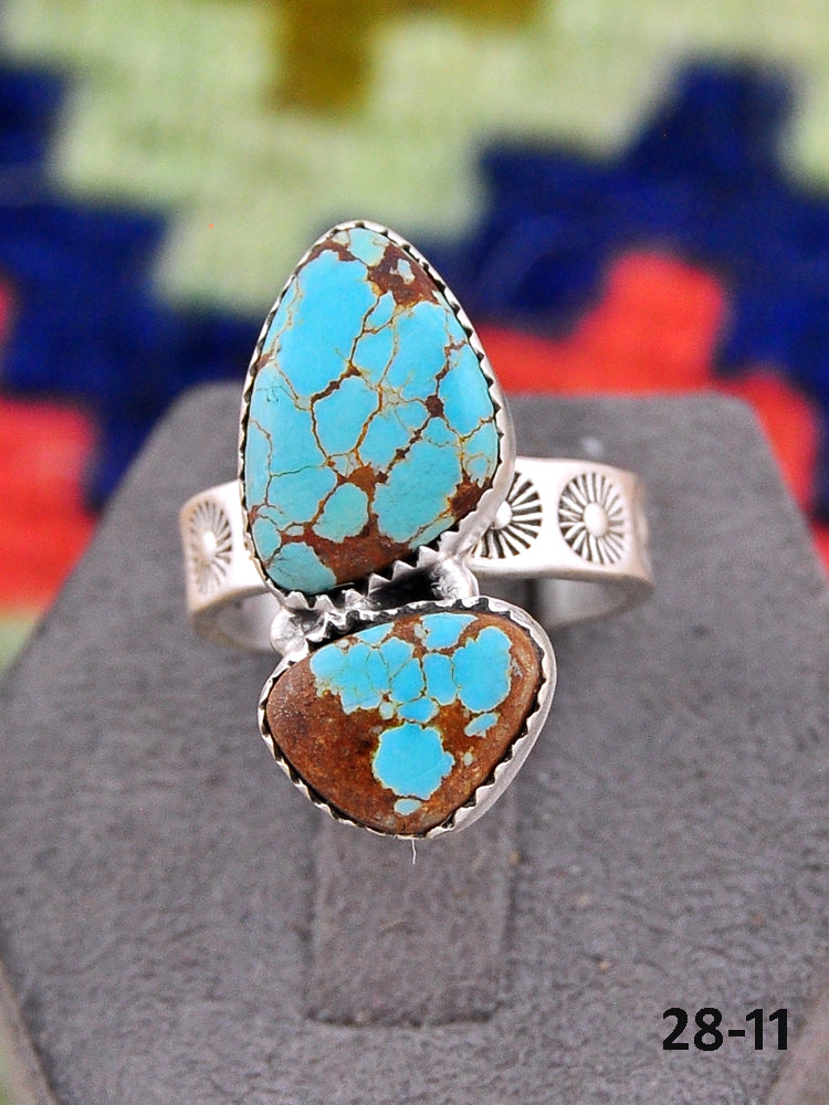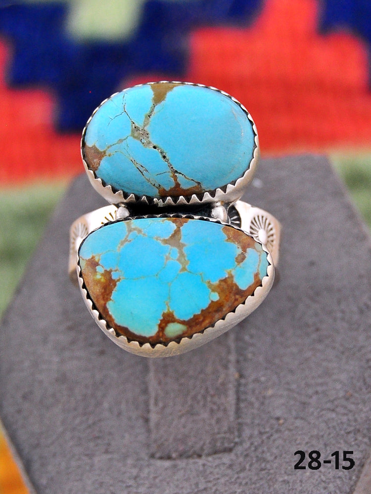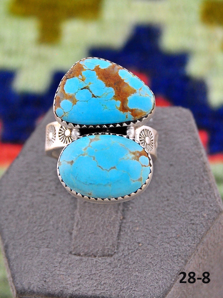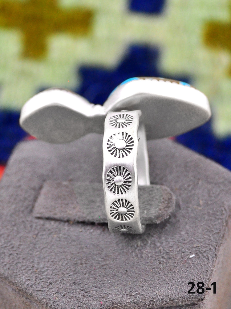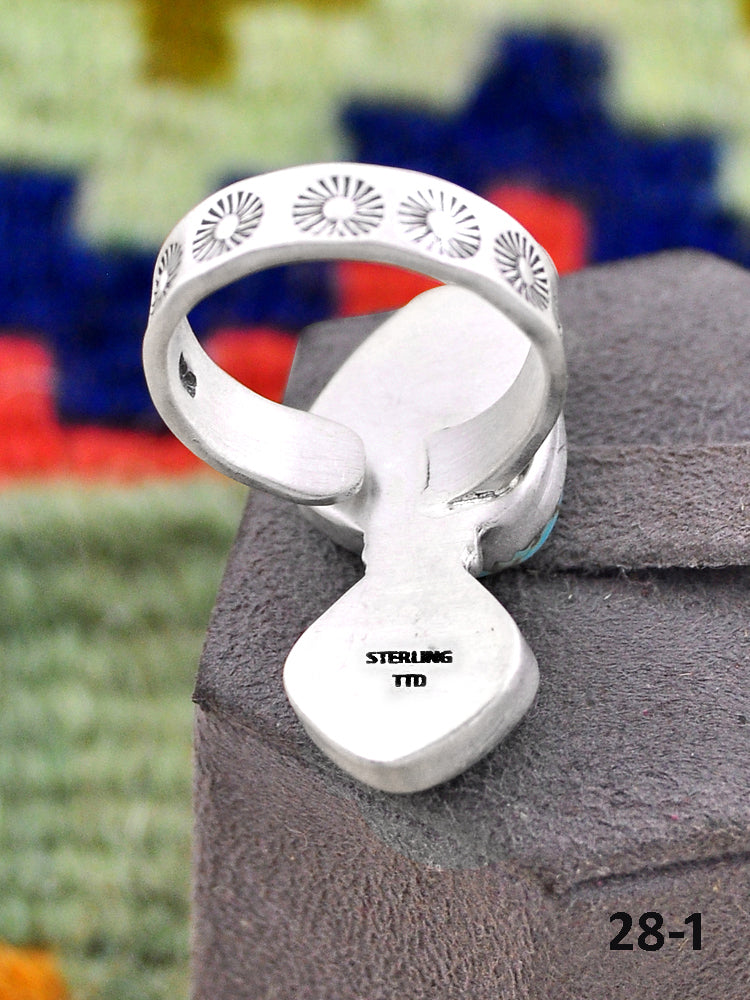 Southwest Made No.8 Turquoise & Sterling Sliver Adjustable Ring. It measures 1 1/8 inches long and 3/4 of an inch wide. Signed by the artist and stamped sterling silver.