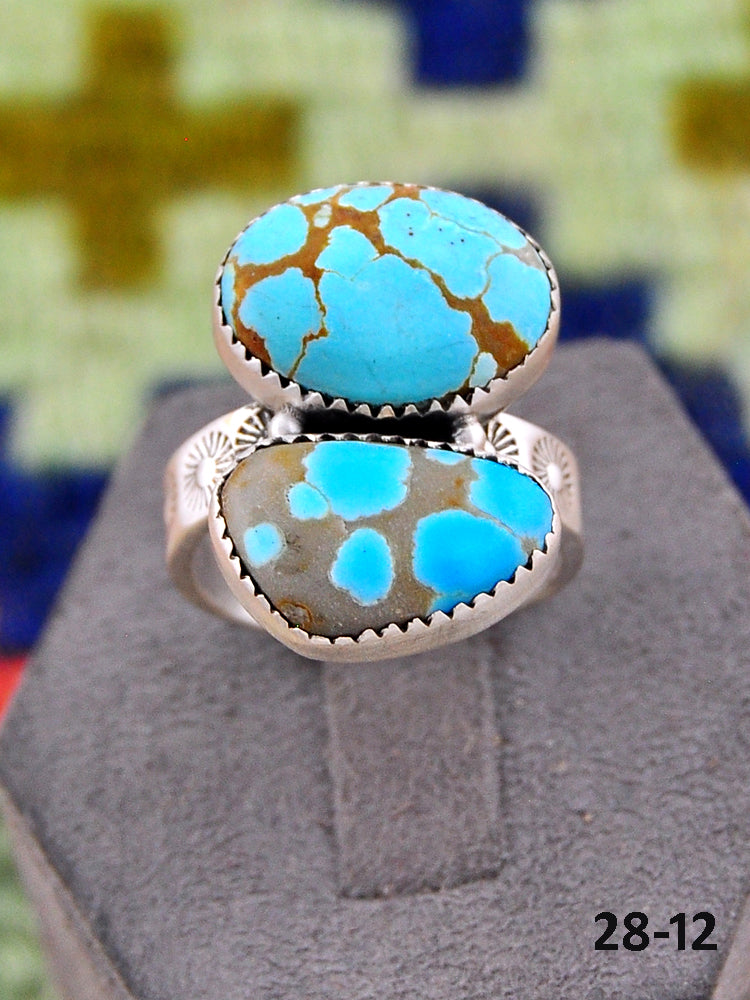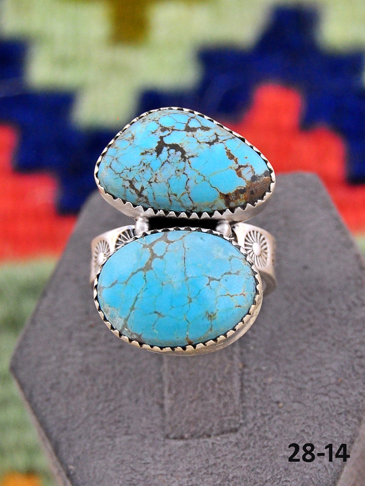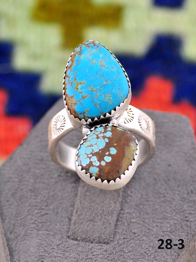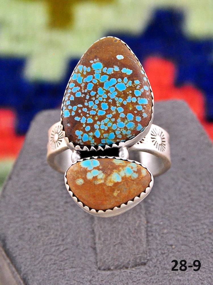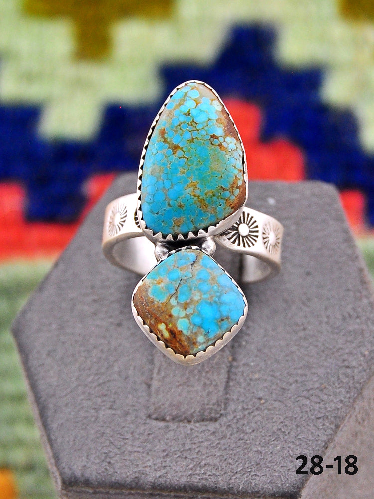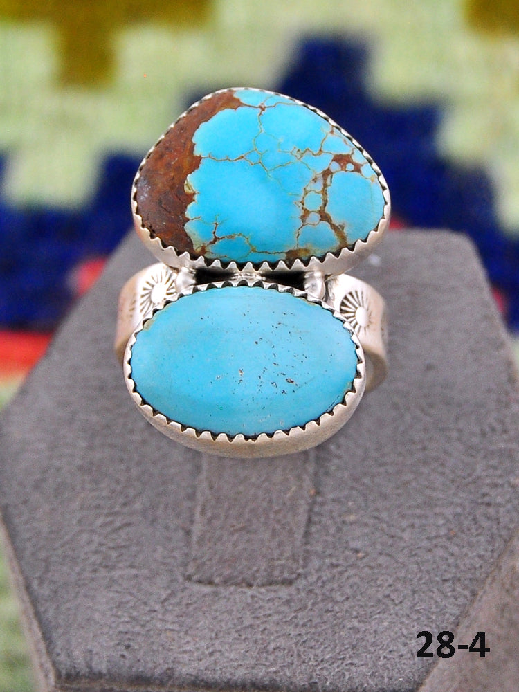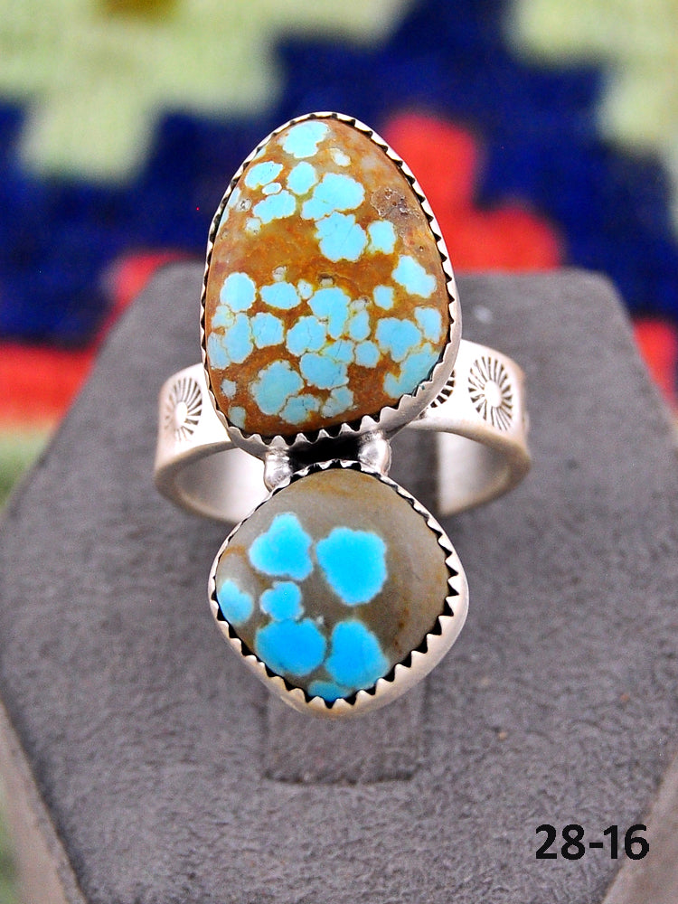 Southwest Made No.8 Turquoise & Sterling Sliver Adjustable Ring. It measures 1 1/8 inches long and 3/4 of an inch wide. Signed by the artist and stamped sterling silver.