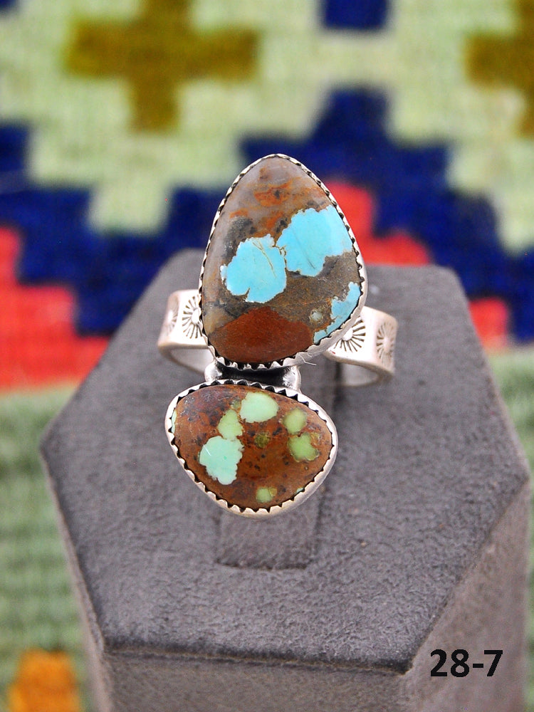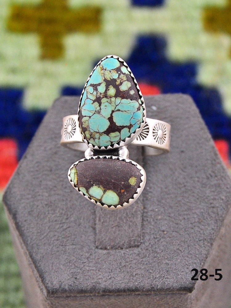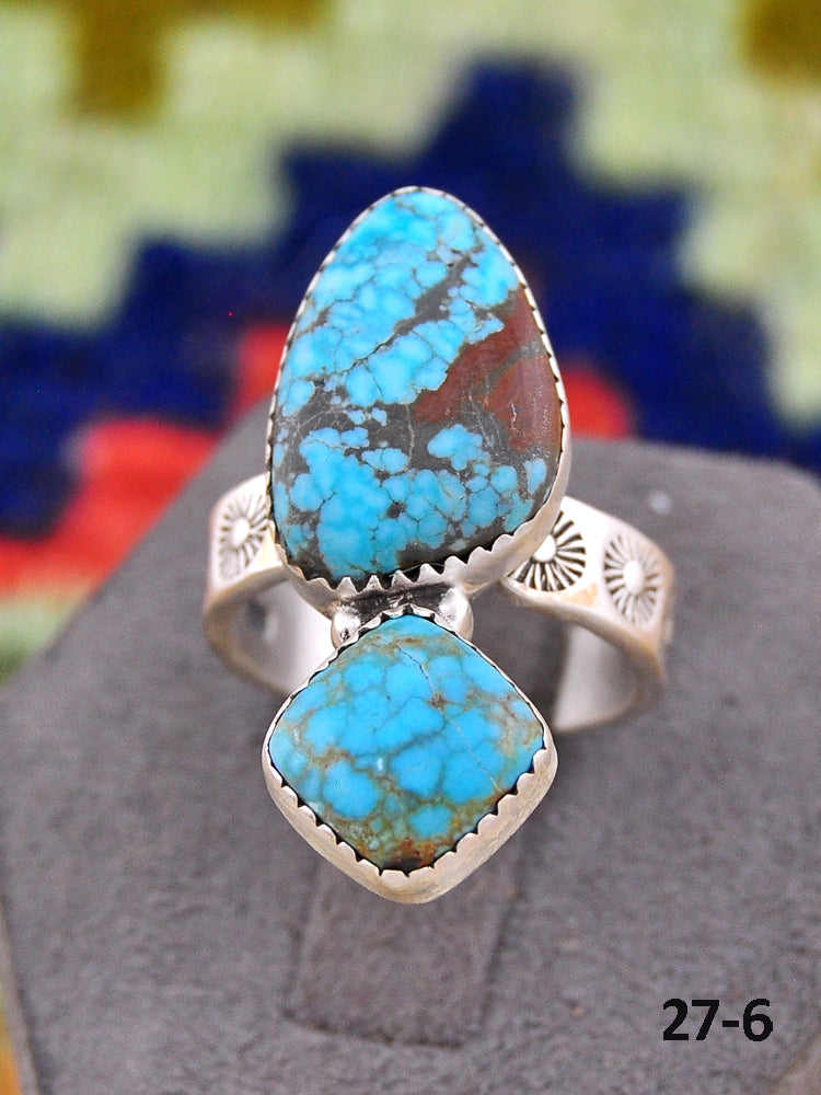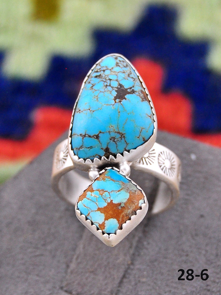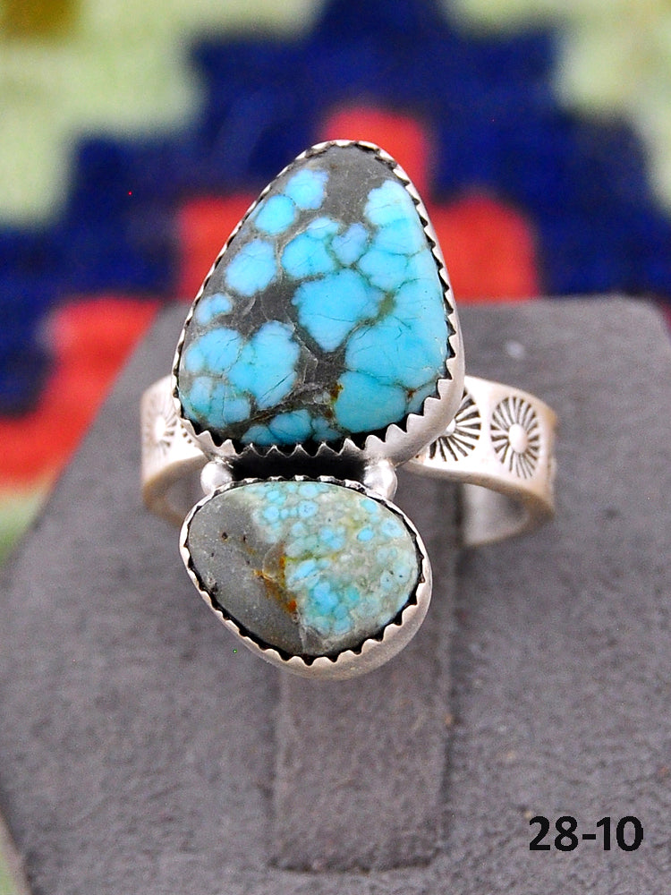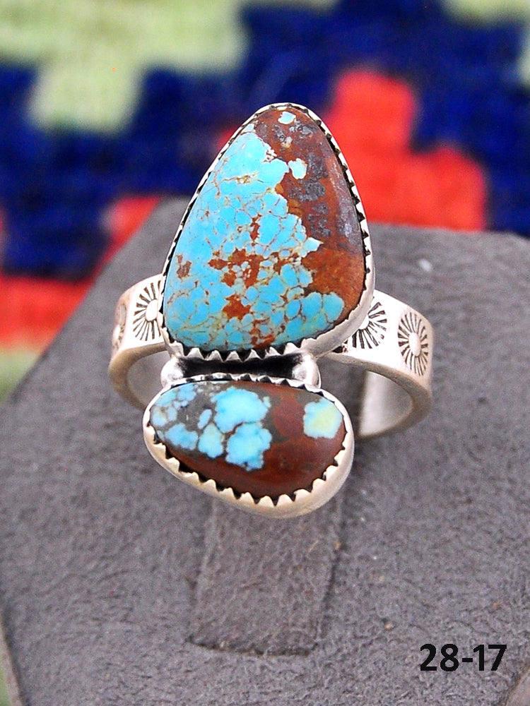Southwest Made No.8 Turquoise & Sterling Sliver Adjustable Ring. It measures 1 1/8 inches long and 3/4 of an inch wide. Signed by the artist and stamped sterling silver.