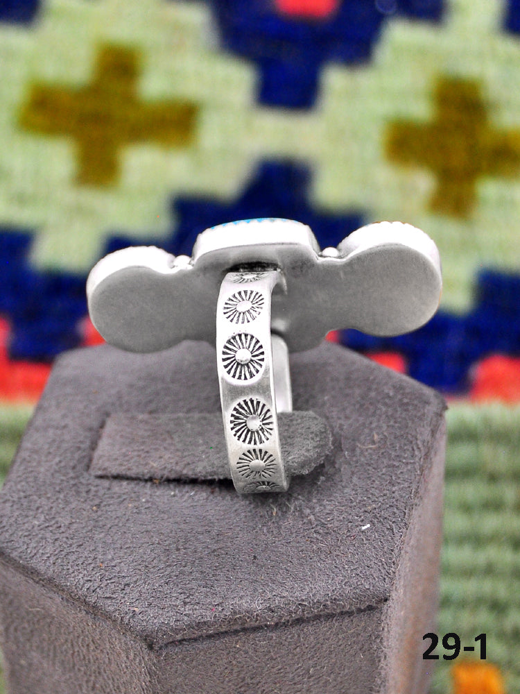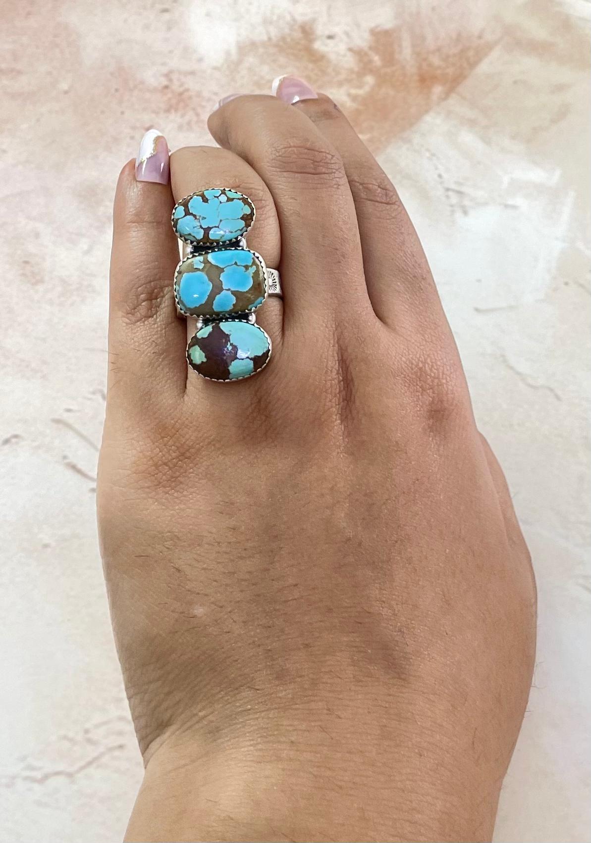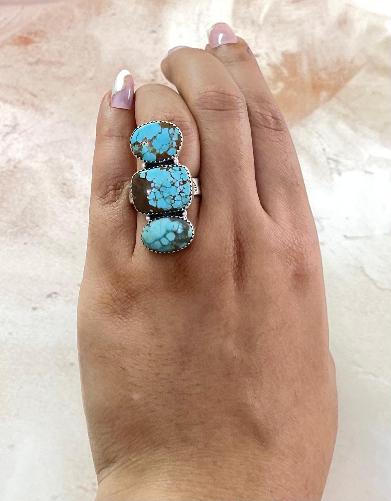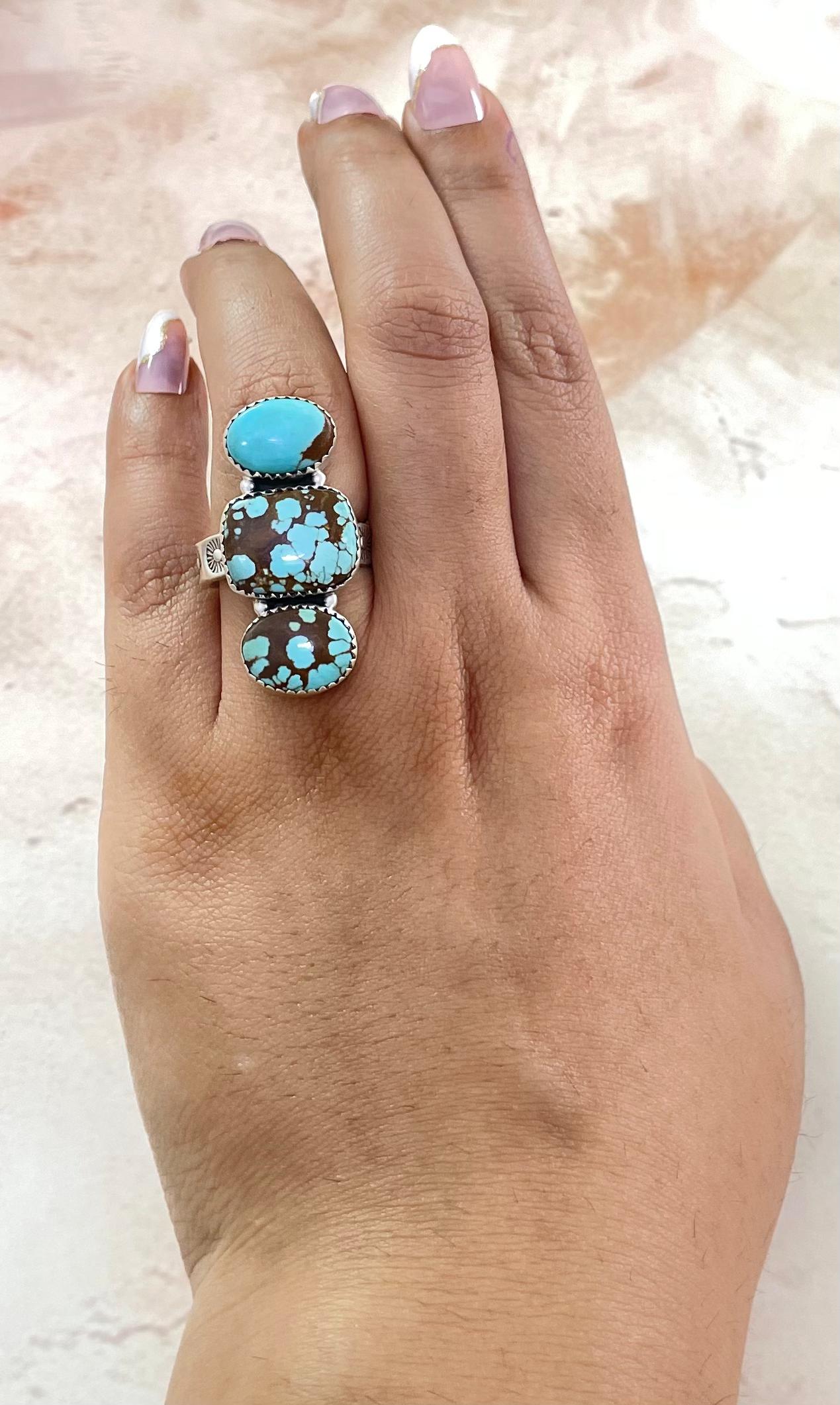 Southwest Made No.8 Turquoise & Sterling Sliver Adjustable Ring. It measures 1 1/2 inches long and 3/4 of an inch wide. Signed by the artist and stamped sterling silver.