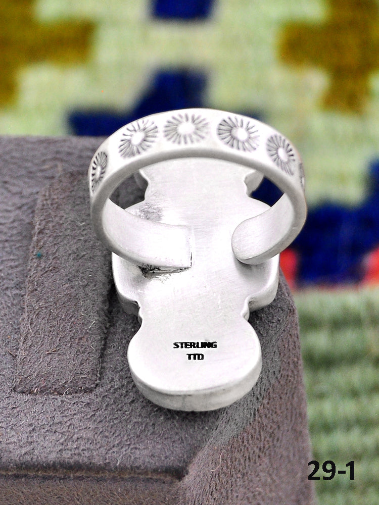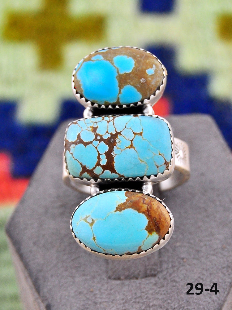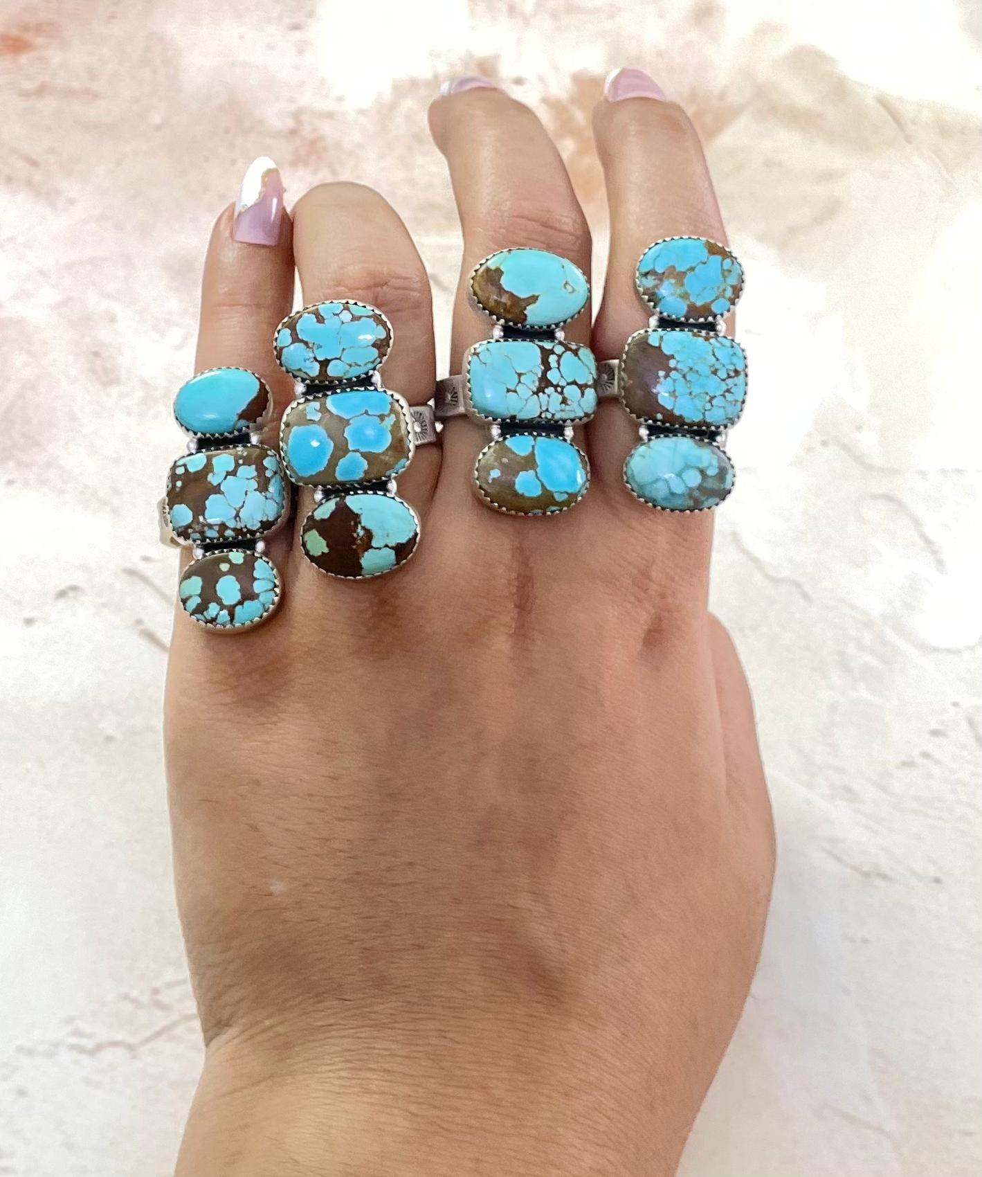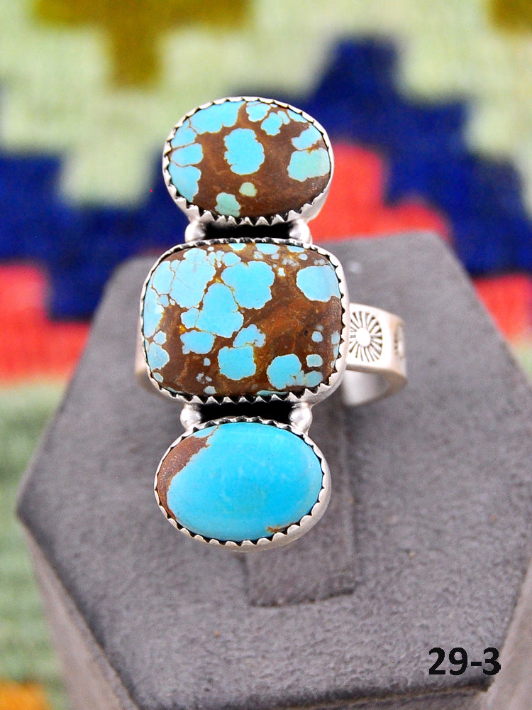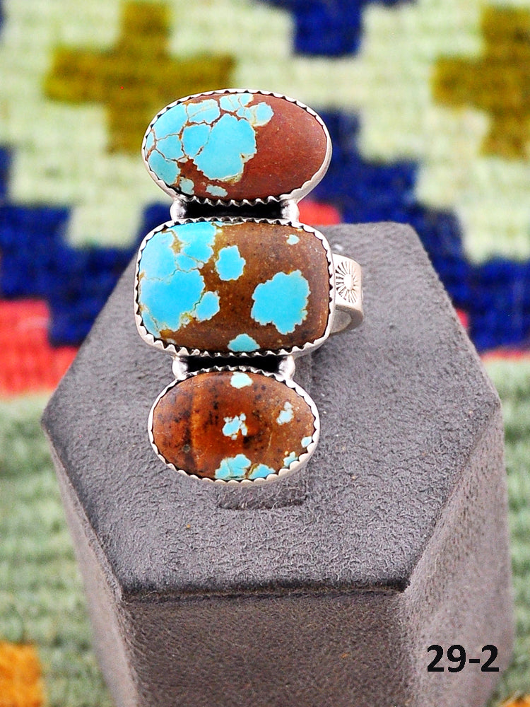 Southwest Made No.8 Turquoise & Sterling Sliver Adjustable Ring. It measures 1 1/2 inches long and 3/4 of an inch wide. Signed by the artist and stamped sterling silver.