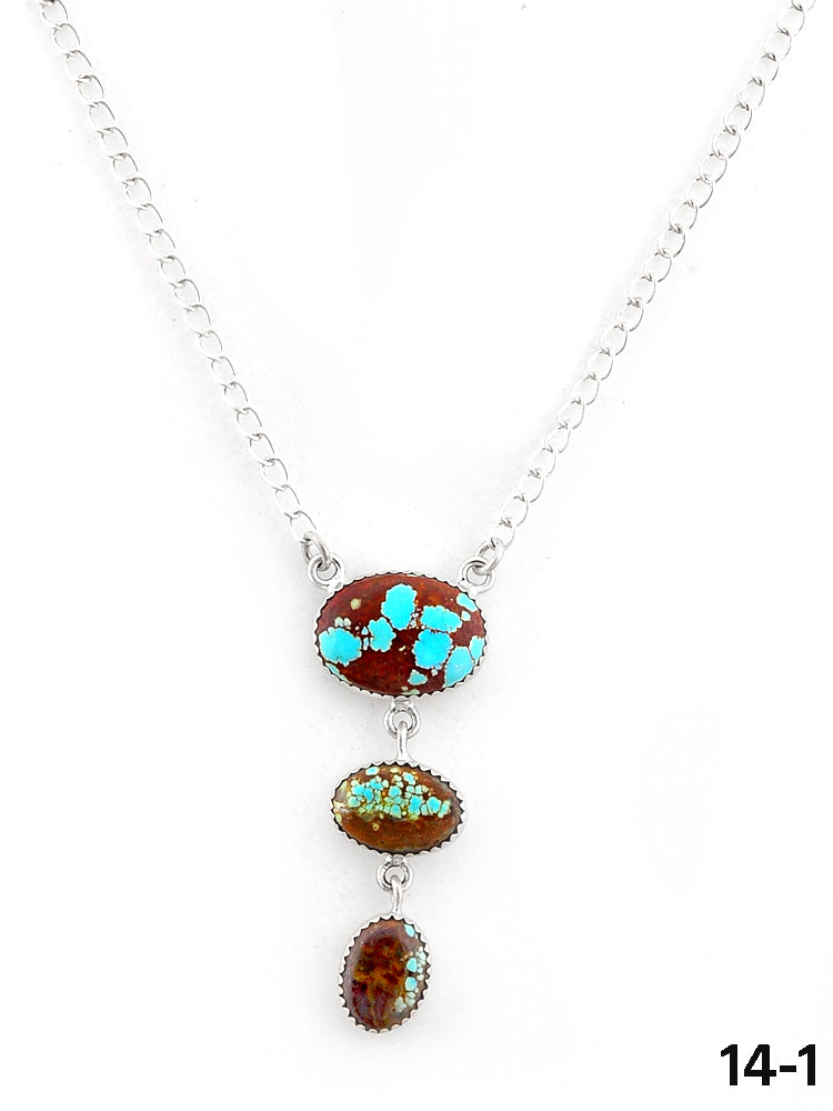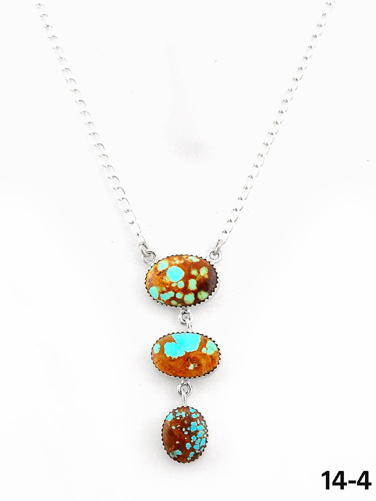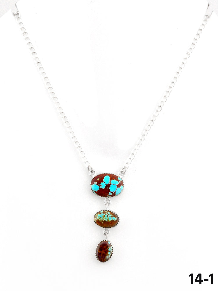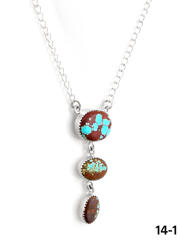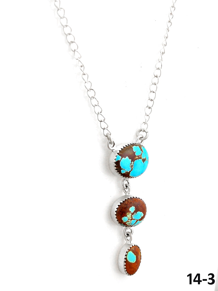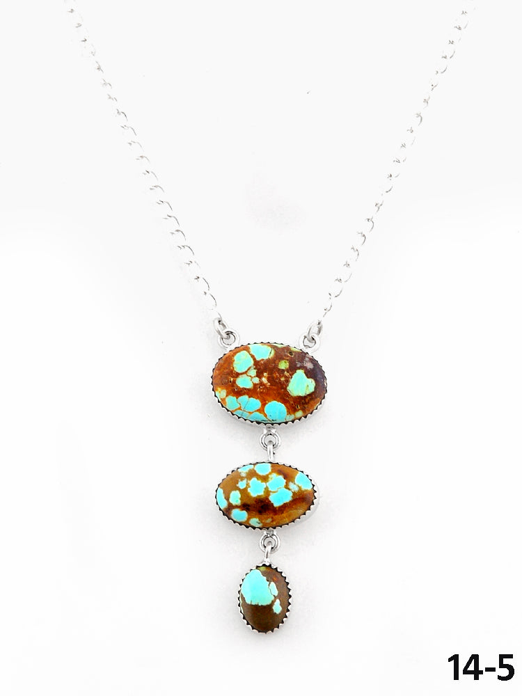 Southwest Made No.8 Turquoise & Sterling Silver Necklace. It measures 22 inches long with hang while the chain measures 18 inches long. Signed by the artist and stamped sterling silver.