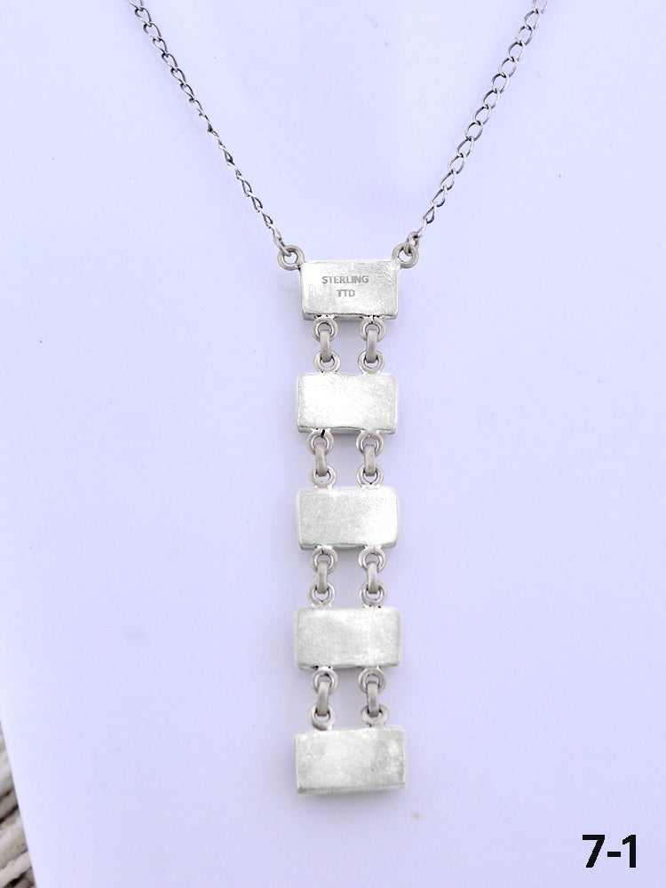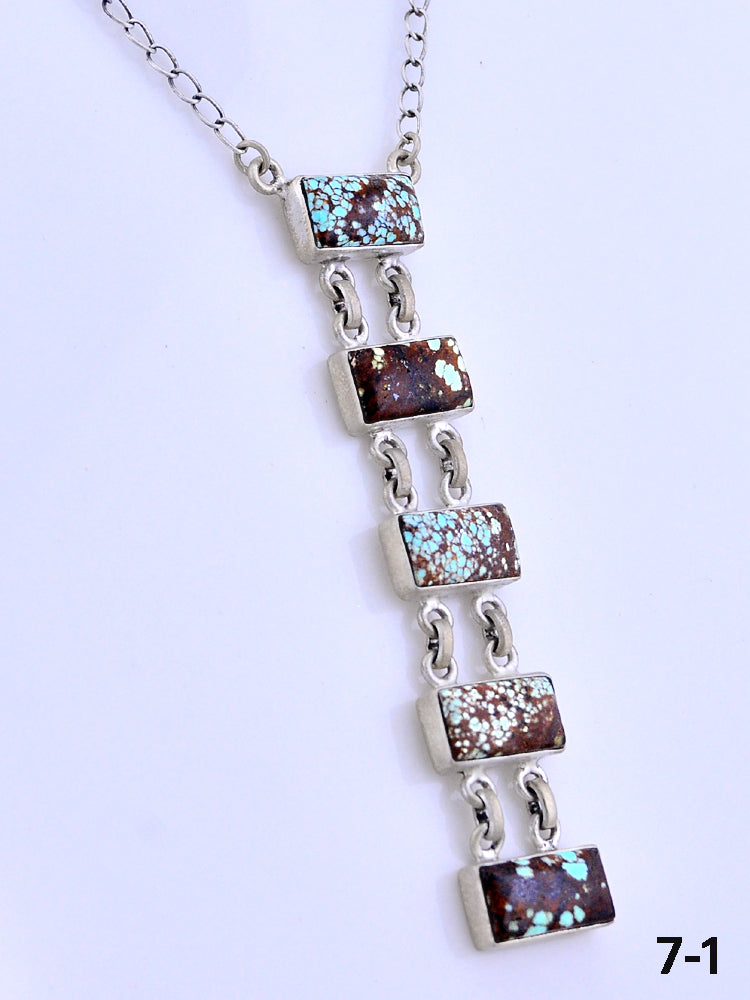 Southwest Made No.8 Turquoise and Sterling Silver Necklace. It measures 26 inches long with hang while the chain measures 19 1/4 inches long with drop 3 1/2 inches. Signed by the artist and stamped sterling silver.