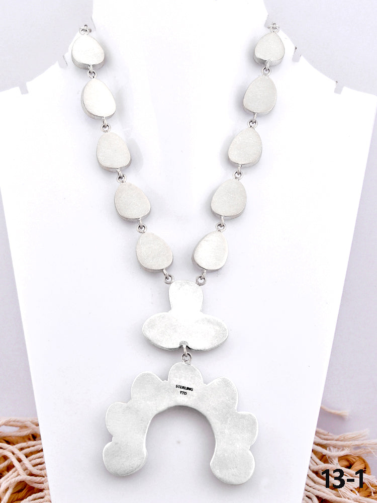Southwest Made Peacock Dahlia and Sterling Silver Naja Necklace. It measures just over 24 inches long with hang while the chain measures 22 inches long along with a drop which measures 3 1/2 inches. Signed by the artist and stamped sterling silver.
