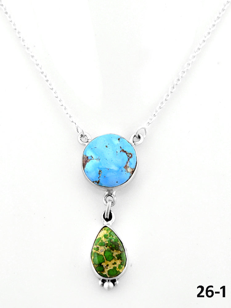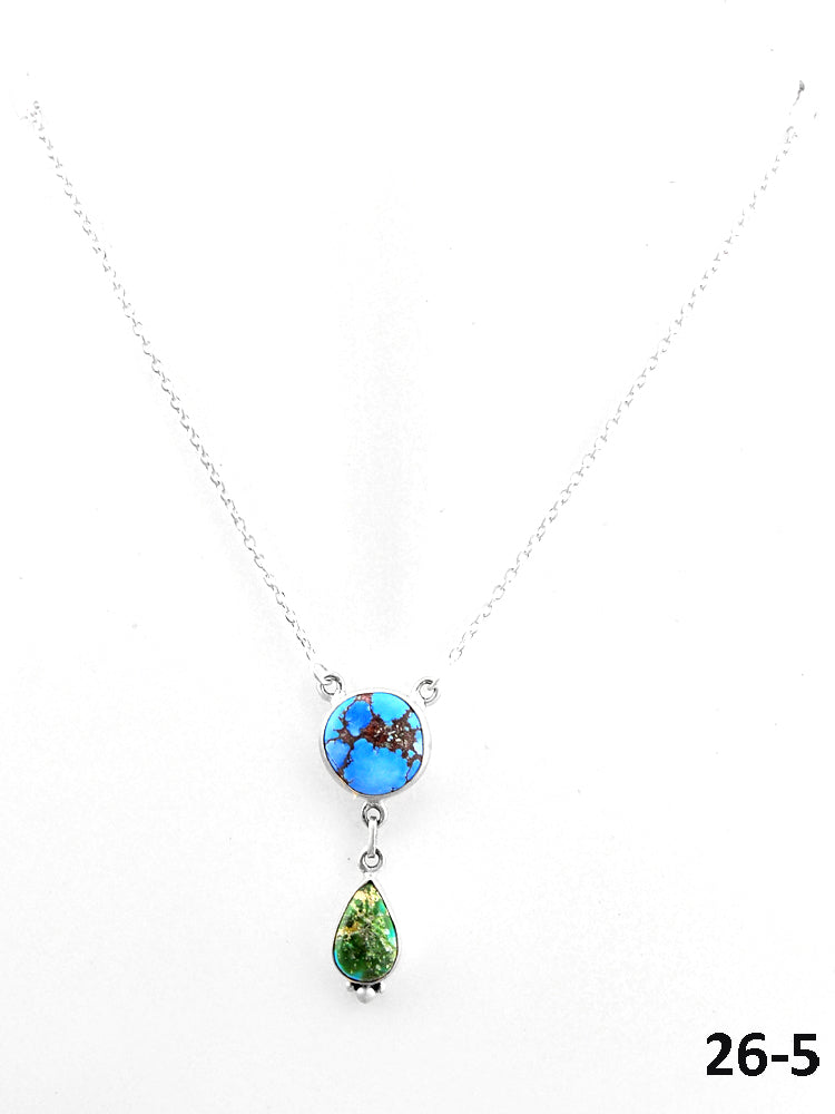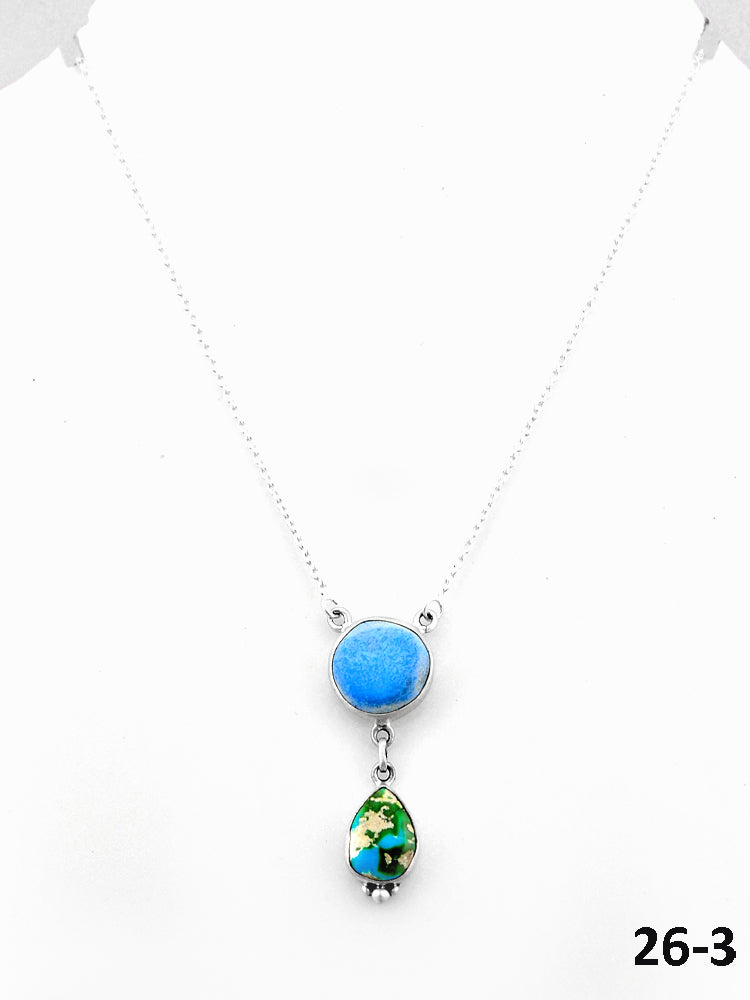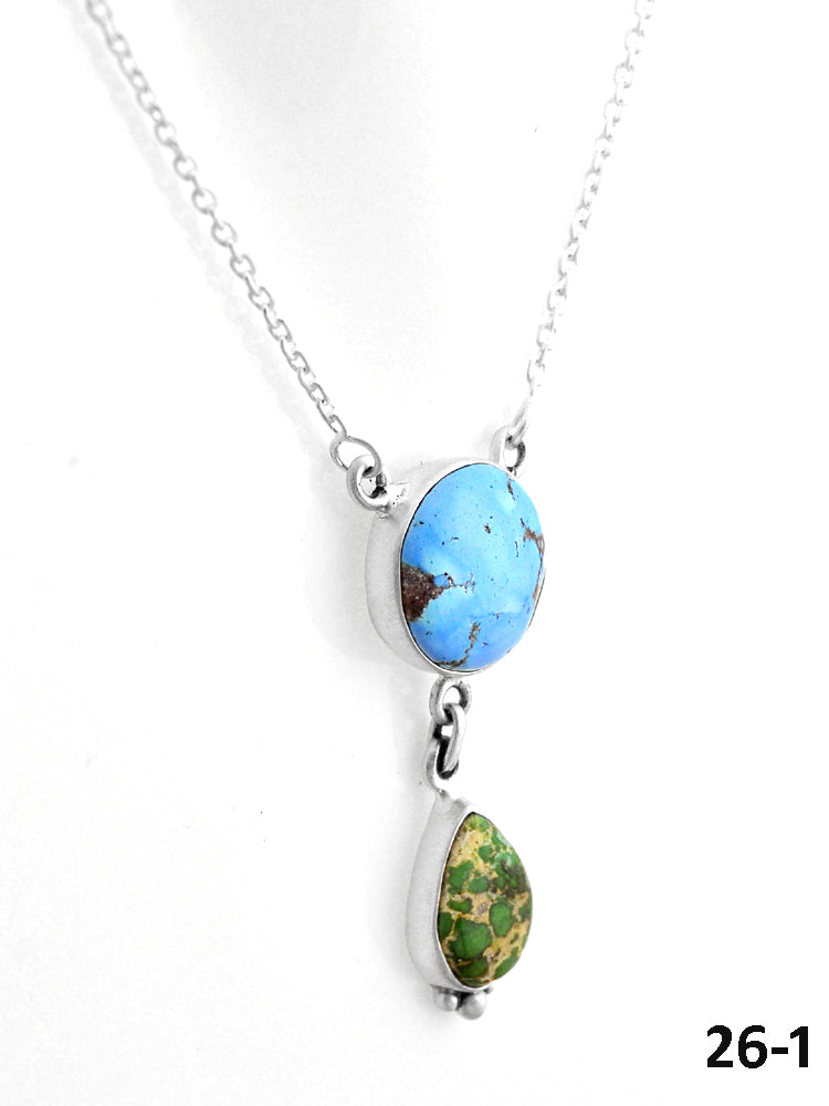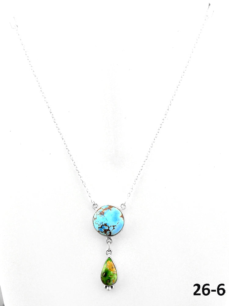 Southwest Made Sonoran Gold, Golden Hills & Sterling Silver Necklace. It measures just over 21 inches long with hang while the chain measures 18 inches long, with drop 1 3/4. Signed by the artist and stamped sterling silver.
