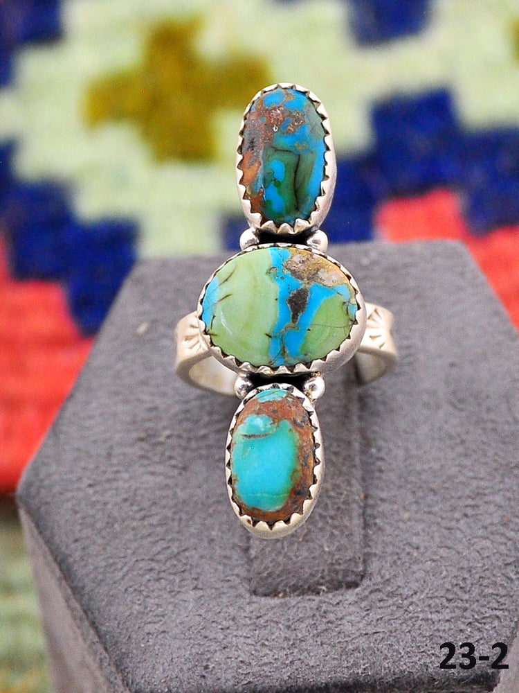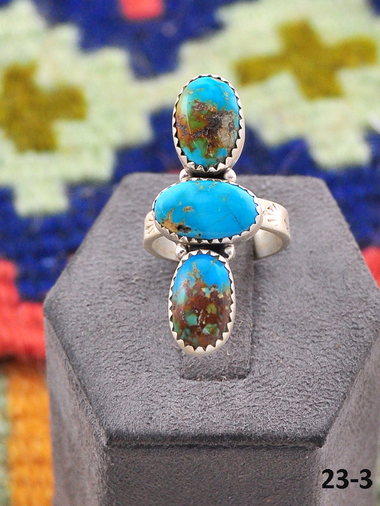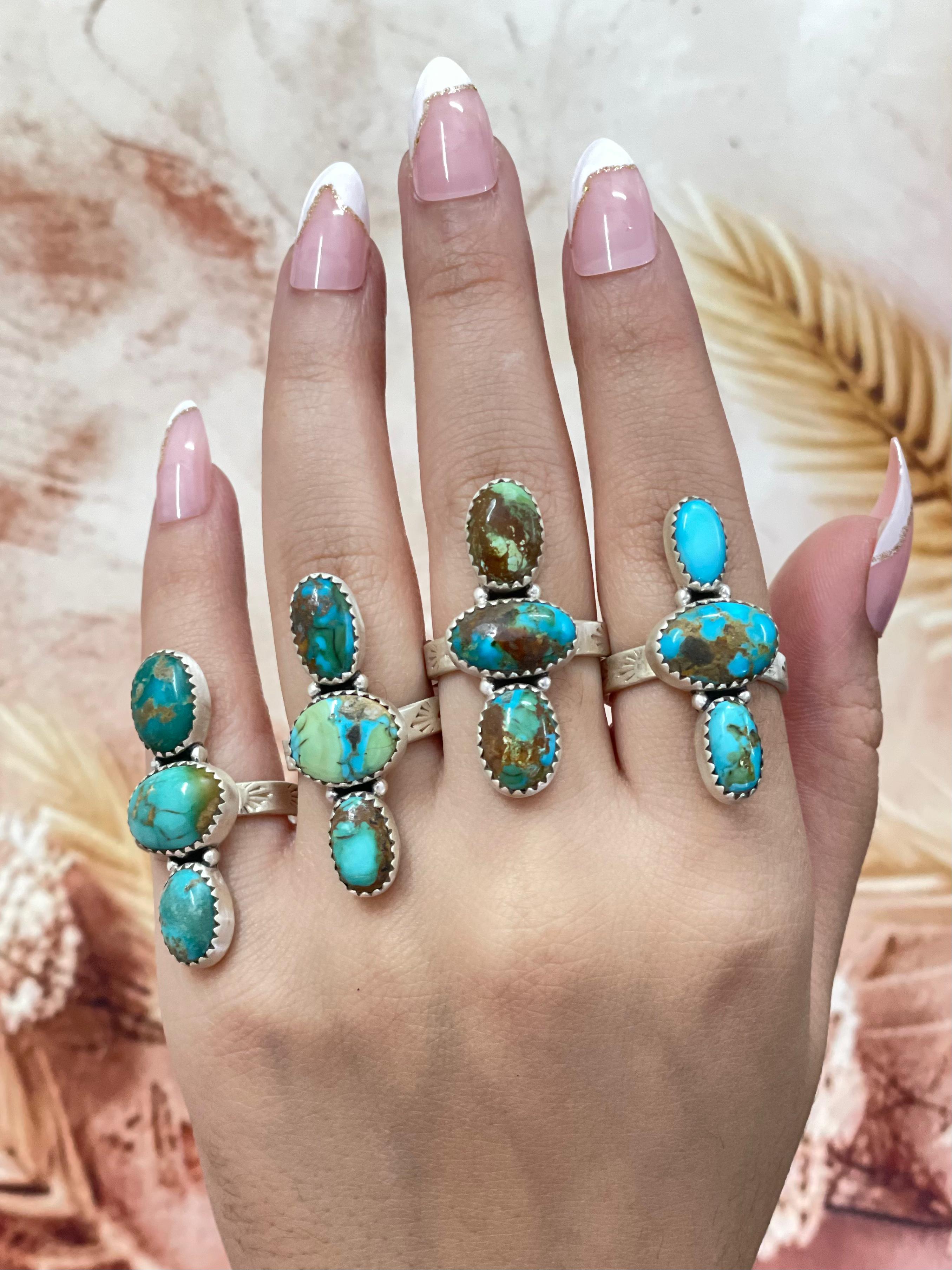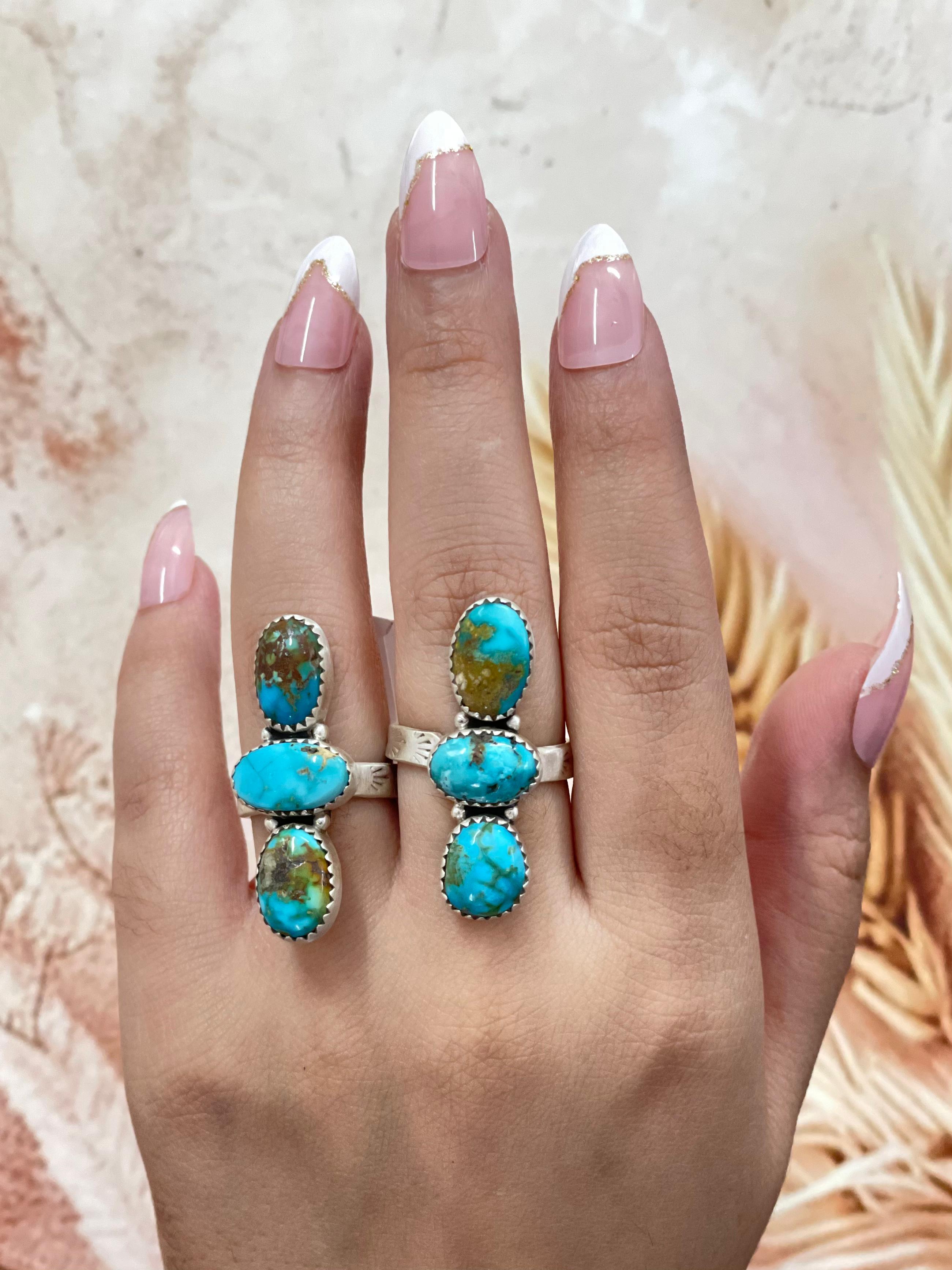 Southwest Made South Hill Turquoise & Sterling Sliver Adjustable Ring. It measures 1 1/2 inches long and 5/8 of an inch wide. Signed by the artist and stamped sterling silver.