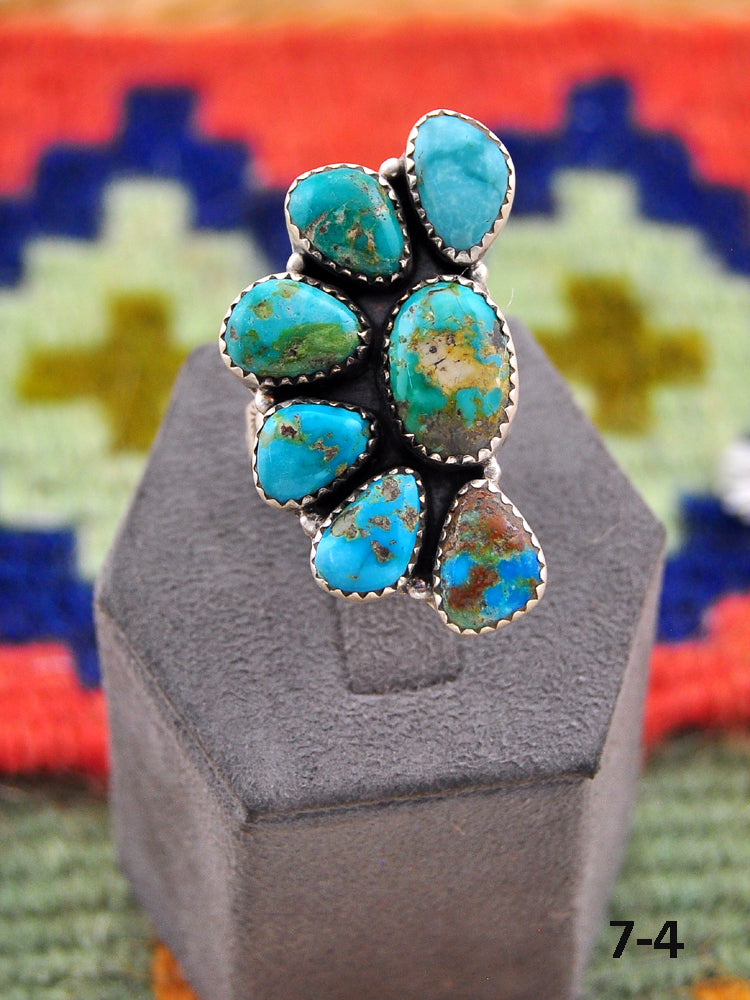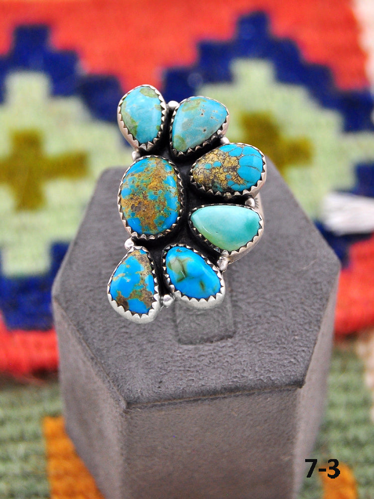 Southwest Made South Hill Turquoise & Sterling Sliver Adjustable Ring. It measures 1 1/2 inches long and 1 inch wide. Signed by the artist and stamped sterling silver.