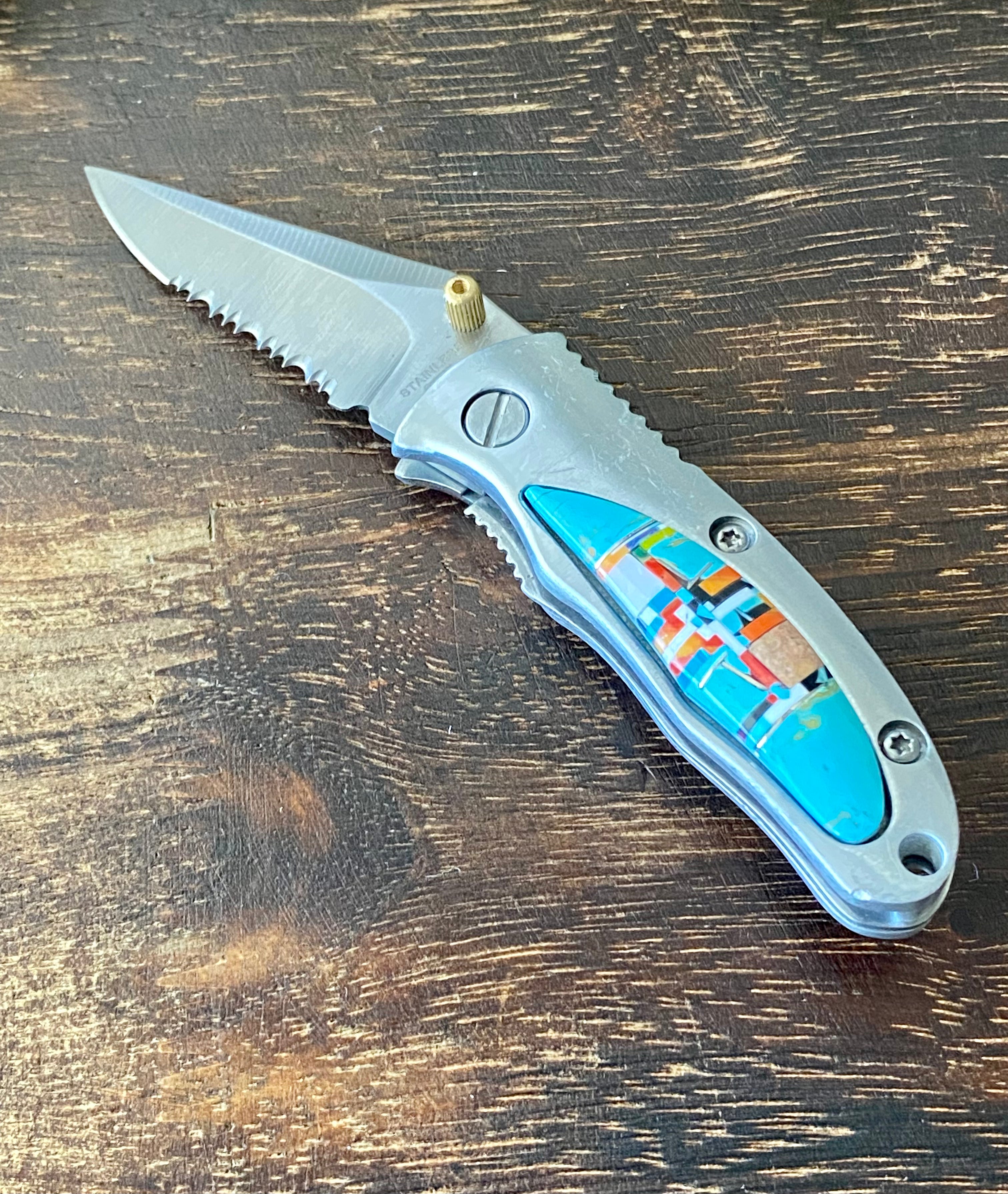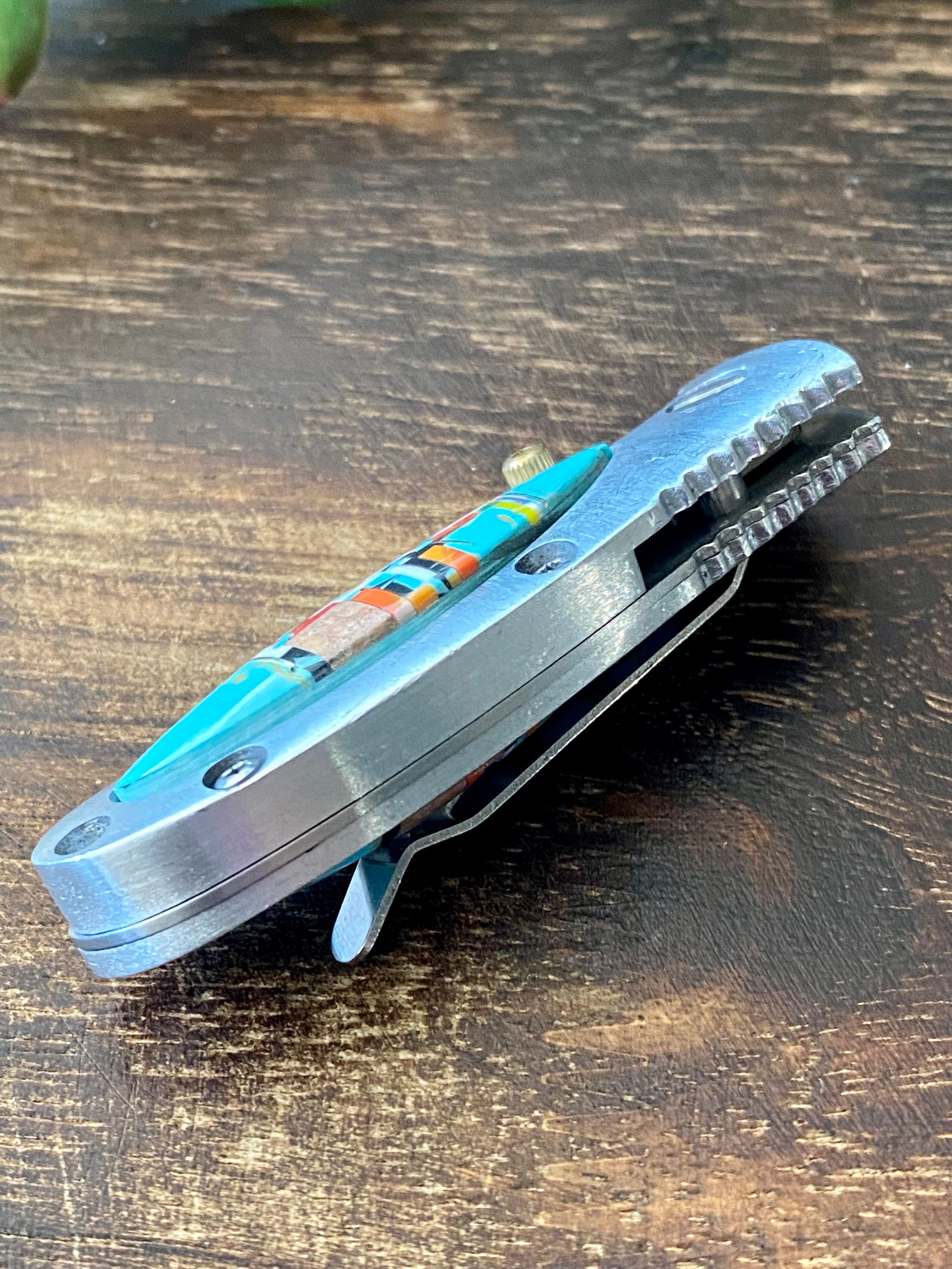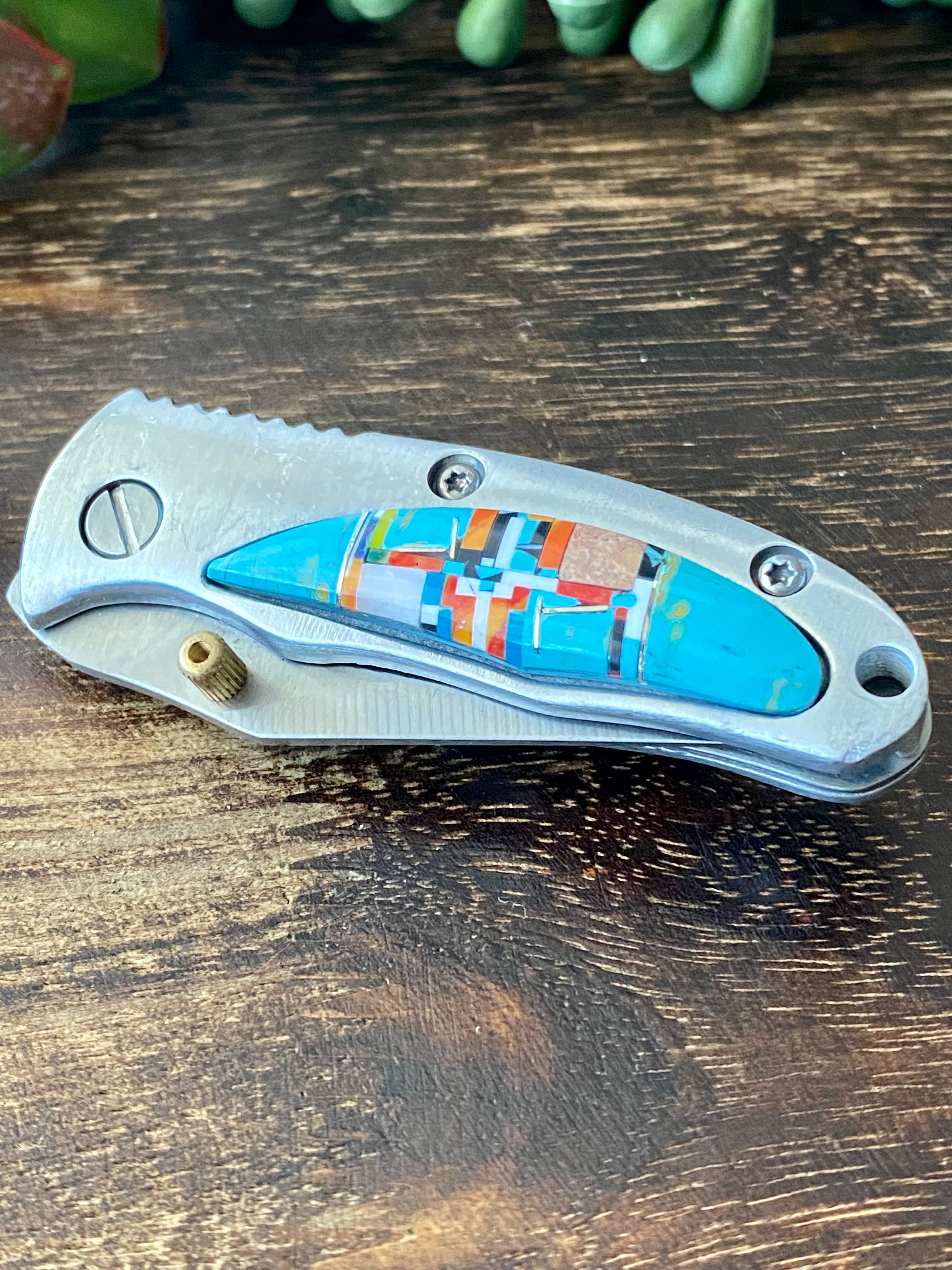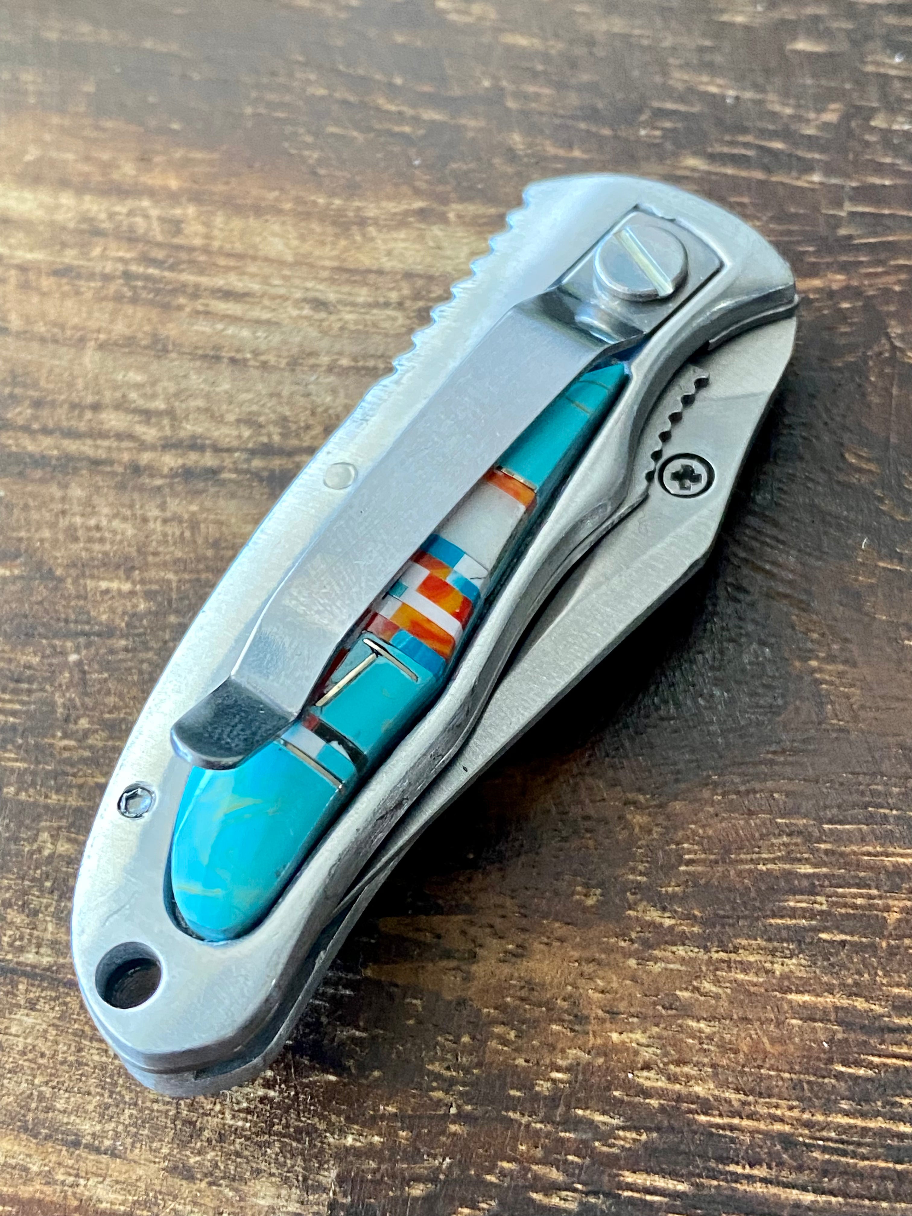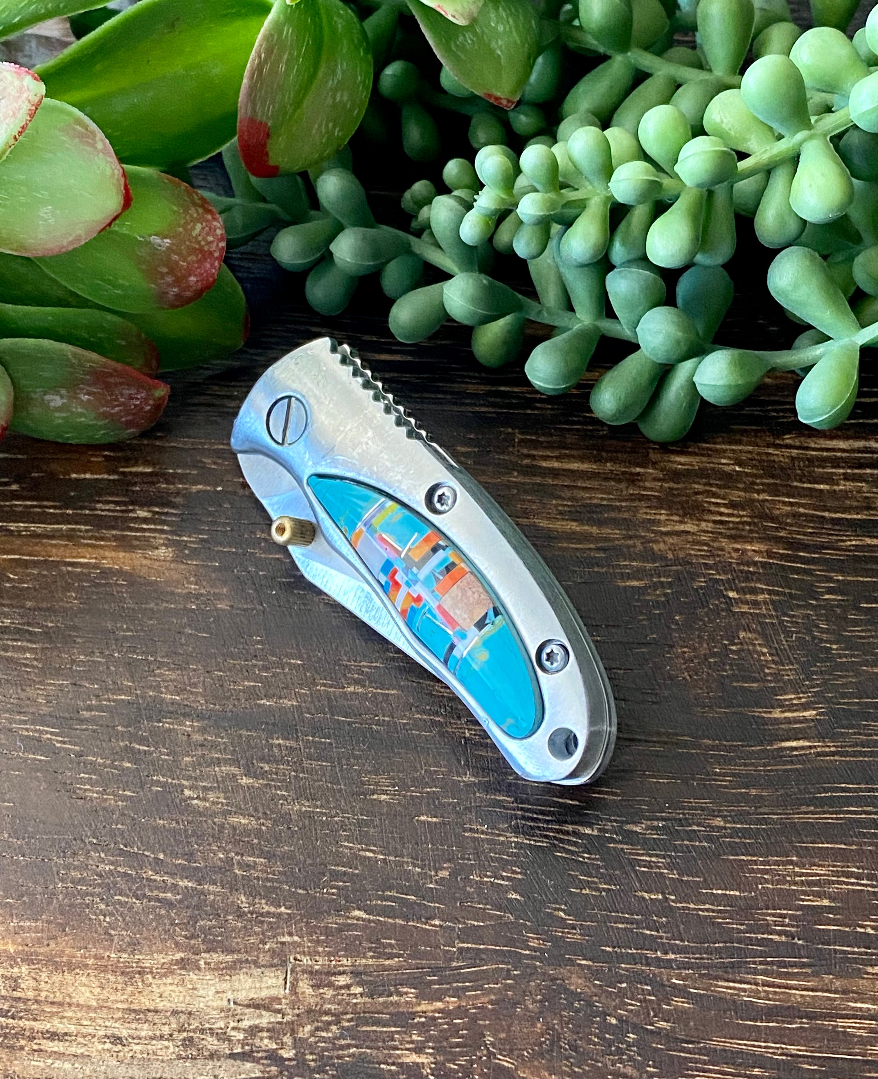 Southwest Made Stainless Steel Pocket Knife. It measures 2 3/4 inches long and 1 1/8 inches wide.