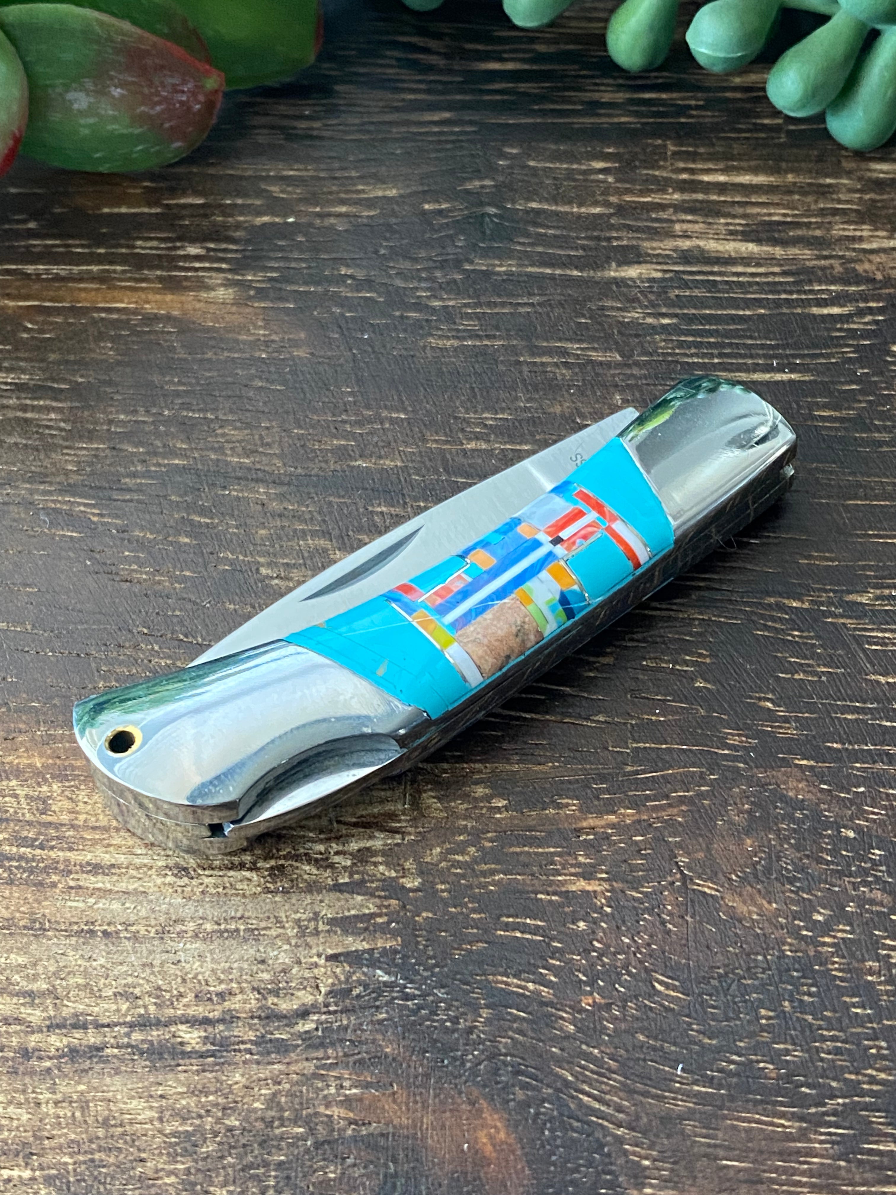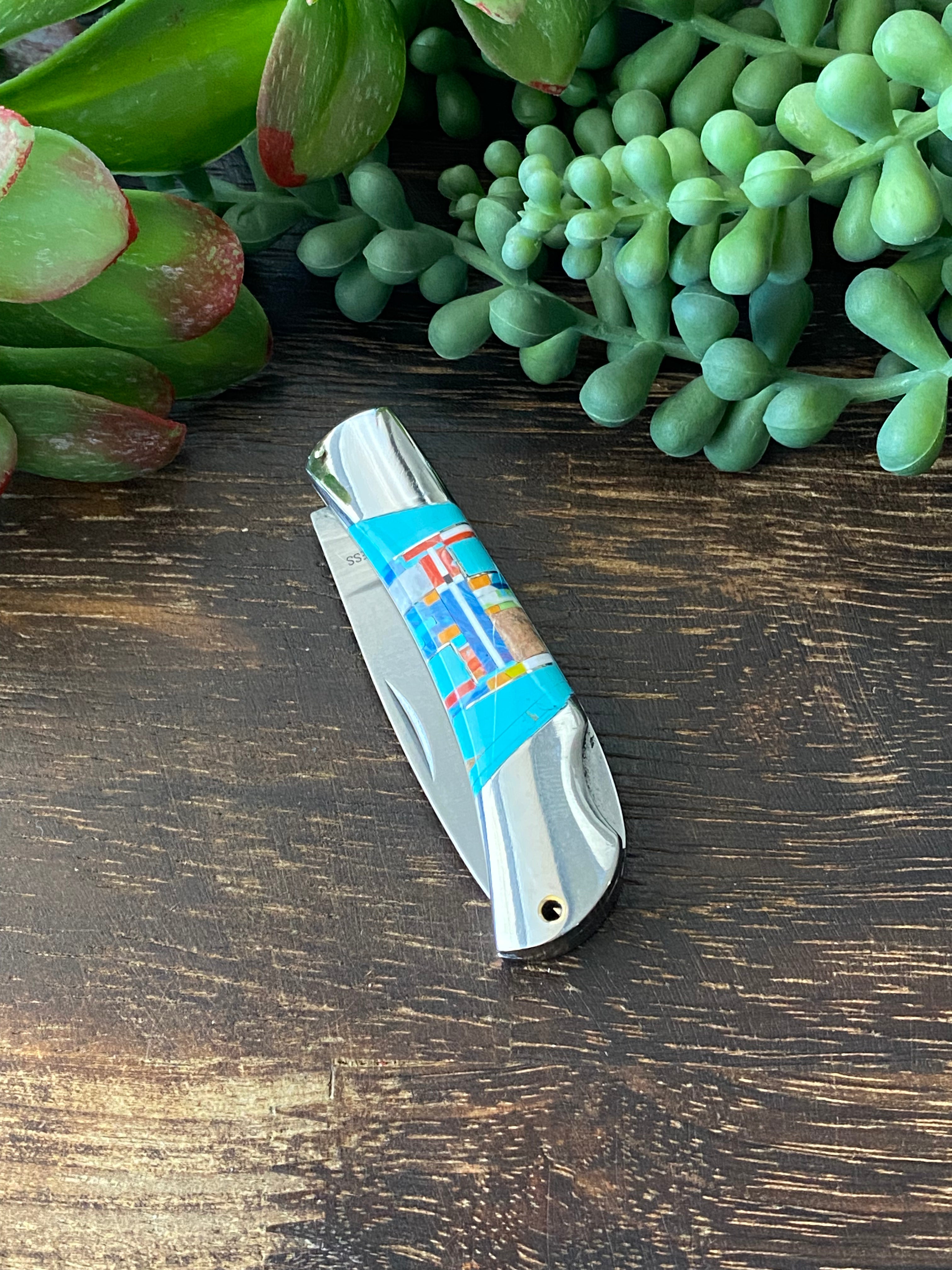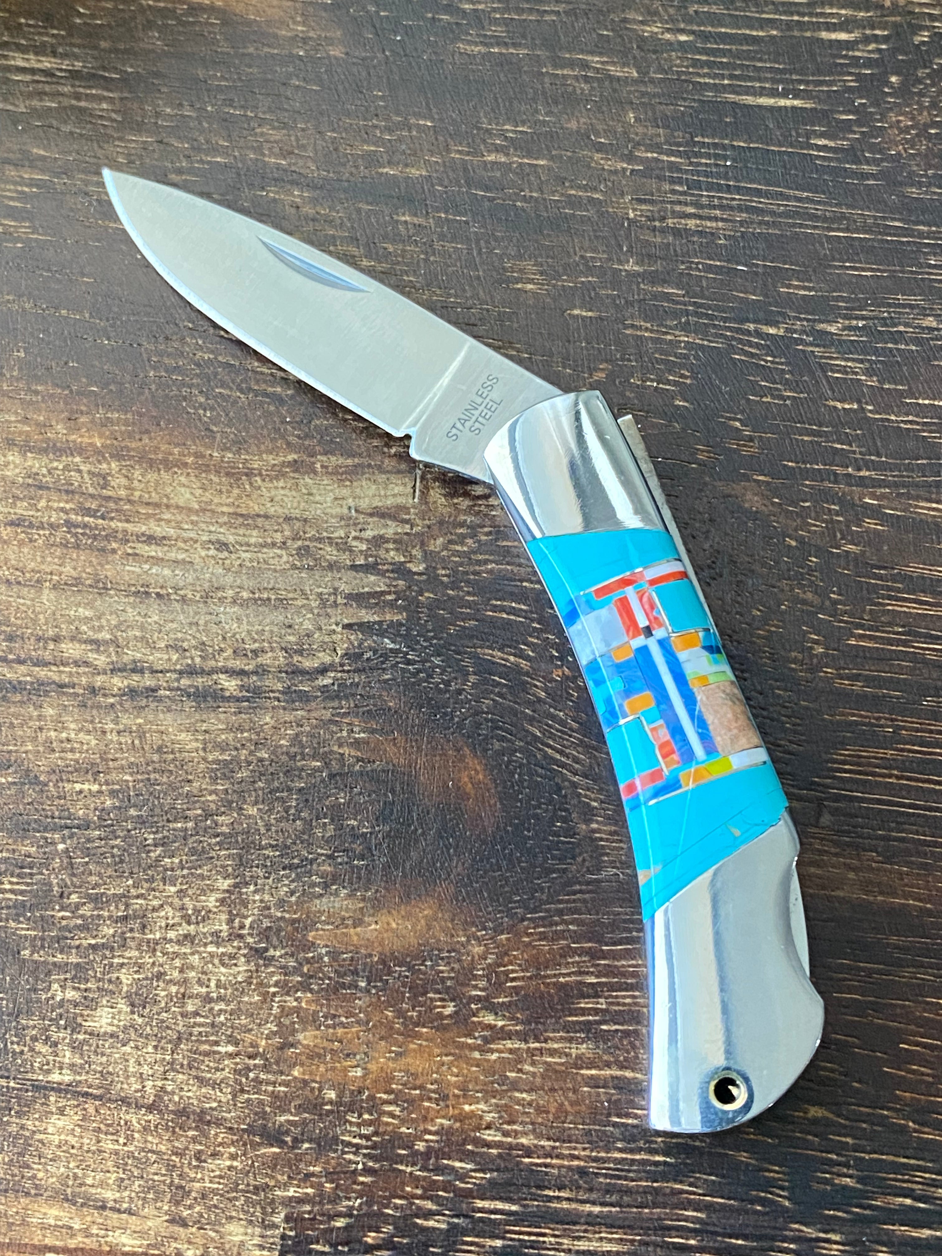 Southwest Made Stainless Steel Pocket Knife. It measures 2 3/4 inches long and 7/8 of an inch wide.