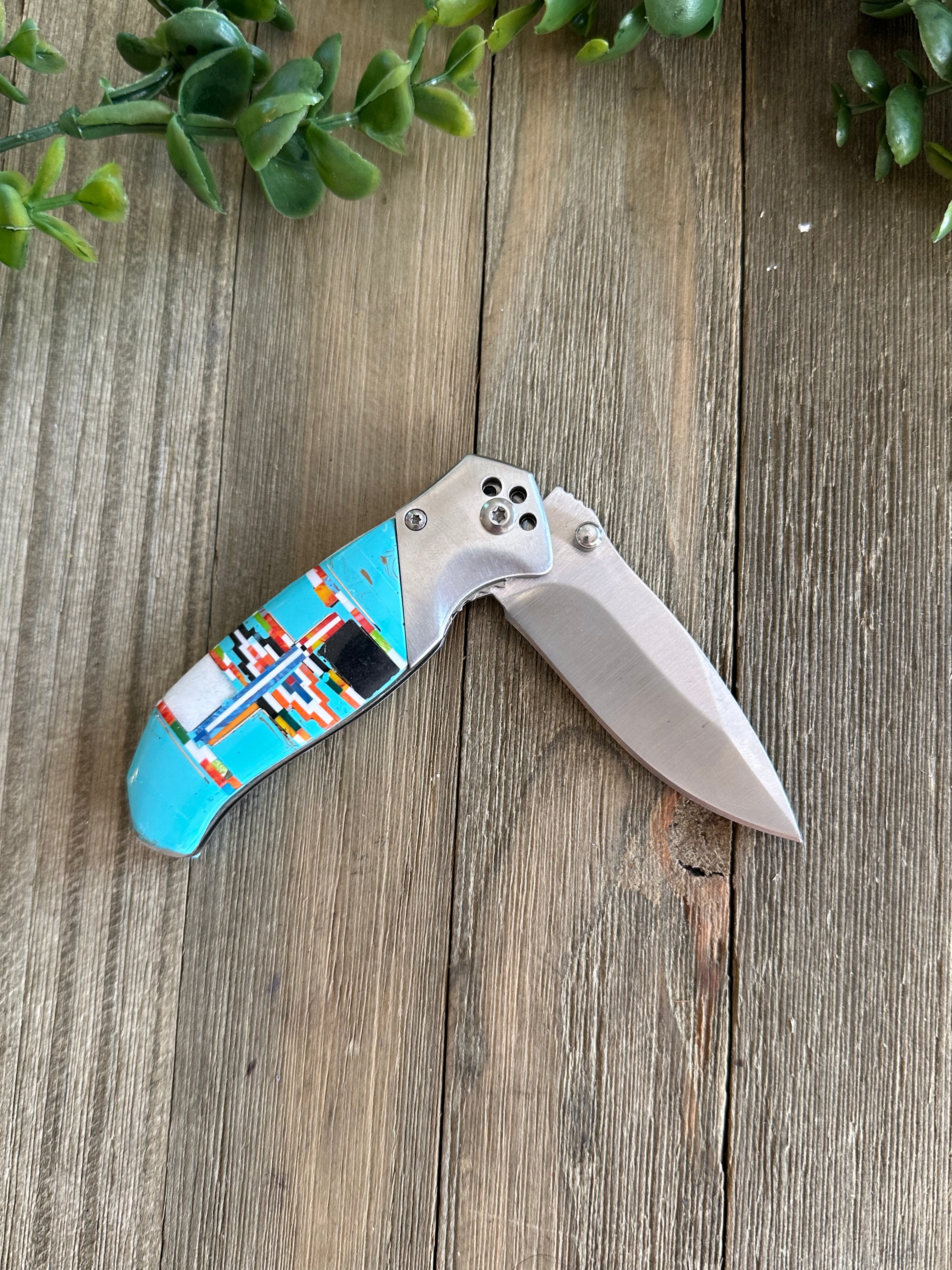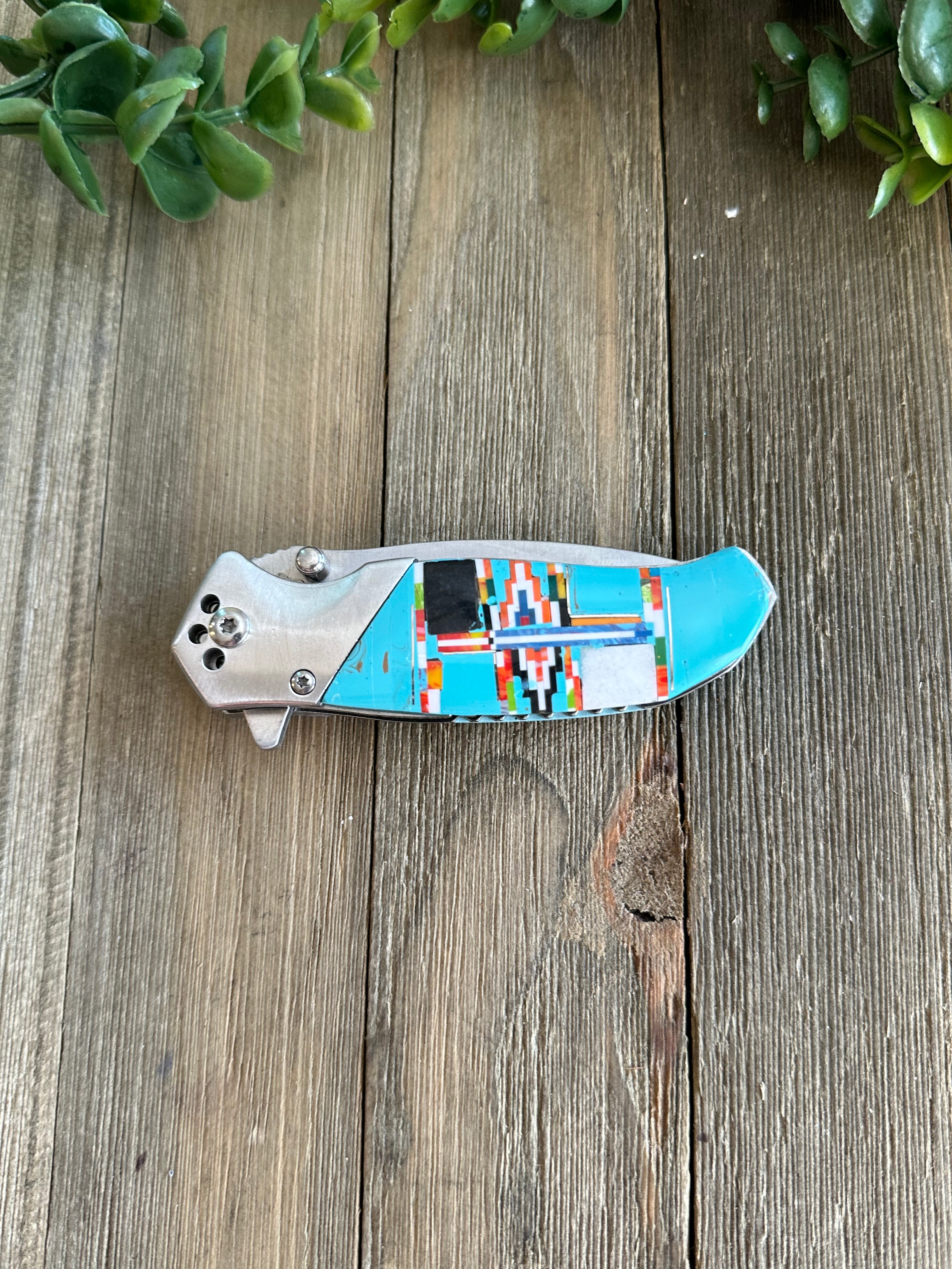 Southwest Made Stainless Steel Pocket Knife. It measures 3 3/4 inches long and 1 1/4 inches wide.