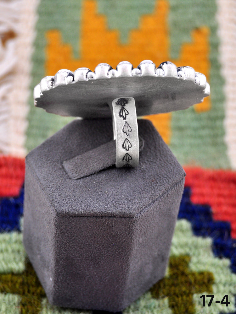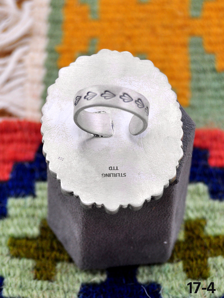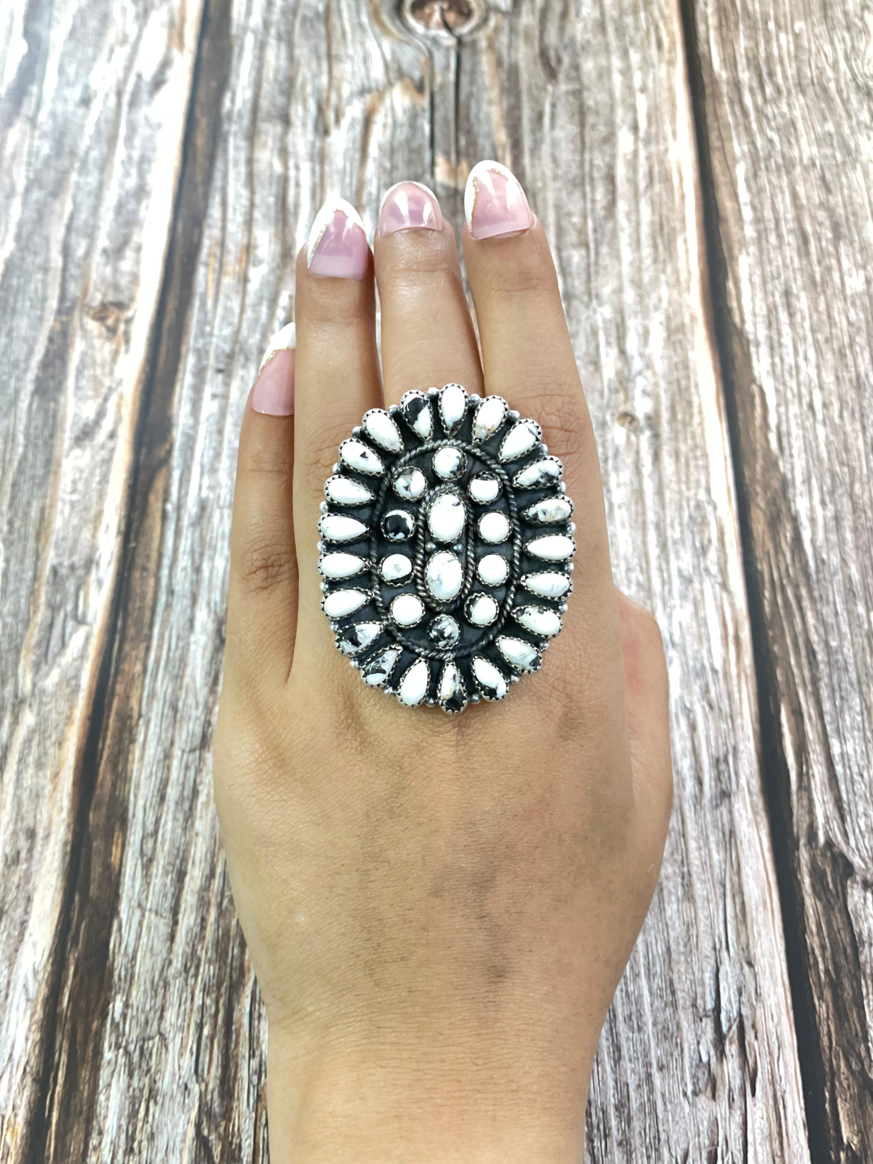 Southwest Made White Buffalo & Sterling Sliver Adjustable Ring. It measures 2 1/4 inch long and 1 3/4 inch wide.
