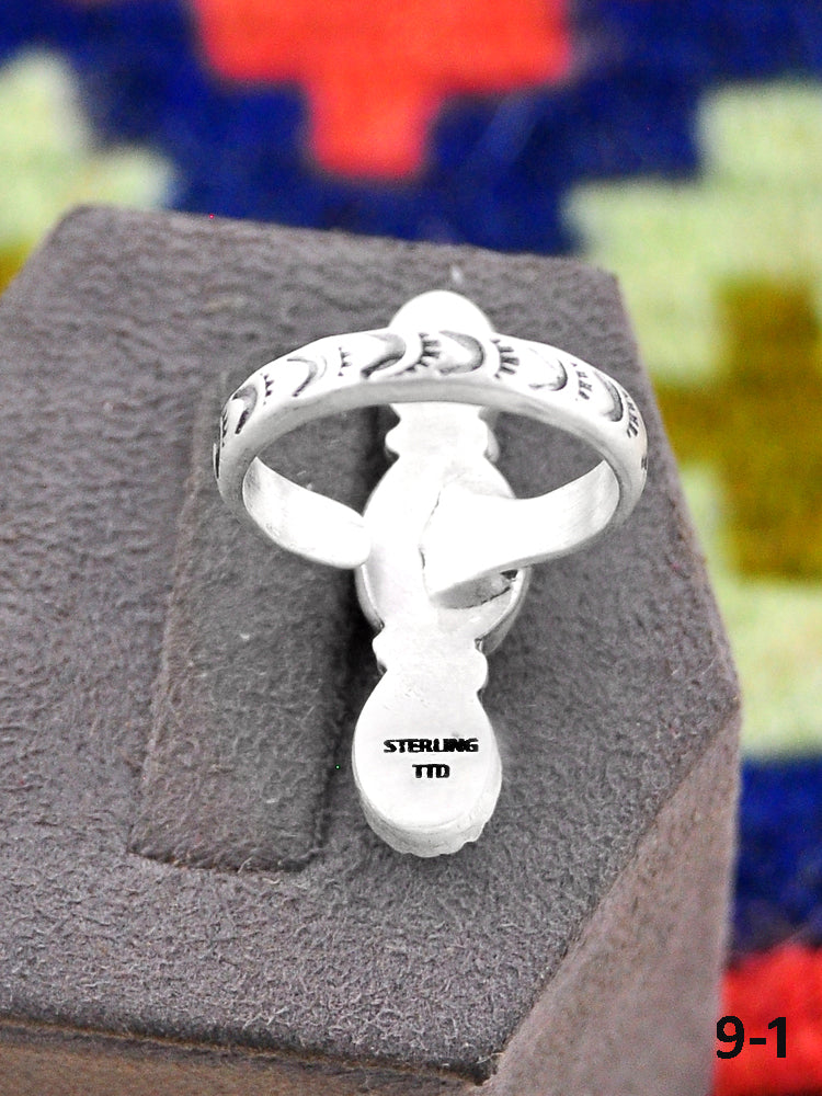 Southwest Made White water Turquoise and Honey Dahlia & Sterling Sliver Adjustable Ring. It measures 1 inch long and 3/8 of an inch wide. Signed by the artist and stamped sterling silver.