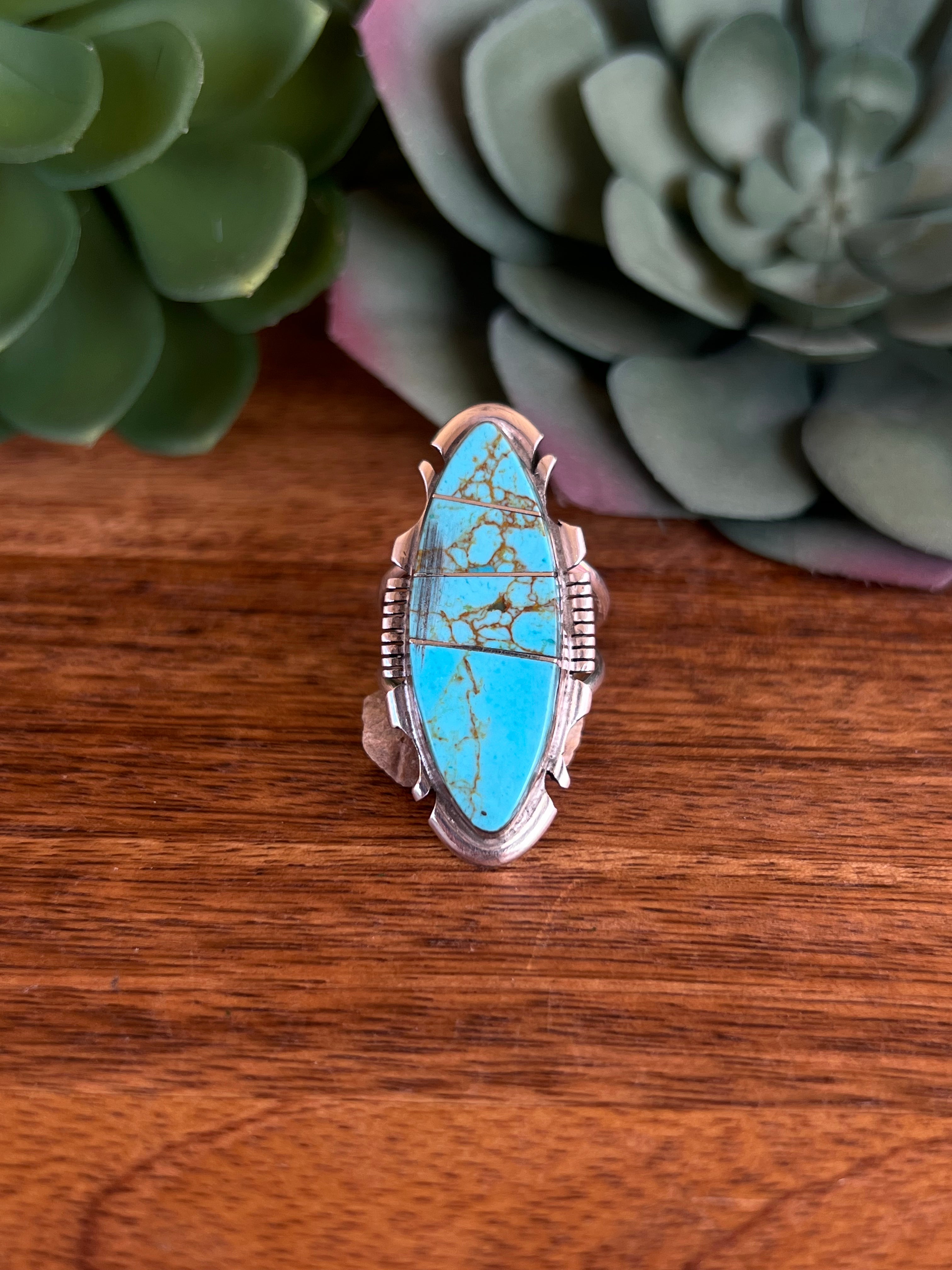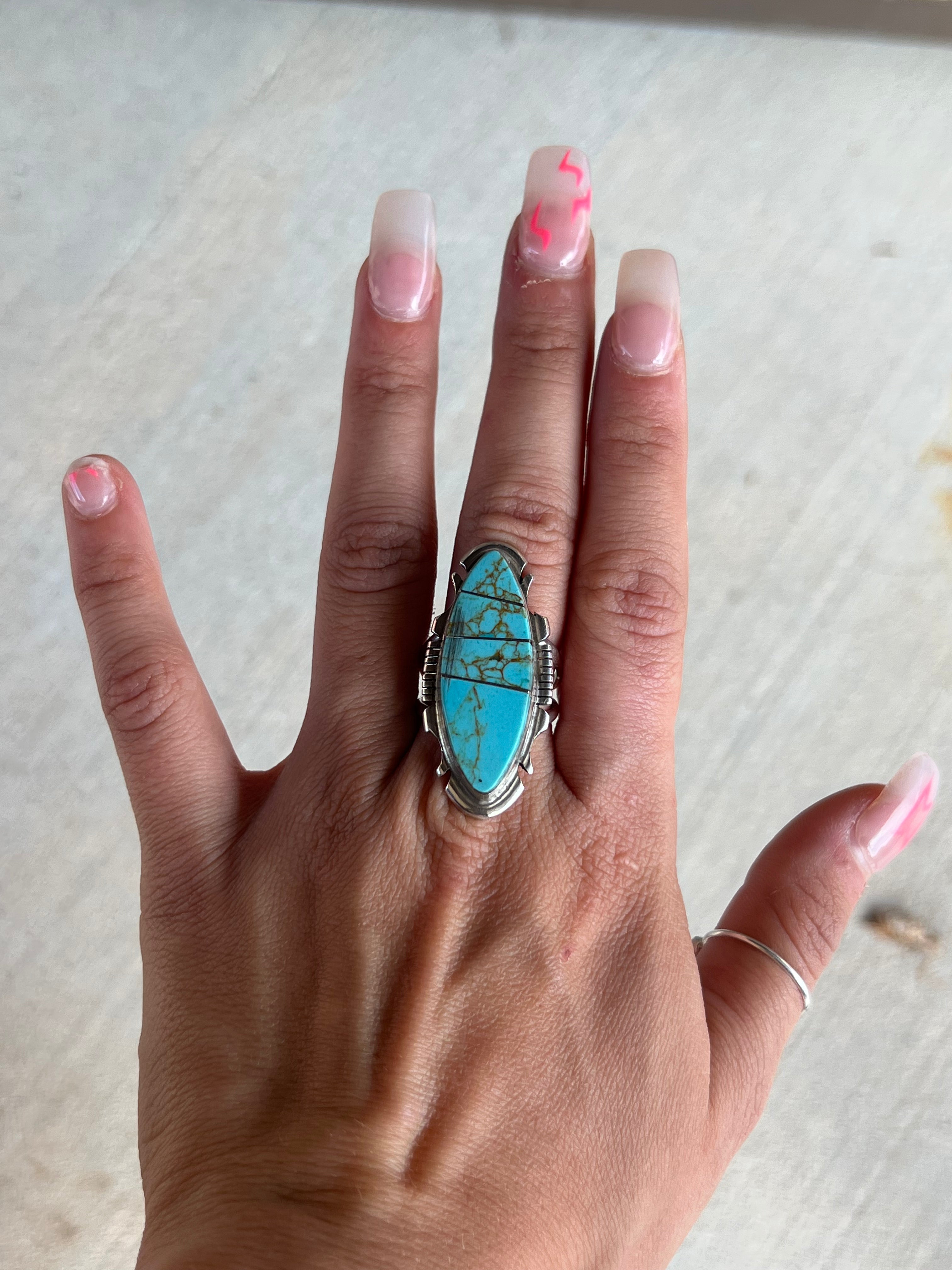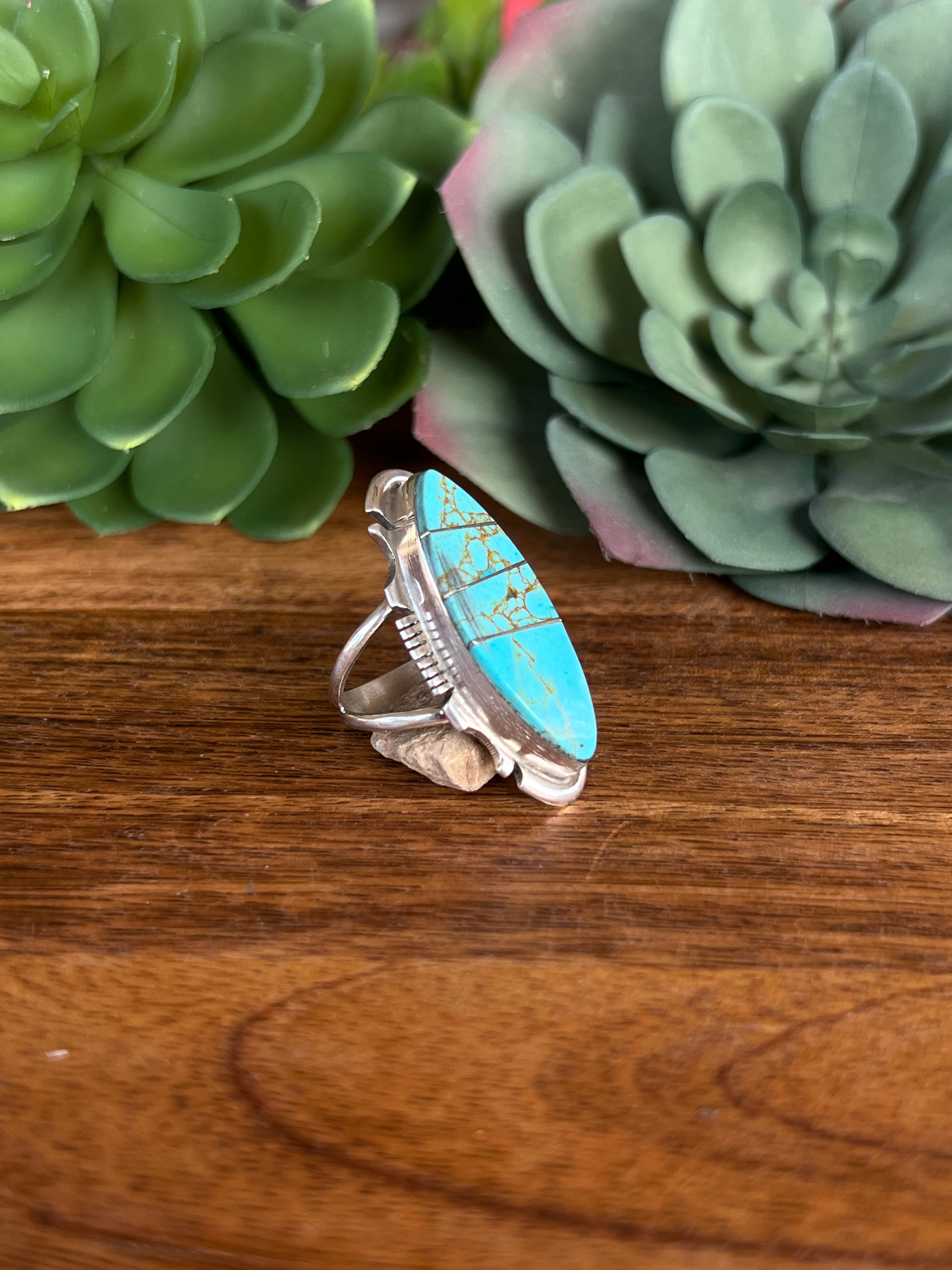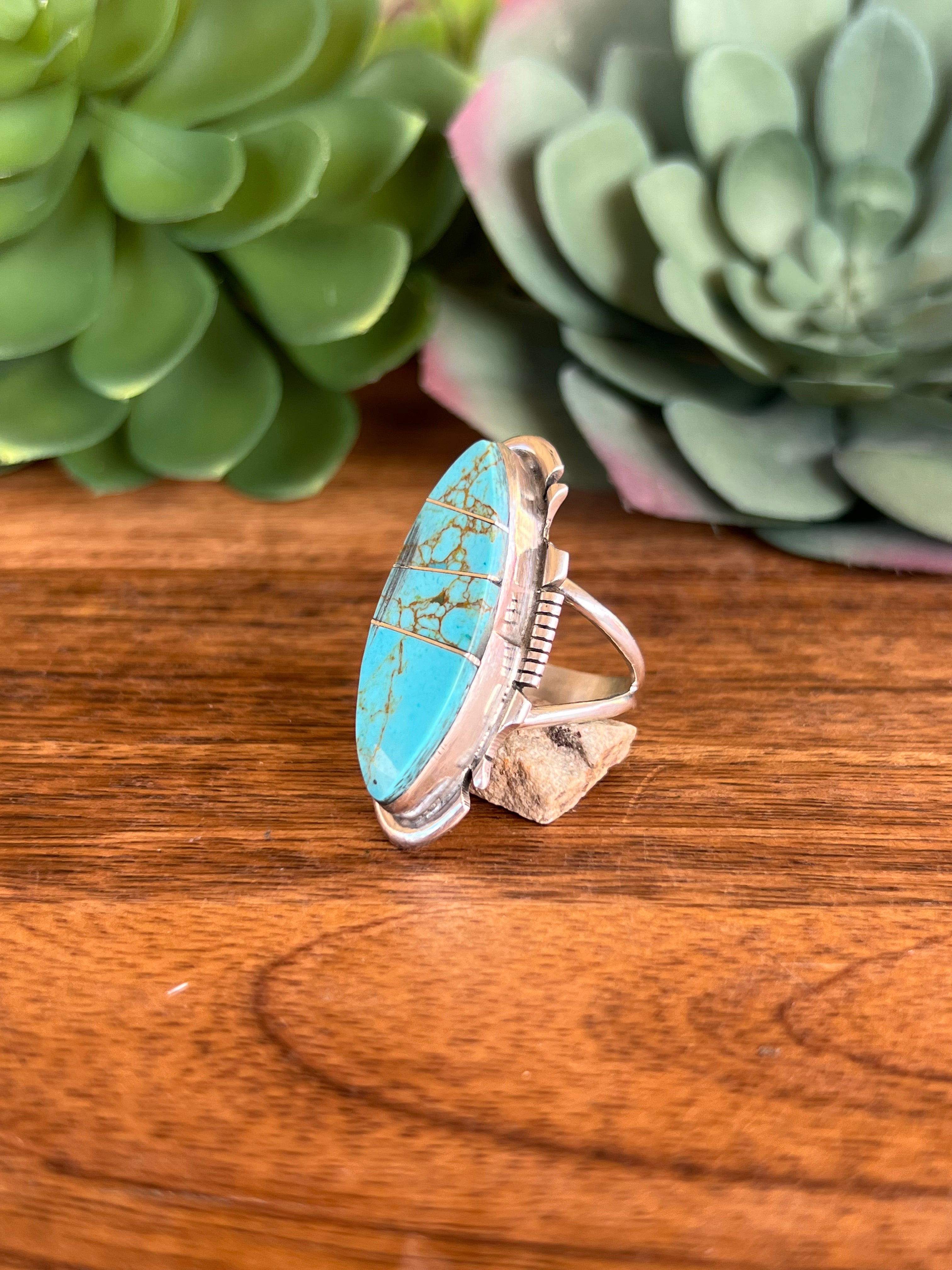Steve Francisco Sterling Silver Inlay Ring Size 9. It measures 1 5/8 inches long and just over 5/8 of an inch wide. Signed by artist and stamped sterling silver.