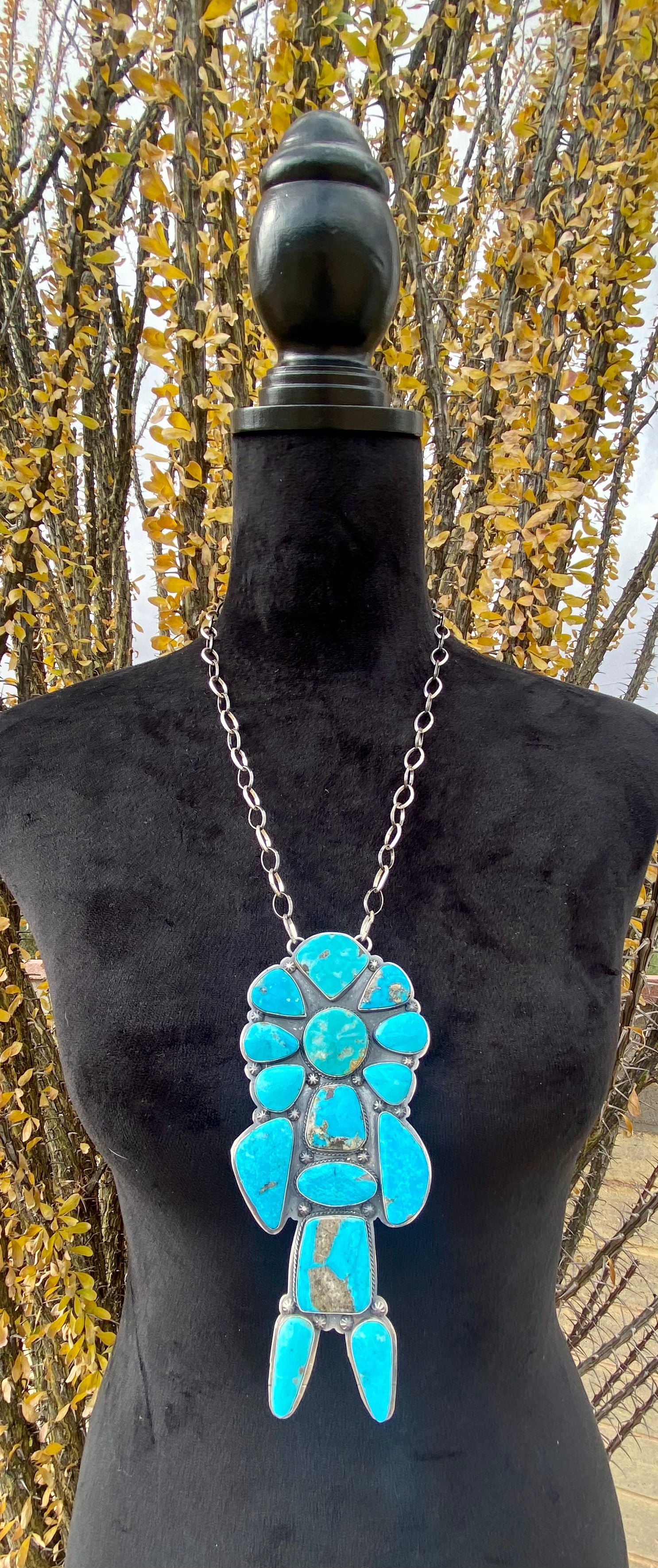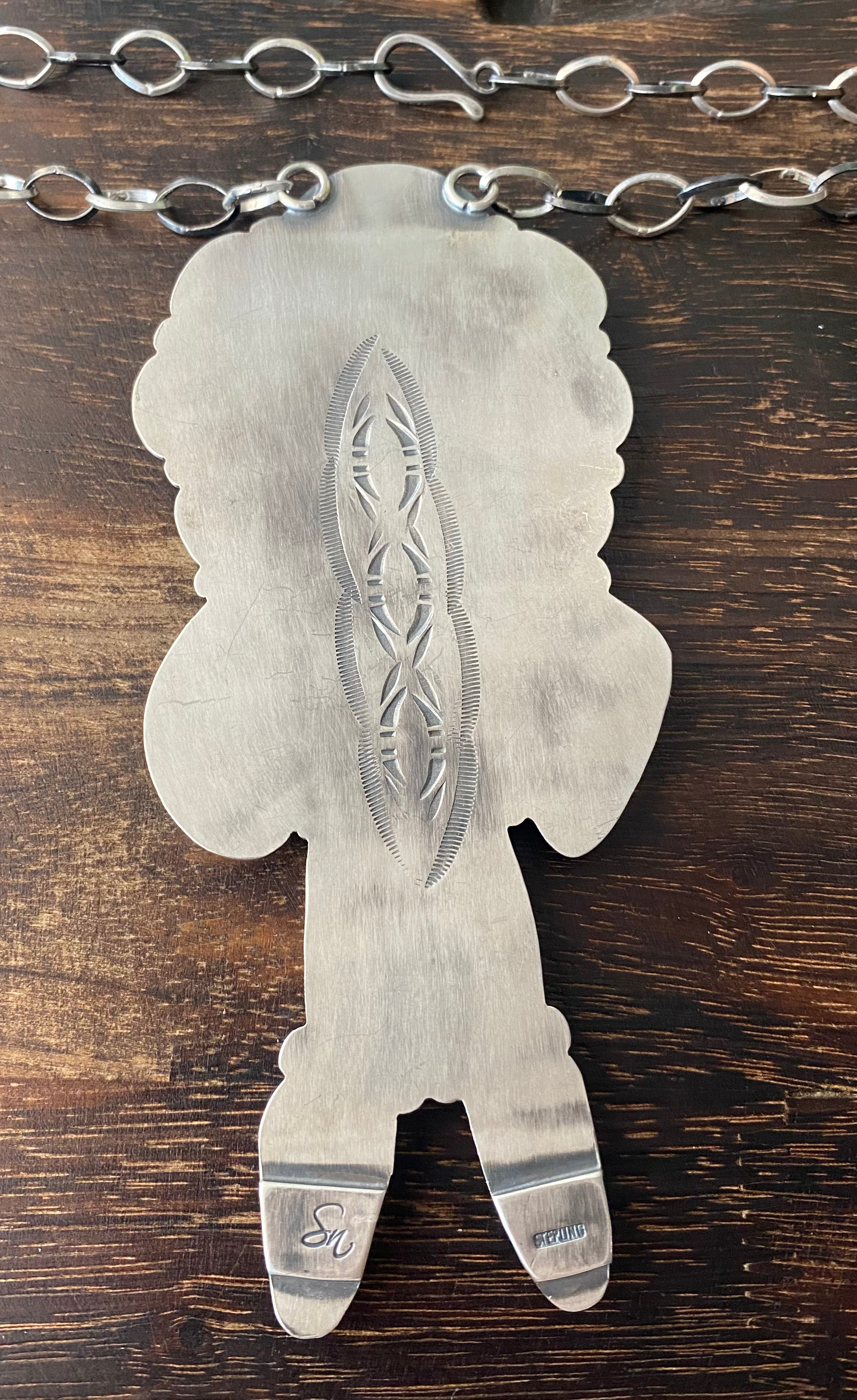 Steven Nez Kingman Turquoise & Sterling Silver Kokopelli Necklace. It measures 36 inches long with hang while chain measures 25 inches long. Signed by the artist and stamped sterling silver.