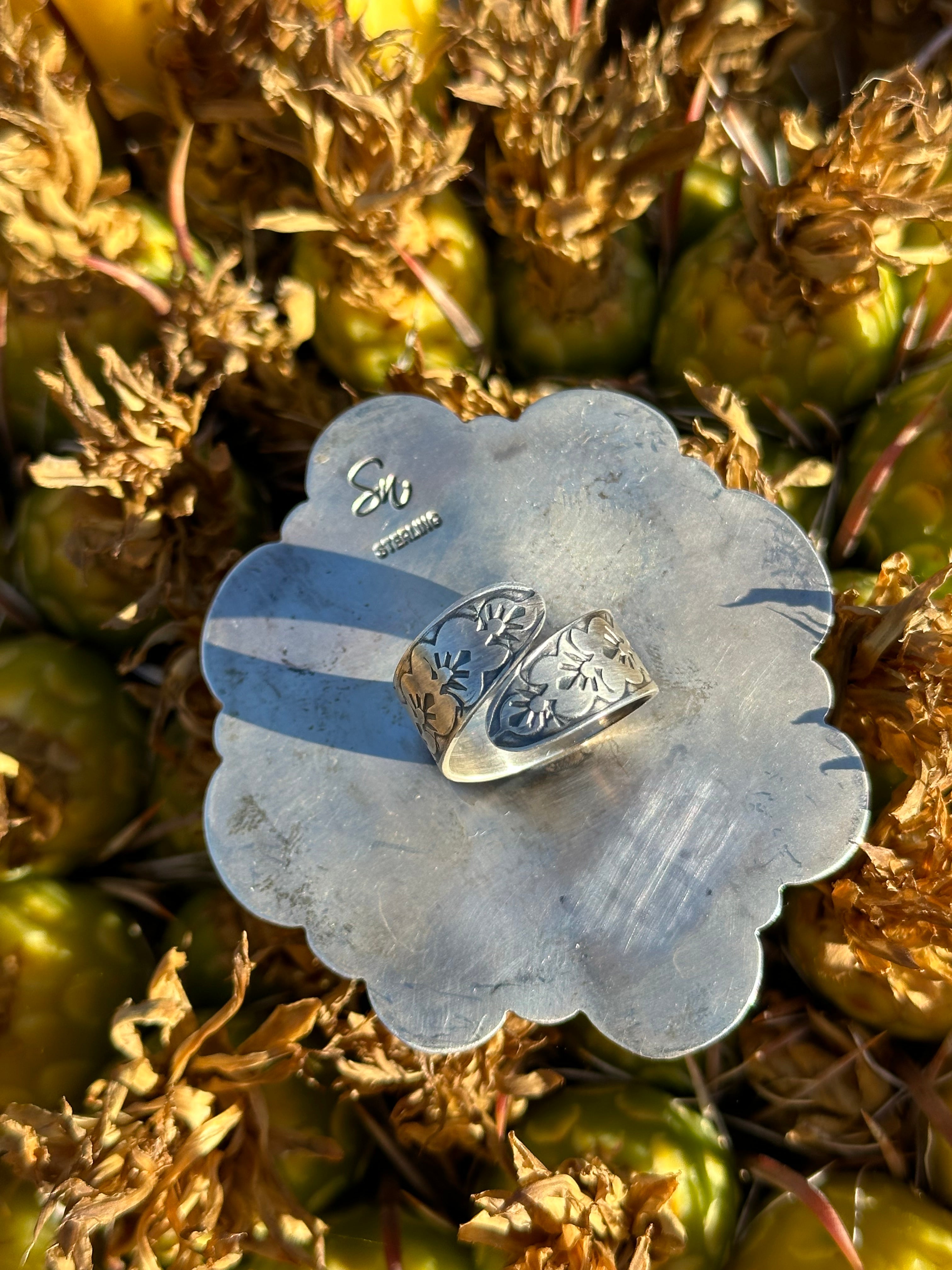 Beautiful ring, Steven Nez Sonoran Gold Turquoise & Sterling Silver Cluster Adjustable Ring Sitting on a size 7.5. It measures 2 7/8 inches long and 2 3/4 inches wide. Signed by the artist and stamped sterling silver.