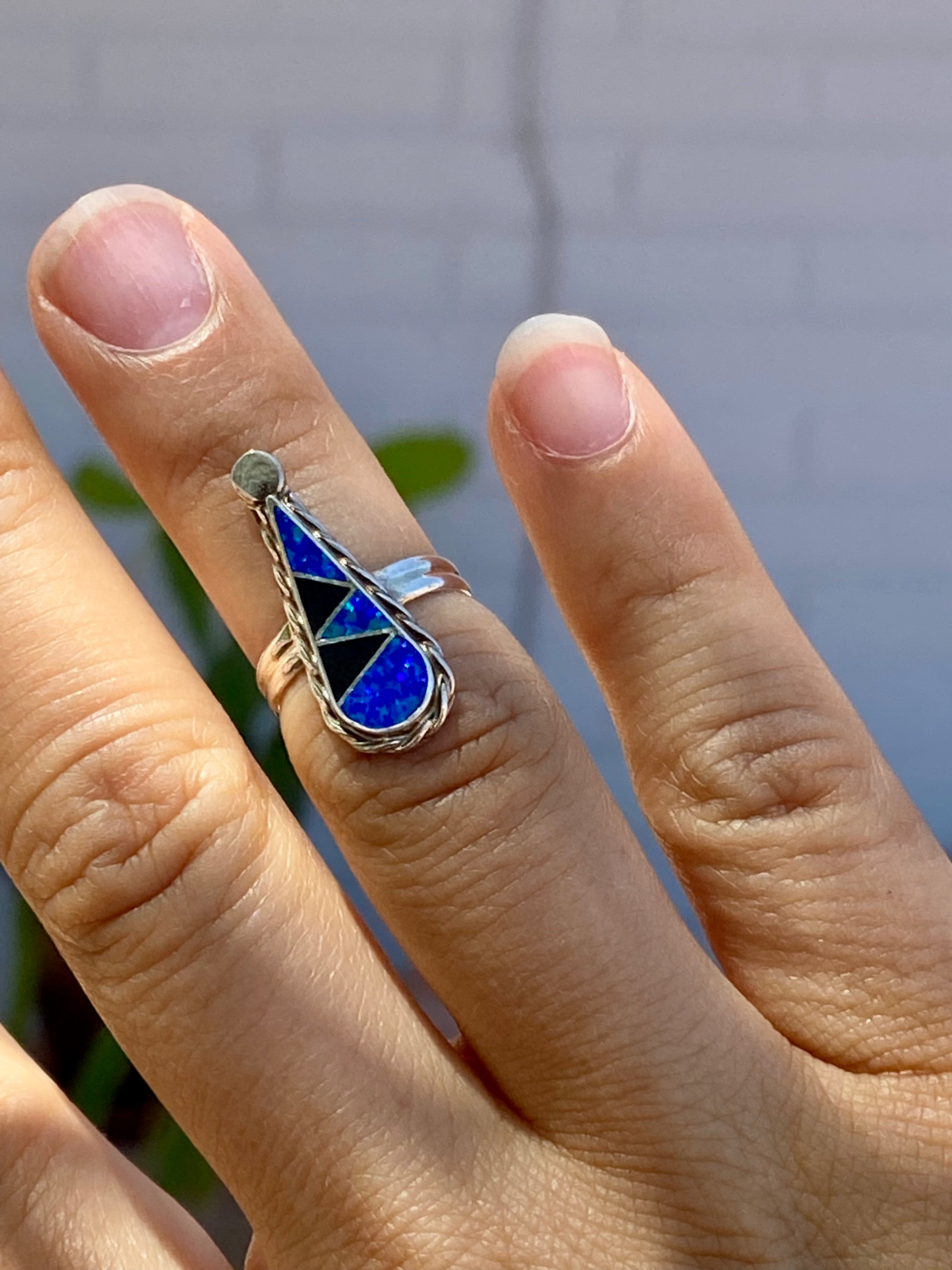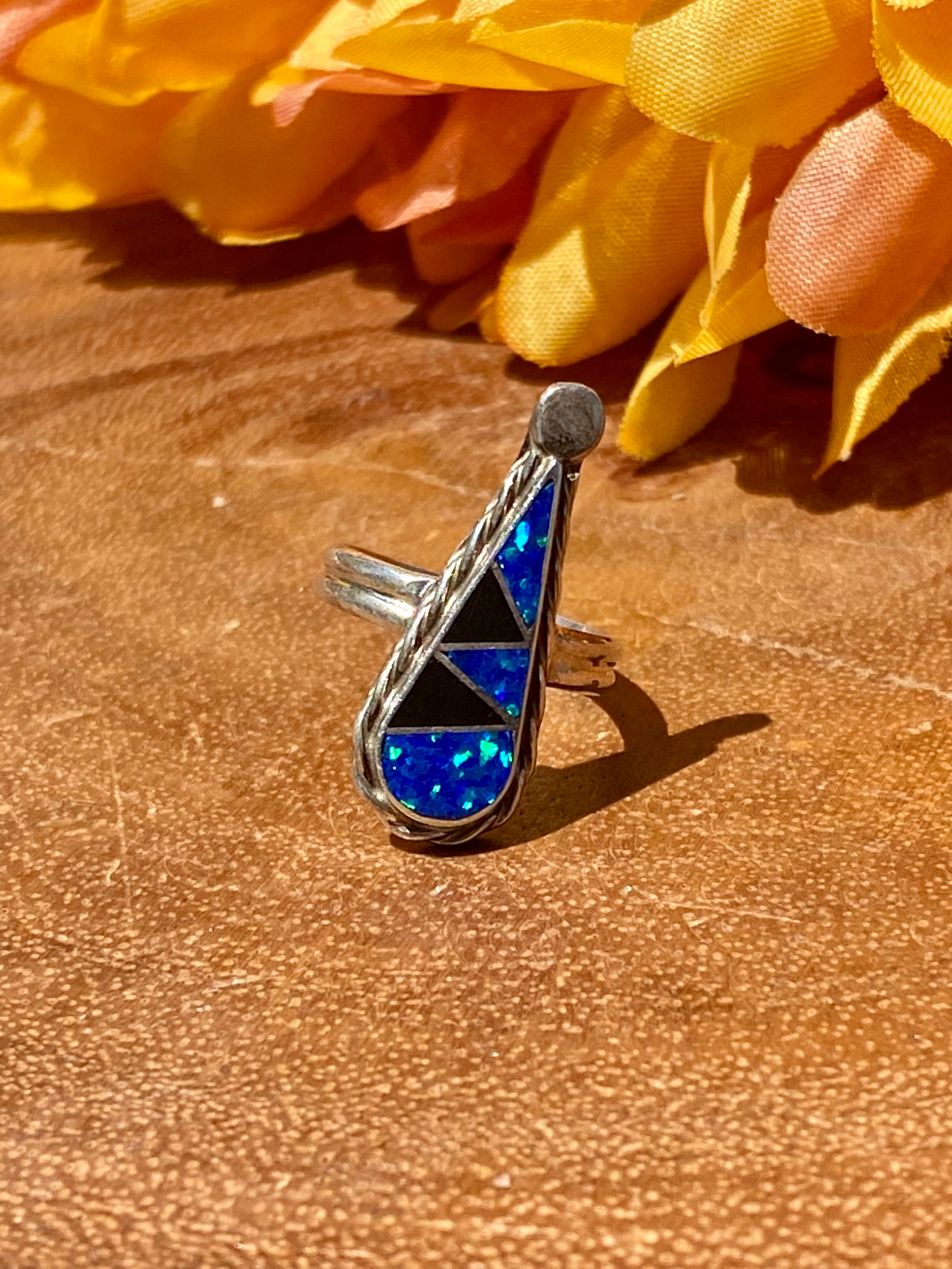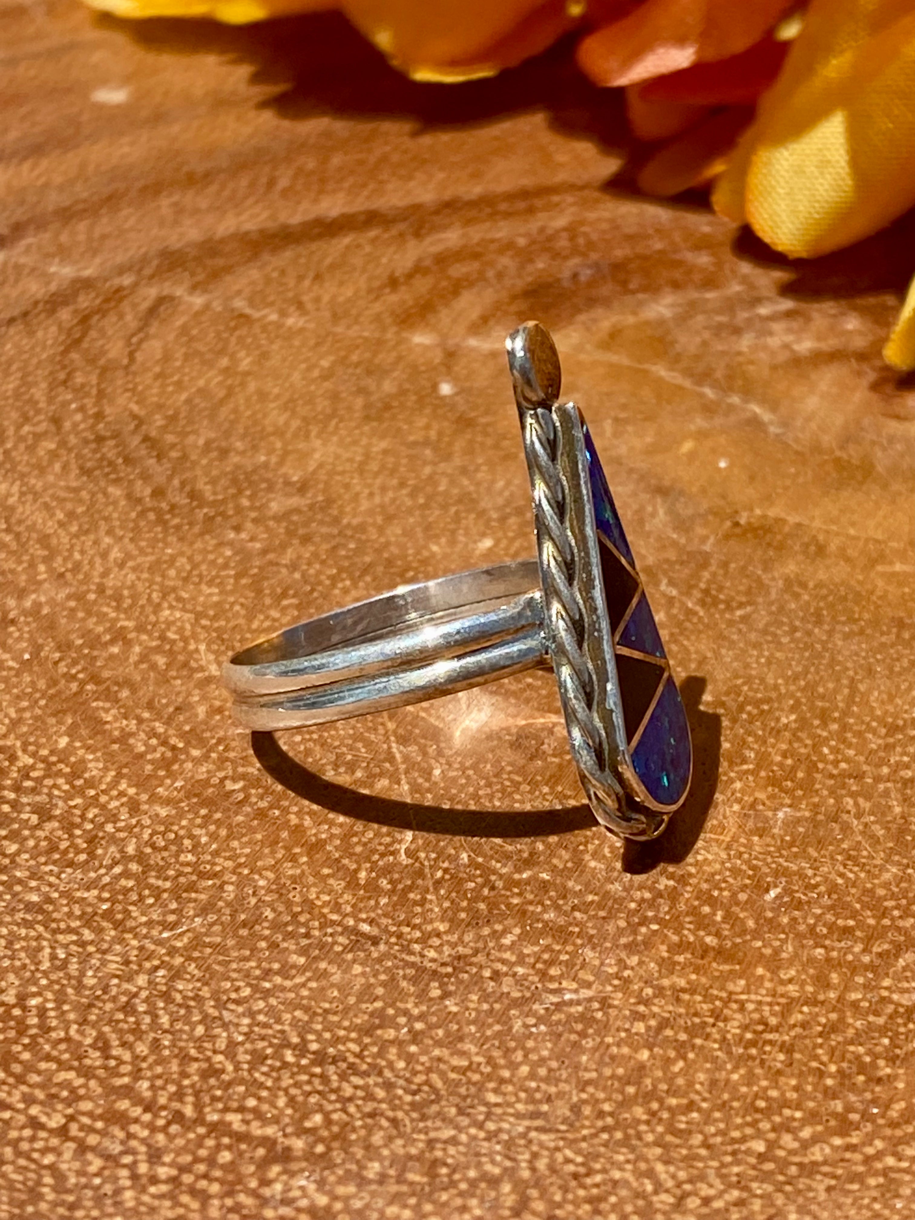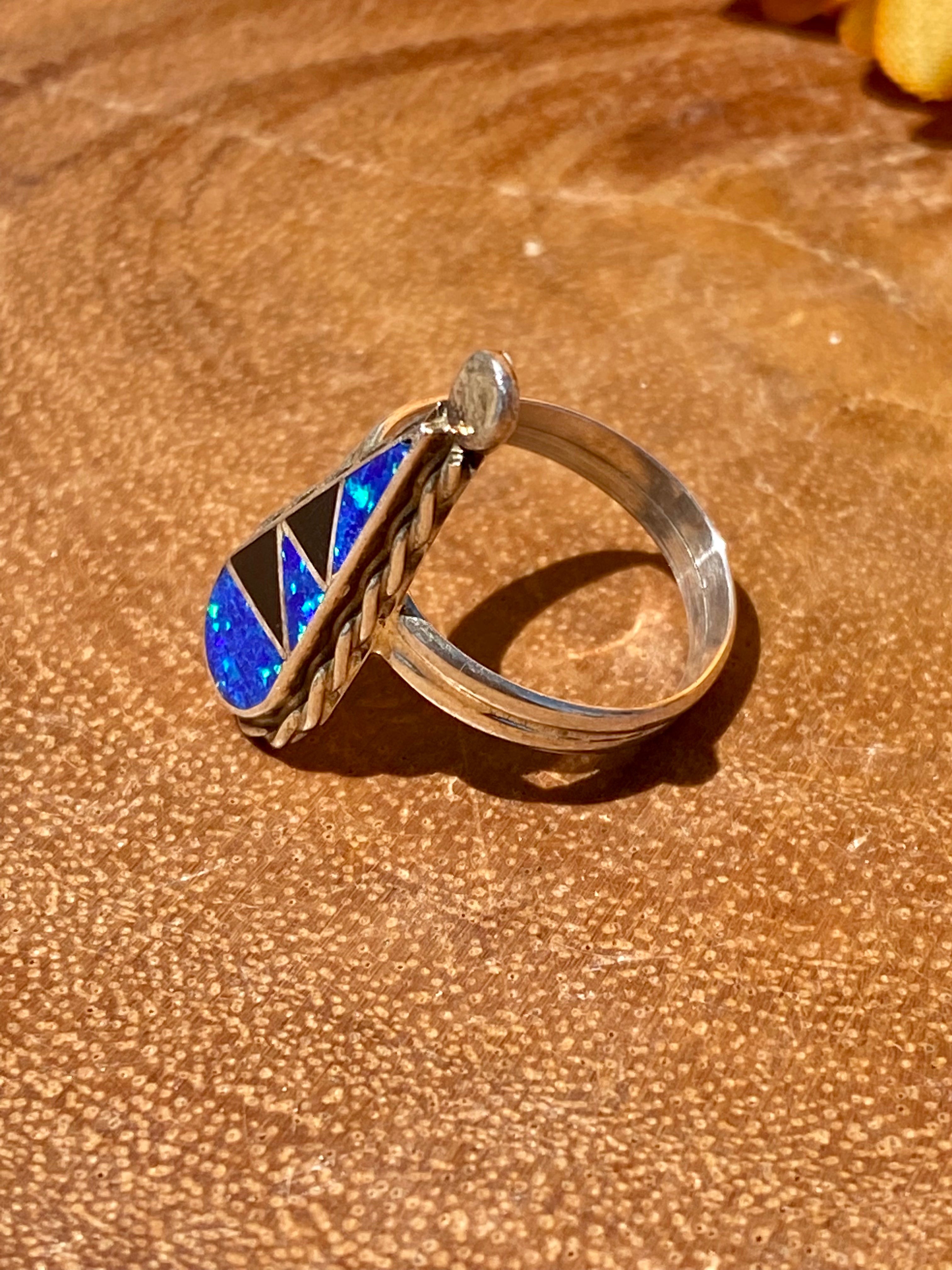 Swain Charlie Opal & Onyx Sterling Silver Ring Size 6. It measures 1 inch long and 3/8 of an inch wide.