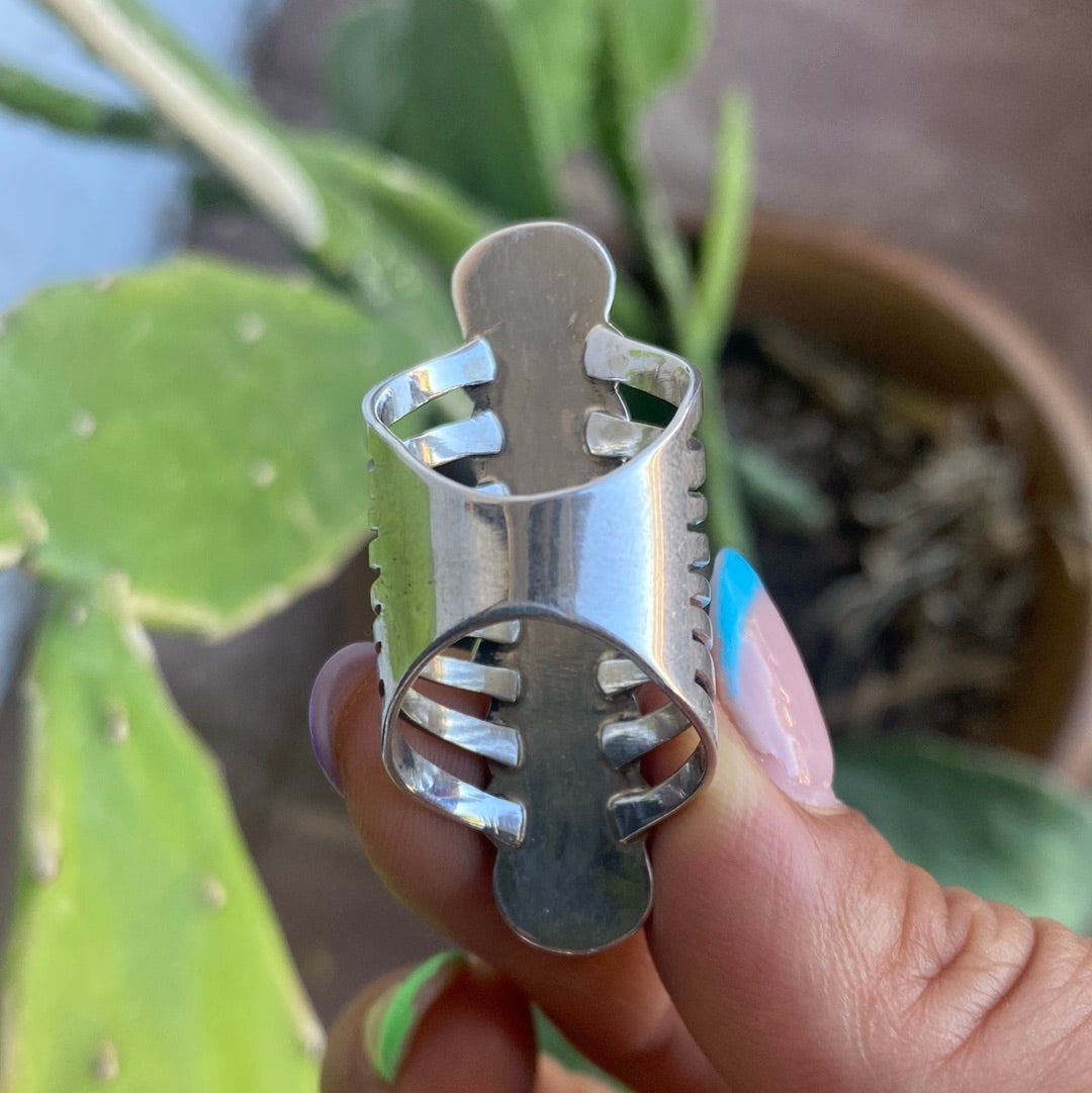 T. Yazzie Blue Opal & Sterling Silver Ring Size 8. It measures just under 2 inches long and just over 3/8 of an inch wide. Signed by the artist and stamped sterling silver.