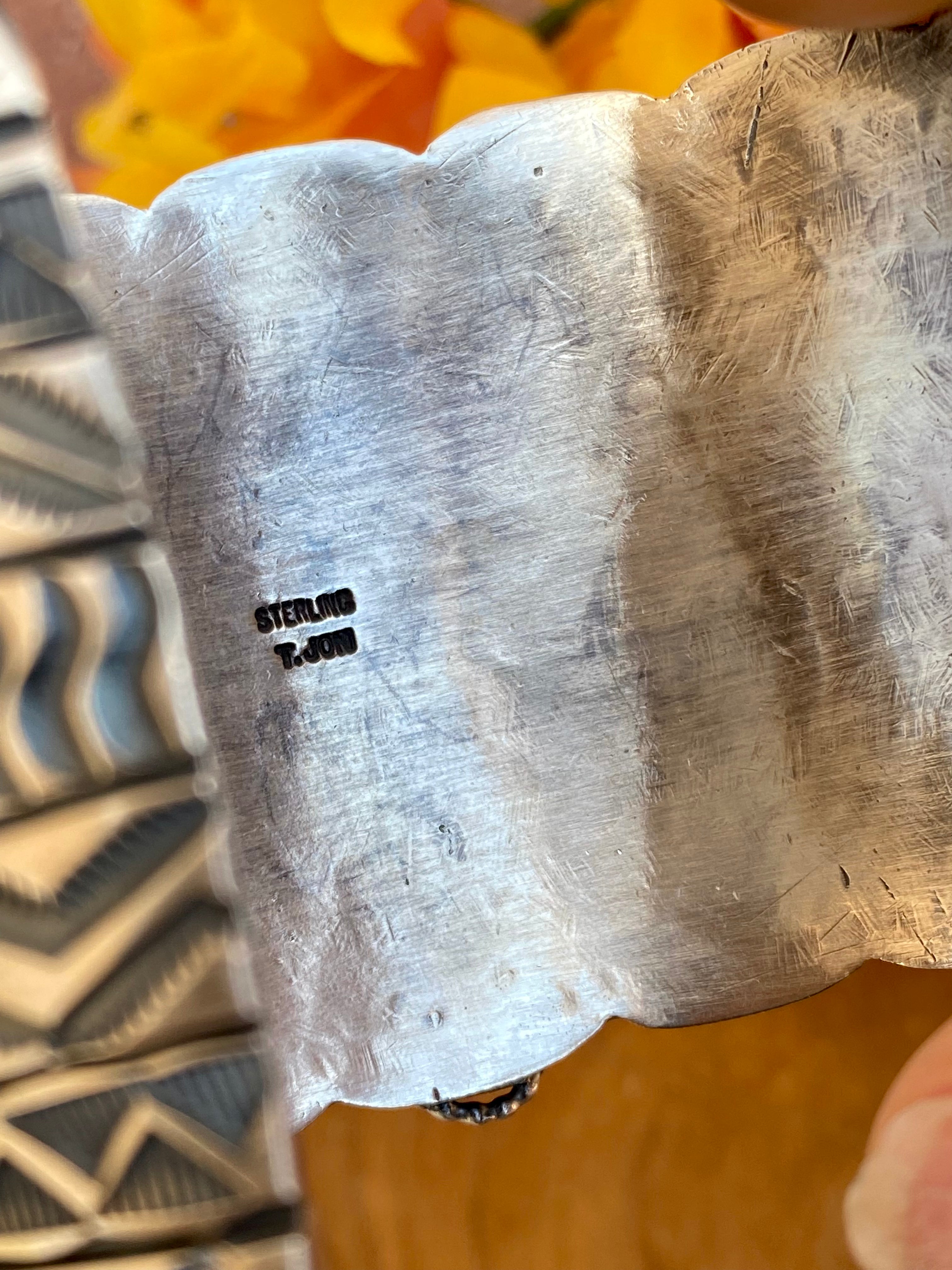 Telly John Golden Hill’s Turquoise & Sterling Silver Mega Cuff Bracelet. It measures 2 1/4 inches wide with an inside circumference of 6 inches and a gap of 1 1/4 inches. Signed by the artist and stamped sterling silver.