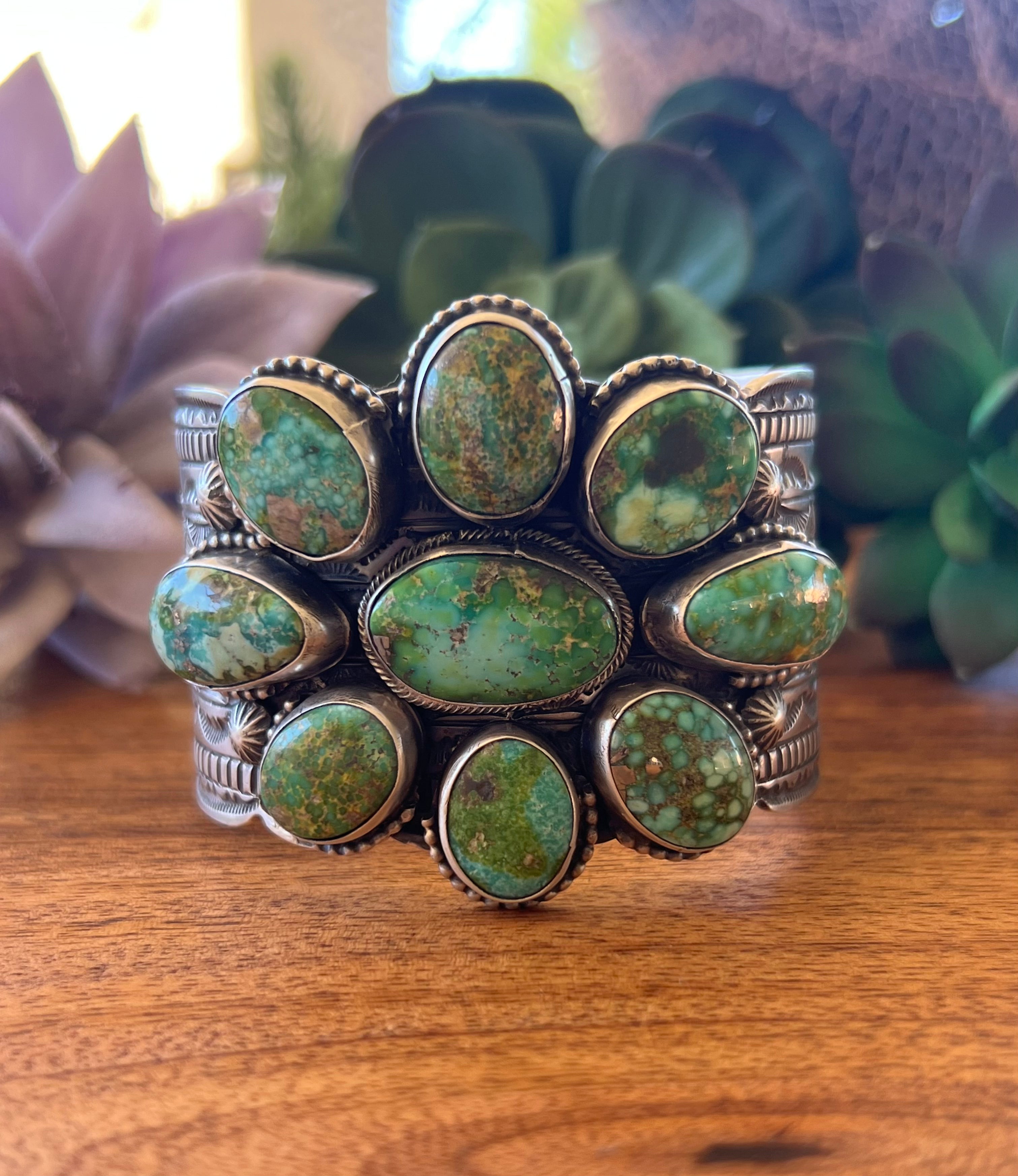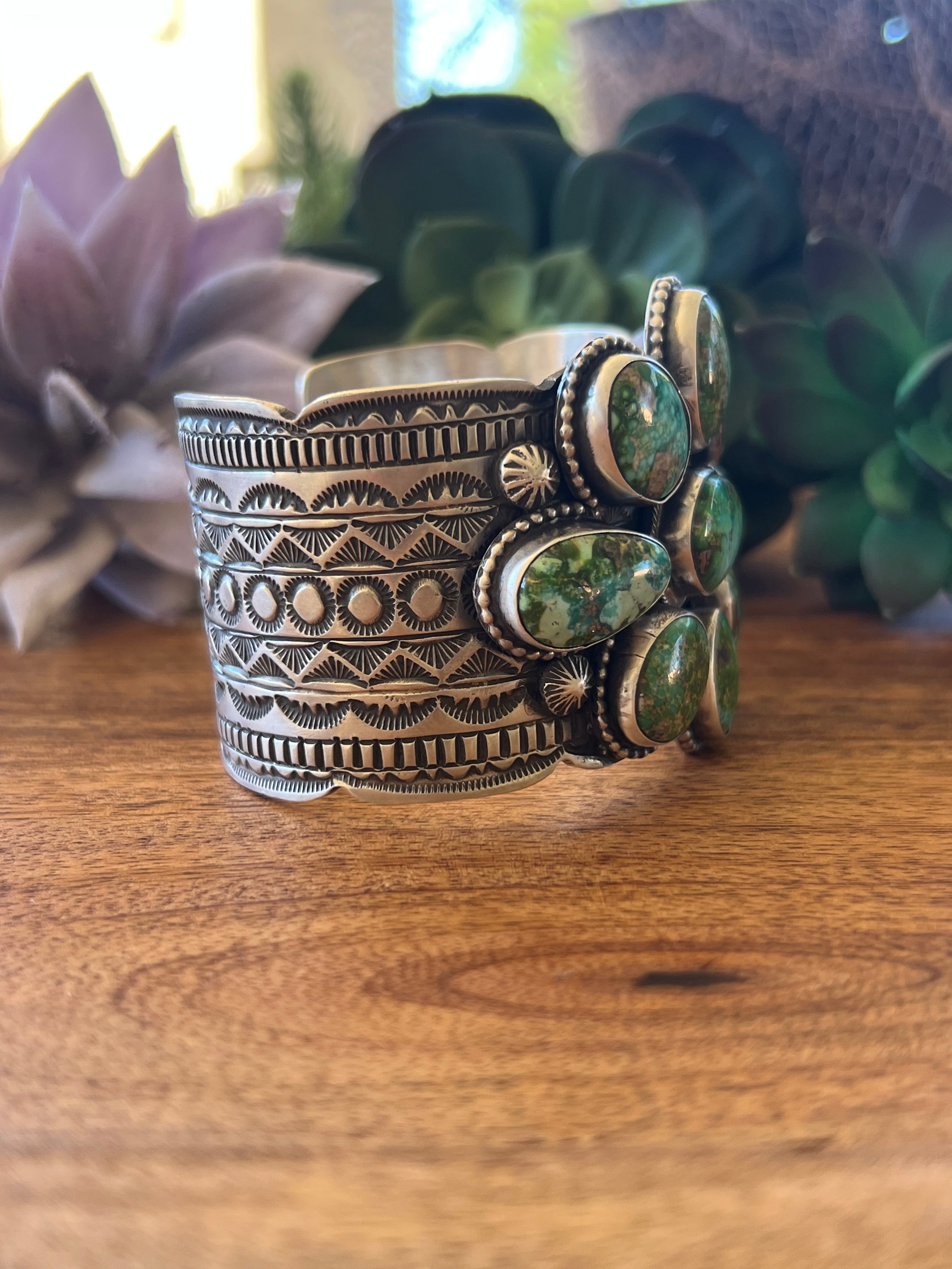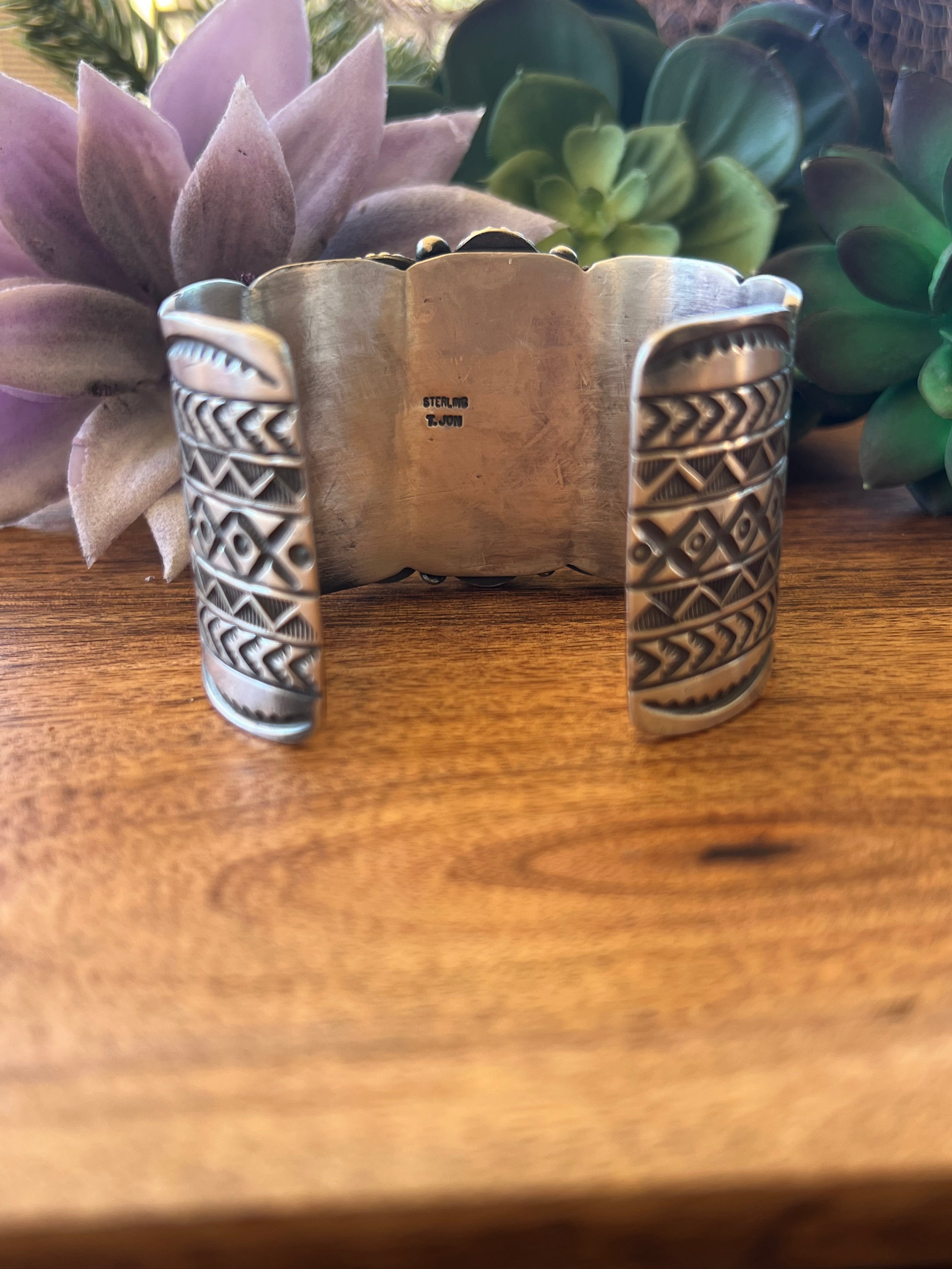 Tillie John Sonoran Gold Turquoise & Sterling Silver Cuff Bracelet. It measures 2 1/8 of an inch wide with an inside circumference of 5 7/8 inches and a gap of 1 1/8 inches. Signed by the artist and stamped sterling silver.