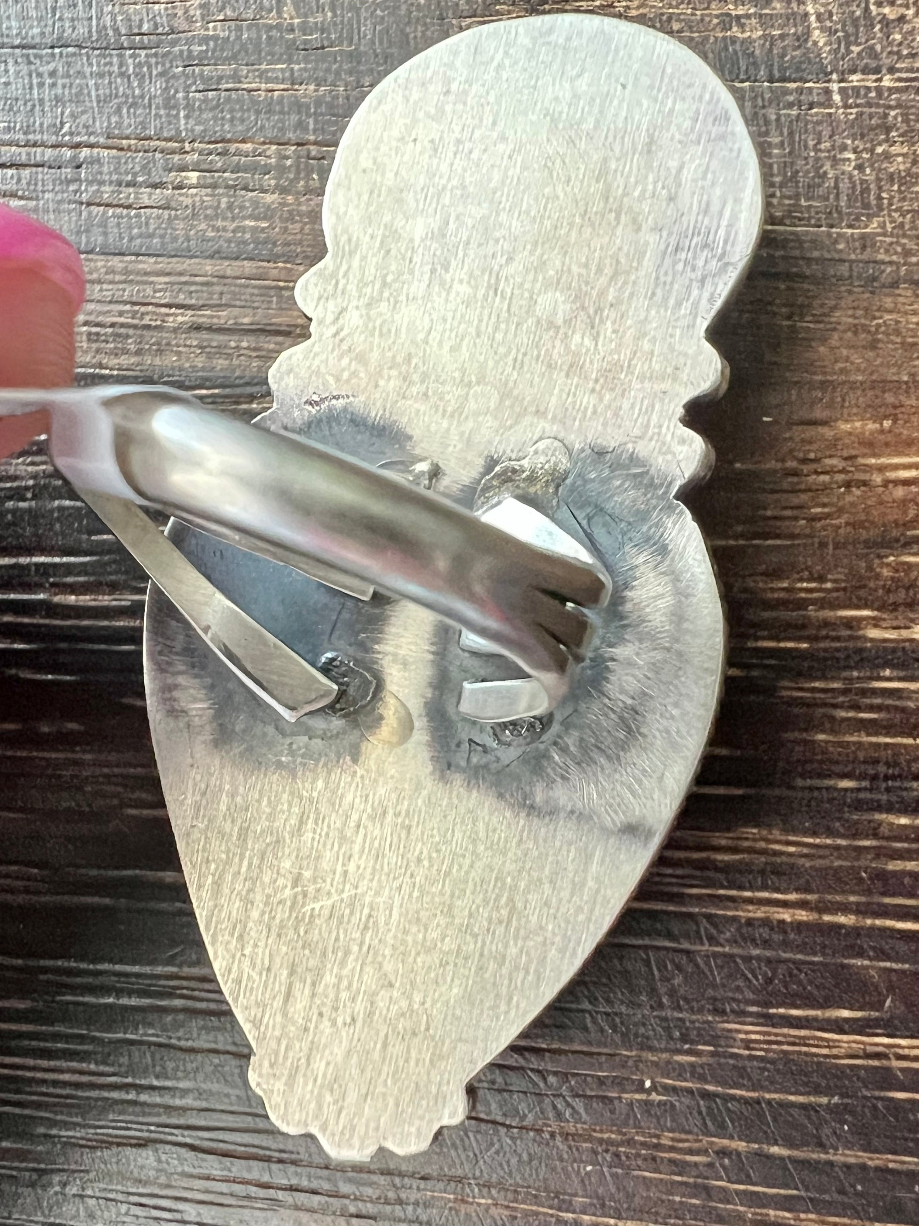 Tim Smith Kingman Turquoise & Sterling Silver Ring Size 8. It measures 2 inches long and 1 1/8 inches wide. Signed by the artist and stamped sterling silver.