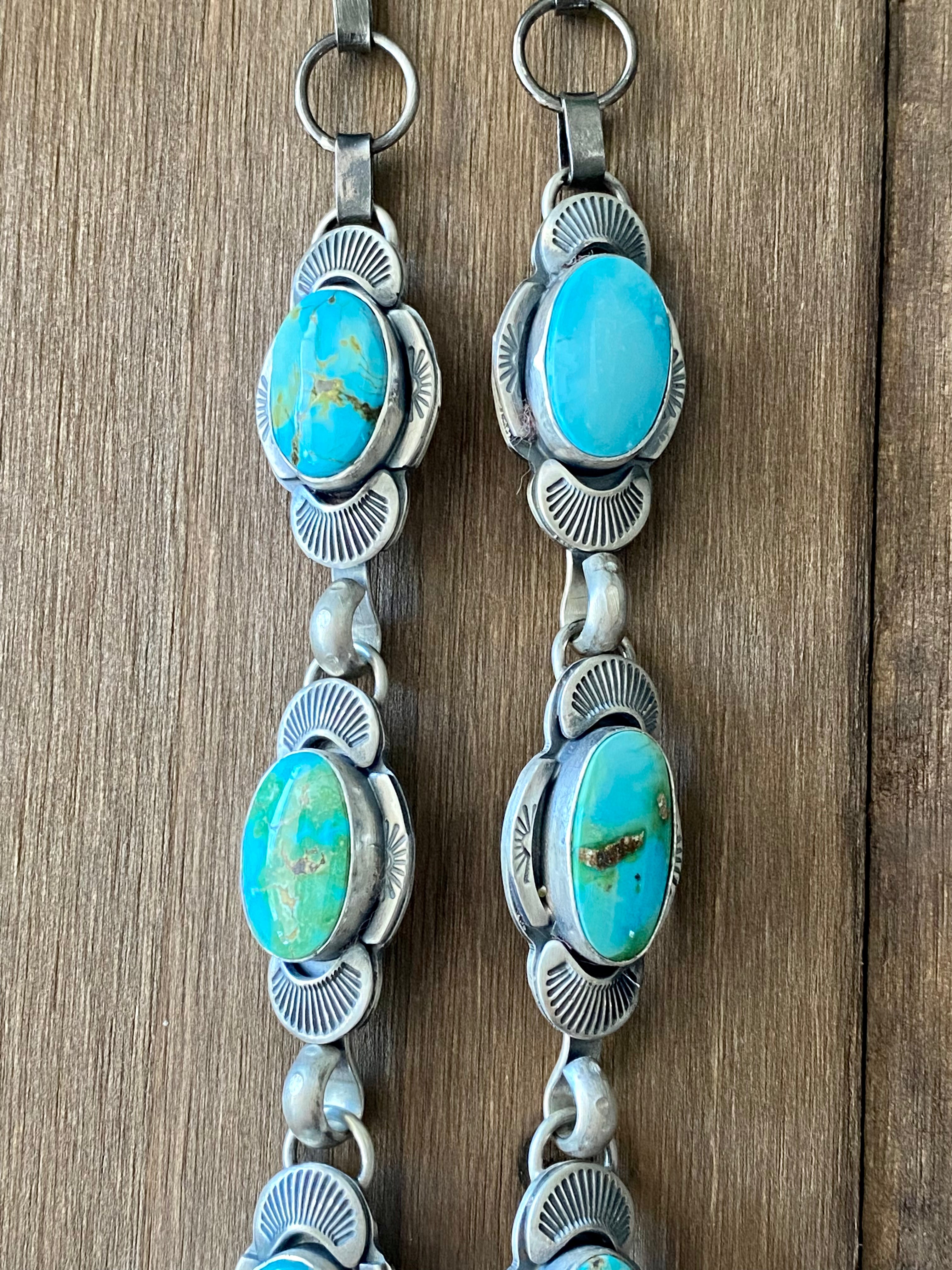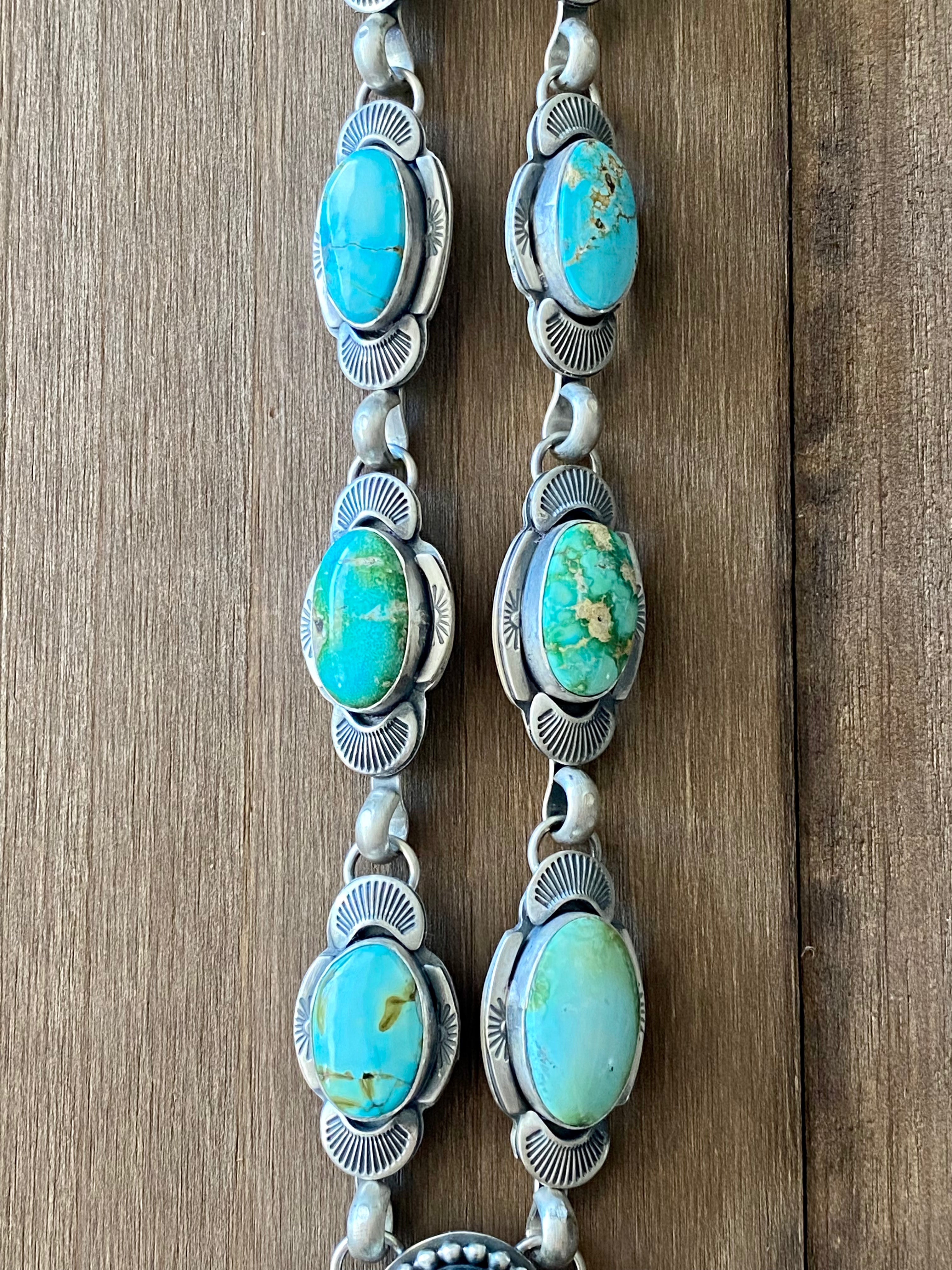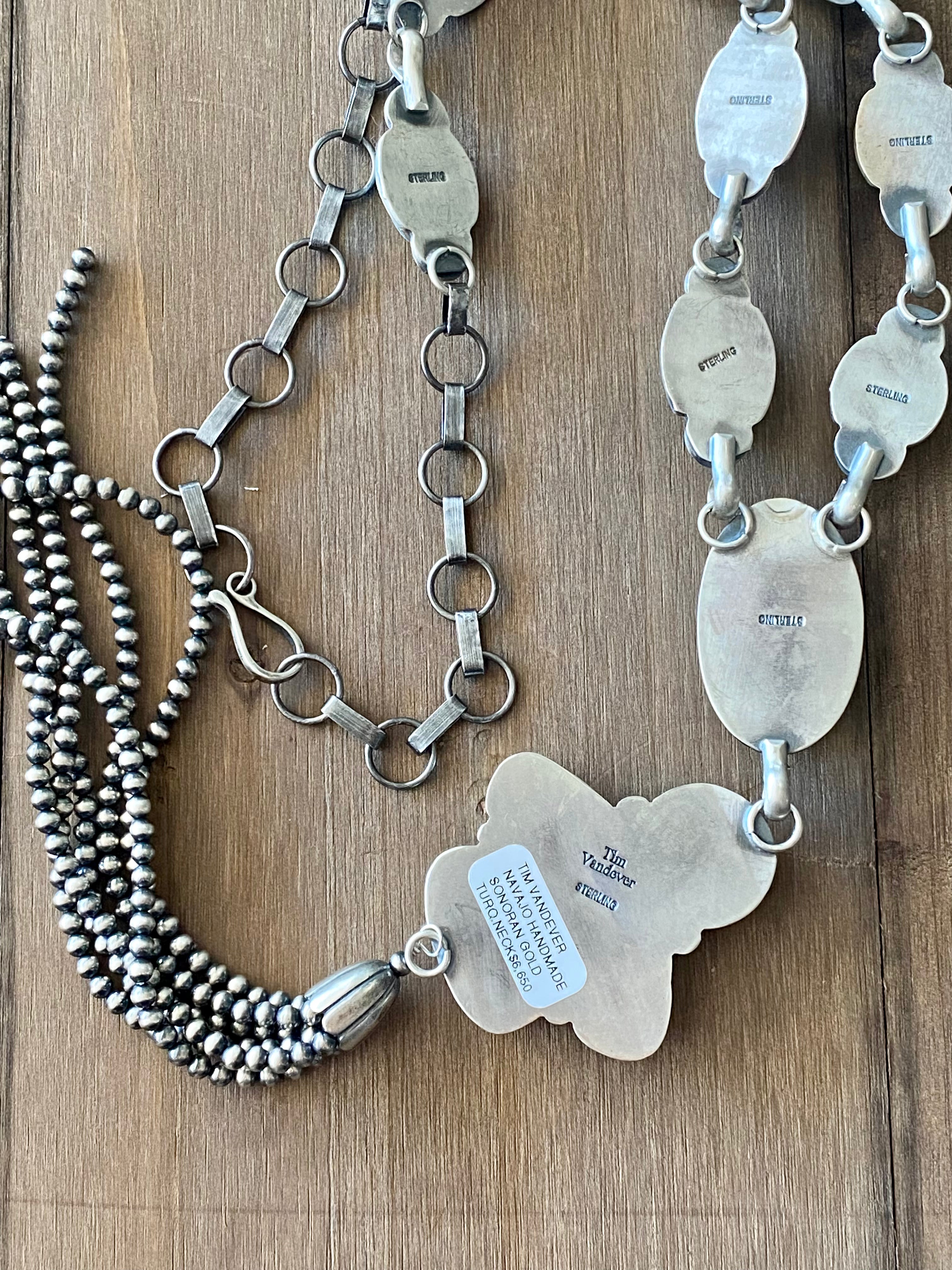 Tim Vandever Sonoran Gold Turquoise & Sterling Silver Cluster Drop Necklace. It measures 49 inches long with hang while the necklace by itself measures 27 inches long. Signed by the artist and stamped sterling silver.