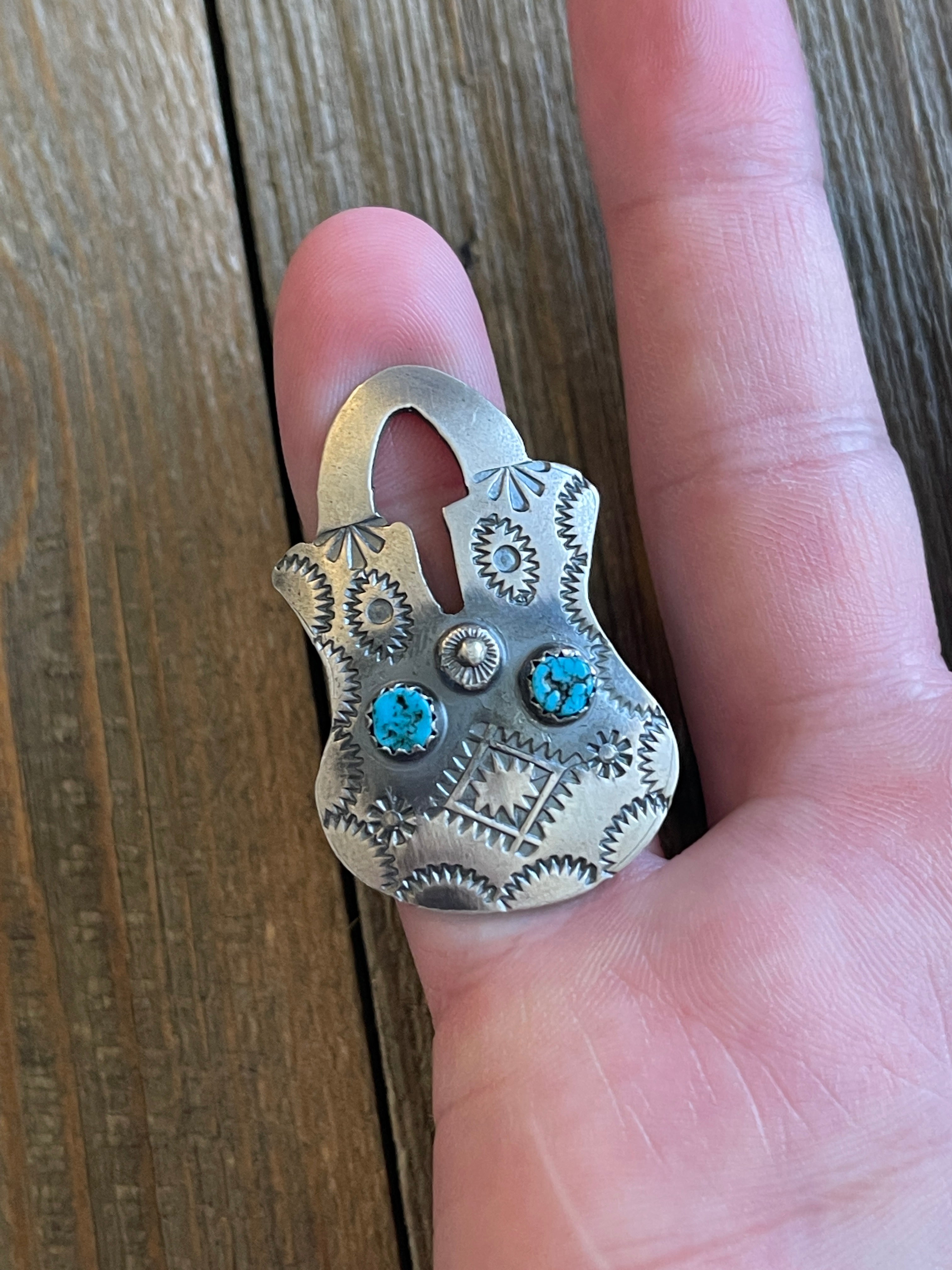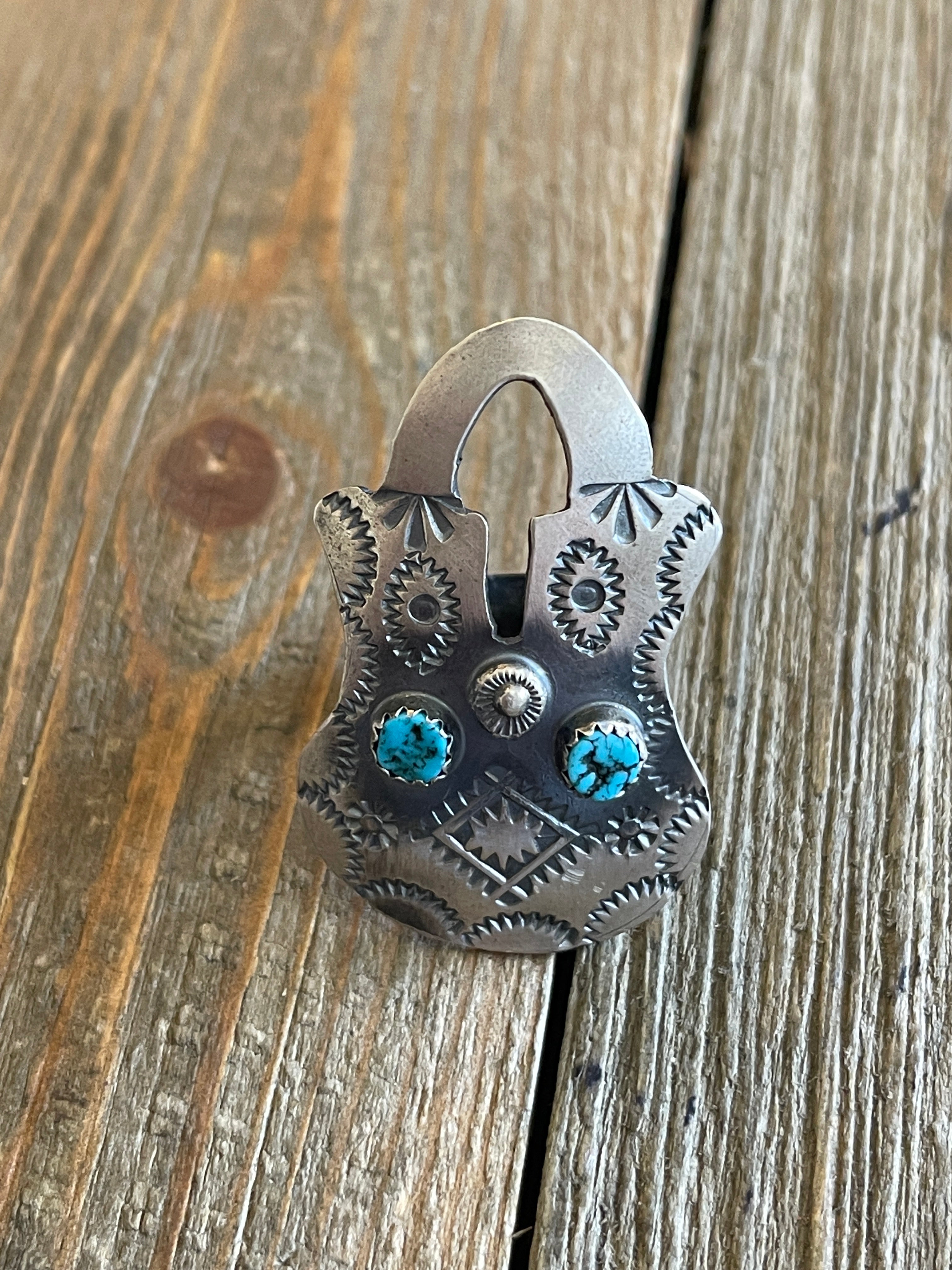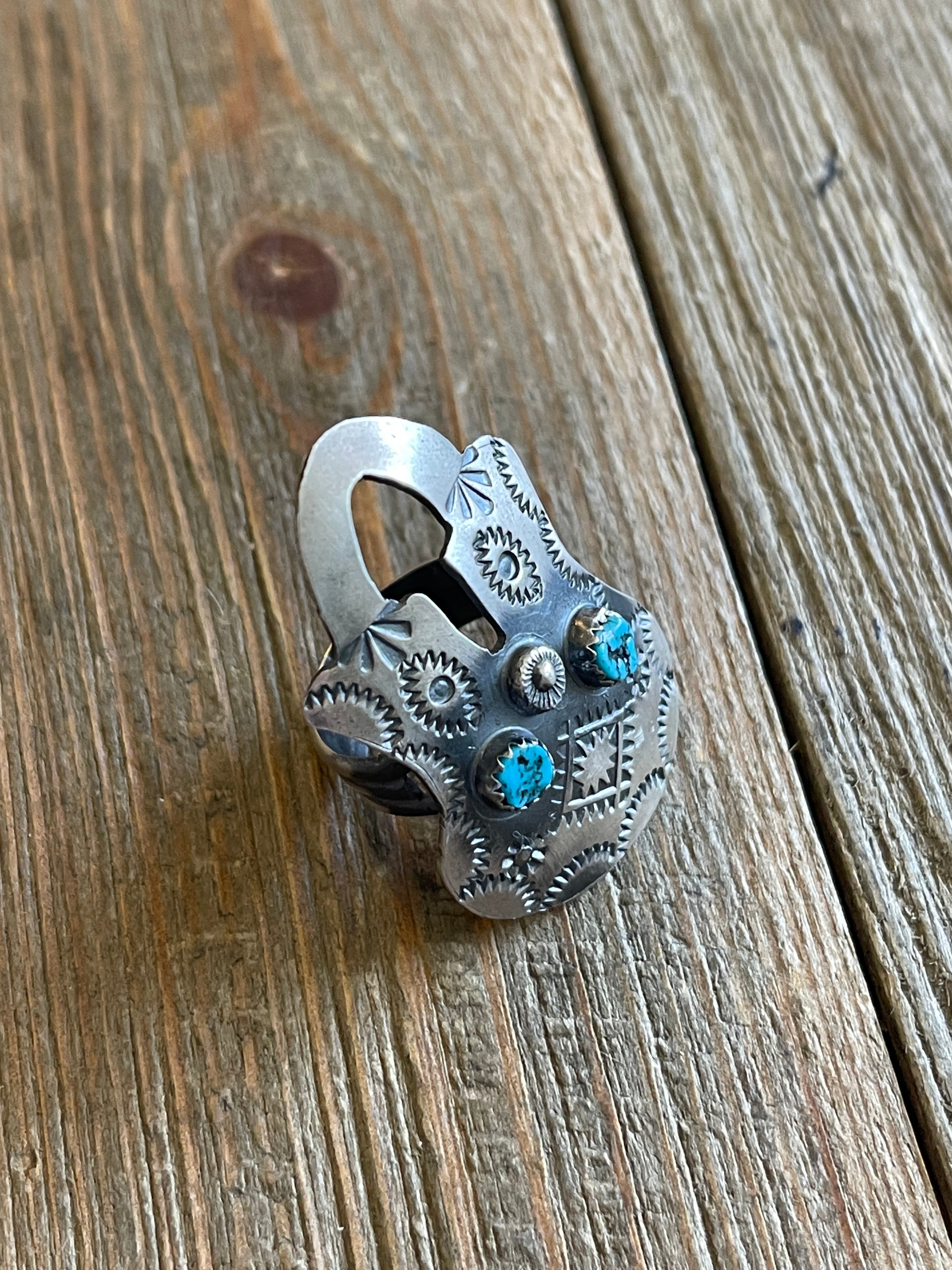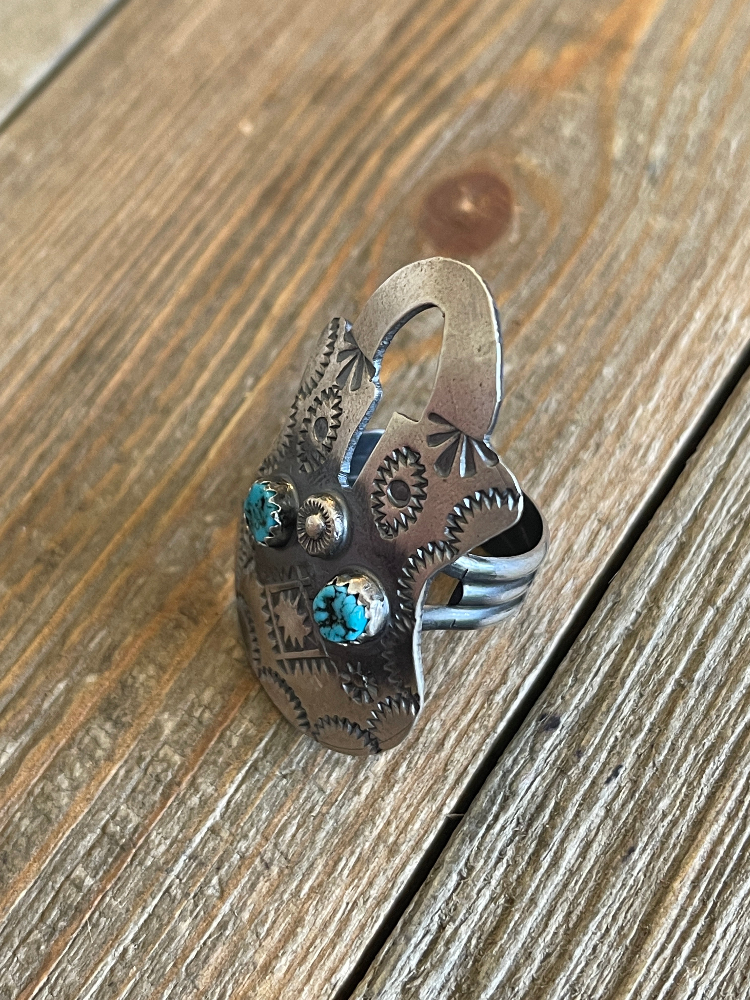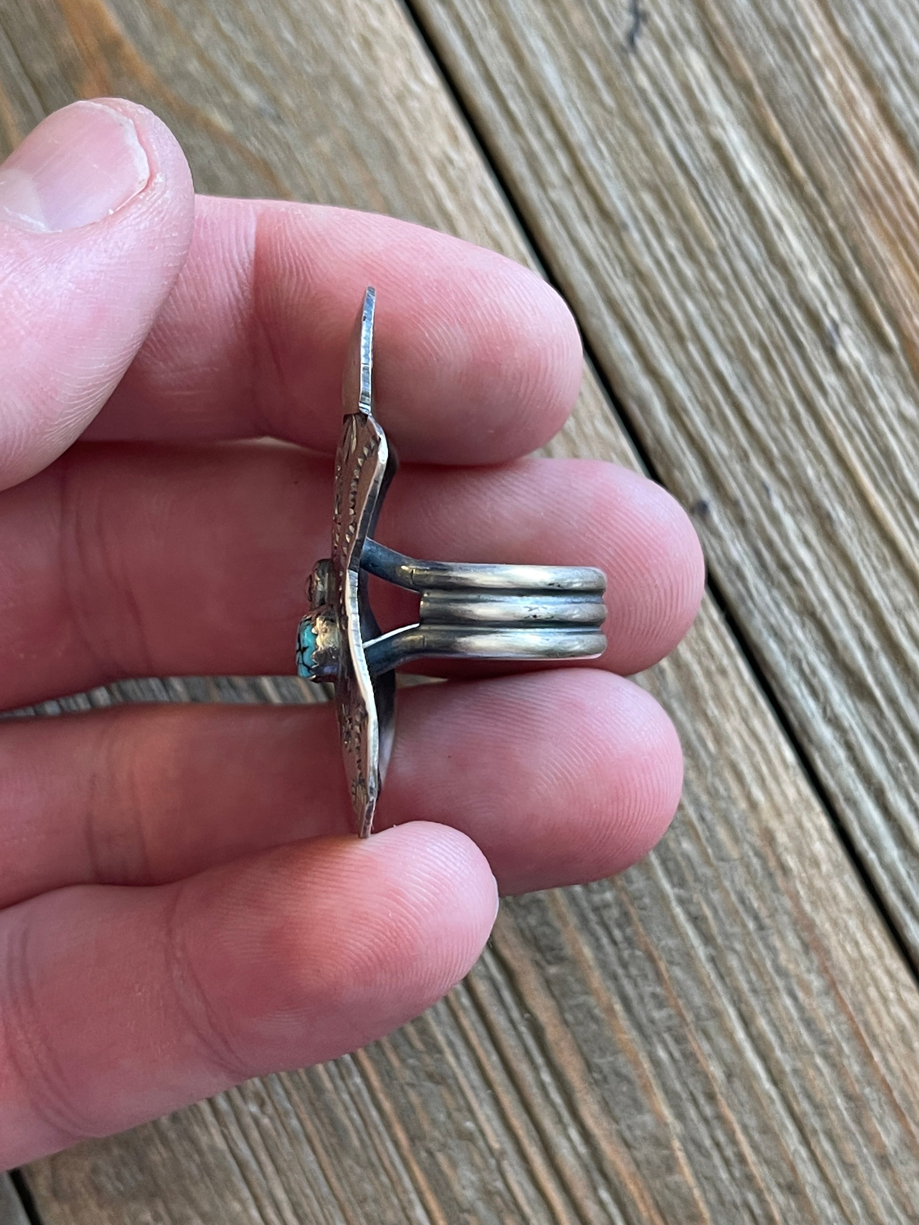 Tim Yazzie Kingman Turquoise & Sterling Silver Vase Ring Size 7. It measures just over 1 5/8 inches long and just over 1 inch wide. Signed by the artist and stamped sterling silver.
