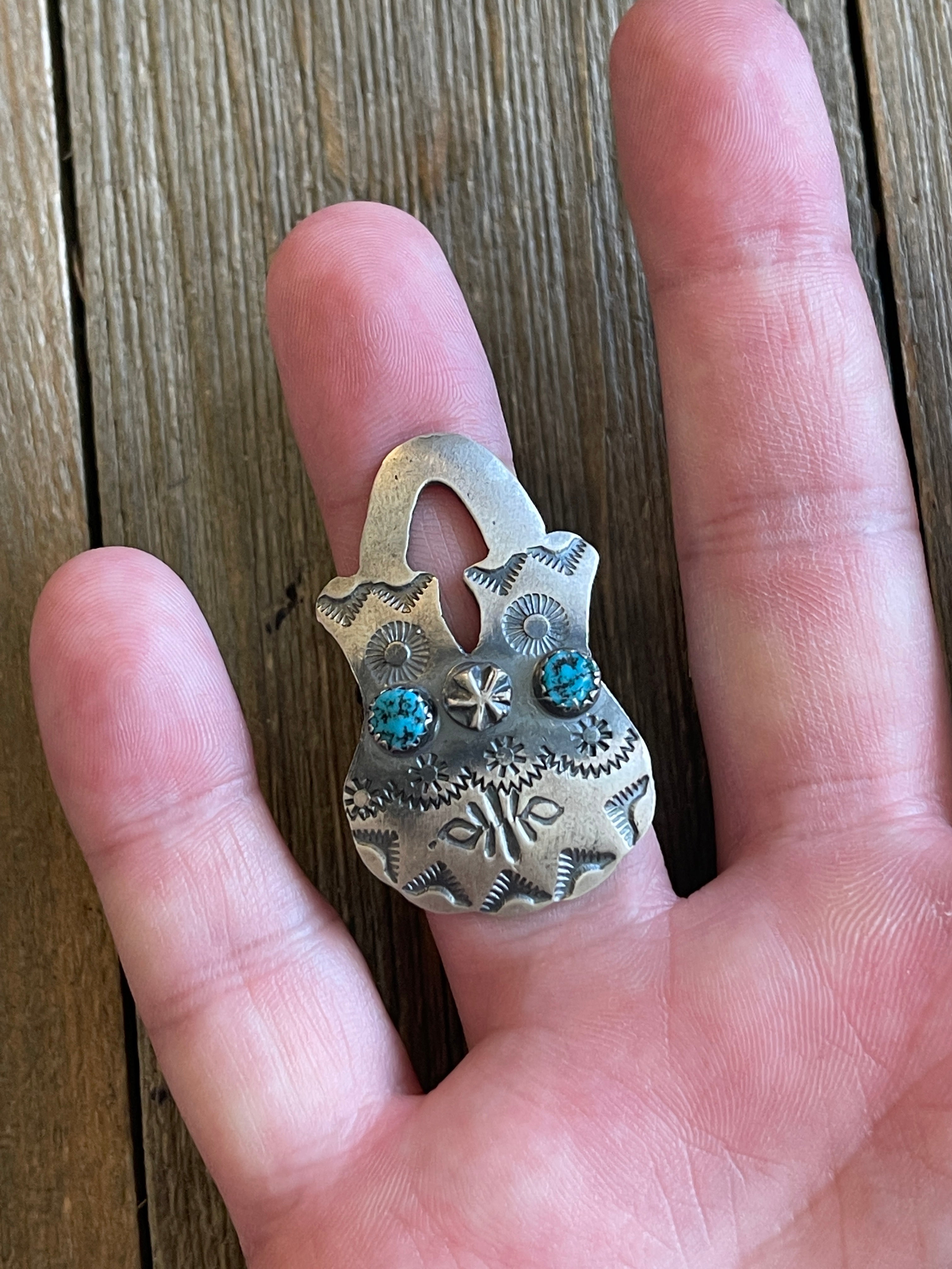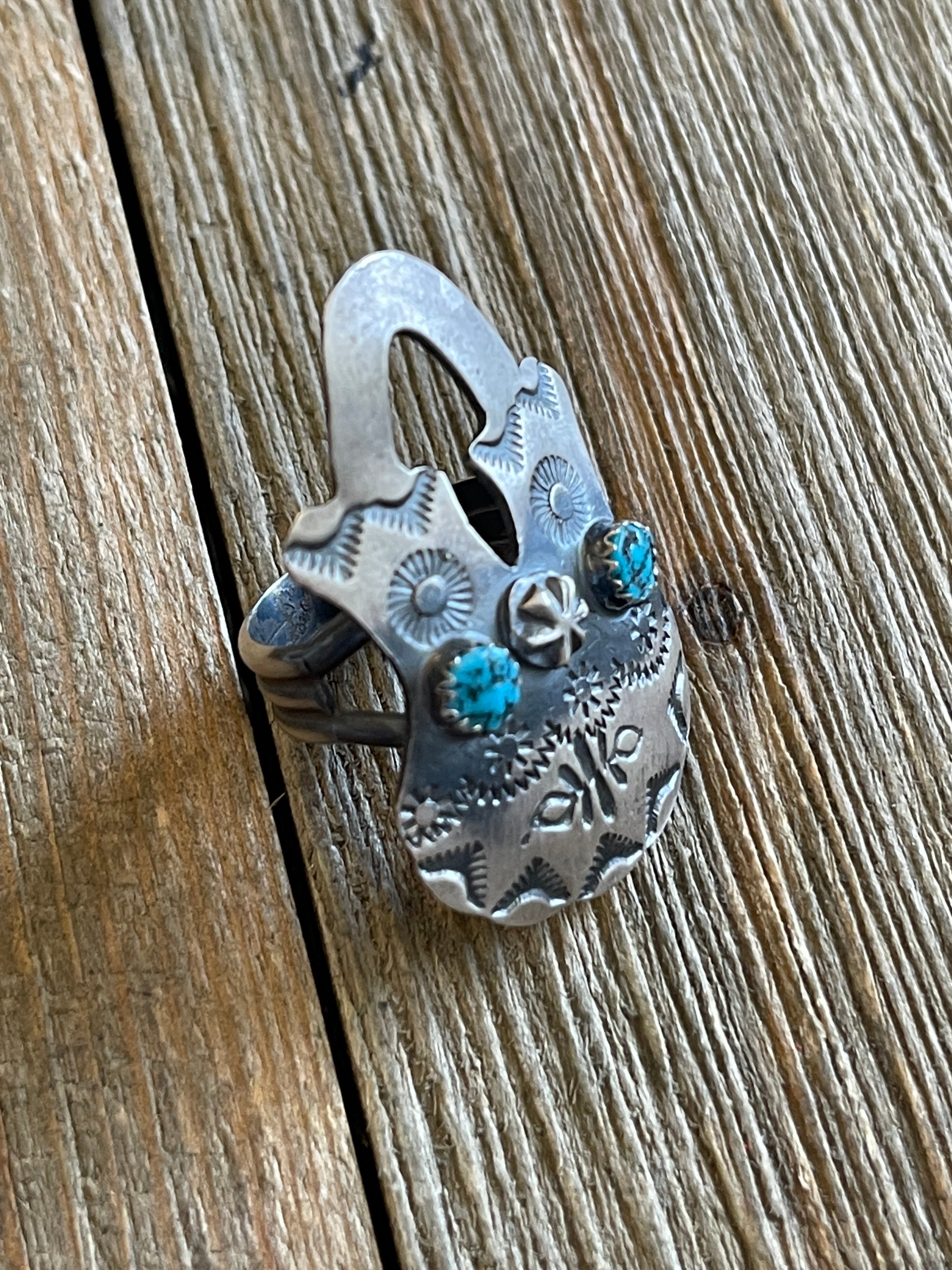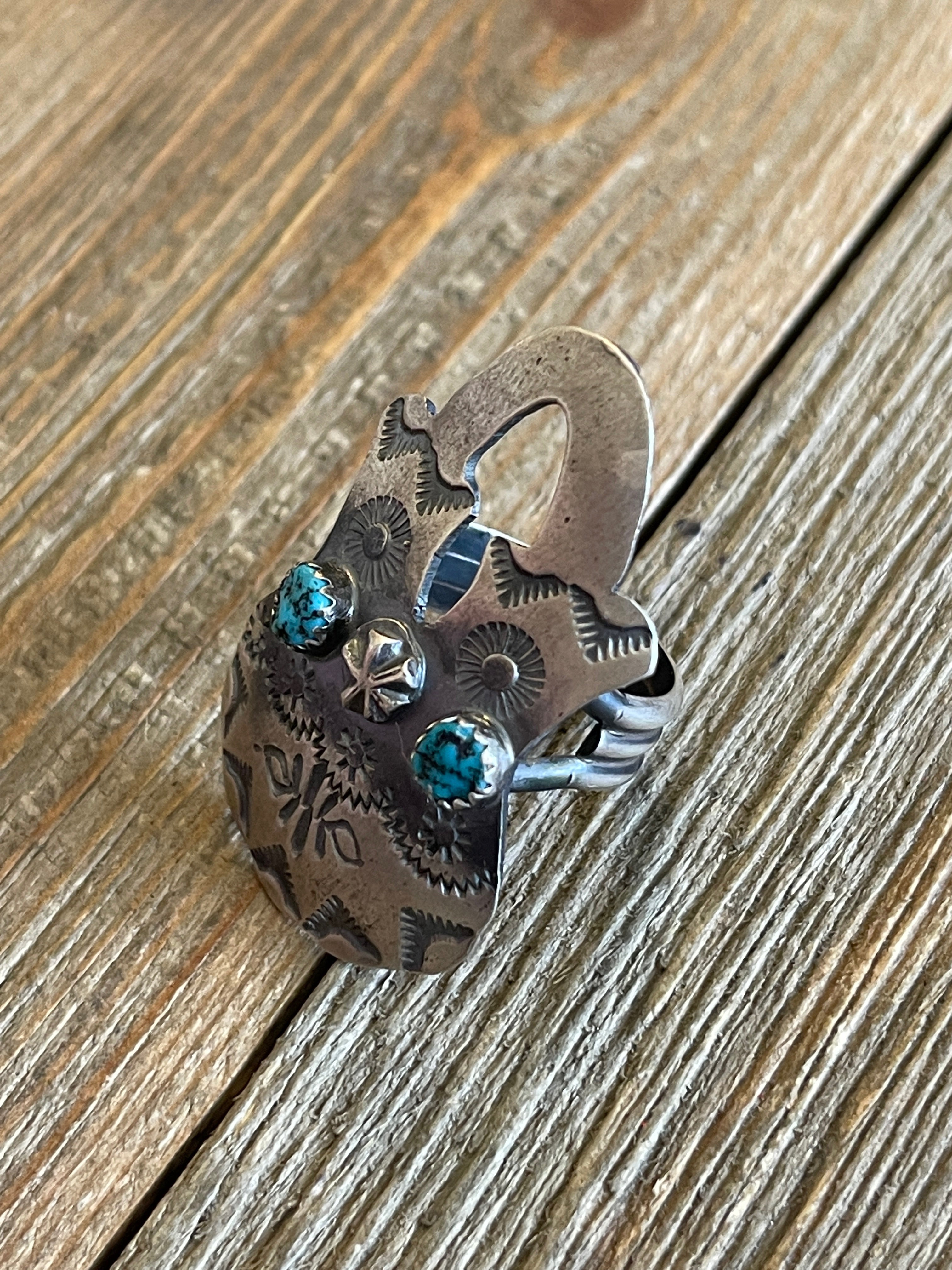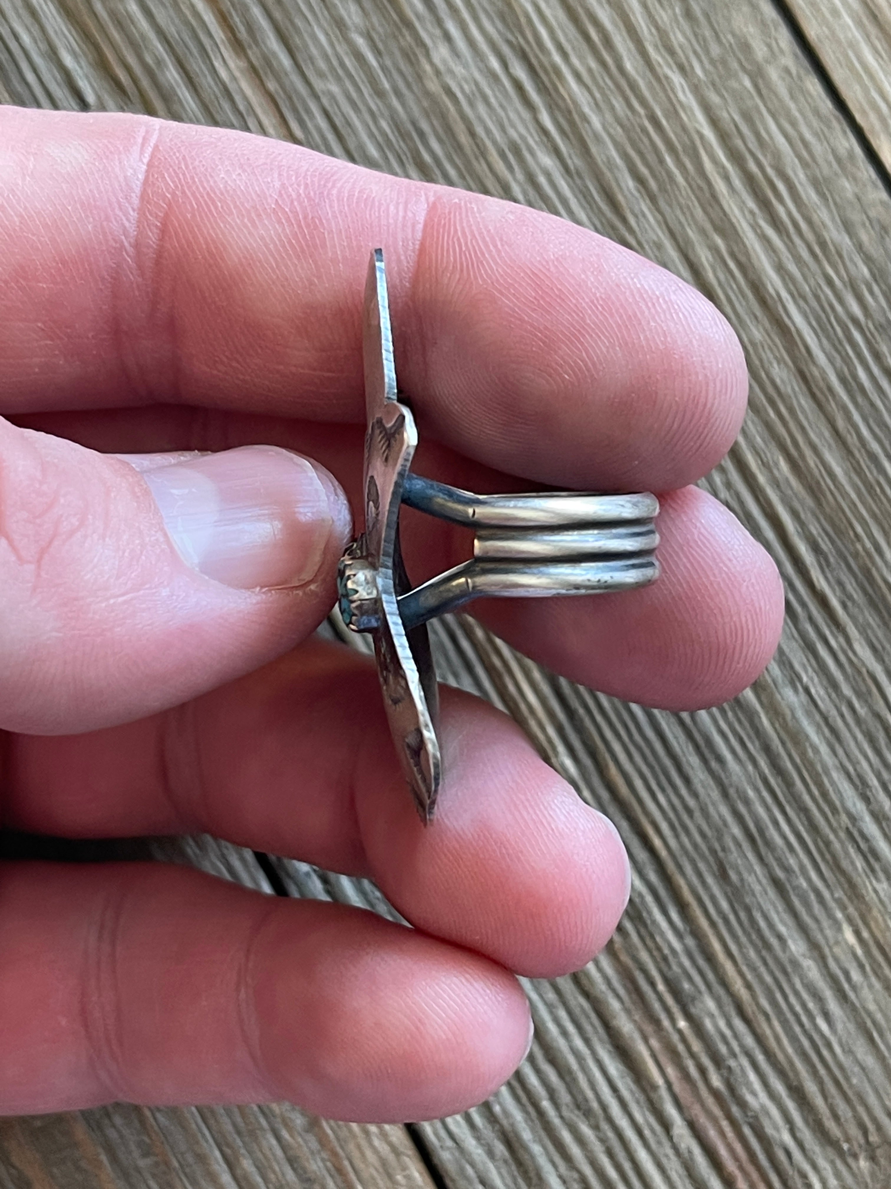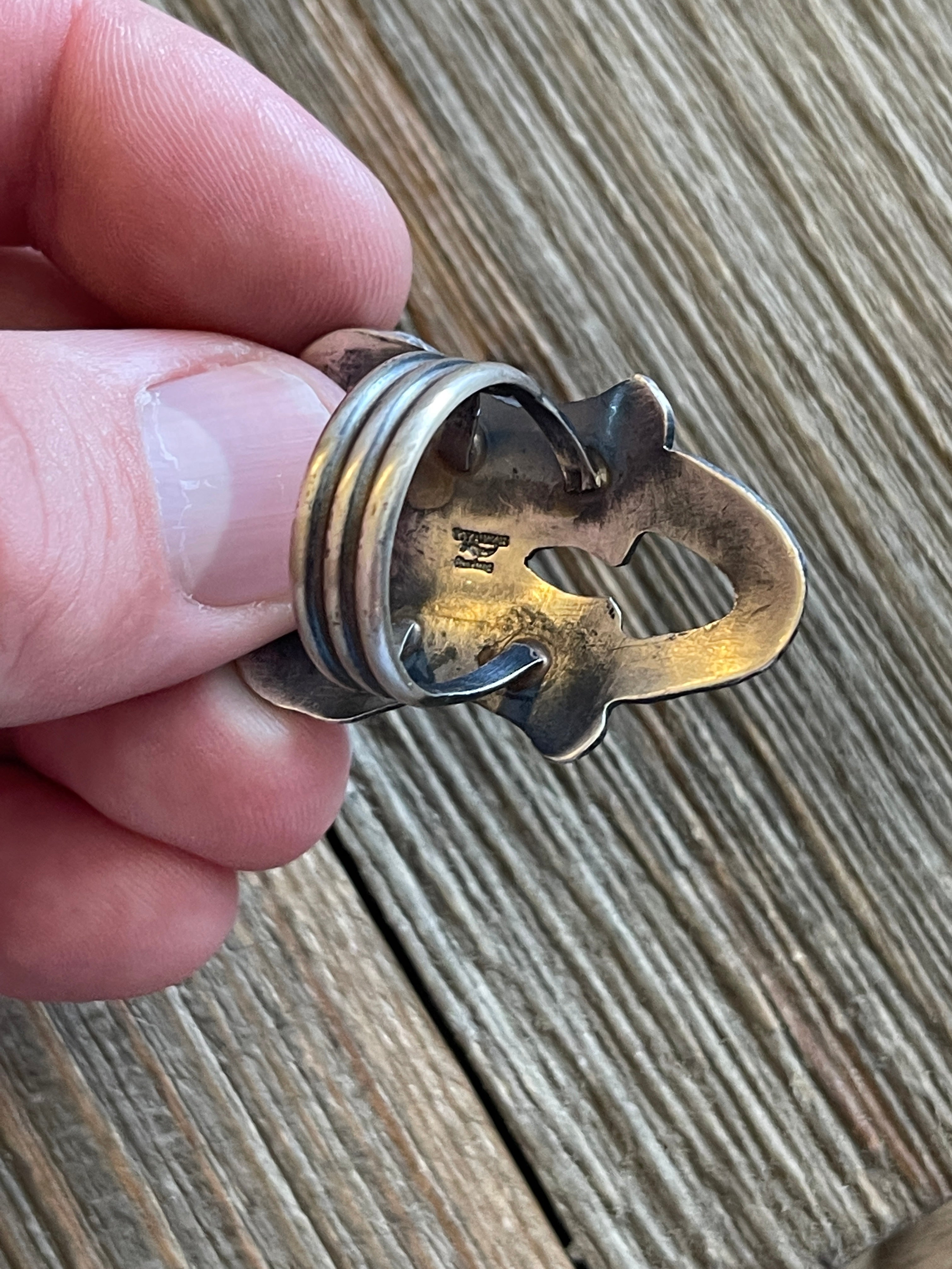 Tim Yazzie Kingman Turquoise & Sterling Silver Vase Ring Size 8. It measures just over 1 5/8 inches long and just over 1 inch wide. Signed by the artist and stamped sterling silver.