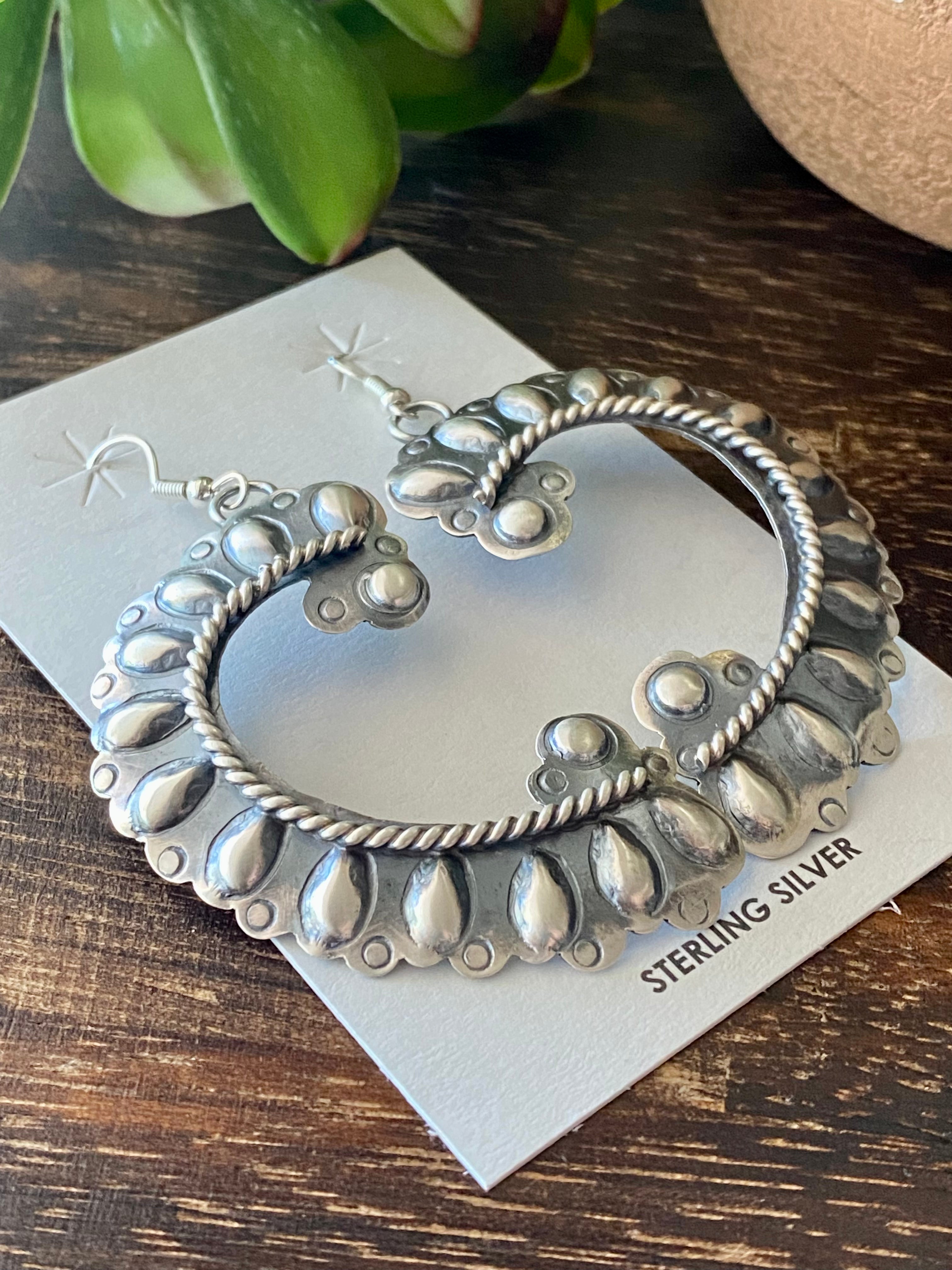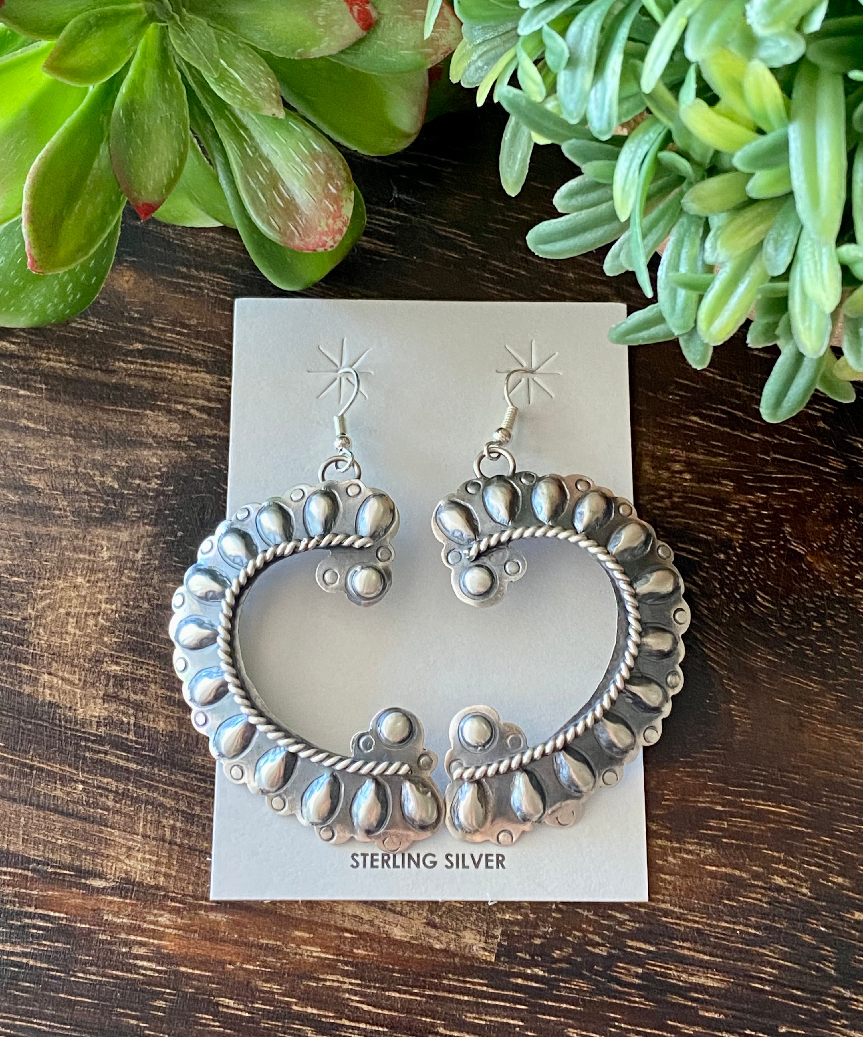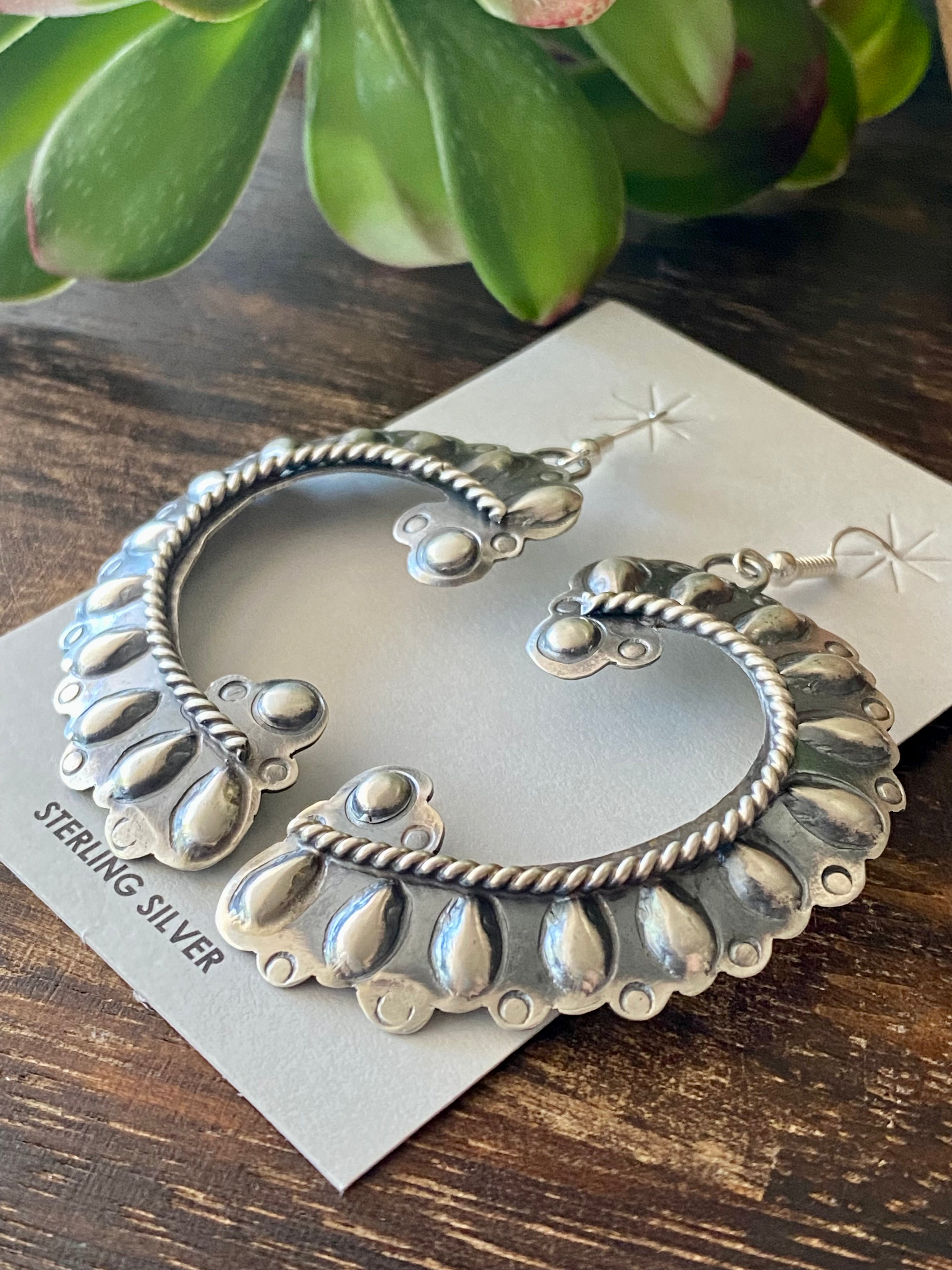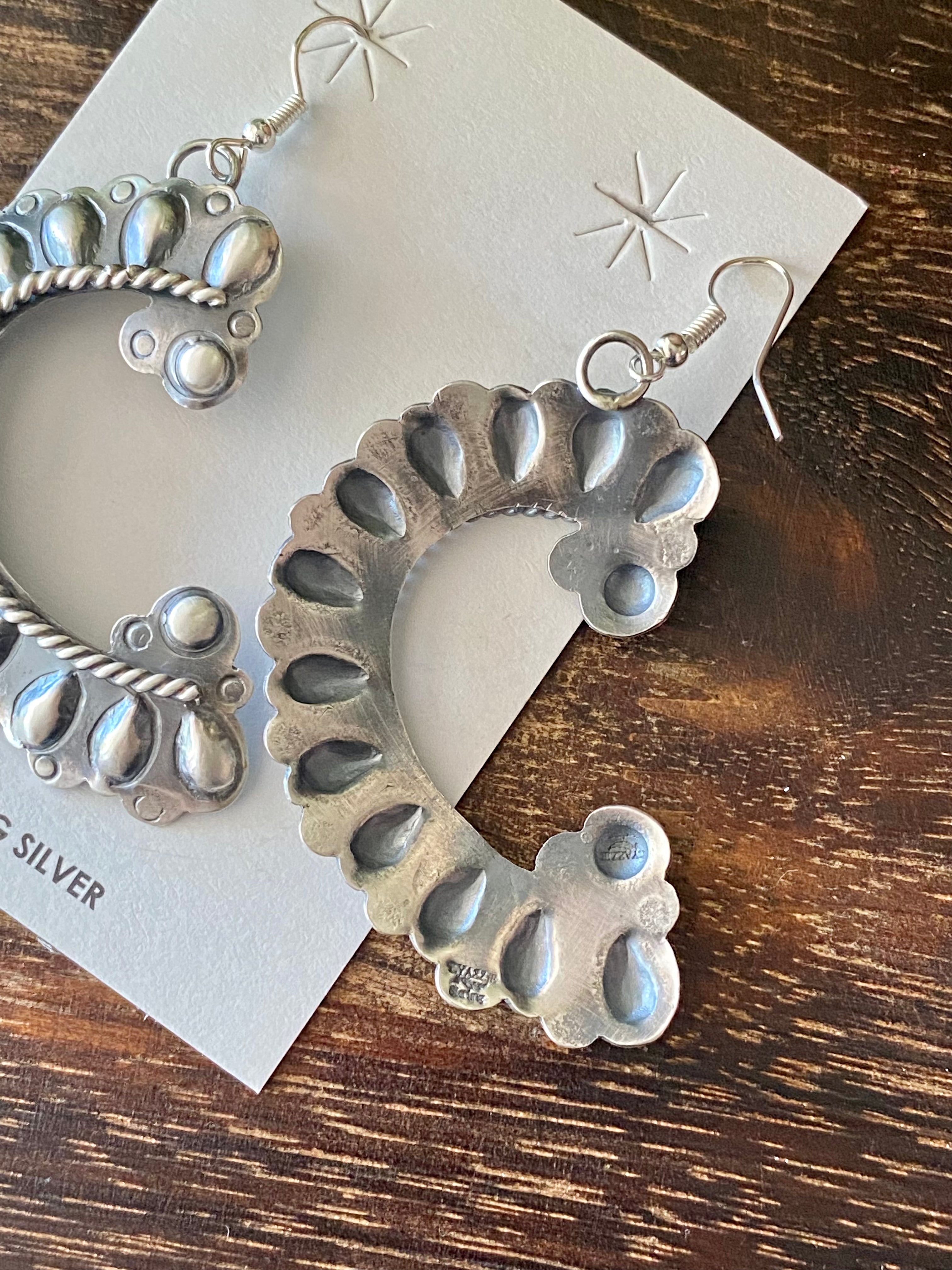 Tim Yazzie Sterling Silver Dangle Earrings. They measure just under 3 inches long and 1 3/8 inches wide. Signed by the artist and stamped sterling silver.