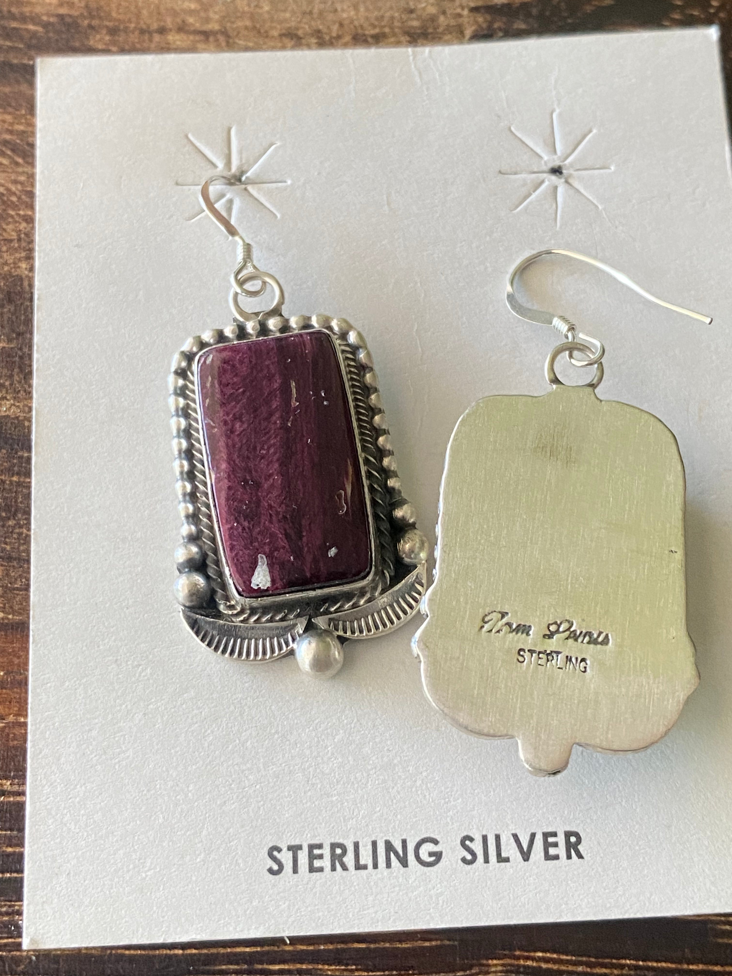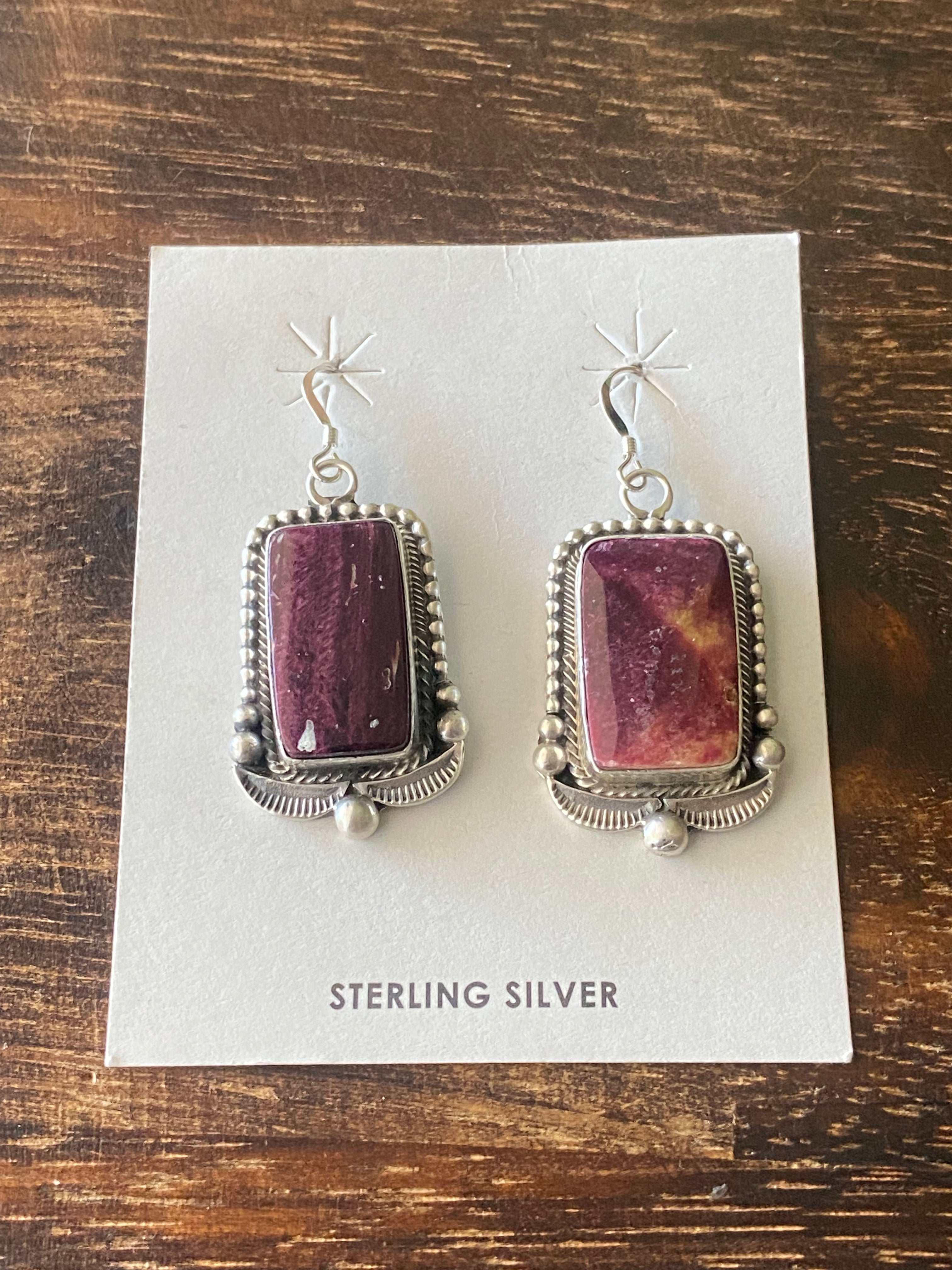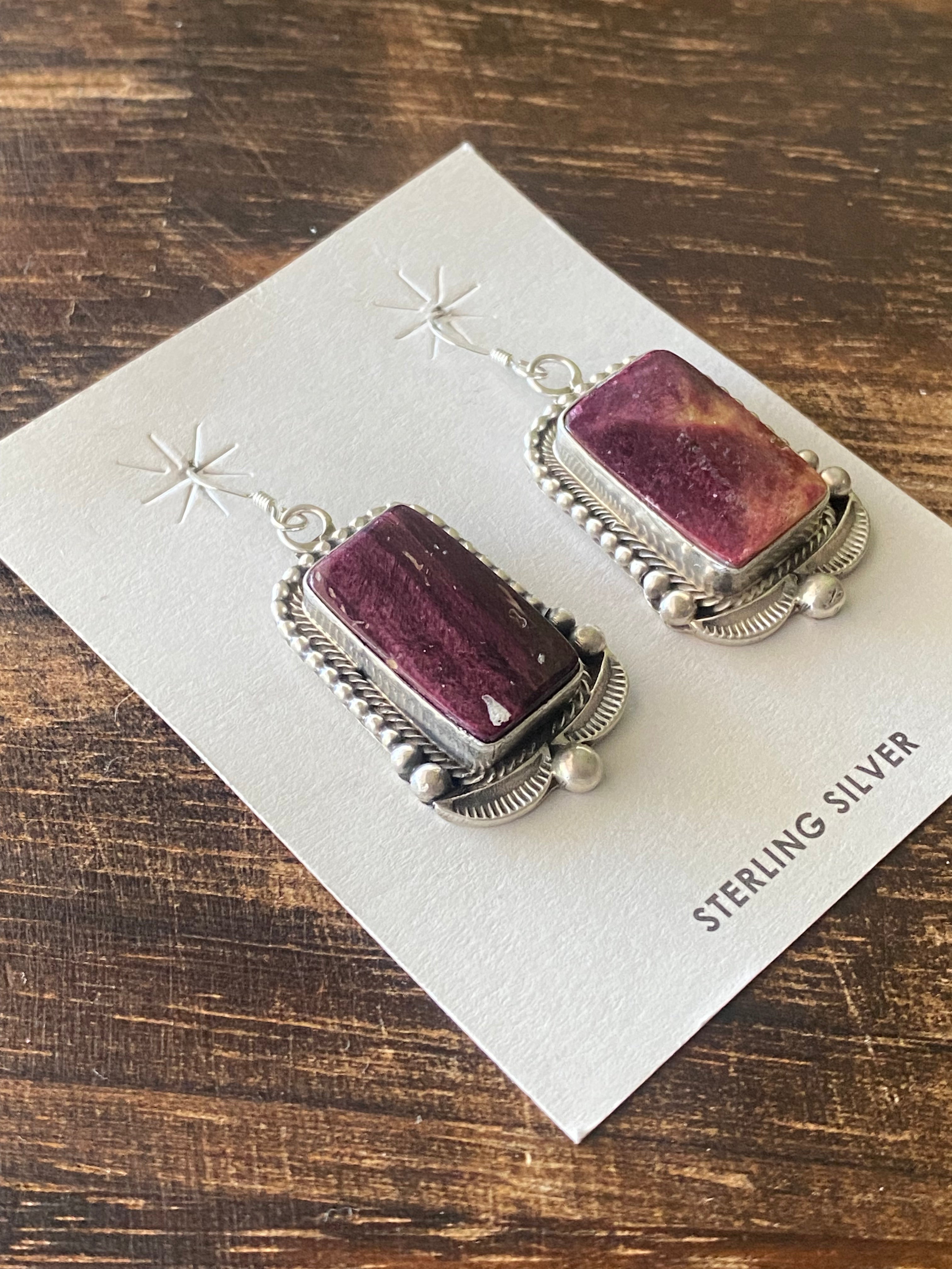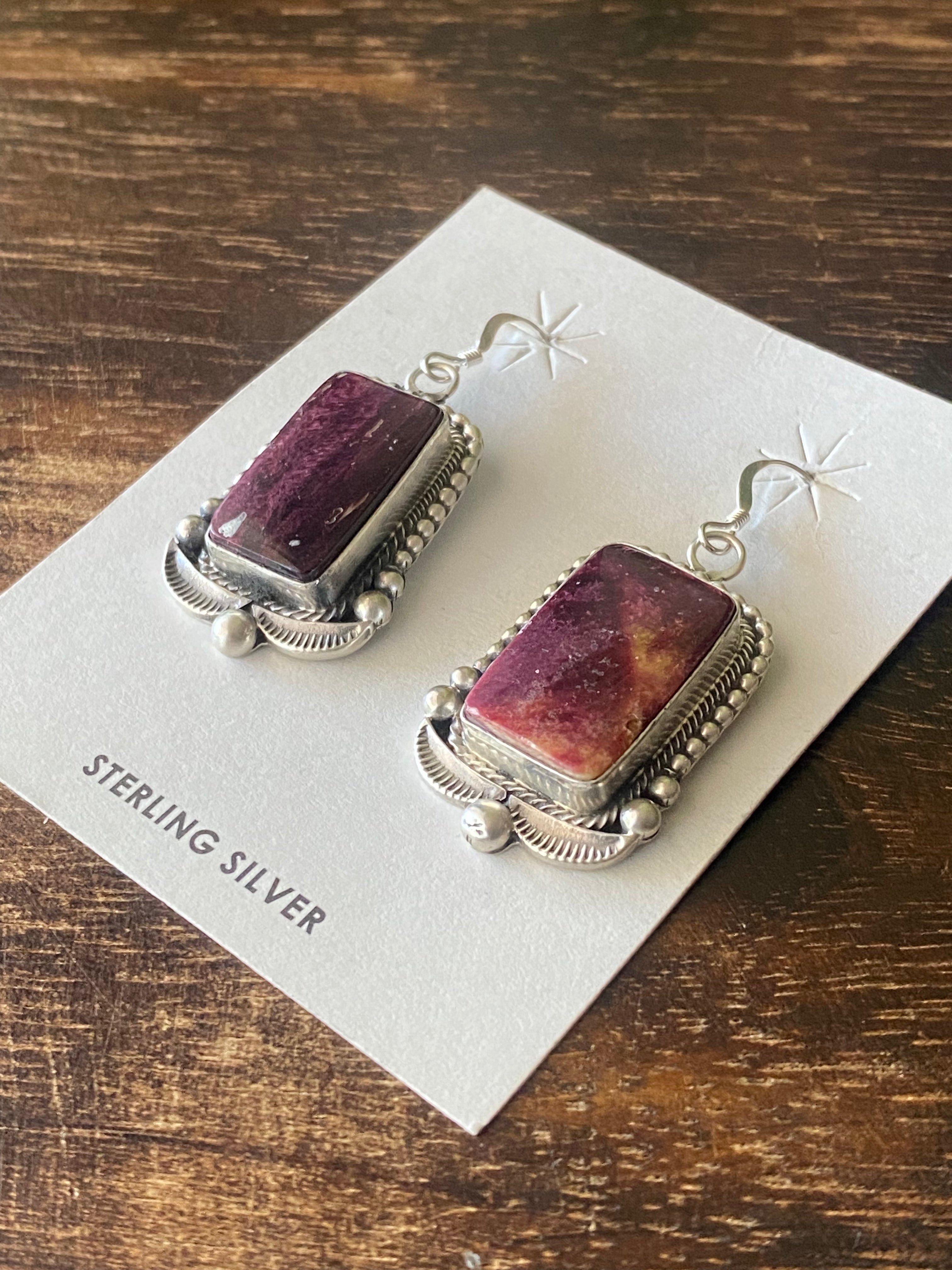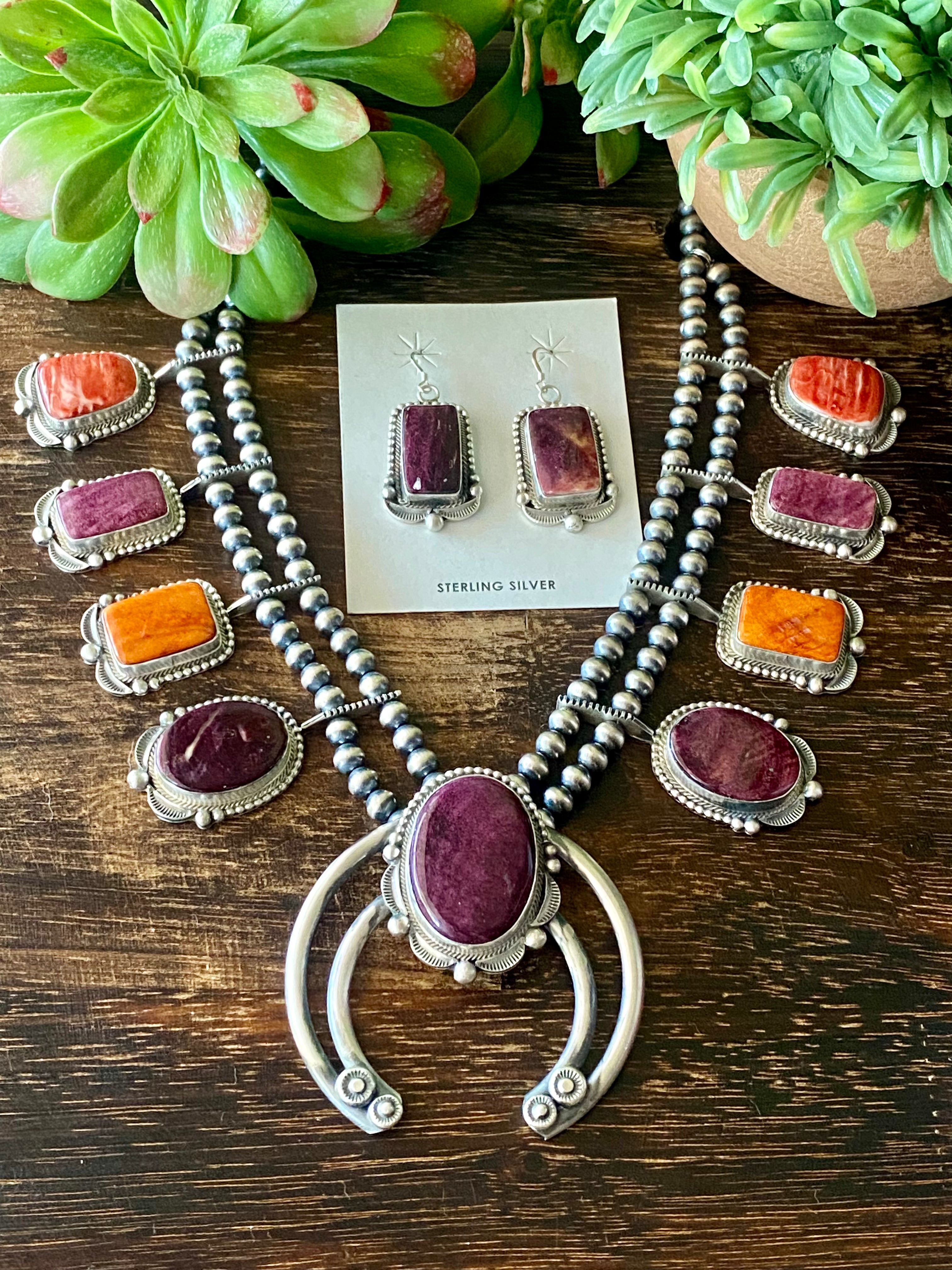 Tom Lewis Spiny Oys & Sterling Silver Squash Necklace Set. The necklace measures 29 inches long with hang while the earrings measure 1 3/4 inches long and 7/8 of an inch wide. Signed by the artist and stamped sterling silver.