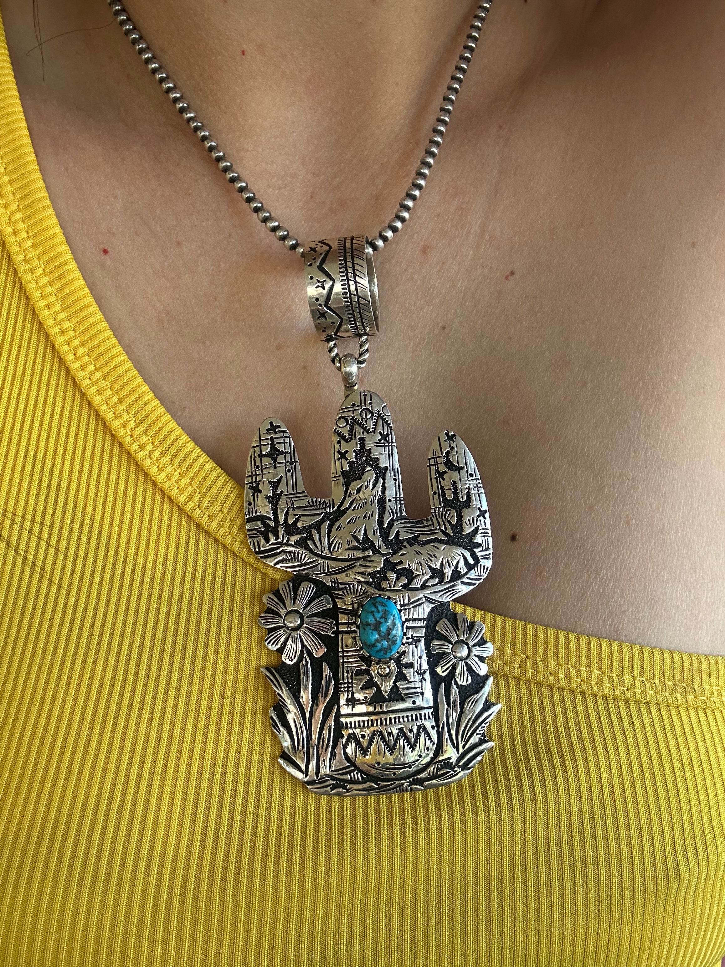 Tommy & Rose Singer Kingman Turquoise & Sterling Silver Cactus Pendant