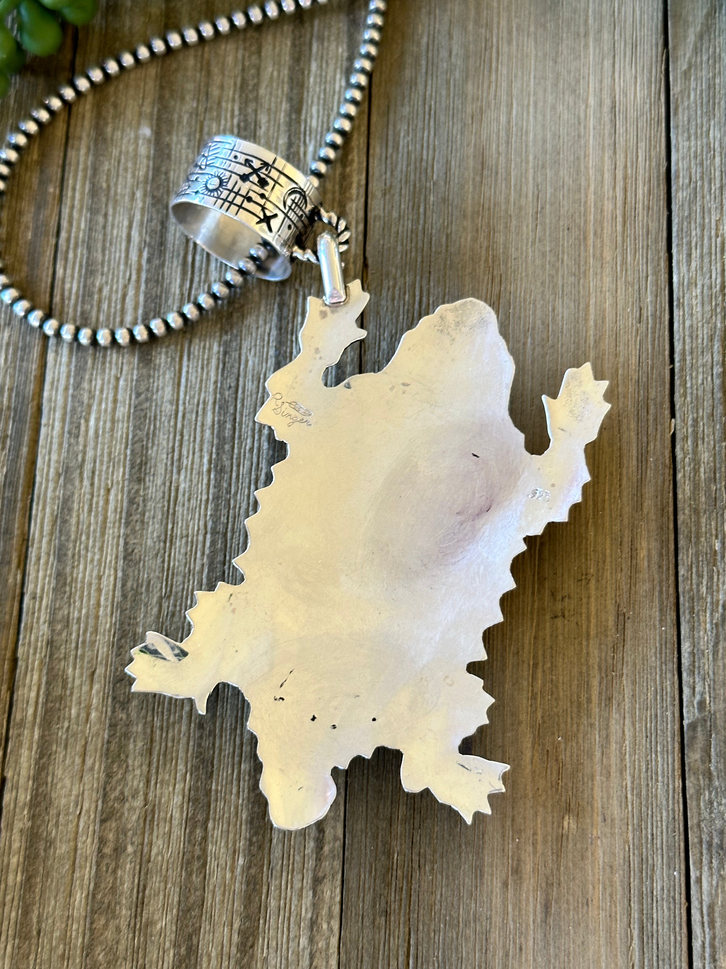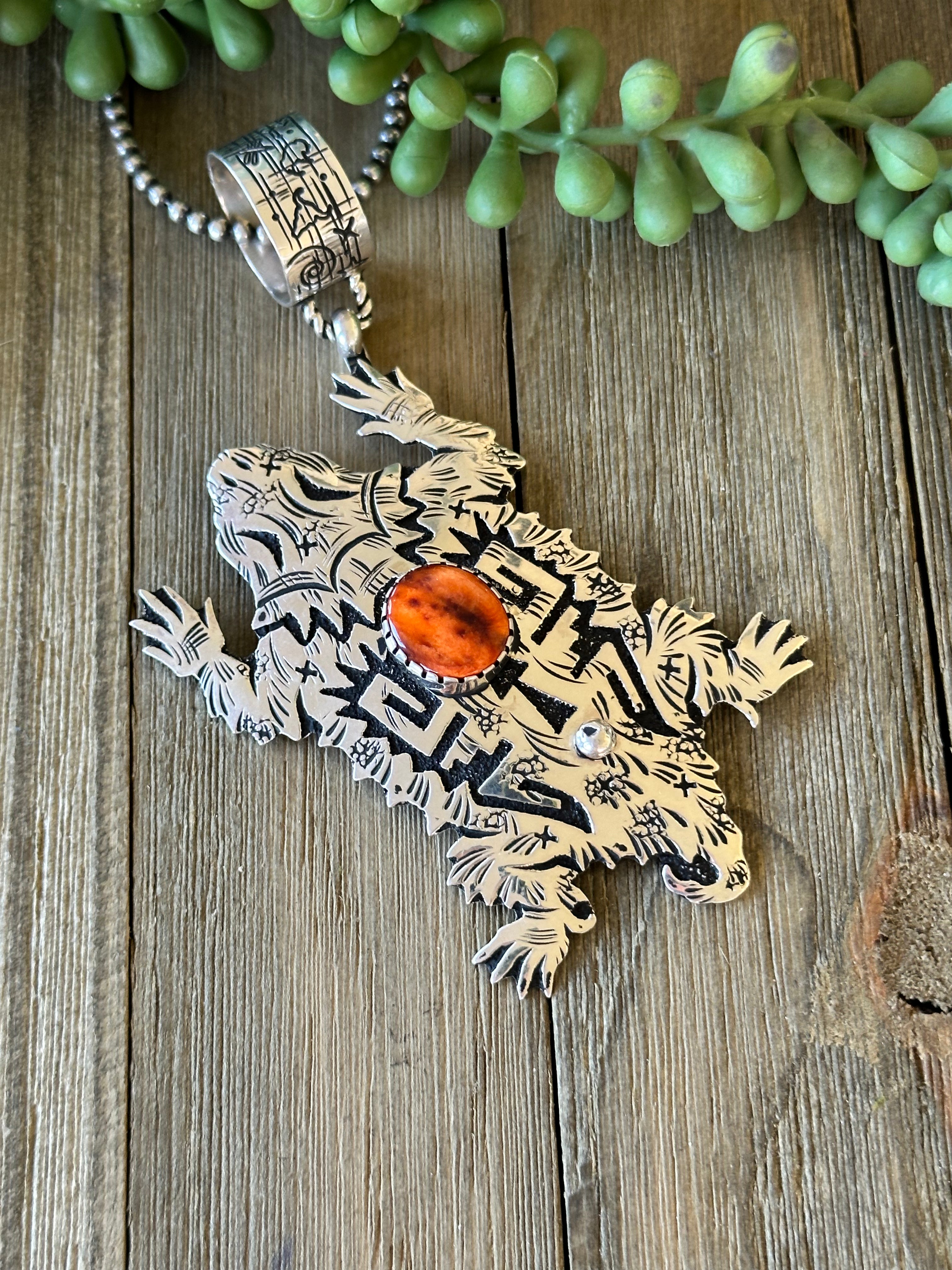 Check out this amazing design. Tommy & Rose Singer Spiny Oyster & Sterling Silver Horny Toad Pendant. It measures 4 1/2 inches long and 2 inches wide. Signed by the artist and stamped sterling silver. Pendant only!
