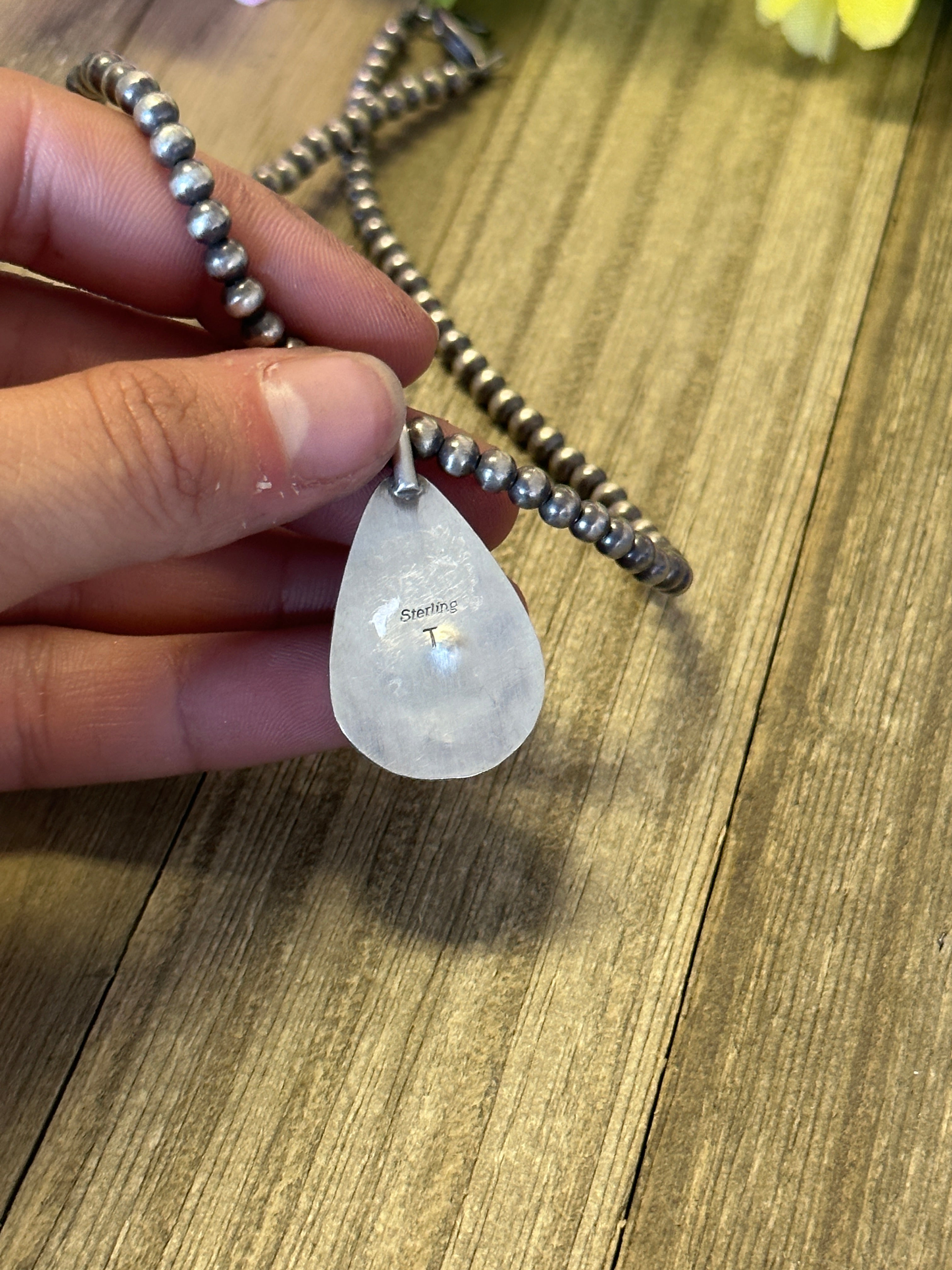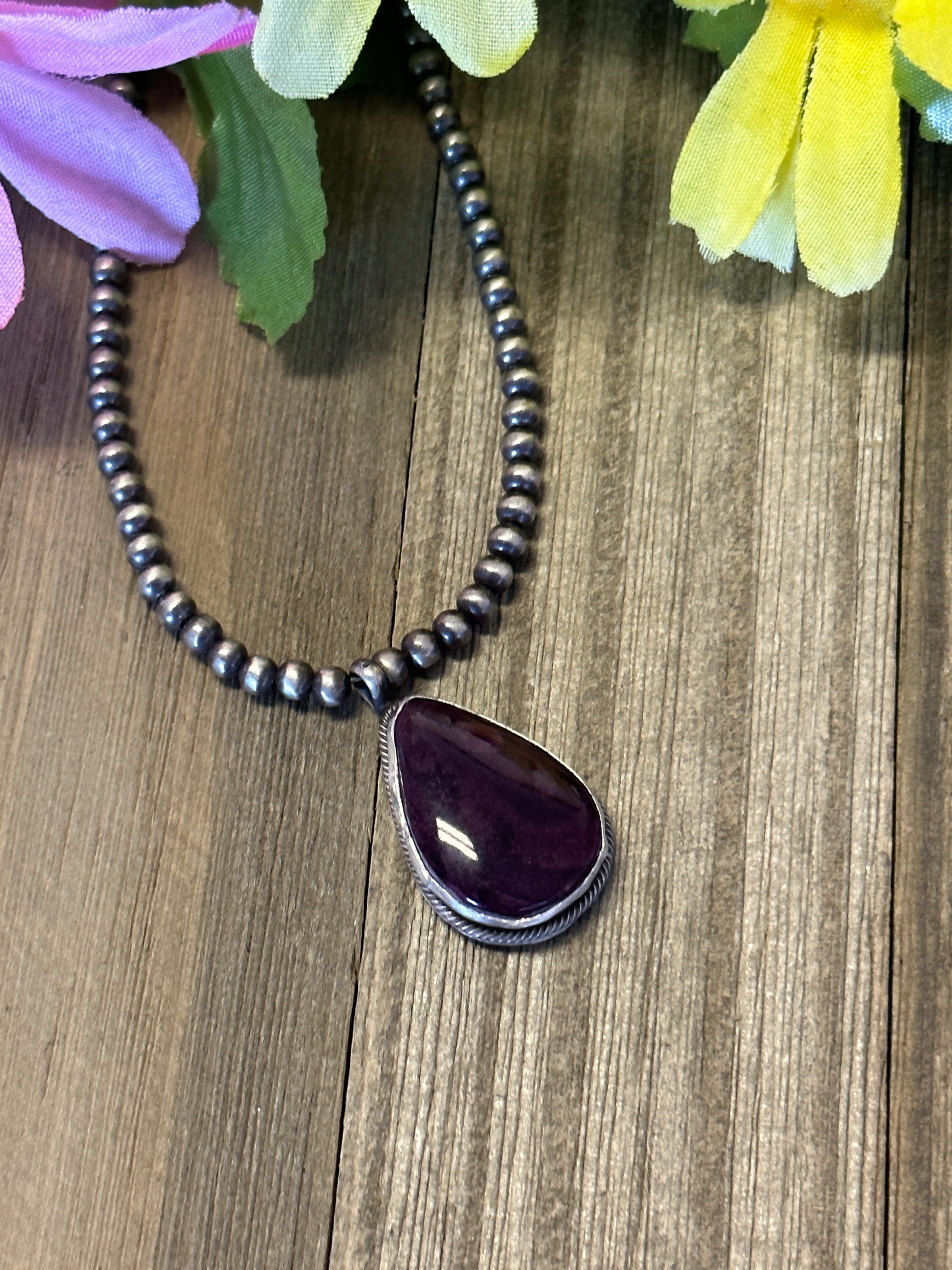 Tony Skeets Purple Spiny Oyster & Sterling Silver Necklace. It measures just under 16 1/2 inches long with hang while the chain by itself measures 14 inches long. Signed by the artist and stamped sterling silver.