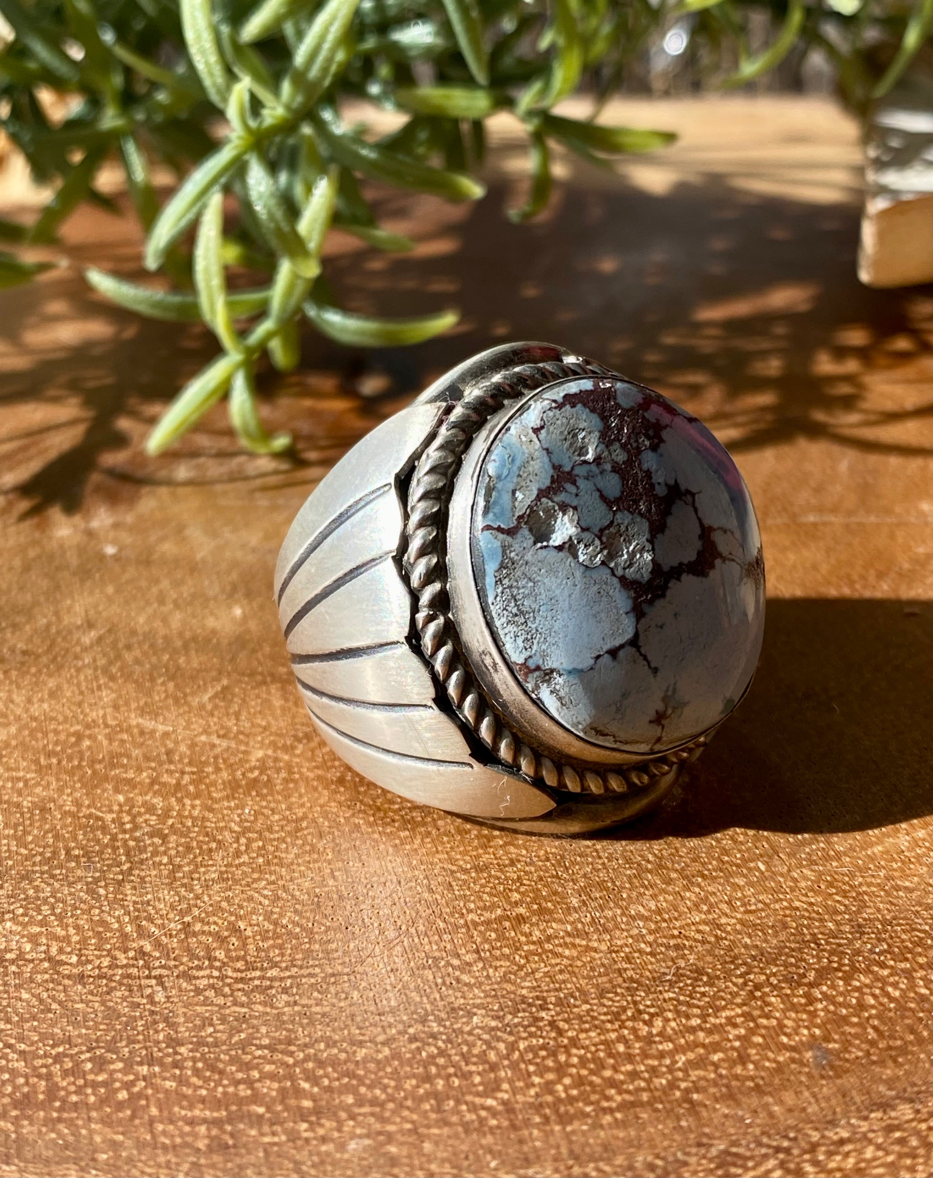 Tony Yazzie Golden Hill’s Turquoise & Sterling Silver Men’s Ring Size 13. It measures just over 1 1/4 inches long and 7/8 of an inch wide. Signed by the artist and stamped sterling silver.