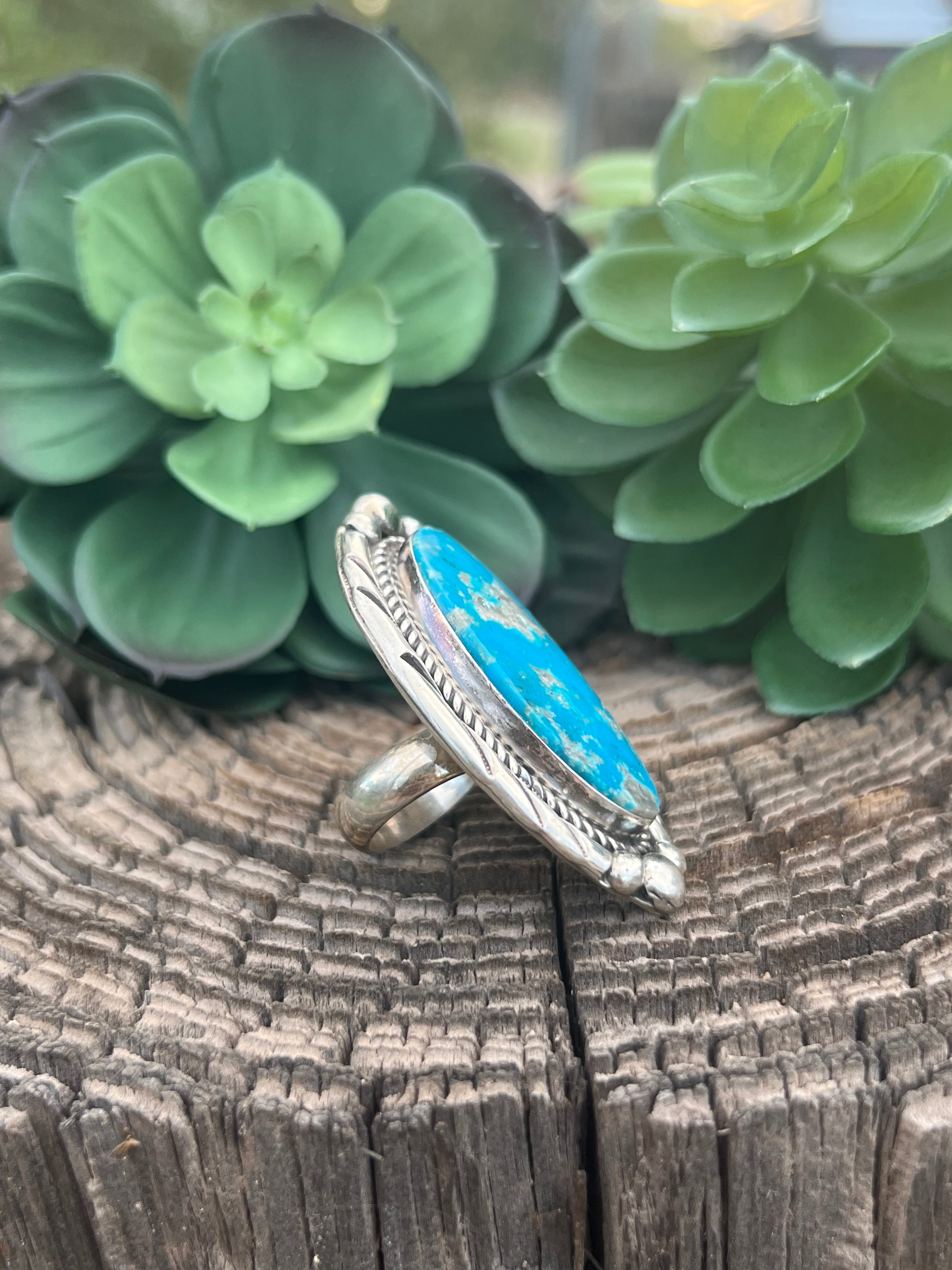 Tony Yazzie Kingman Turquoise & Sterling Silver Adjustable Ring Size 8.5. It measures 2 1/4 inches long and 1 1/4 inches wide. Signed by artist and stamped sterling silver.