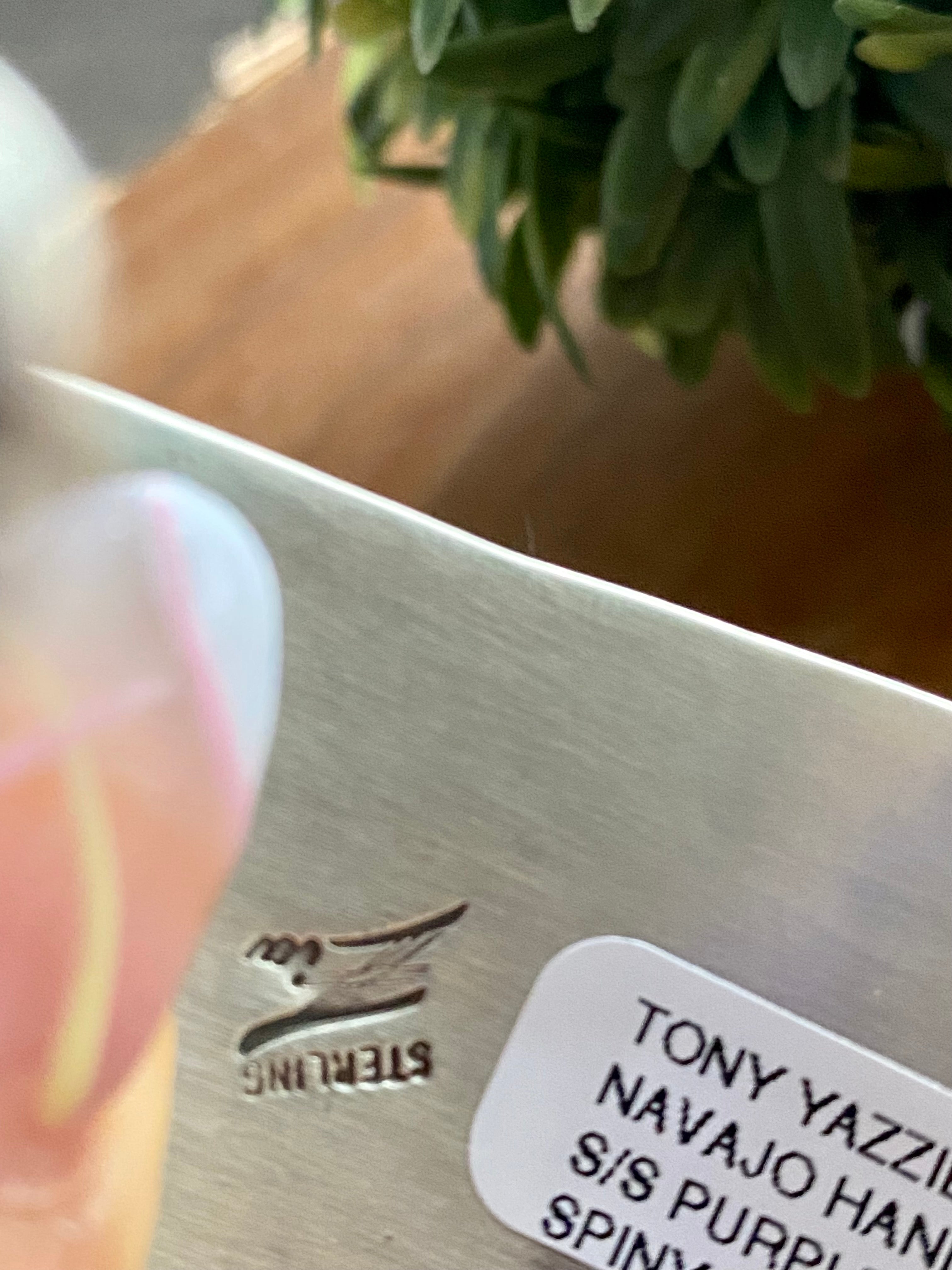 Tony Yazzie Purple Spiny & Sterling Silver Cuff Bracelet. It measures 1 3/8 inches wide with an inside circumference of 5 7/8 inches and a gap of just over 1 3/8 inches. Signed by the artist and stamped sterling silver.