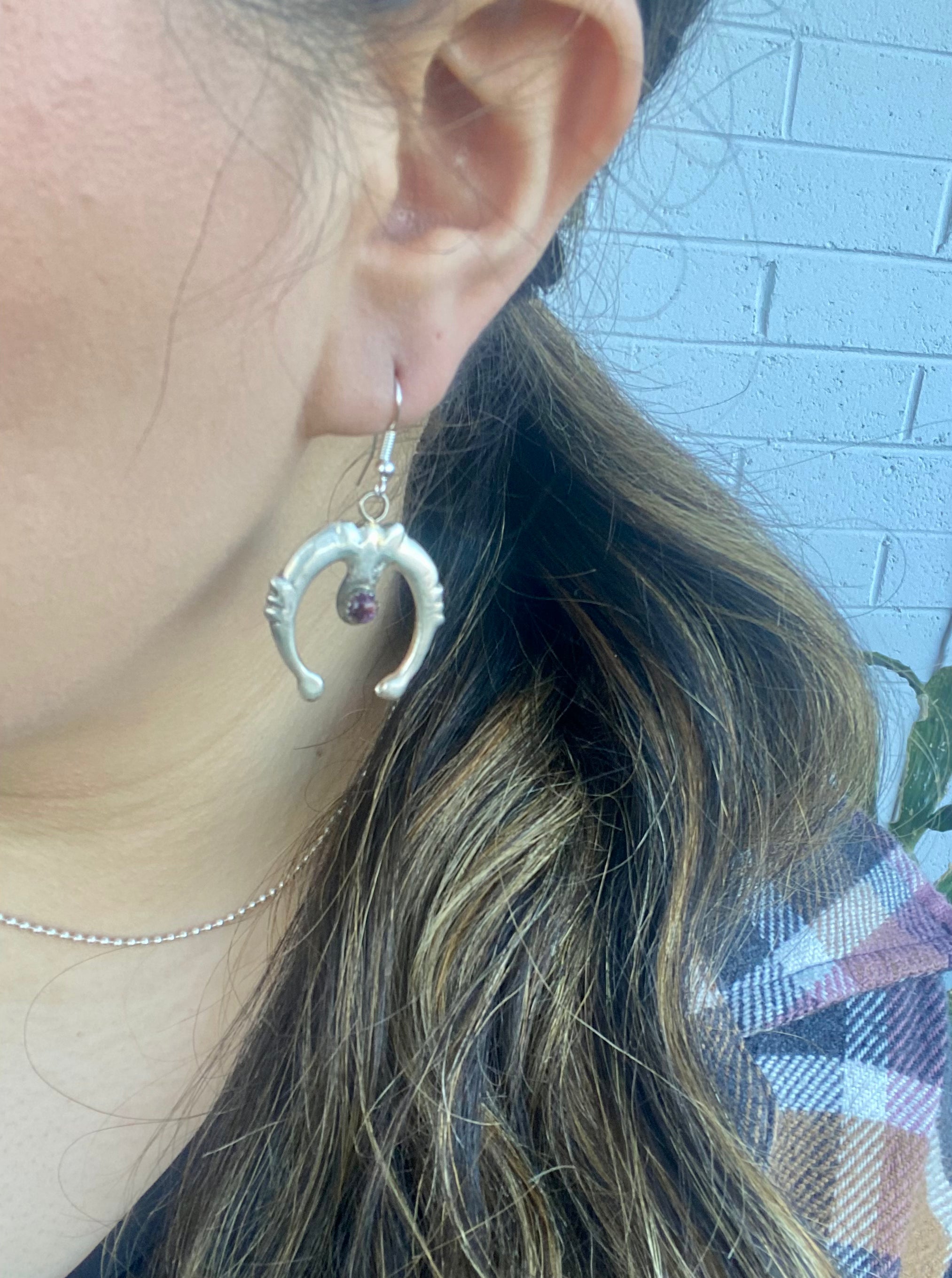 Tonya Yazzie Purple Spiny Oys & Sterling Silver Naja Dangle Earrings. They measure just under 2 inches long and 1 1/8 inches wide. Stones will differ due to natural stones. Signed by the artist and stamped sterling silver.