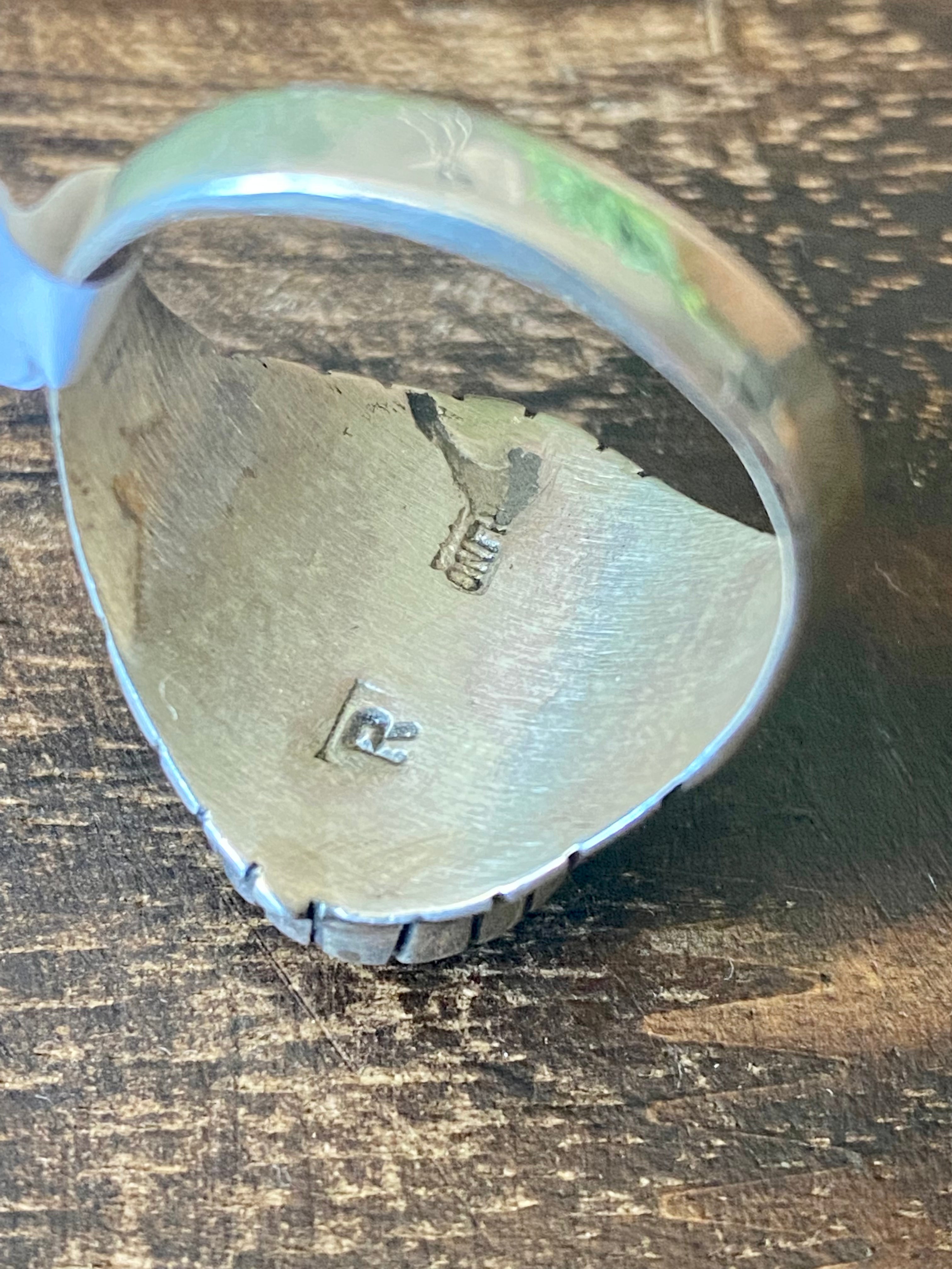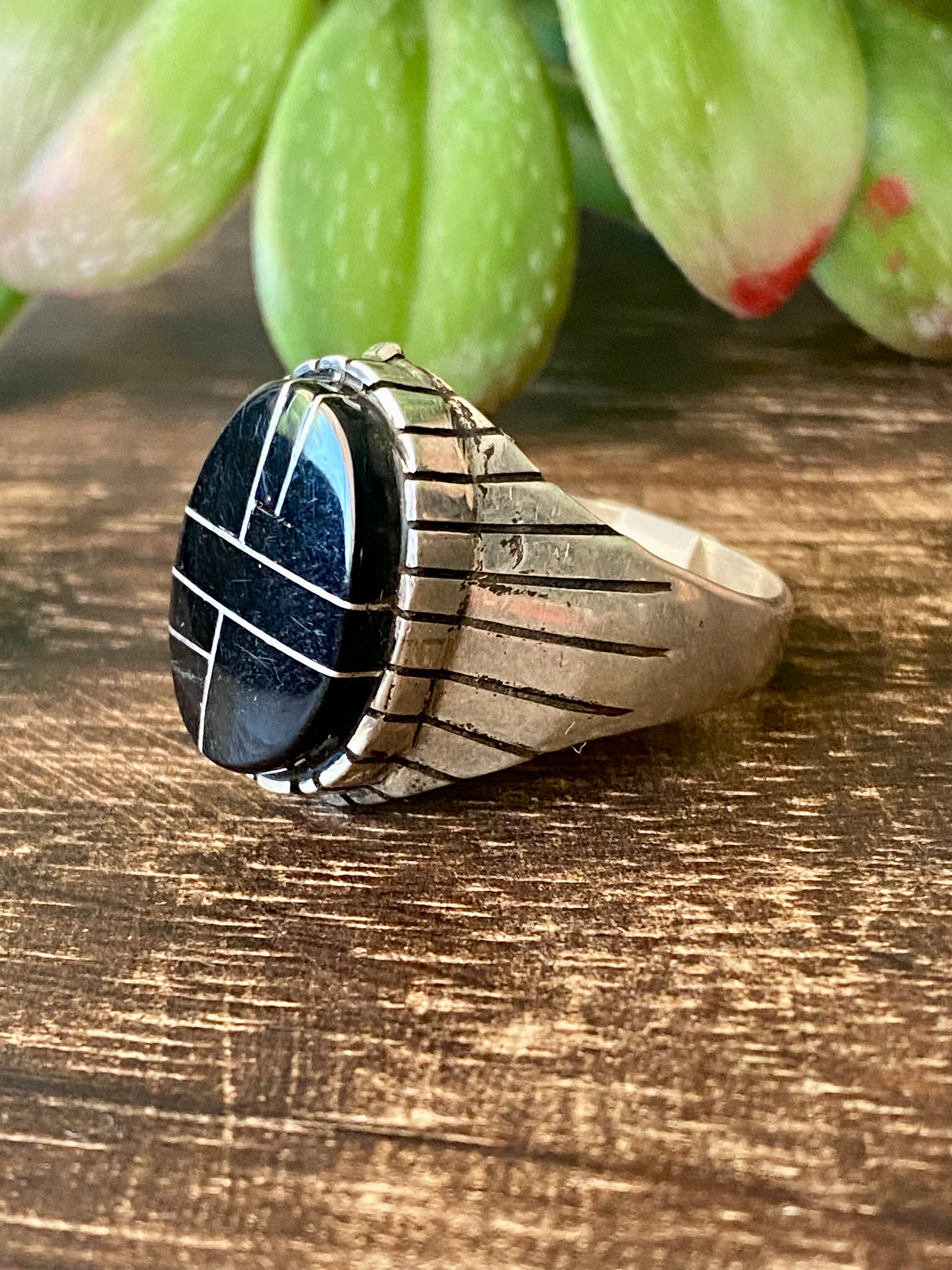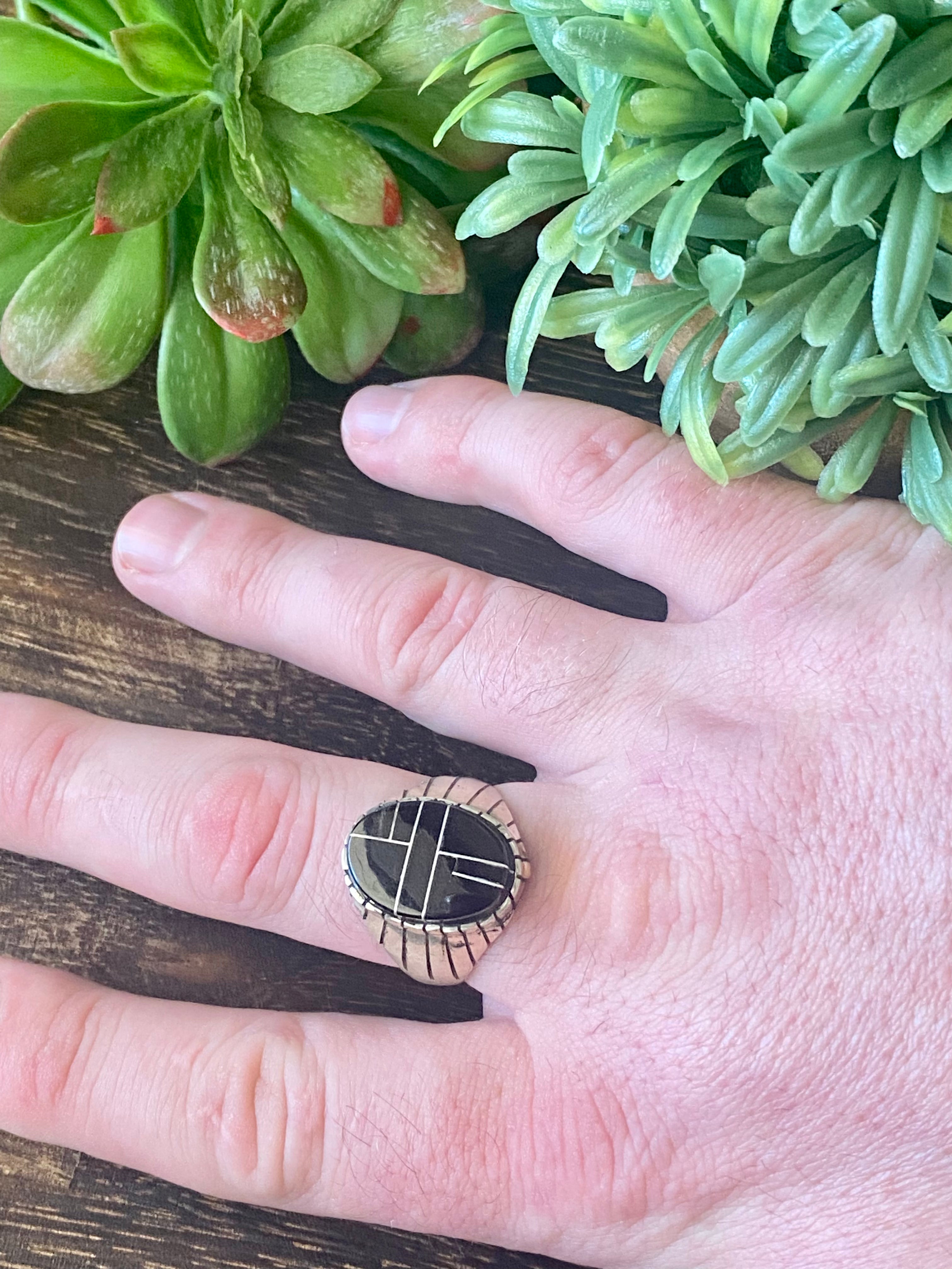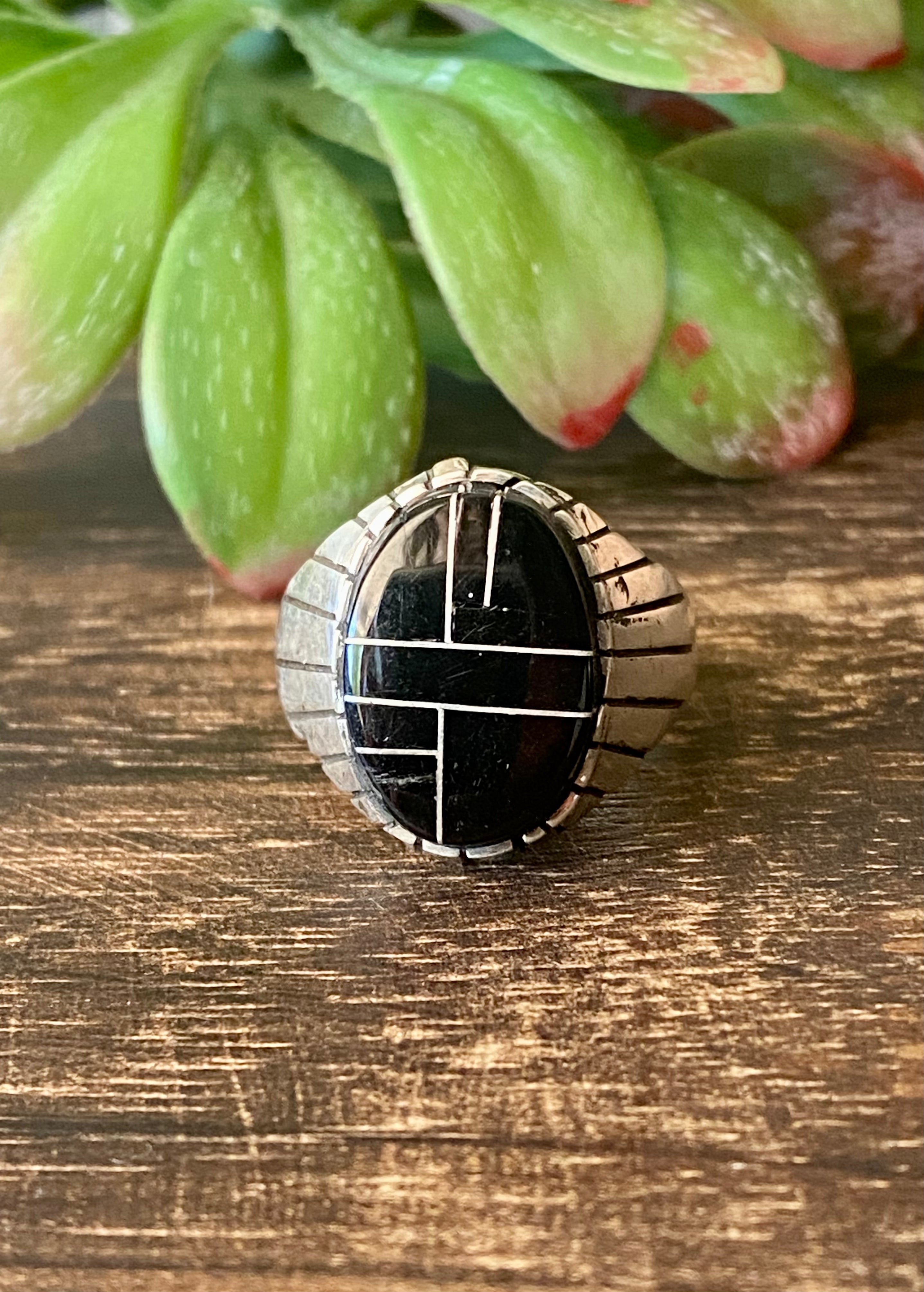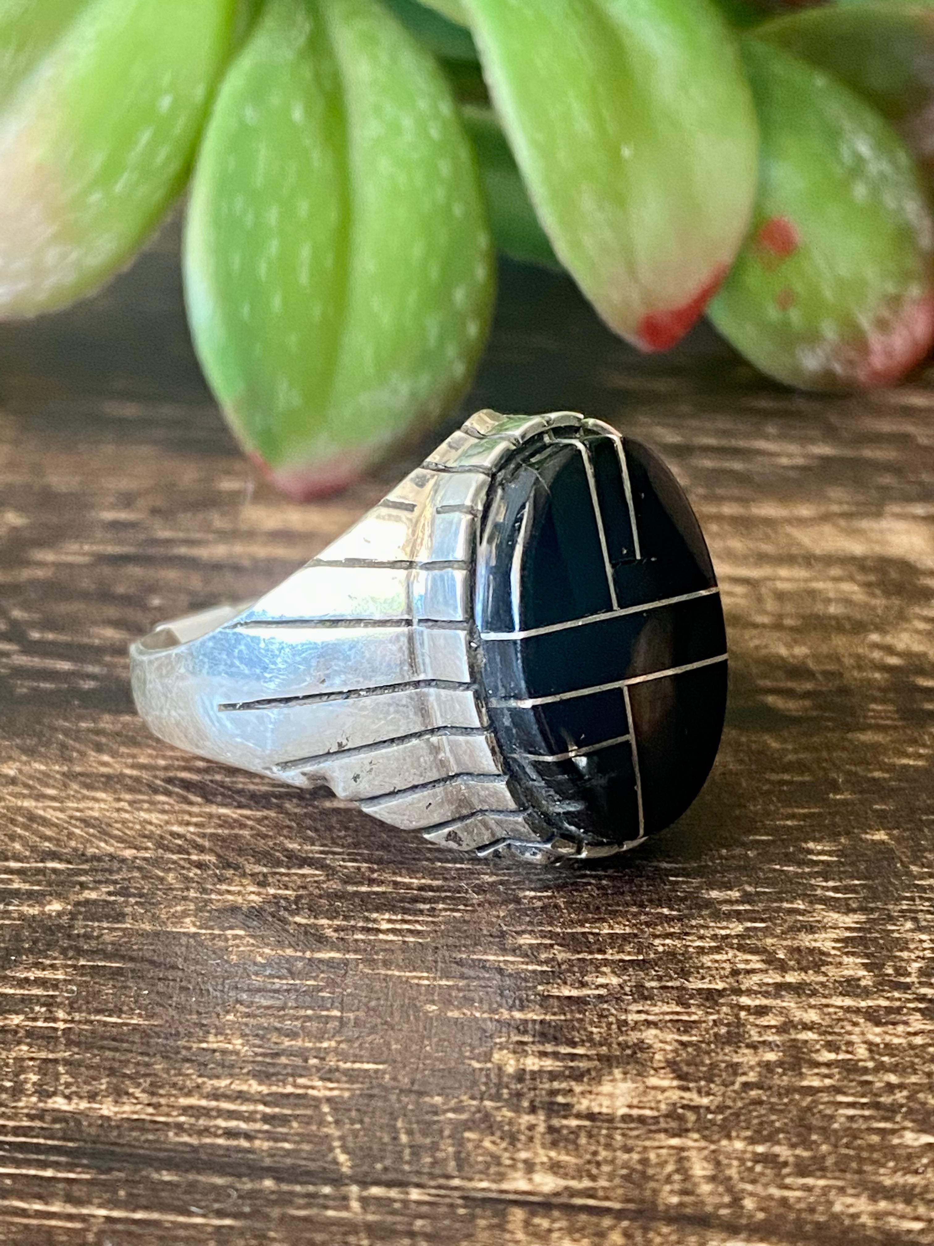 Trevor Jack Onyx & Sterling Silver Inlay Ring Size 12.75. It measures 7/8 of an inch long and just under 7/8 of an inch wide. Signed by the artist and stamped sterling silver.