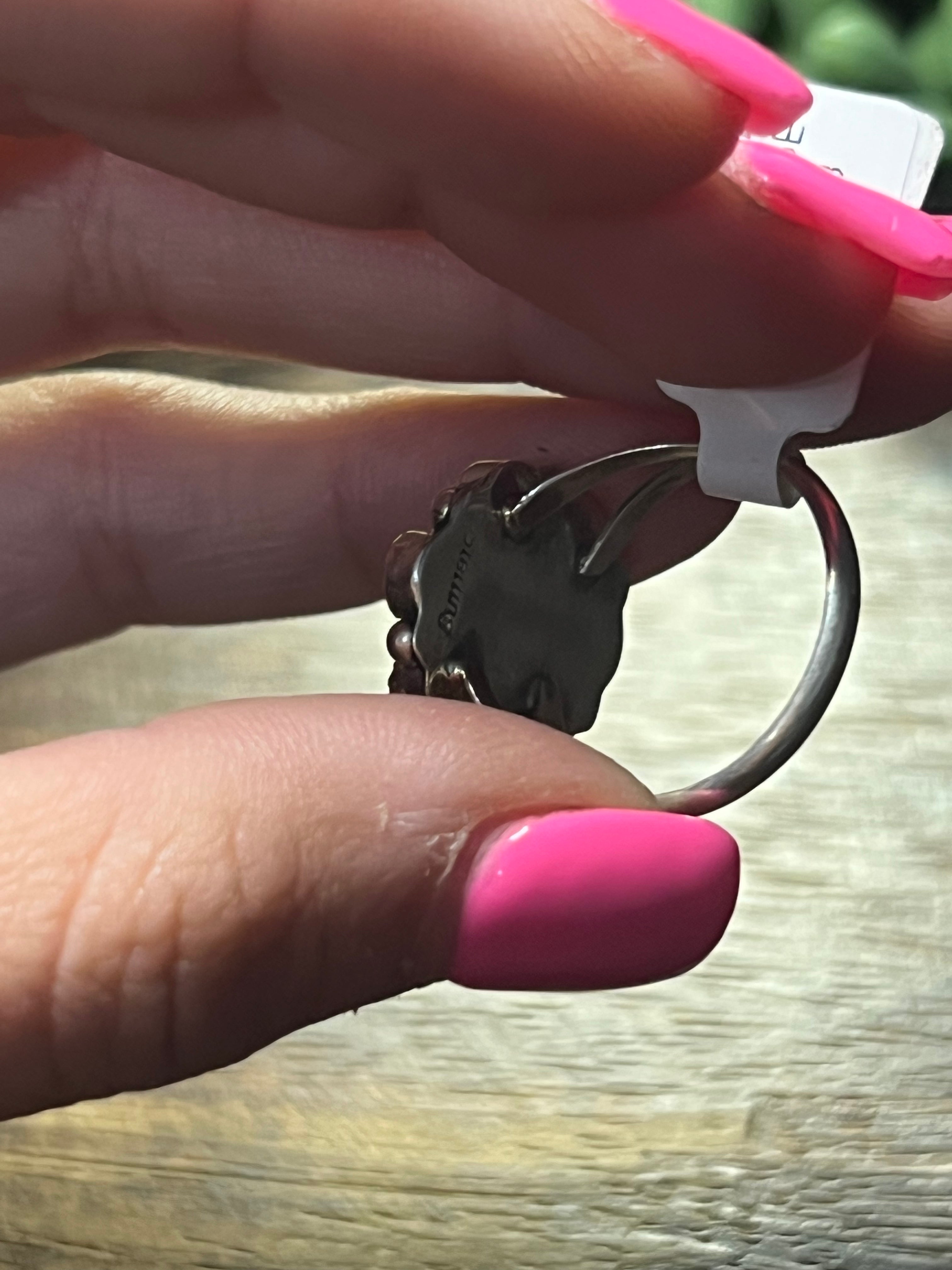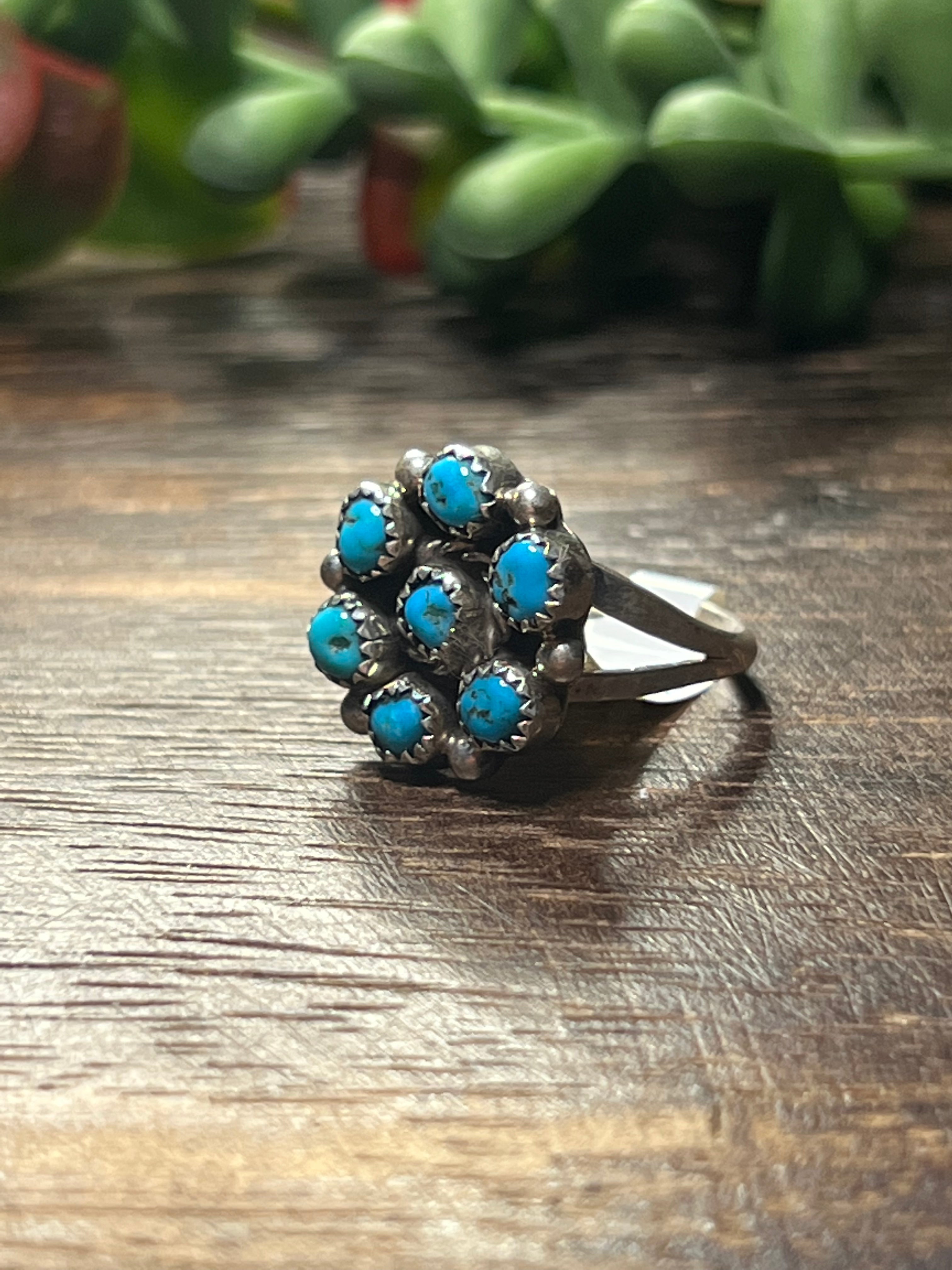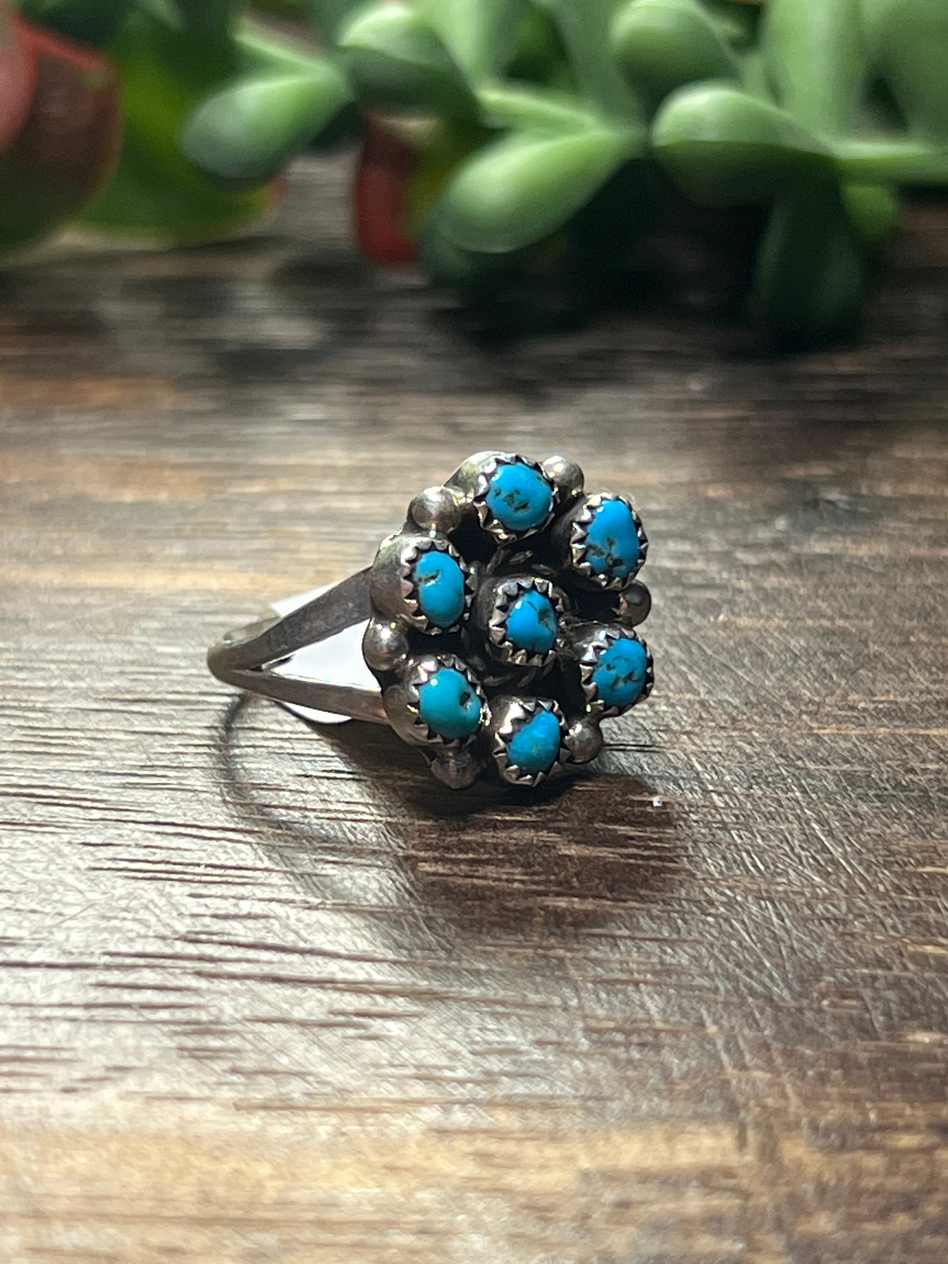 Tricia Leekety Kingman Turquoise & Sterling Silver Ring. It measures just over 5/8 of an inch long and just over 5/8 of an inch wide. Signed by artist and stamped sterling silver. Stones will differ due to natural stone.