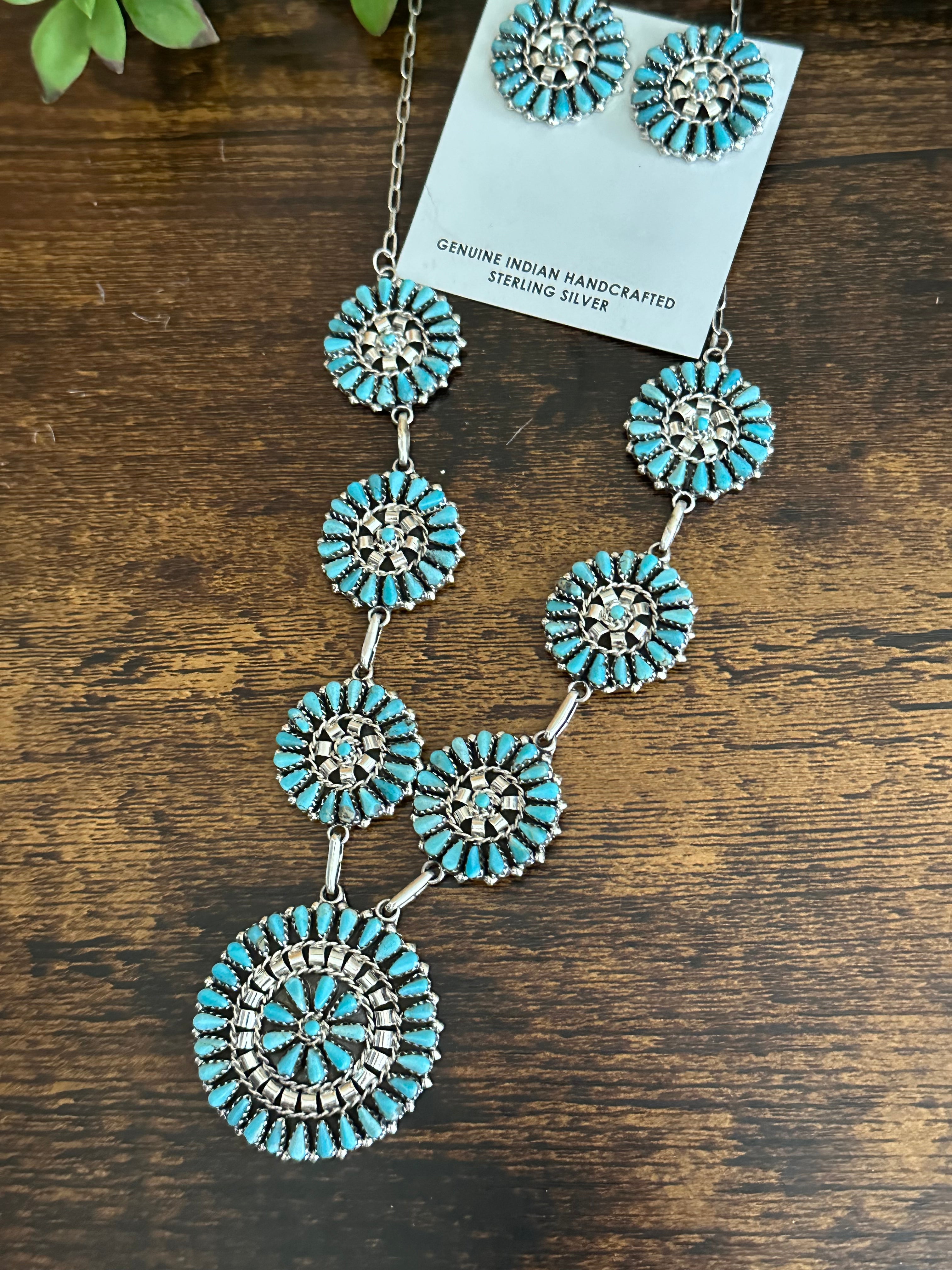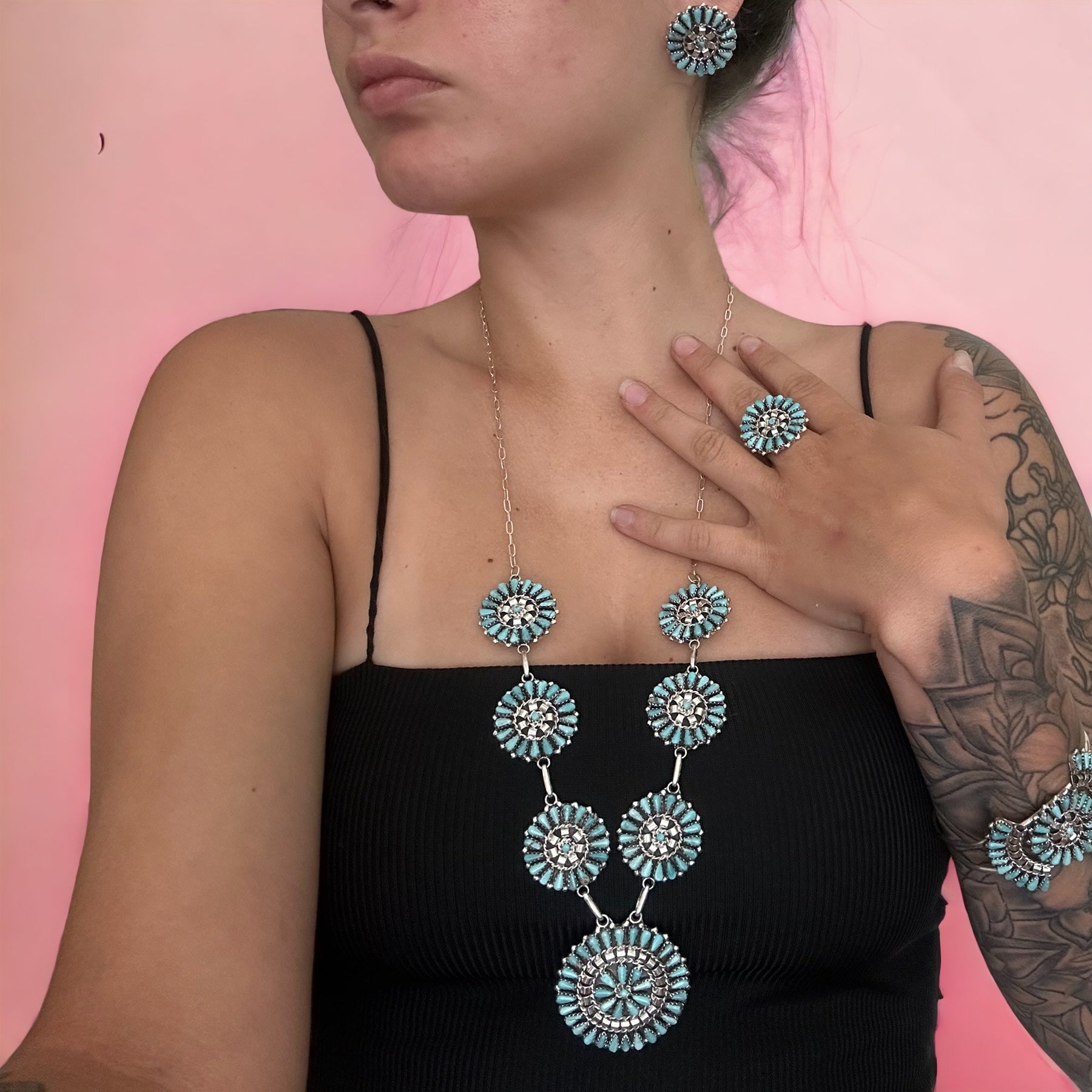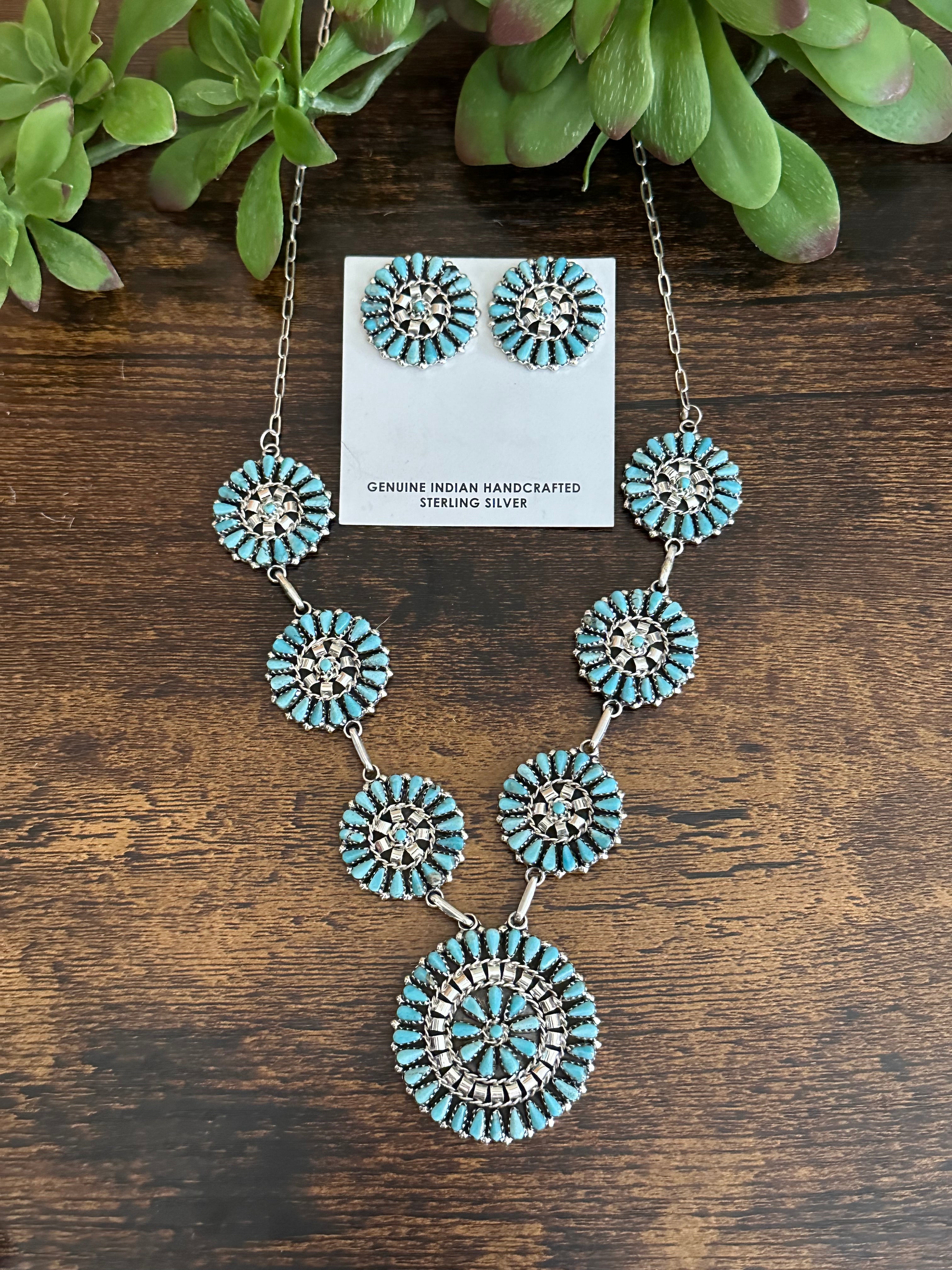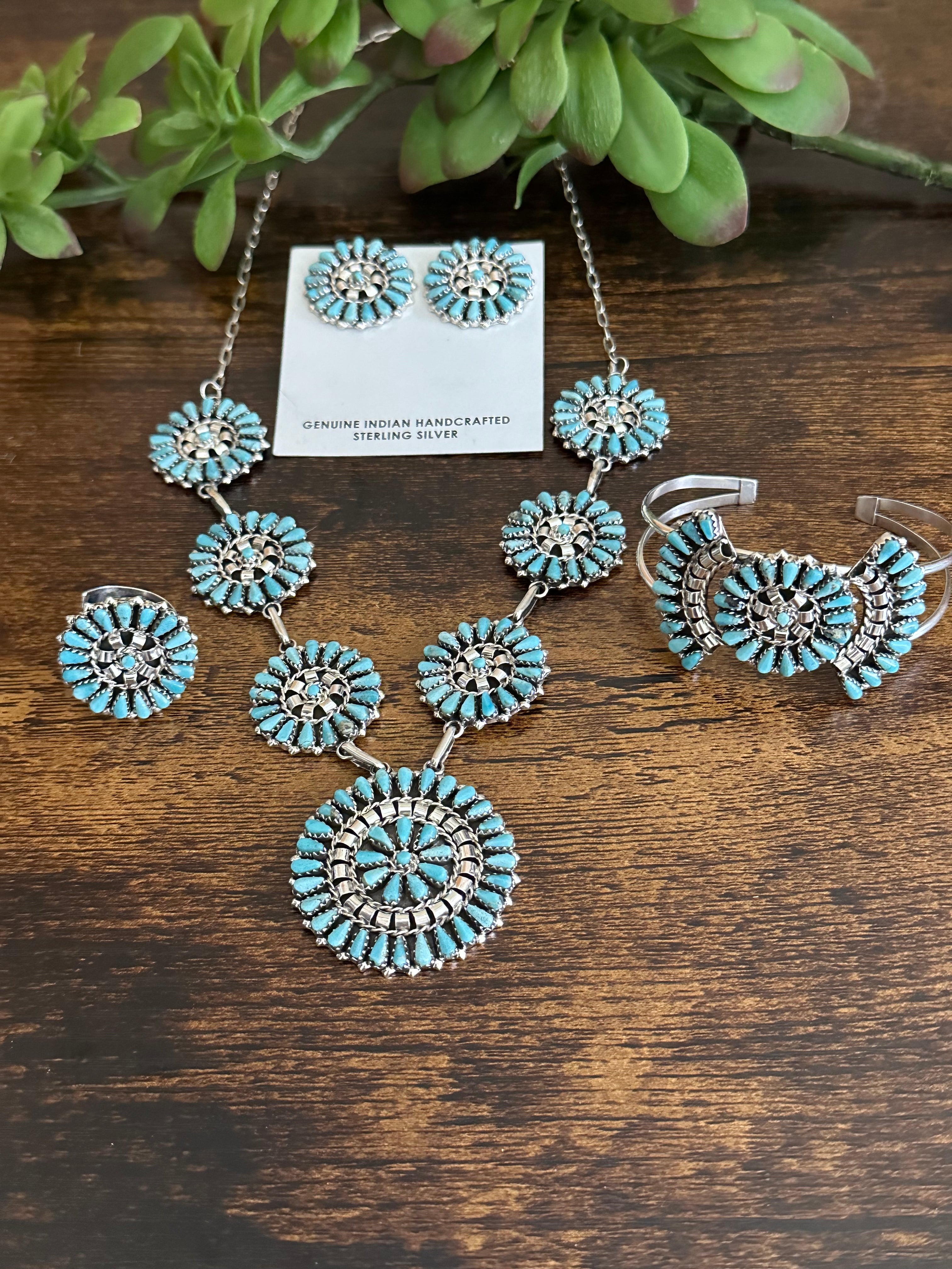 Lander Nez Kingman Turquoise & Sterling Silver Needle Point Necklace, Earrings, Cuff Bracelet & Ring Set. The necklace measures 31 inches long with hang while the chain by itself measures 28 inches long. The ring is an adjustable and measures 1 inch round. The cuff measures 1 3/8 inches wide with an inside circumference of 5 7/8 inches and a gap of 3/4 of an inch. Signed by the artist and stamped sterling silver.
