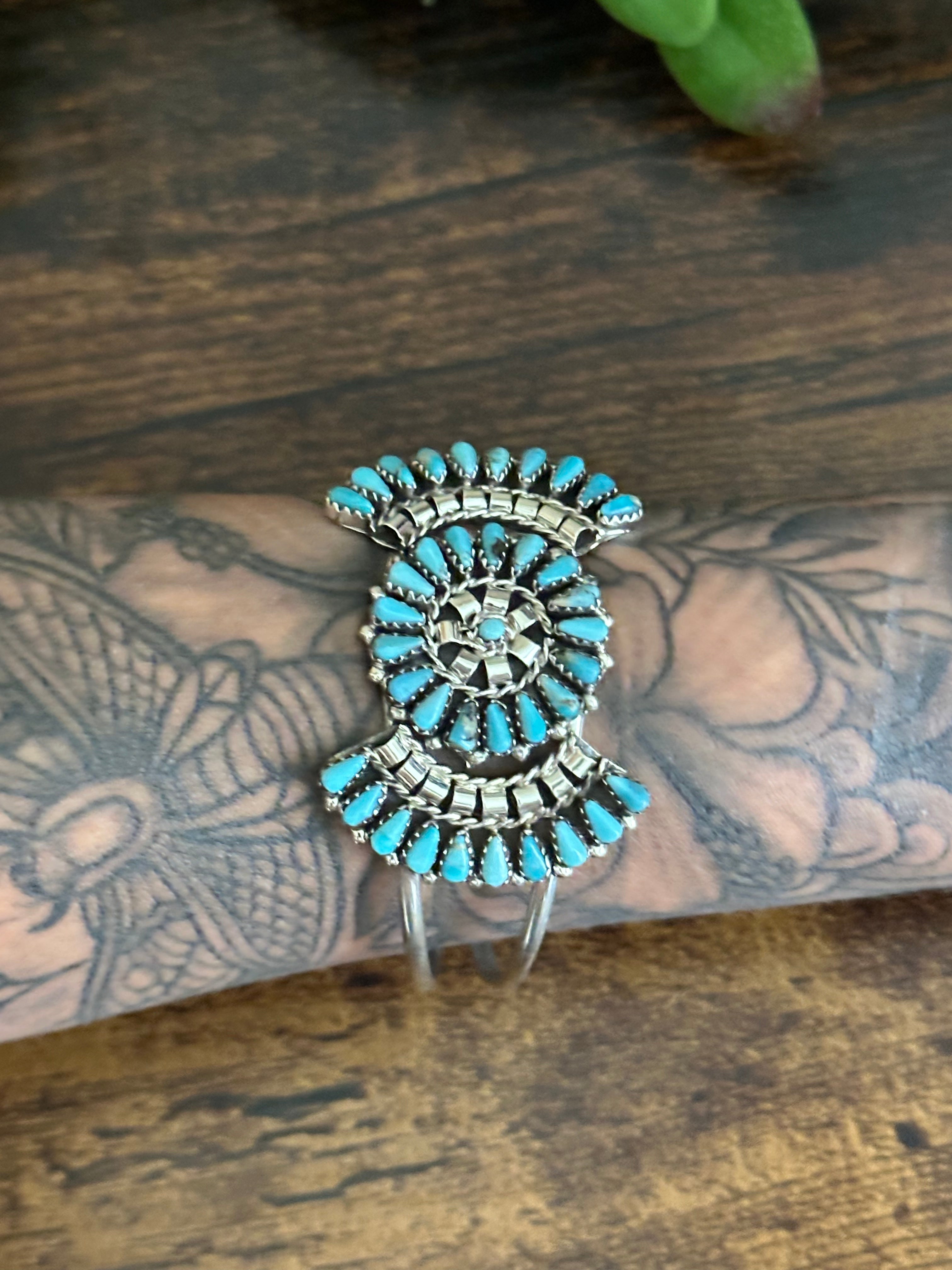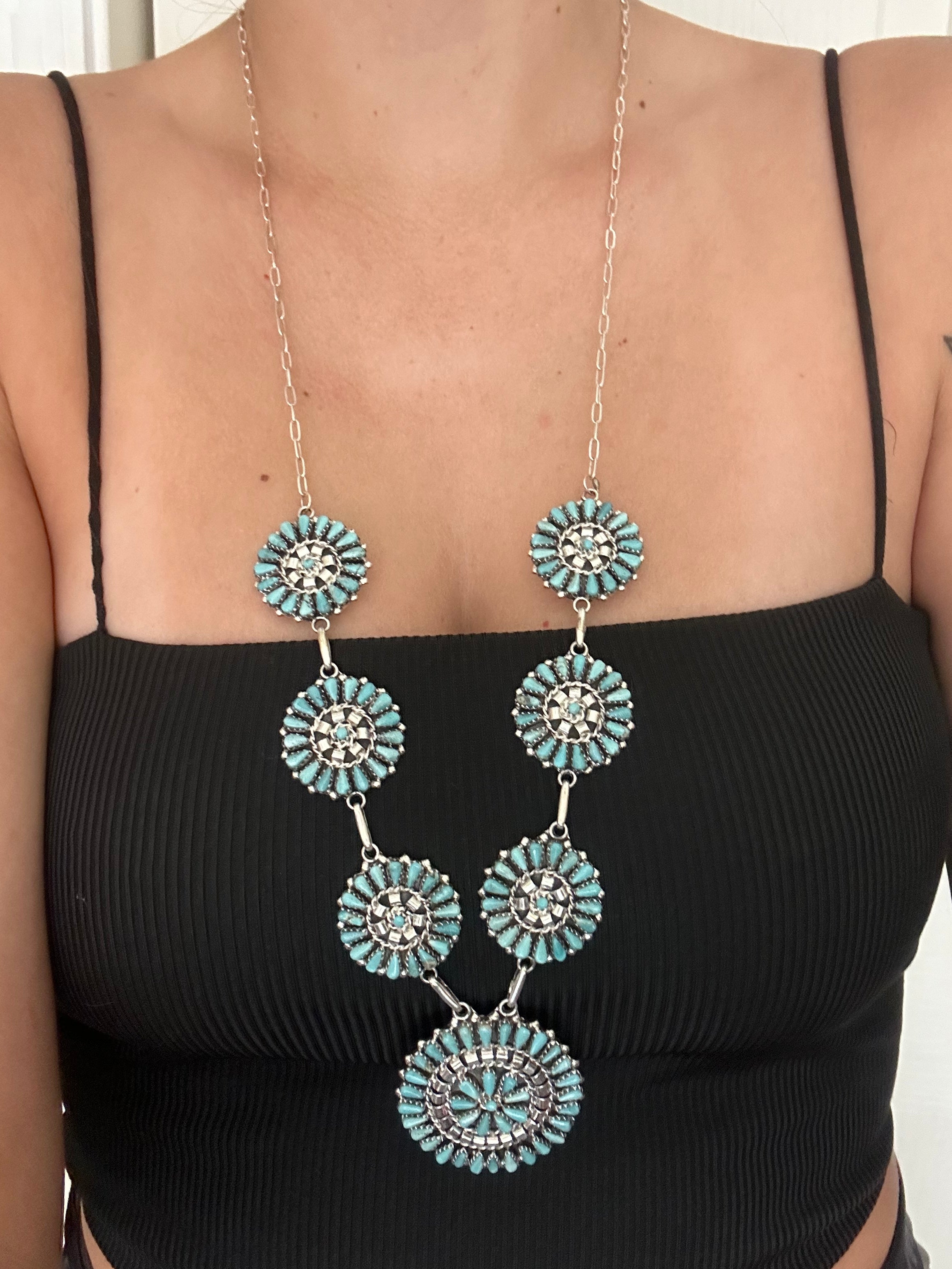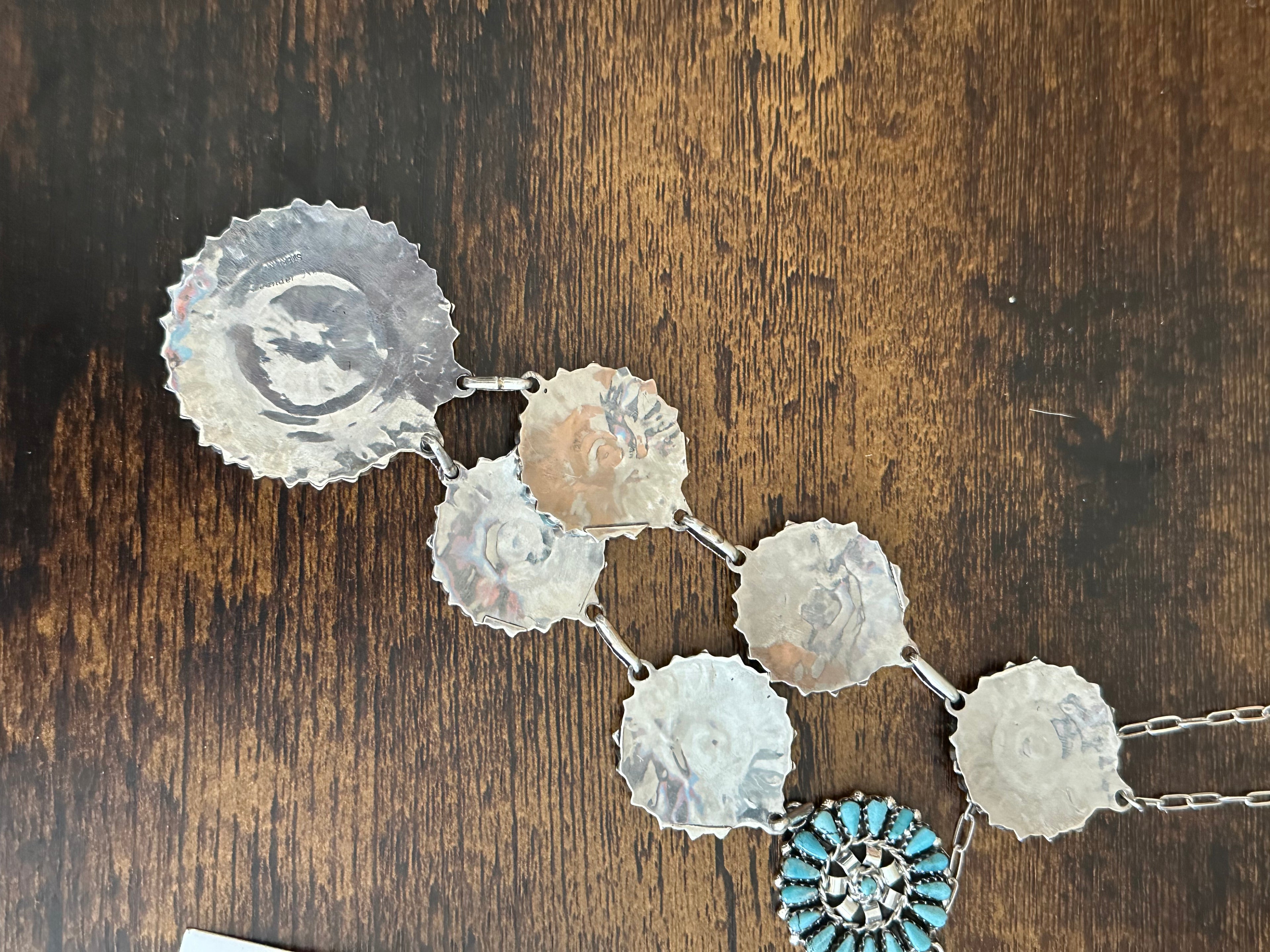 Lander Nez Kingman Turquoise & Sterling Silver Needle Point Necklace, Earrings, Cuff Bracelet & Ring Set. The necklace measures 31 inches long with hang while the chain by itself measures 28 inches long. The ring is an adjustable and measures 1 inch round. The cuff measures 1 3/8 inches wide with an inside circumference of 5 7/8 inches and a gap of 3/4 of an inch. Signed by the artist and stamped sterling silver.