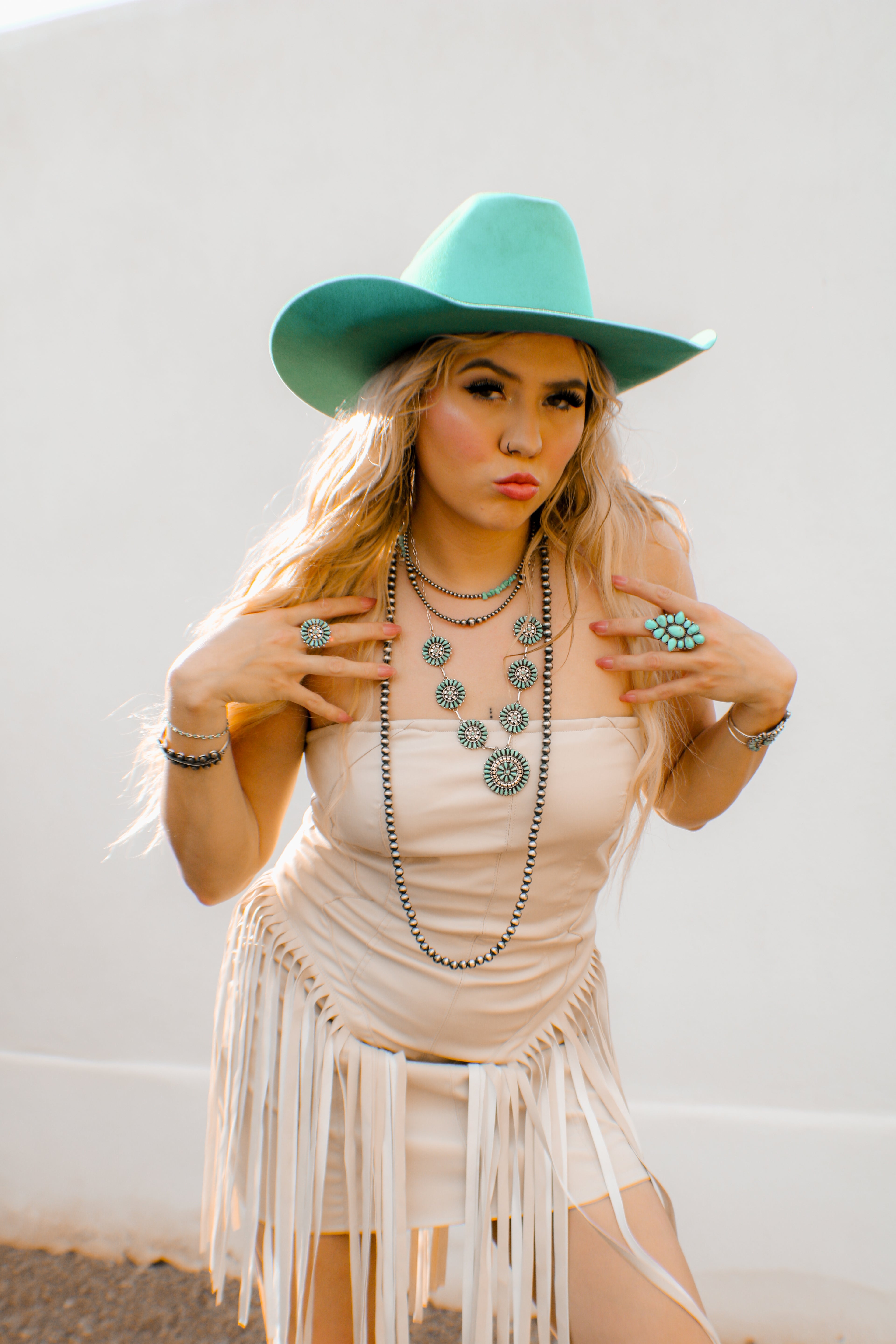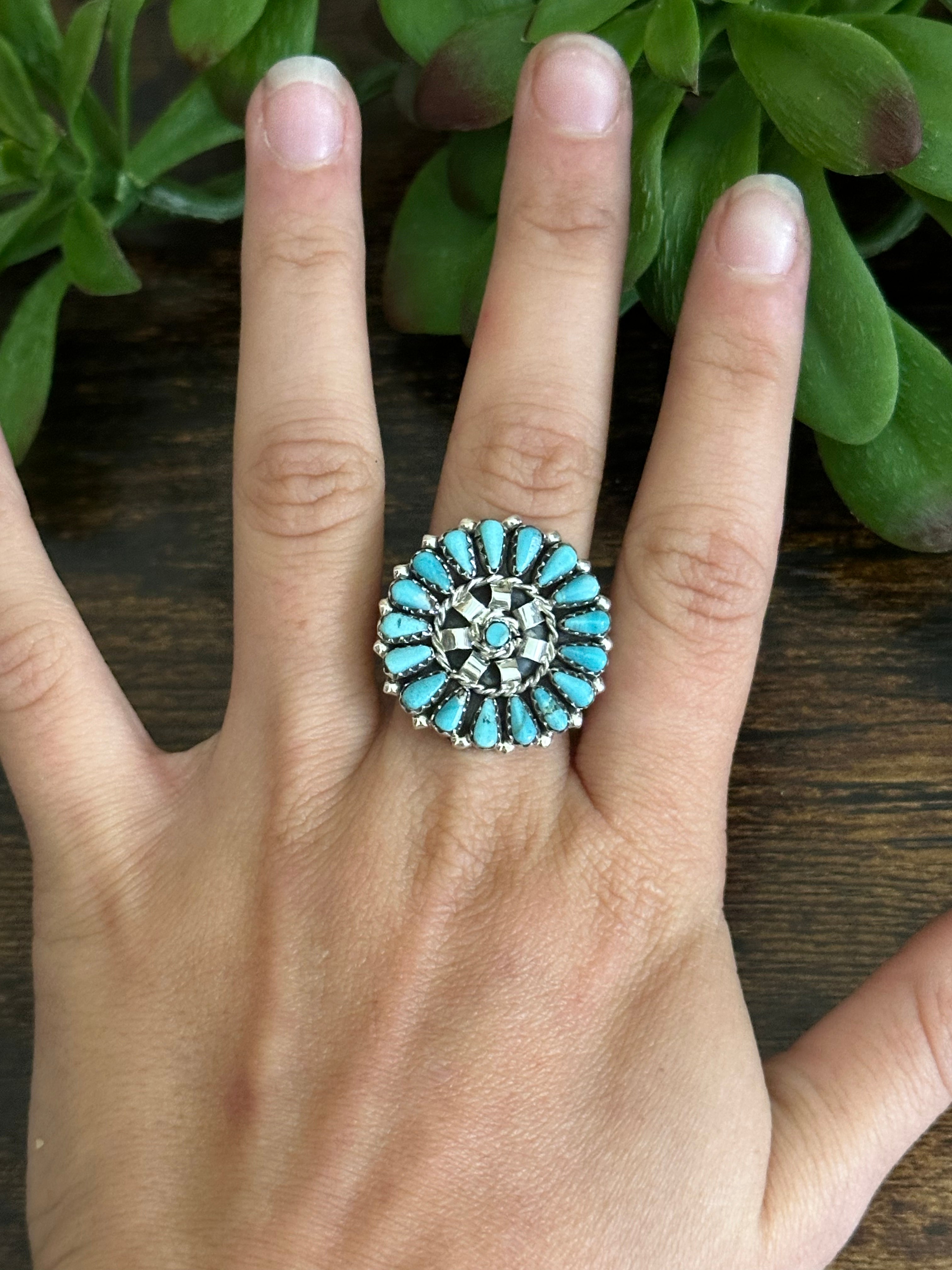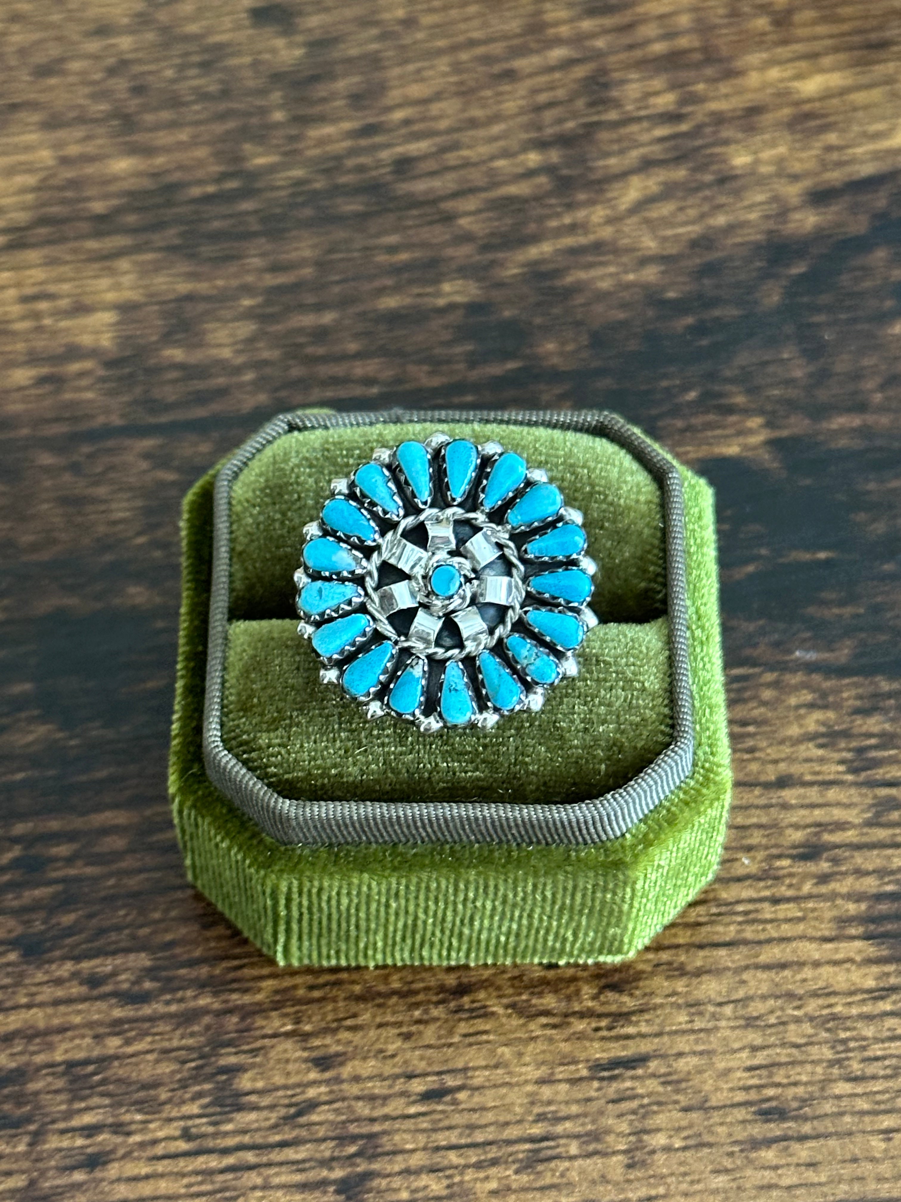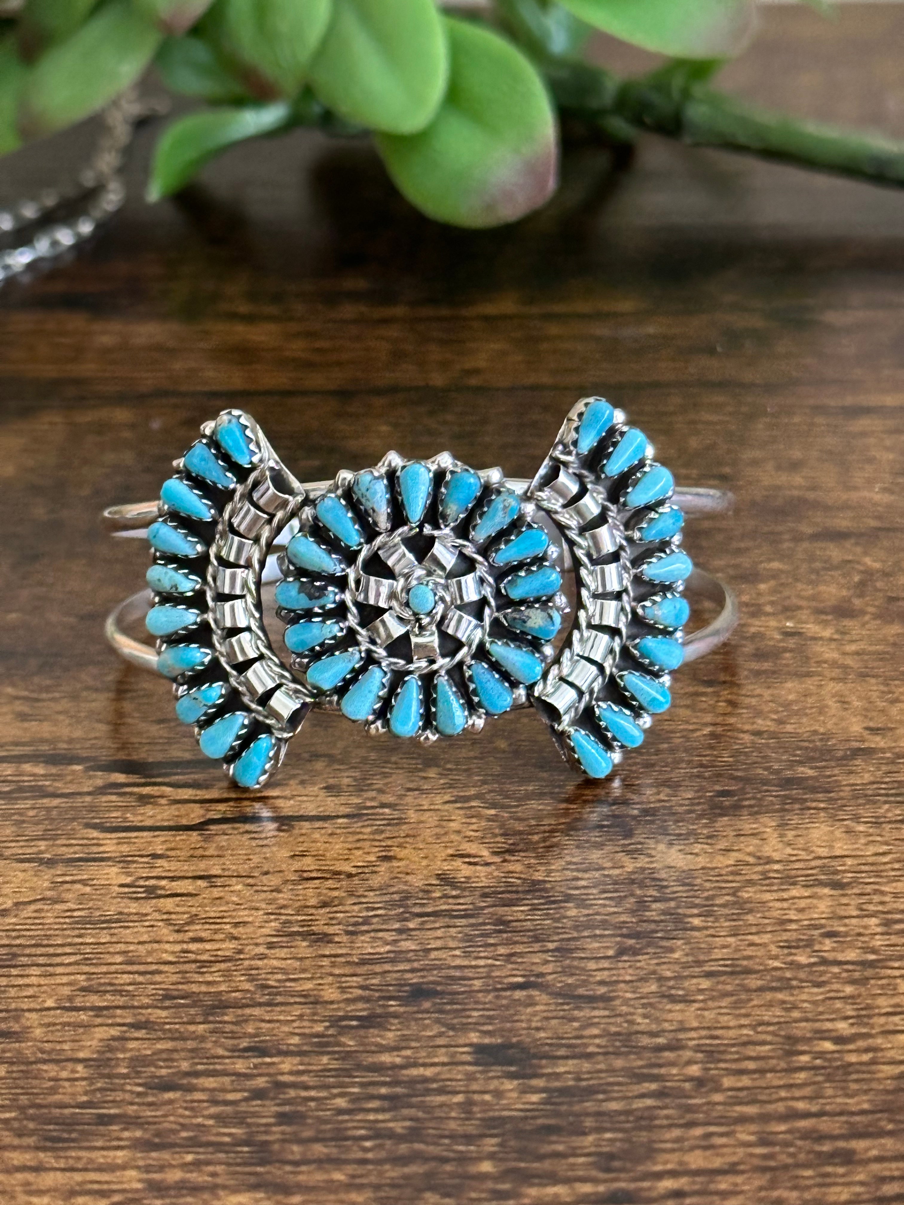 Lander Nez Kingman Turquoise & Sterling Silver Needle Point Necklace, Earrings, Cuff Bracelet & Ring Set. The necklace measures 31 inches long with hang while the chain by itself measures 28 inches long. The ring is an adjustable and measures 1 inch round. The cuff measures 1 3/8 inches wide with an inside circumference of 5 7/8 inches and a gap of 3/4 of an inch. Signed by the artist and stamped sterling silver.