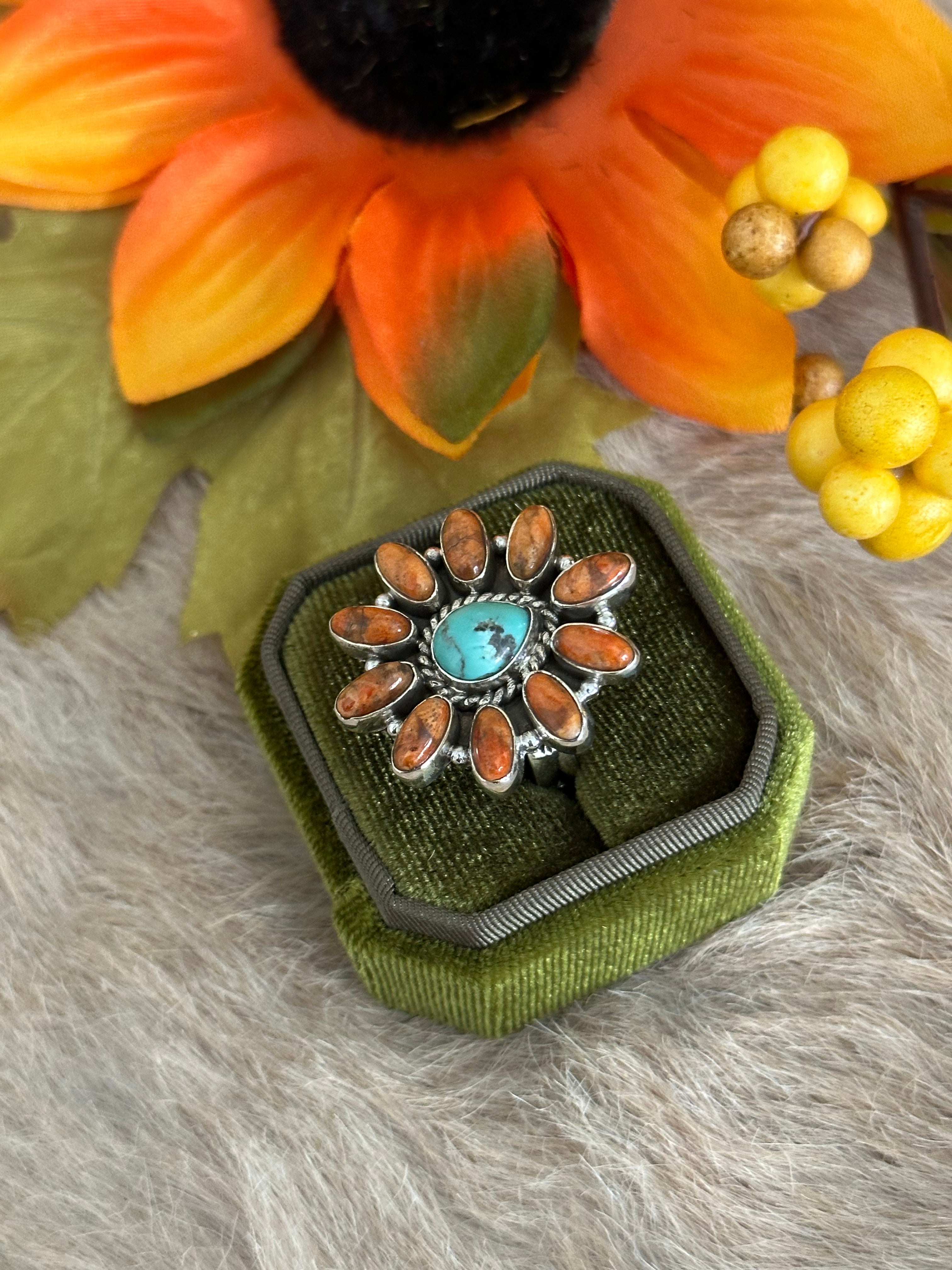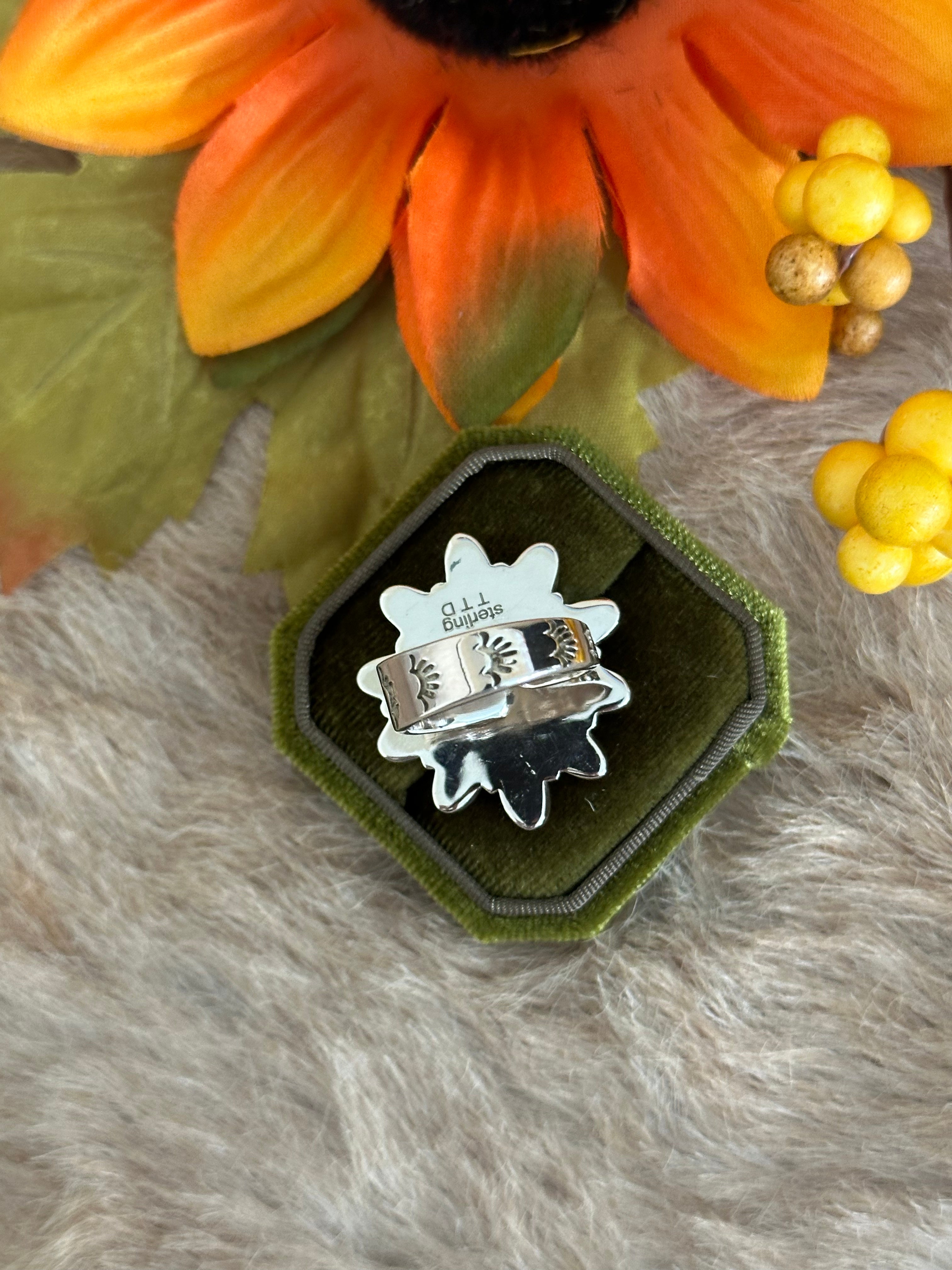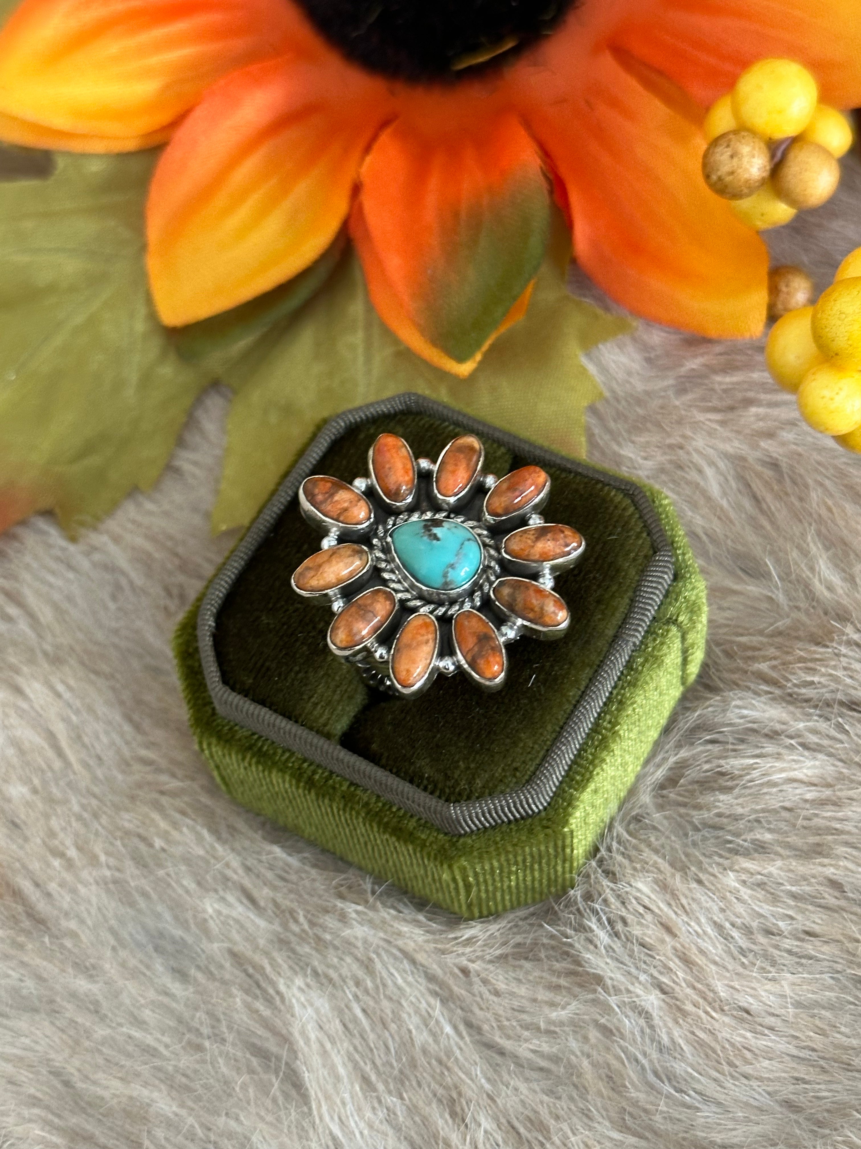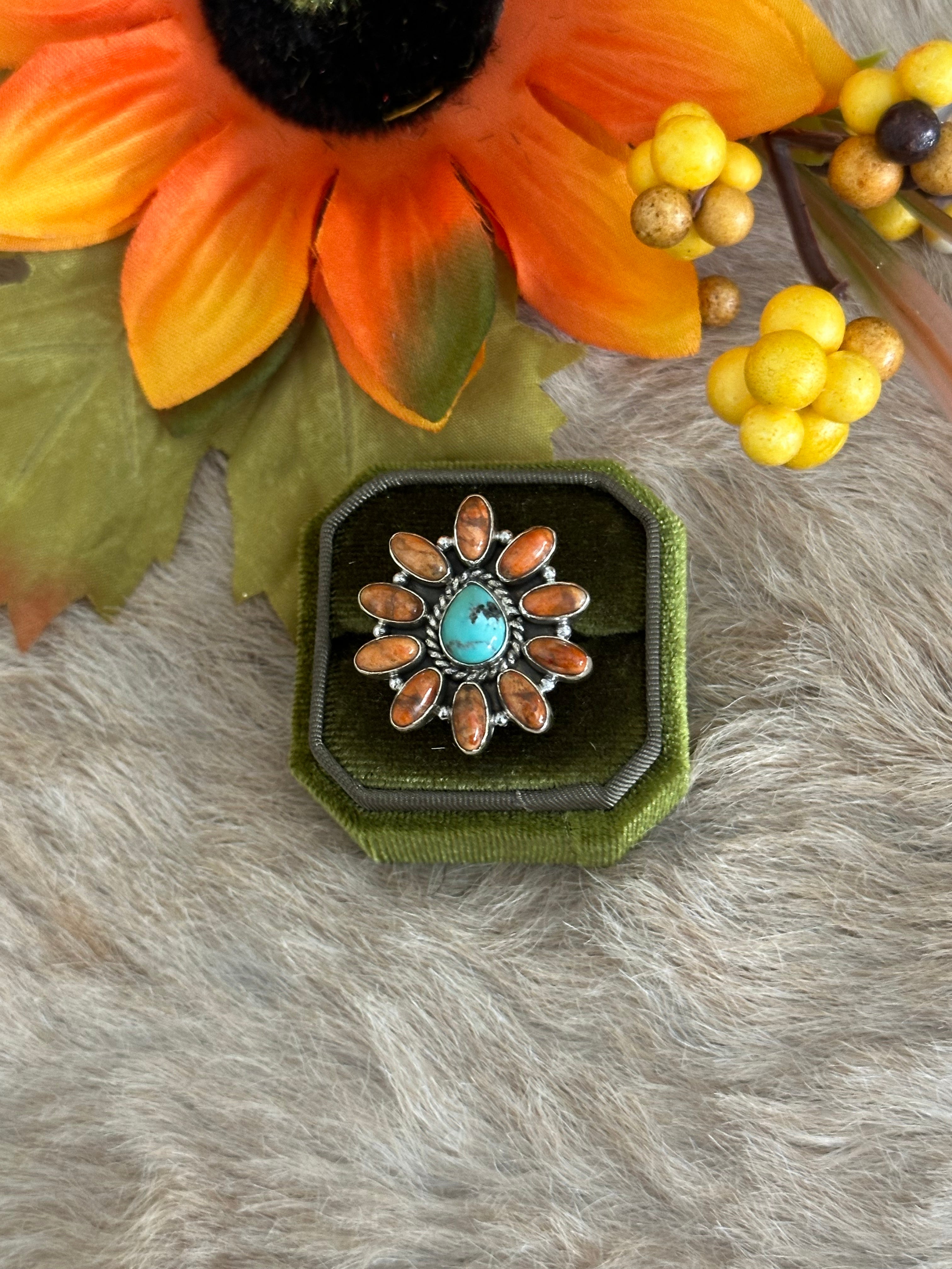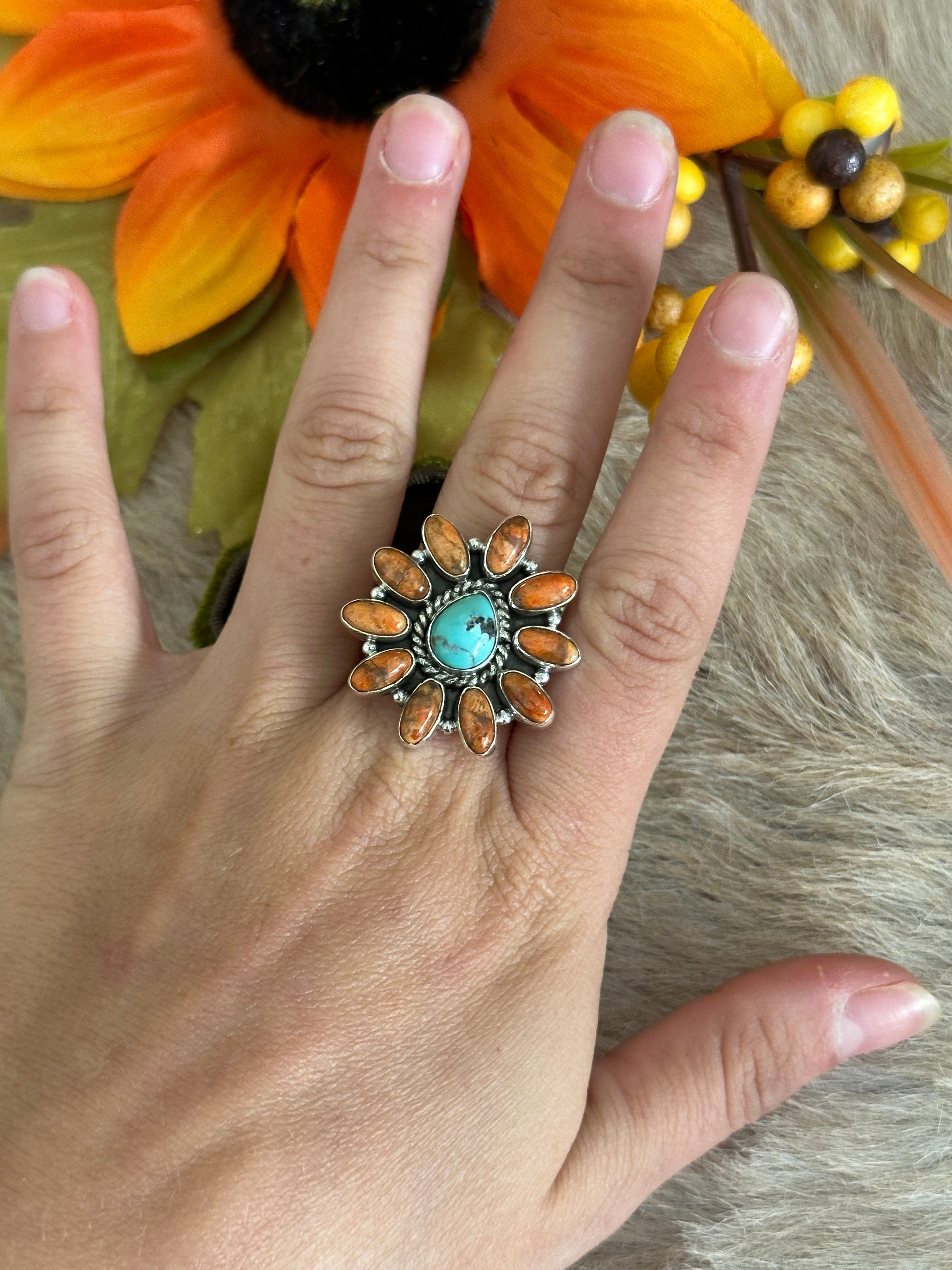 Beautiful cluster ring. Southwest Handmade Multi Stone & Sterling Silver Adjustable Ring. It measures 1 1/4 inches round. Signed by the artist and stamped sterling silver.
