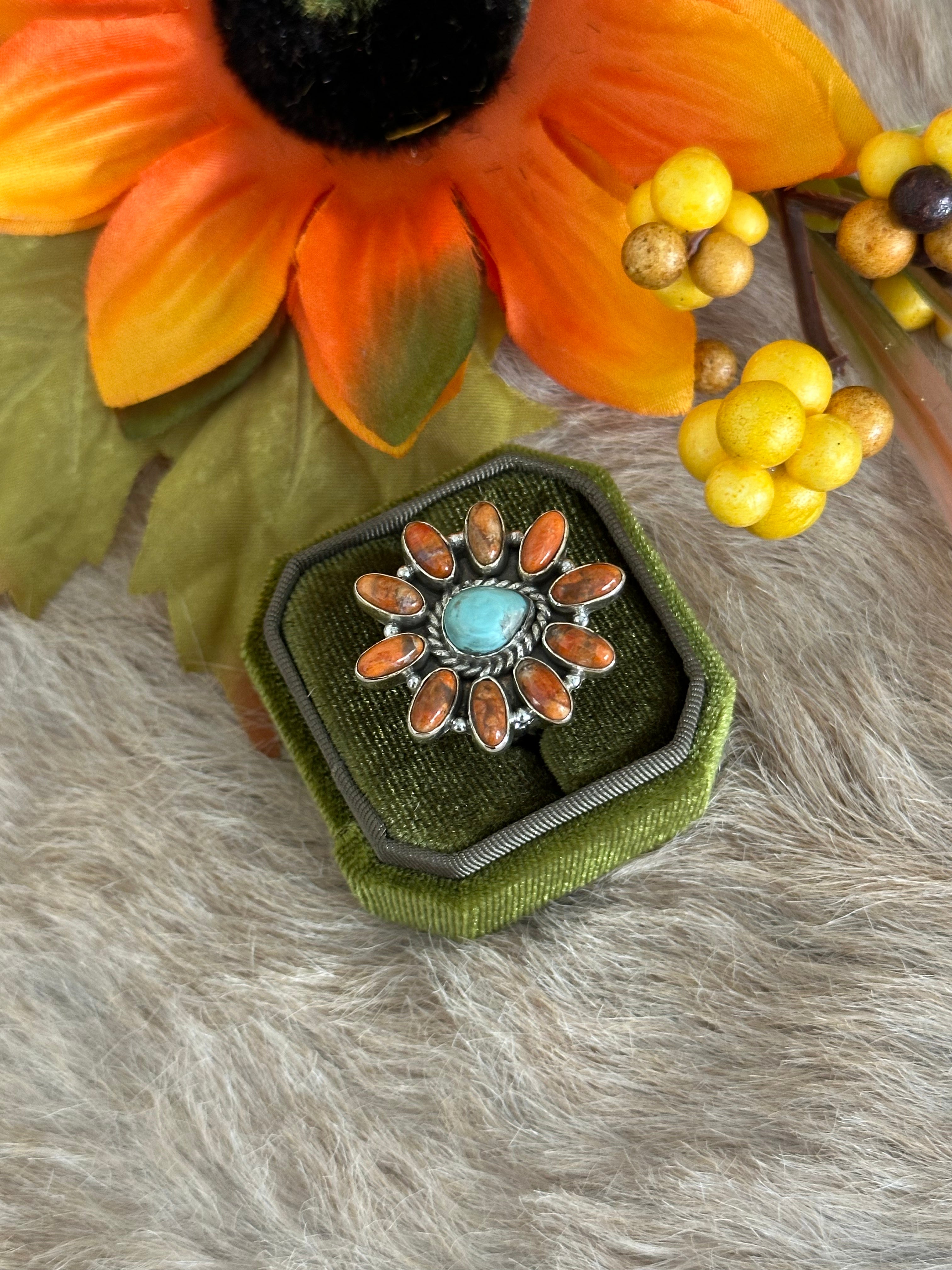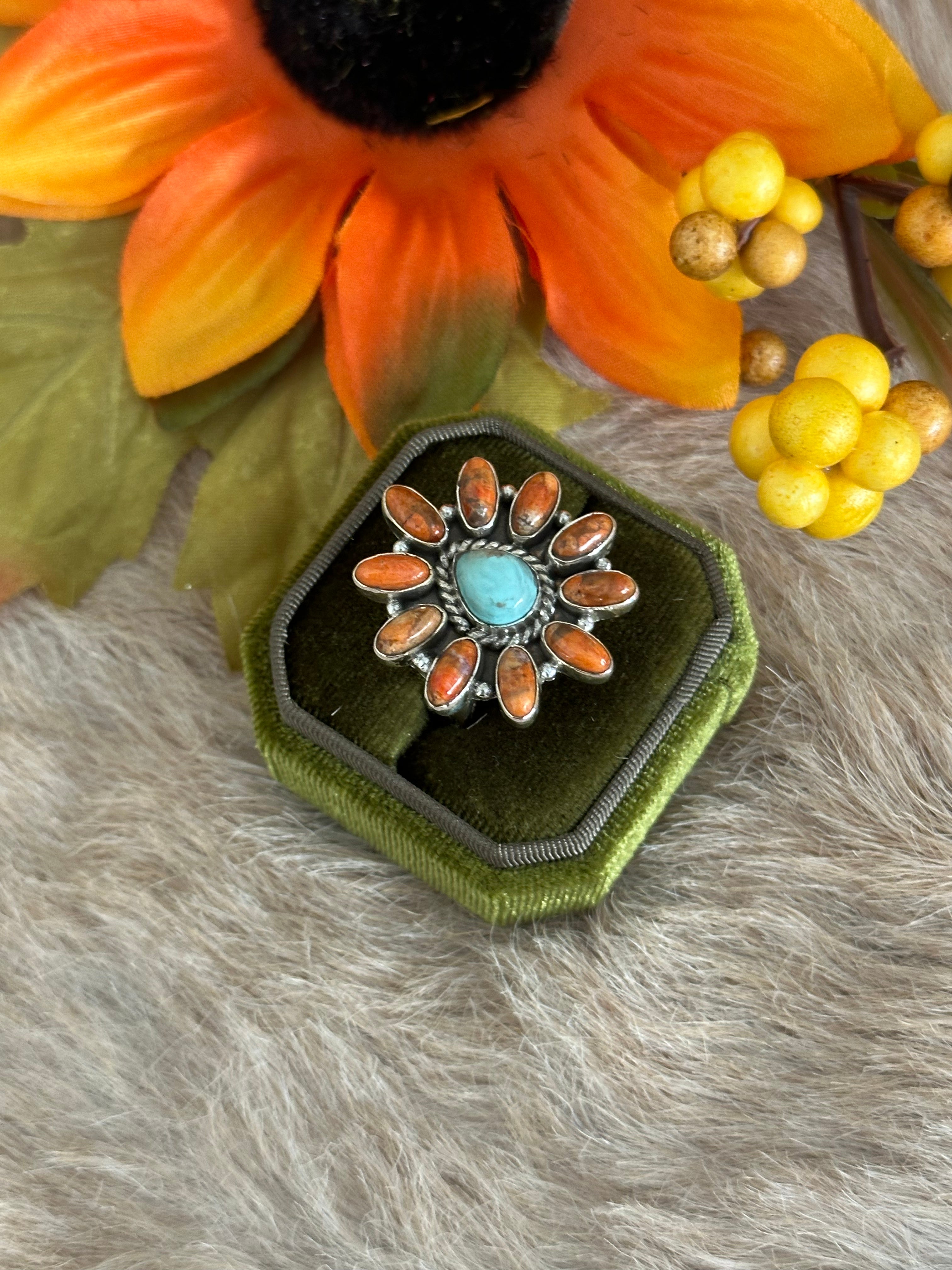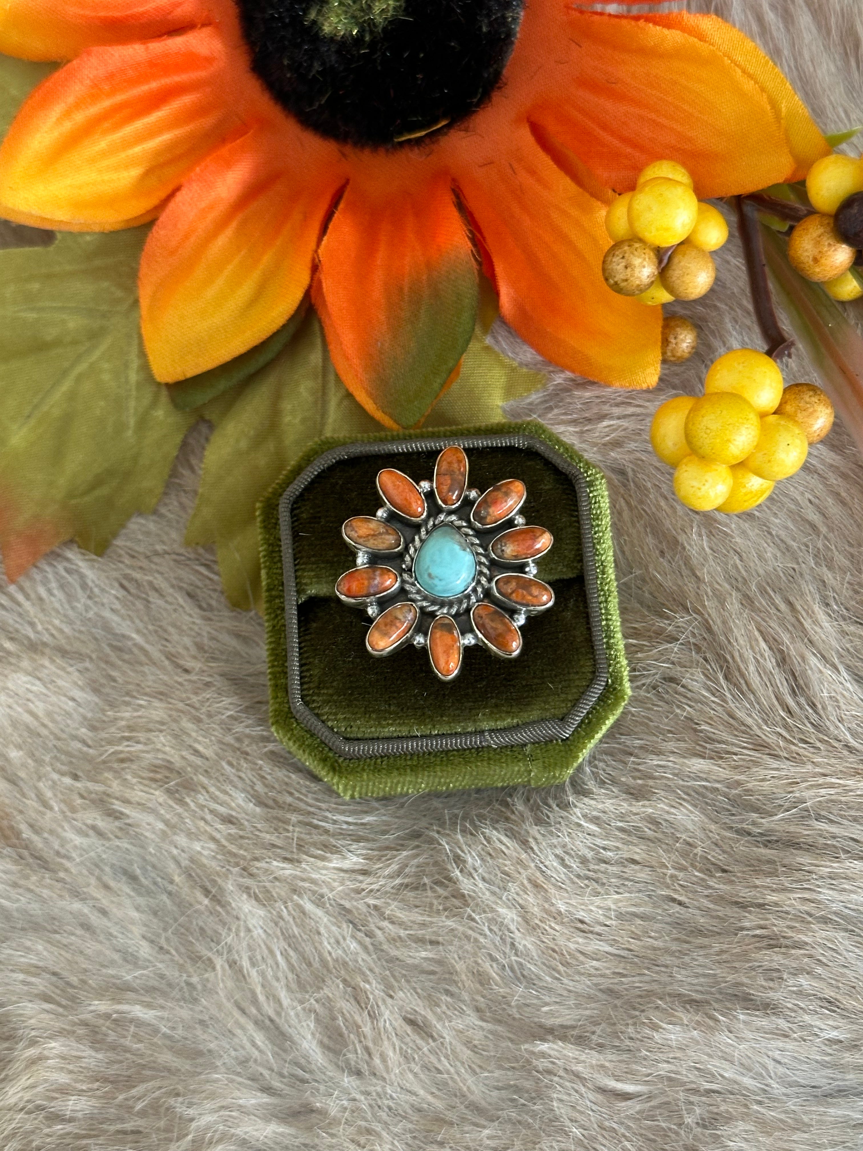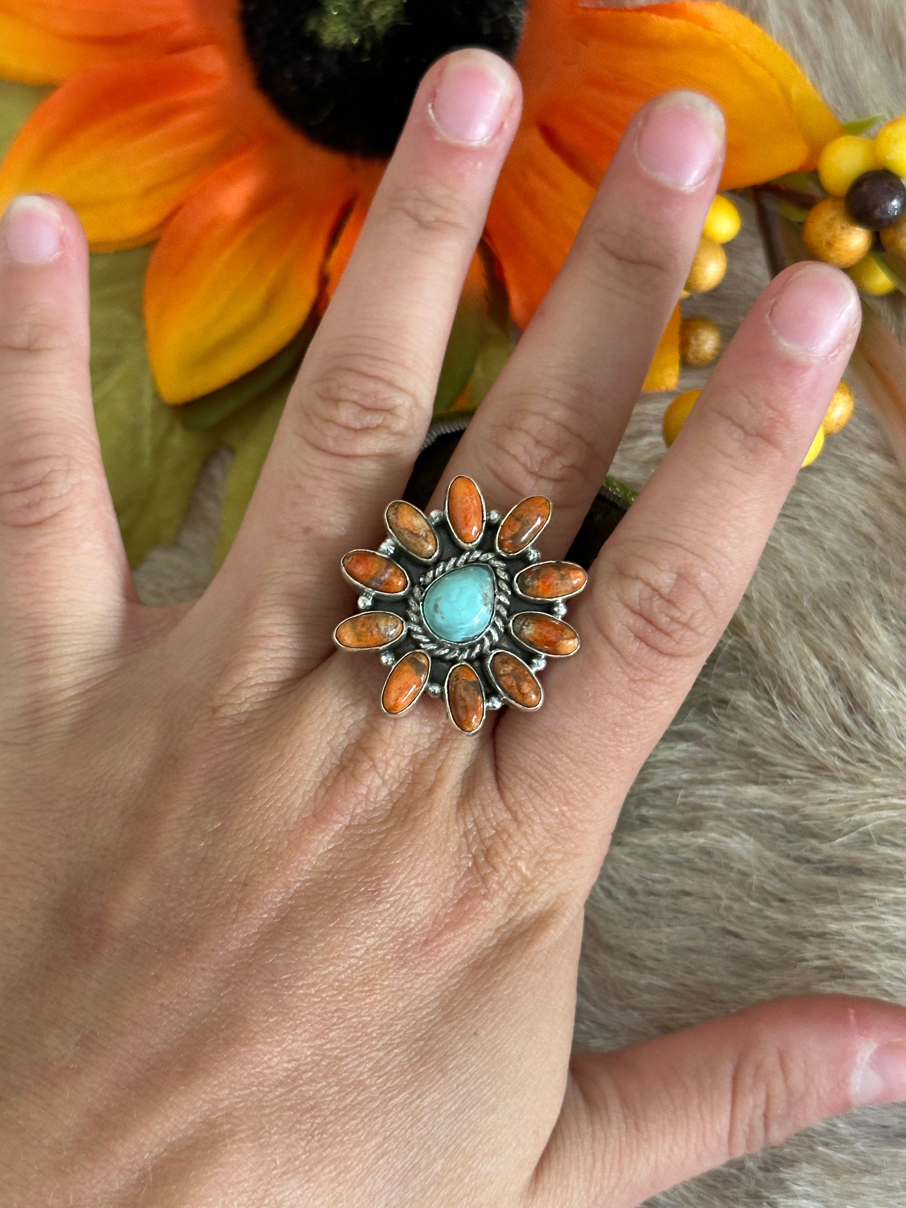 Beautiful cluster ring. Southwest Handmade Multi Stone & Sterling Silver Adjustable Ring. It measures 1 1/4 inches round. Signed by the artist and stamped sterling silver.