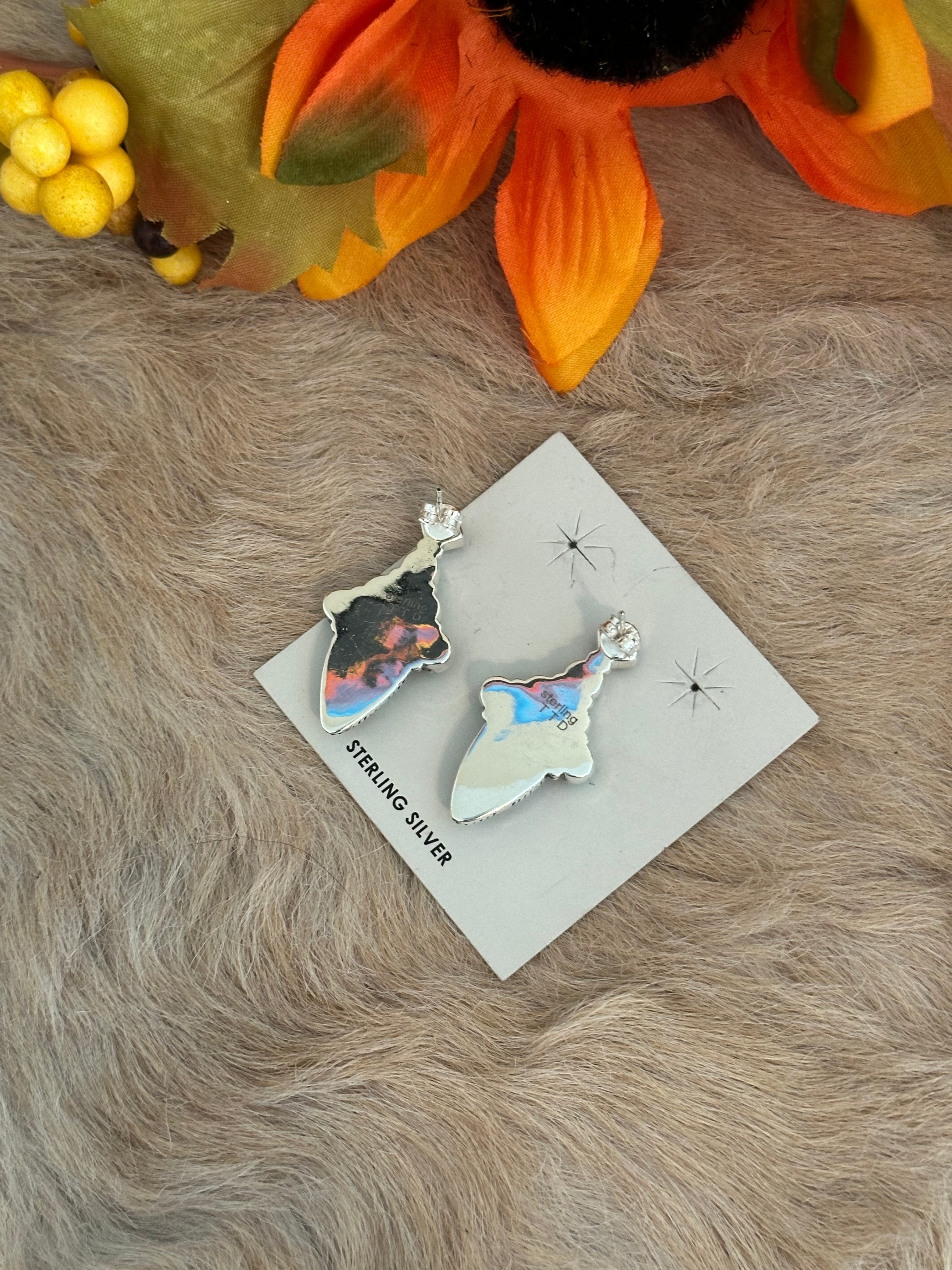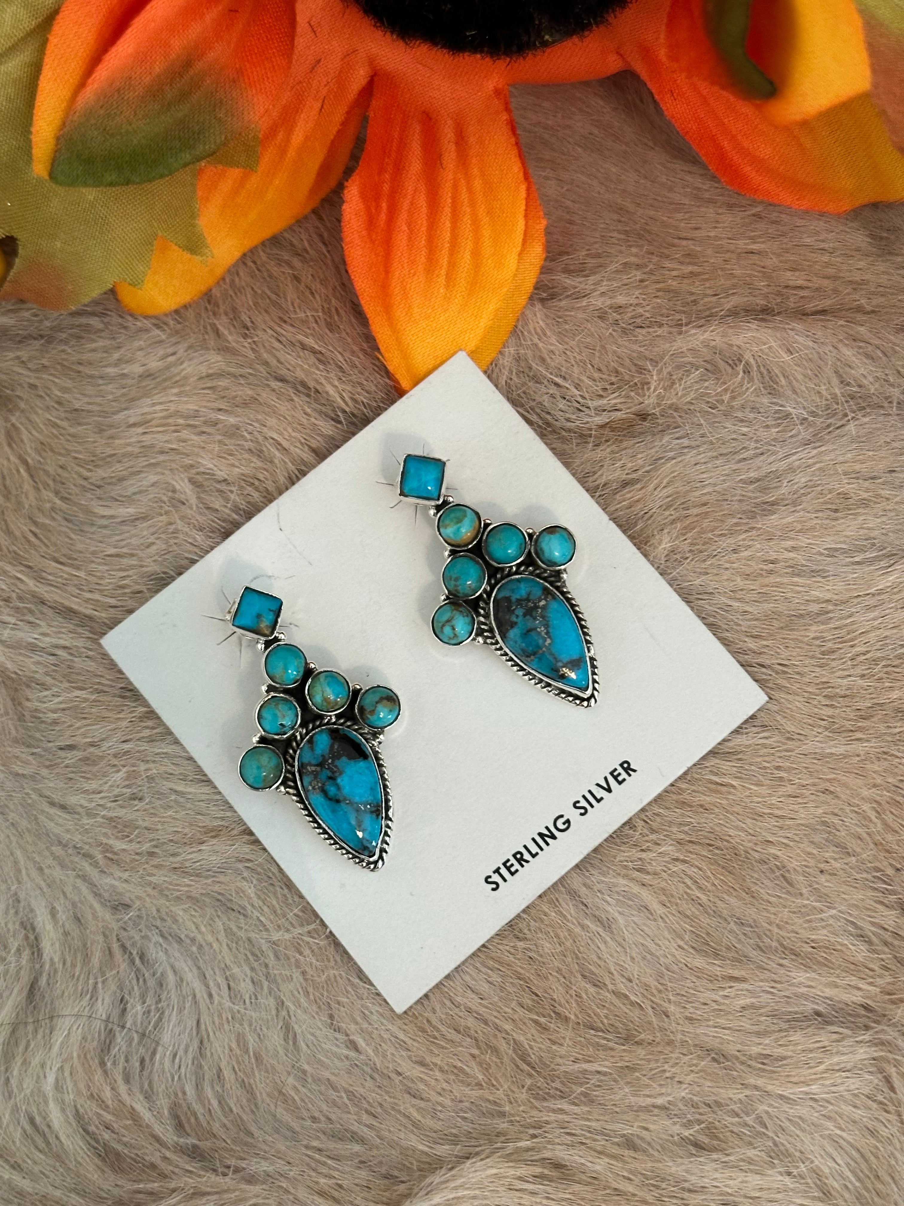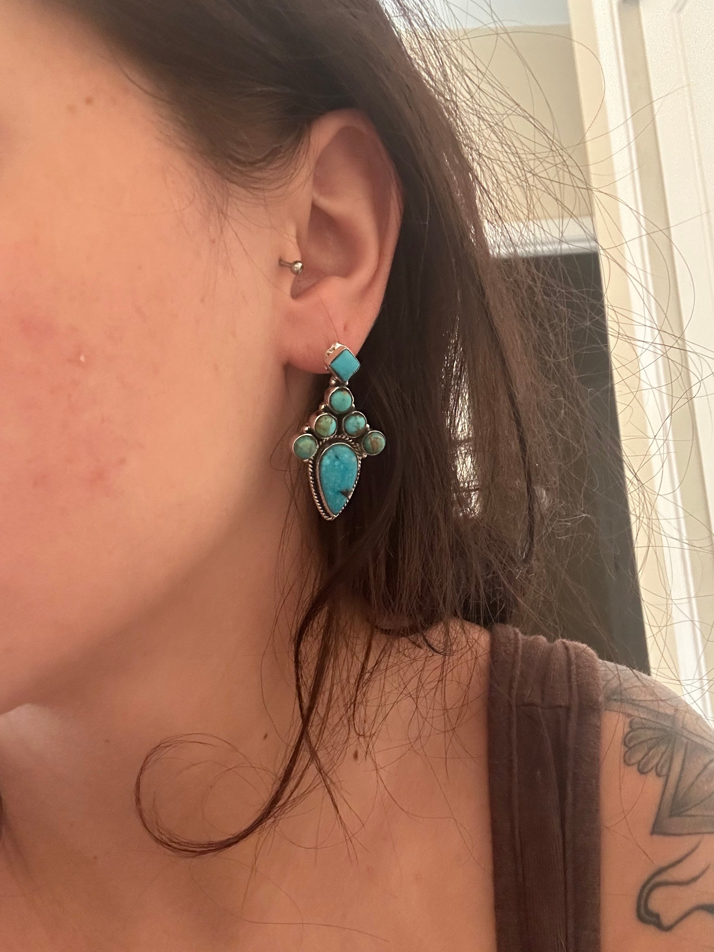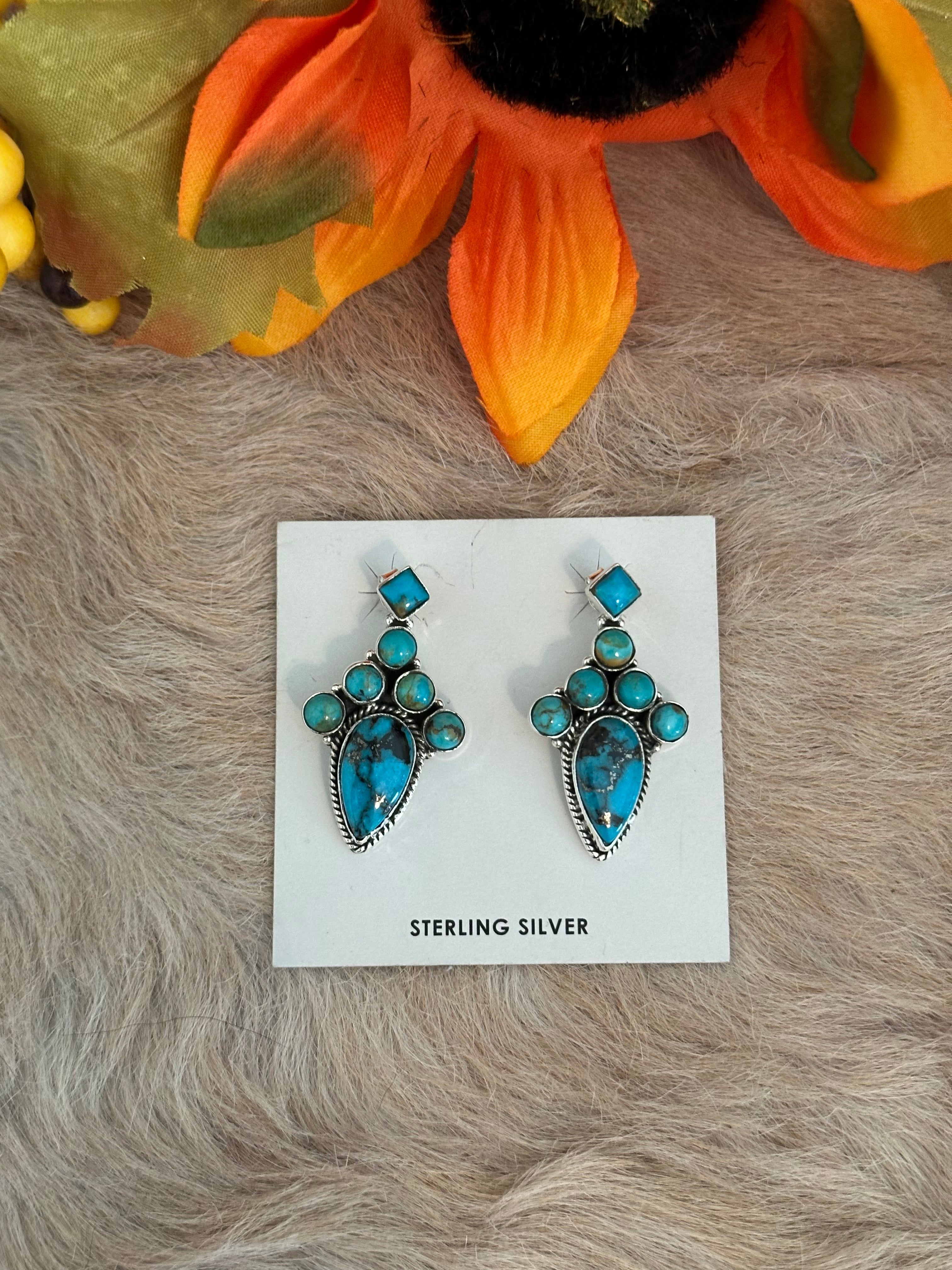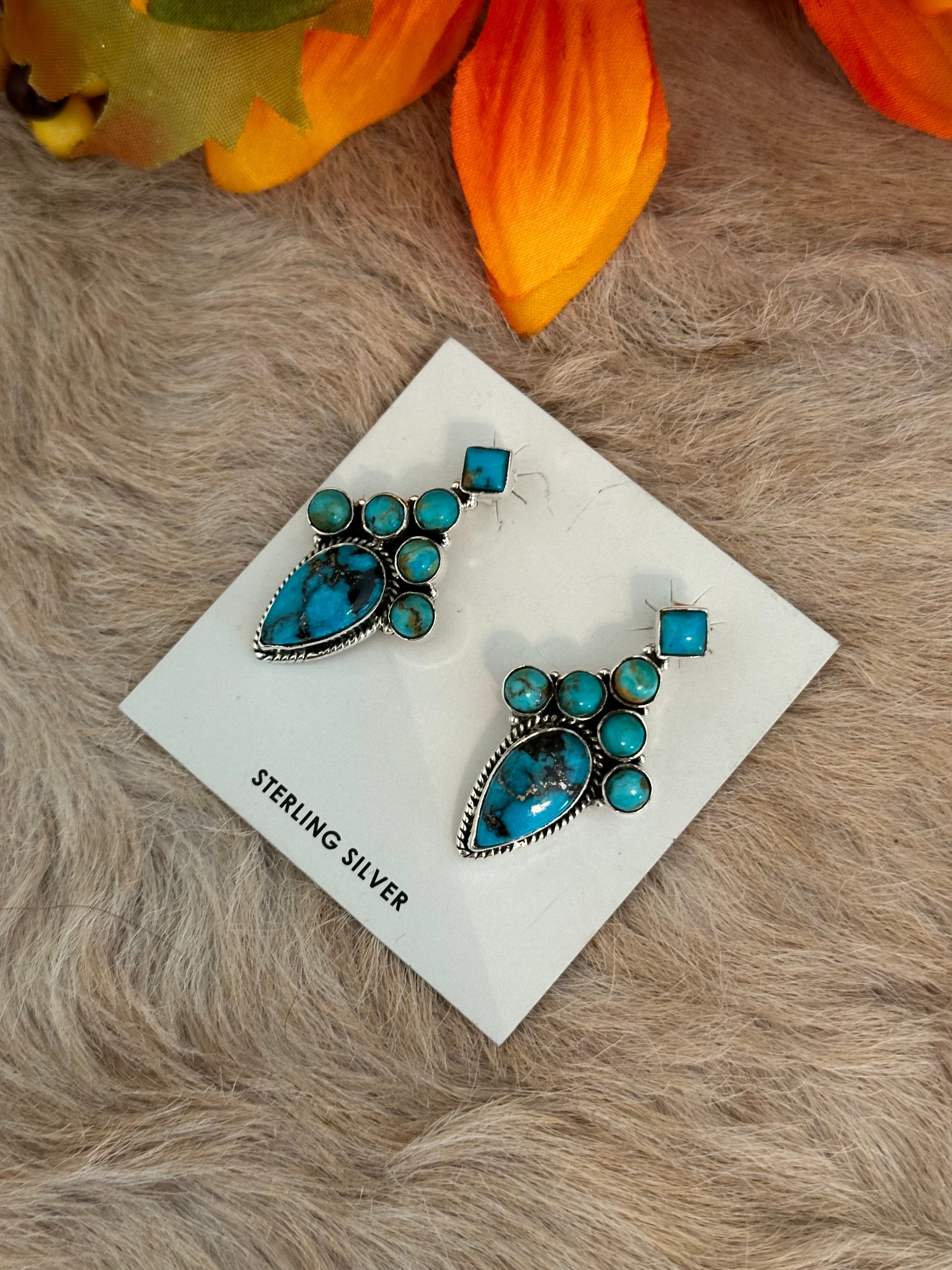 Unique post cluster earrings. Southwest Handmade Kingman Turquoise & Sterling Silver Post Earrings. It measures 1 5/8 inches long and just over 3/4 of an inch wide. Signed by the artist and stamped sterling silver.