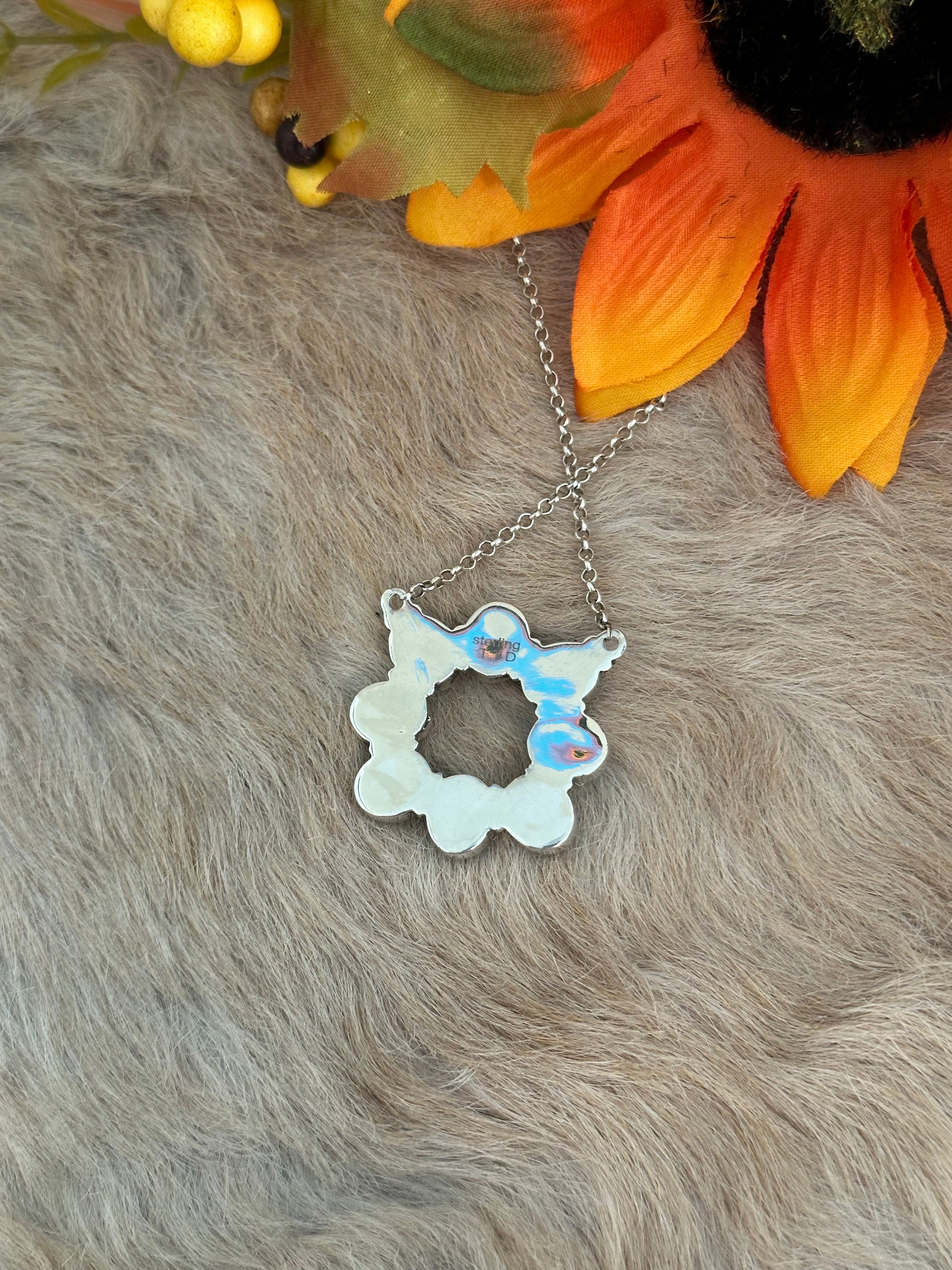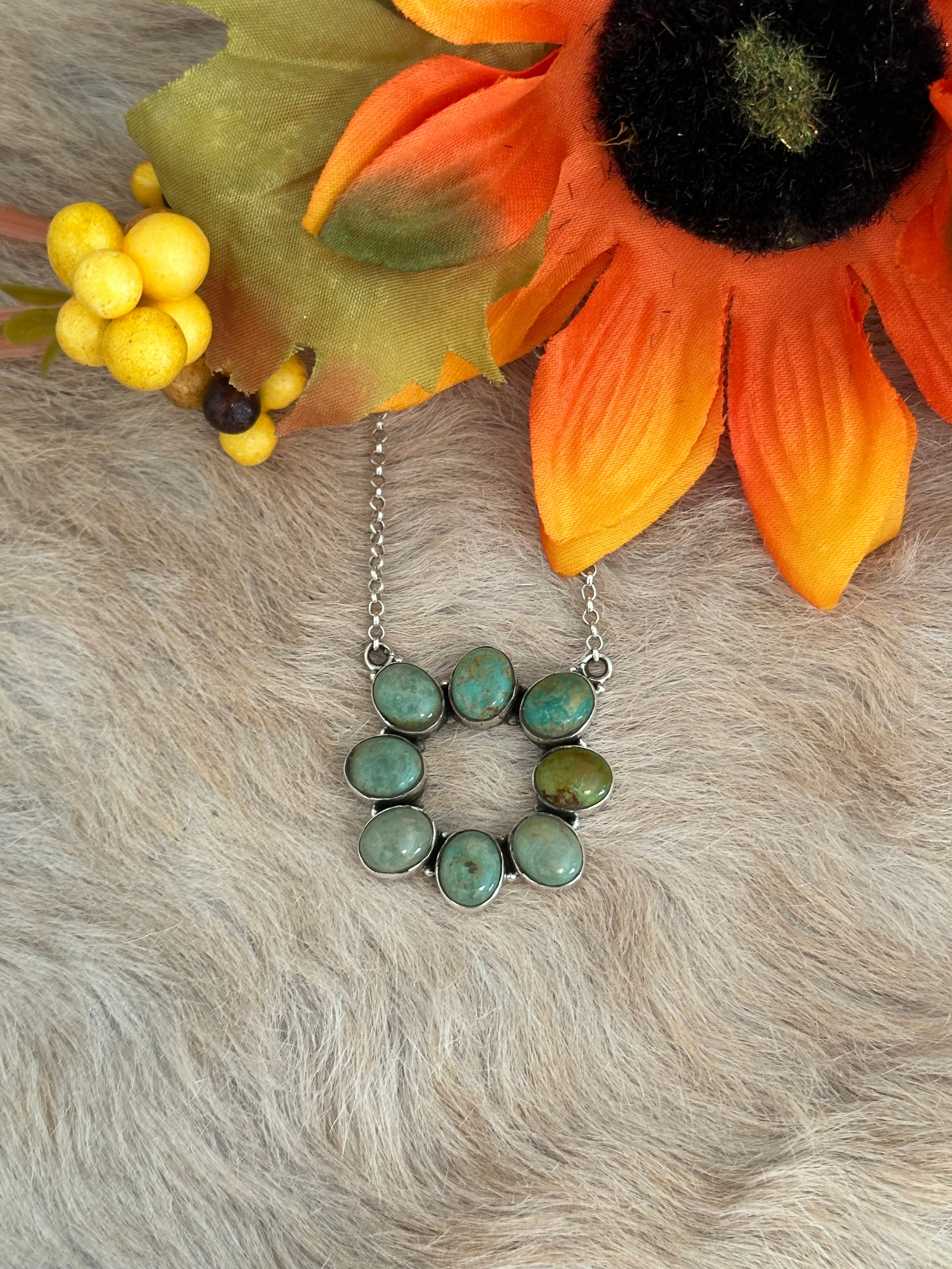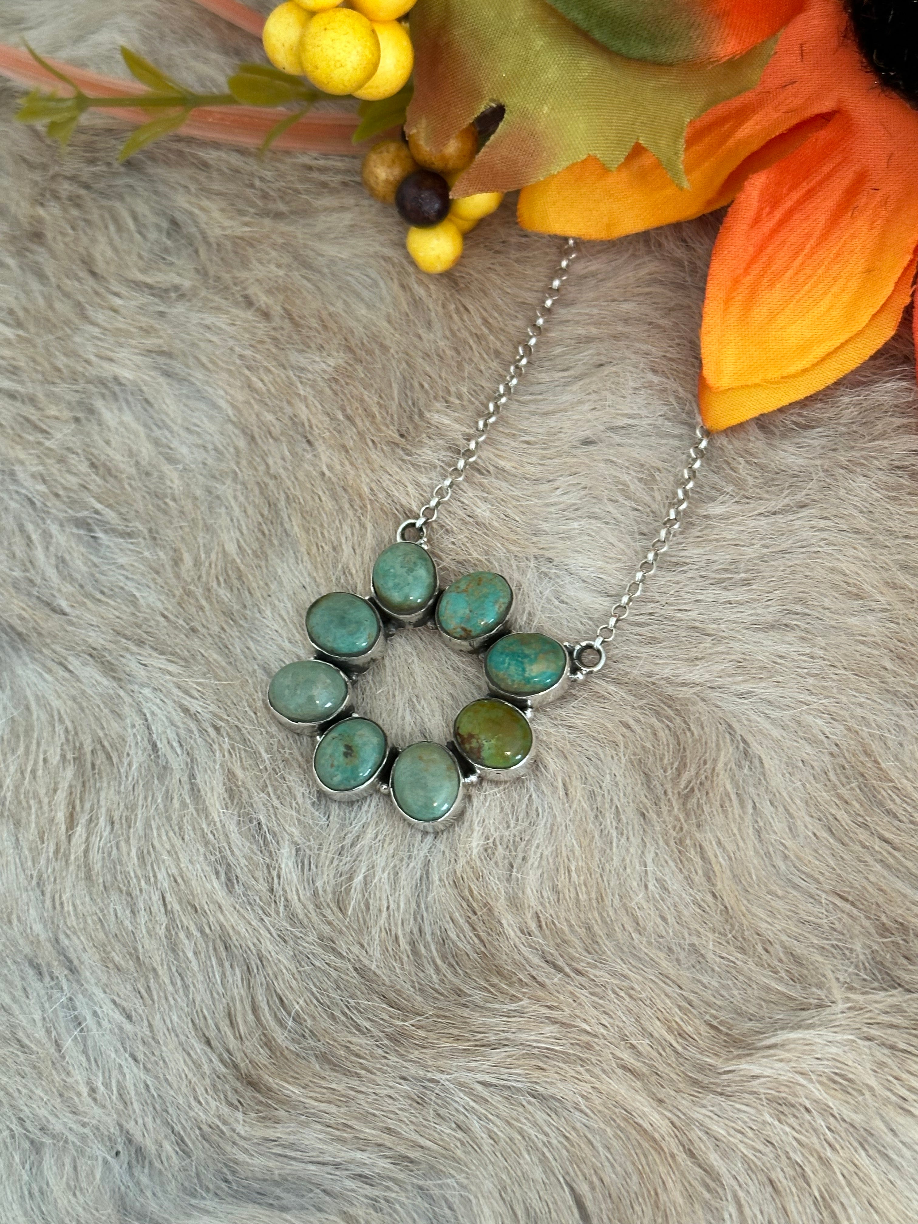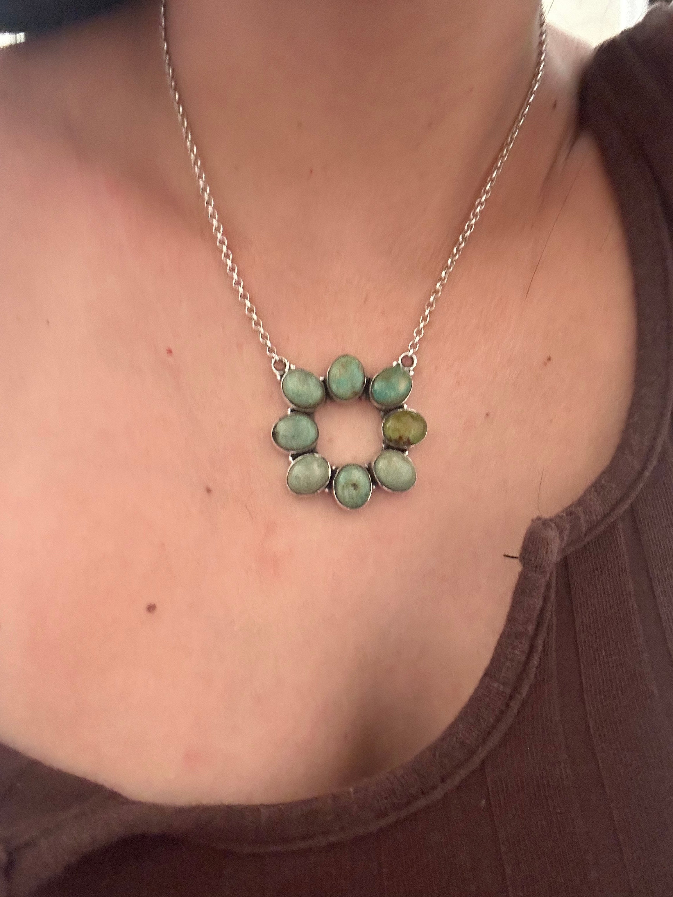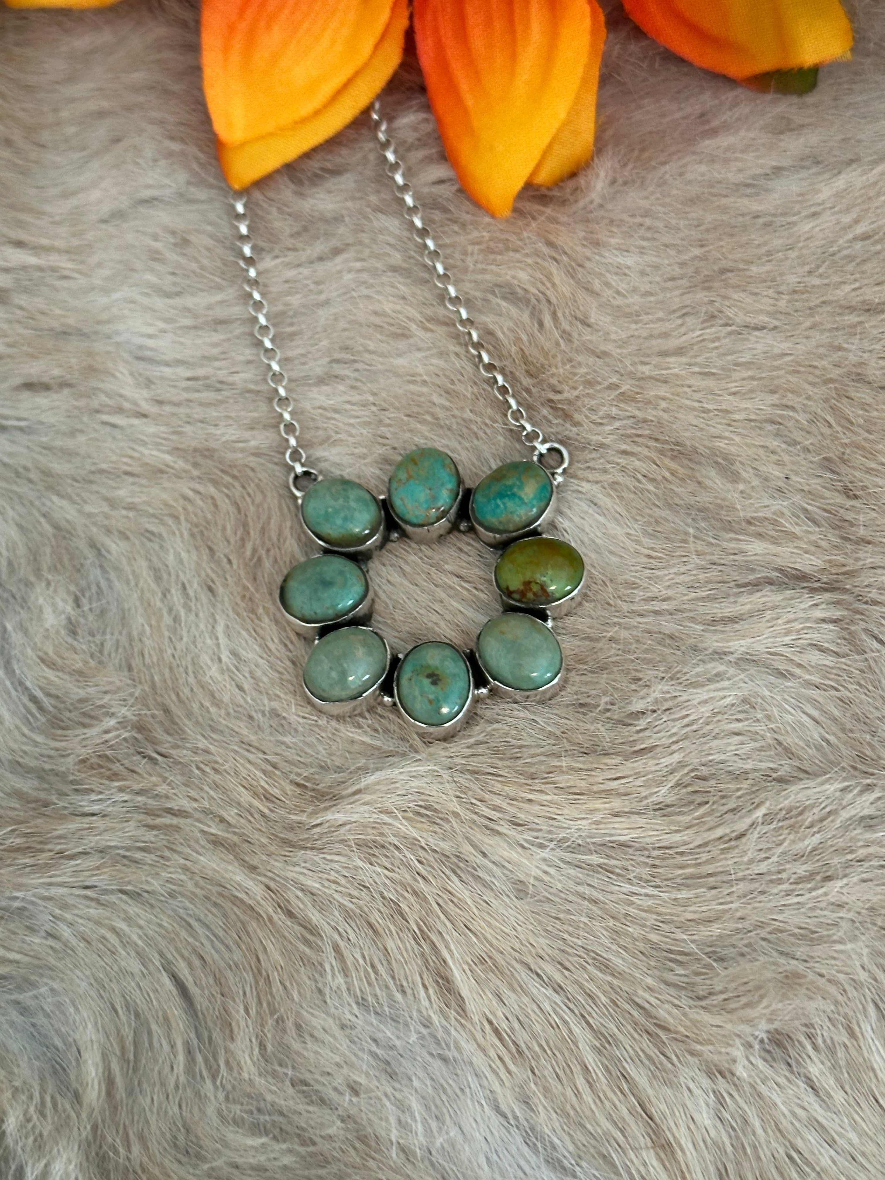 Beautiful cluster necklace. Southwest Made Kingman Turquoise & Sterling Silver Necklace. It measures 17 inches long with hang while the chain by itself measures 14 inches long and can be adjusted down to 12 1/2 inches. Signed by the artist and stamped sterling silver.