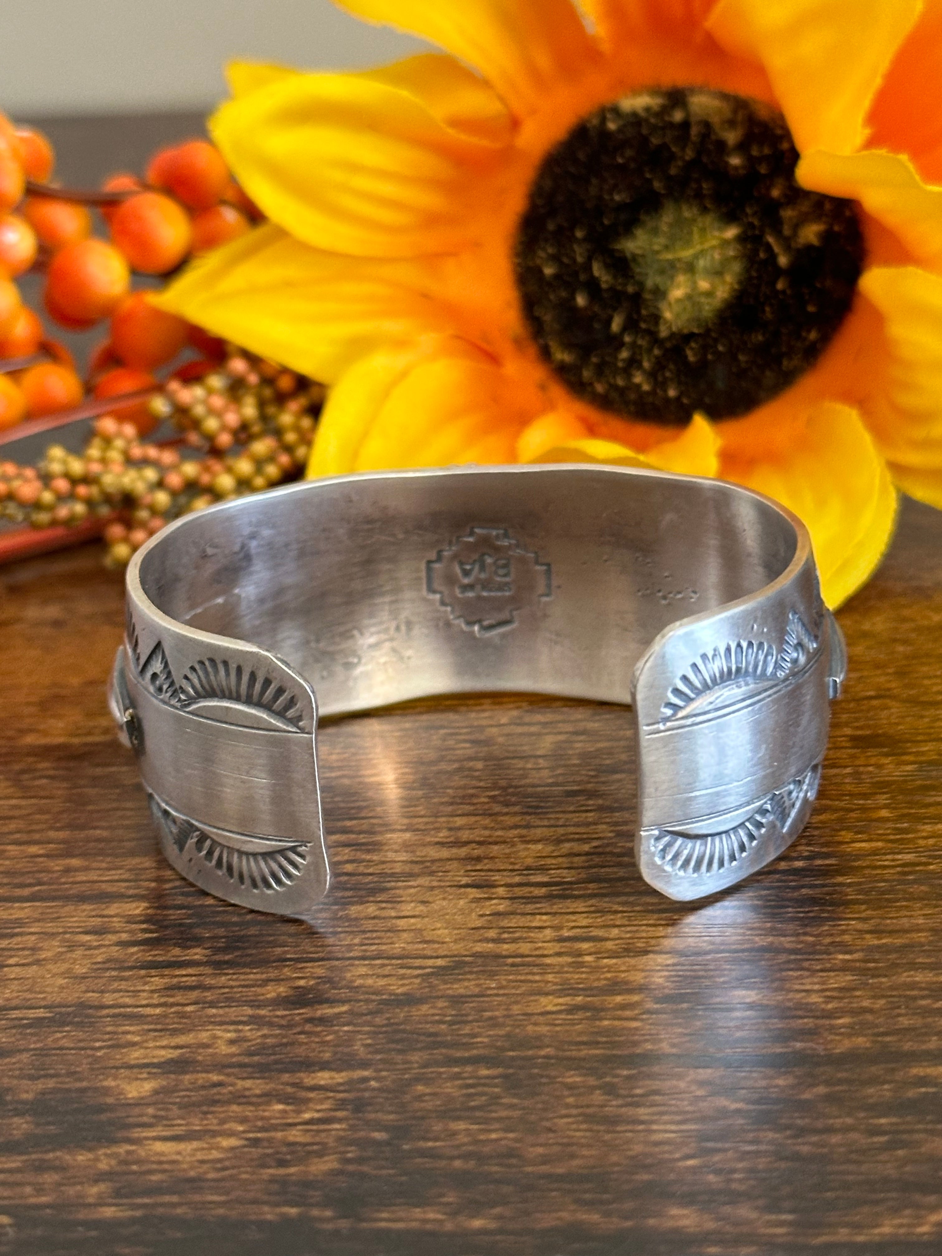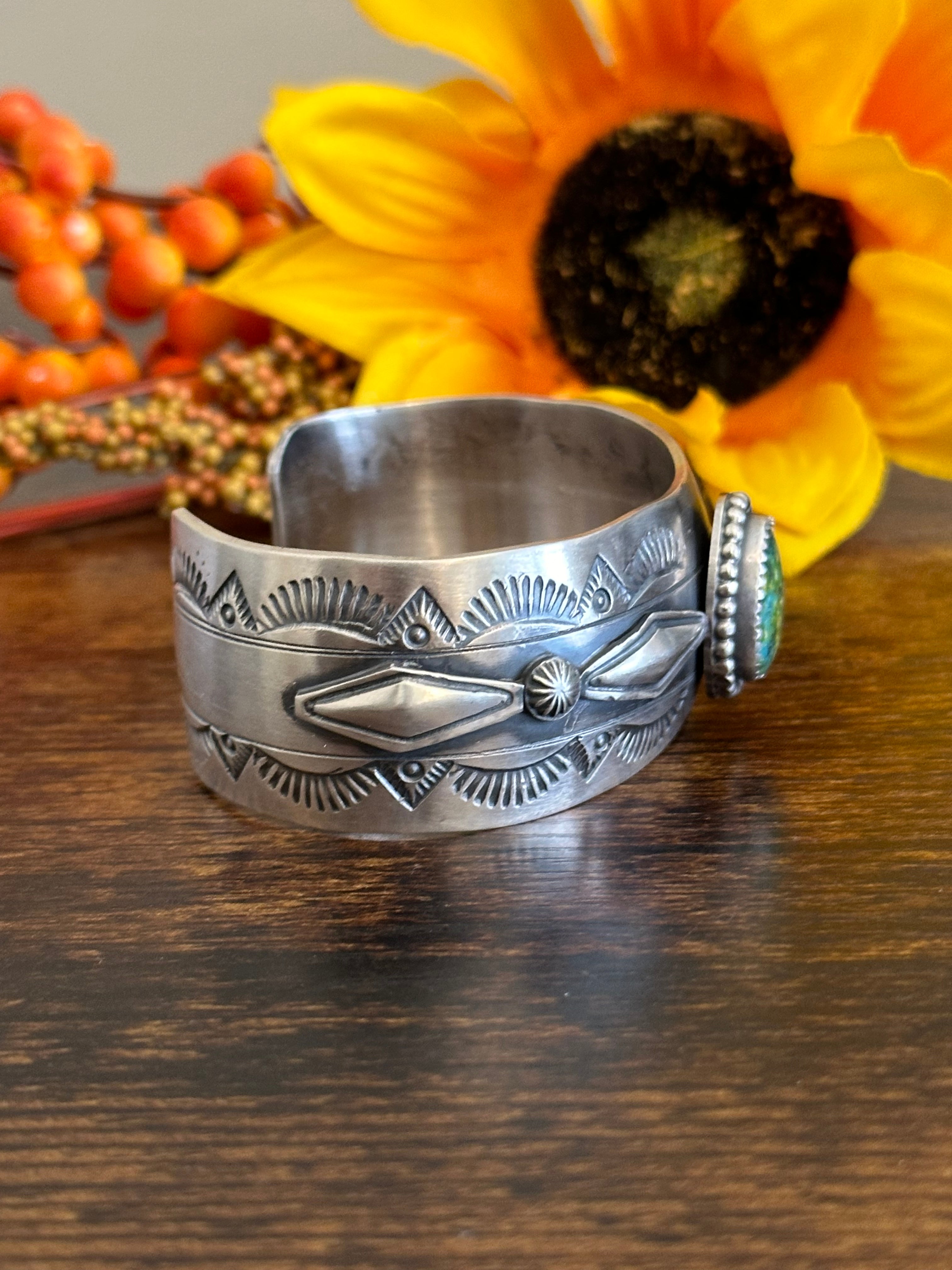 Boyd Ashley Sonoran Gold Turquoise & Sterling Silver Cuff Bracelet. It measures 1 inch wide with an inside circumference 5 7/8 inches and a gap of 1 inch. Signed by artist and stamped sterling silver. Cuff has flex to it.