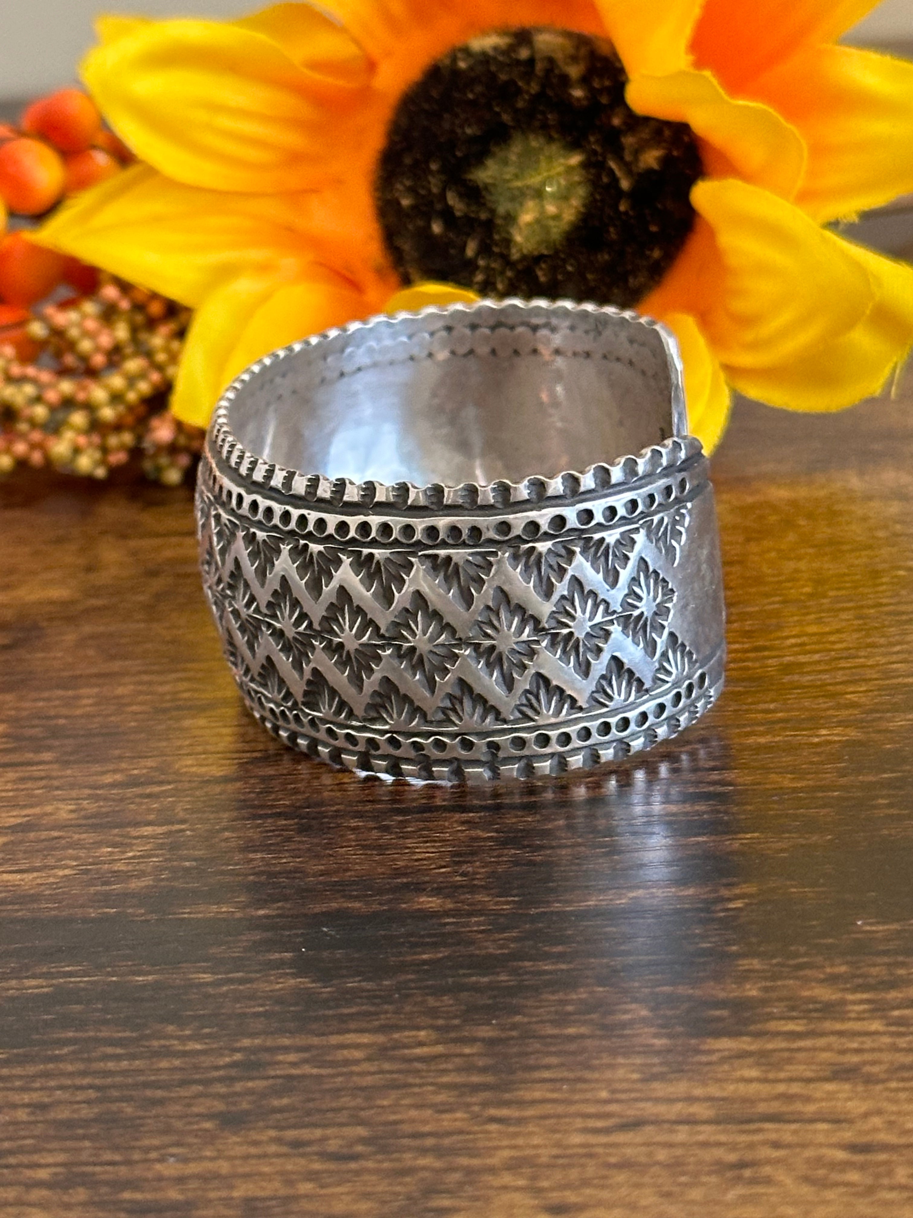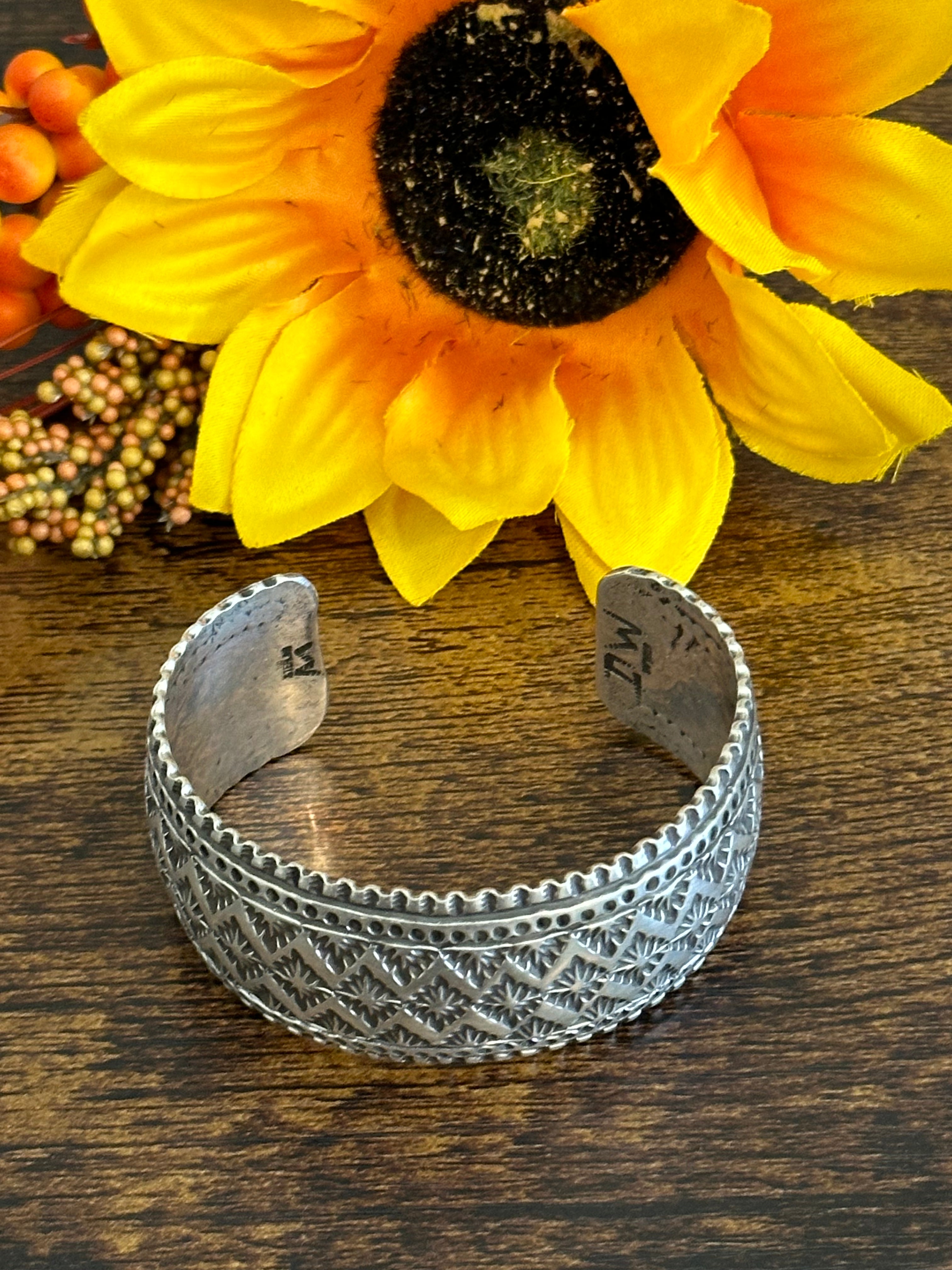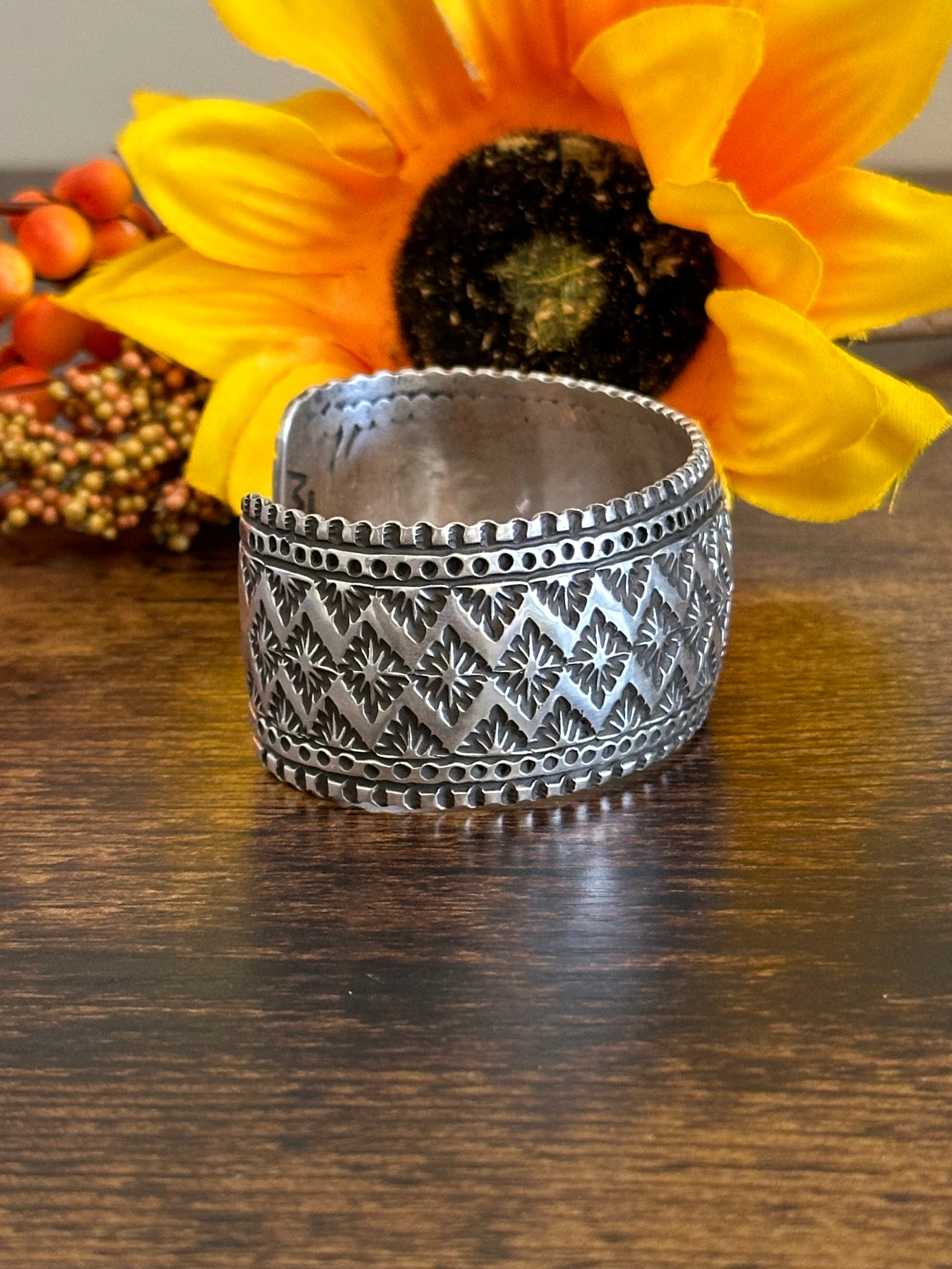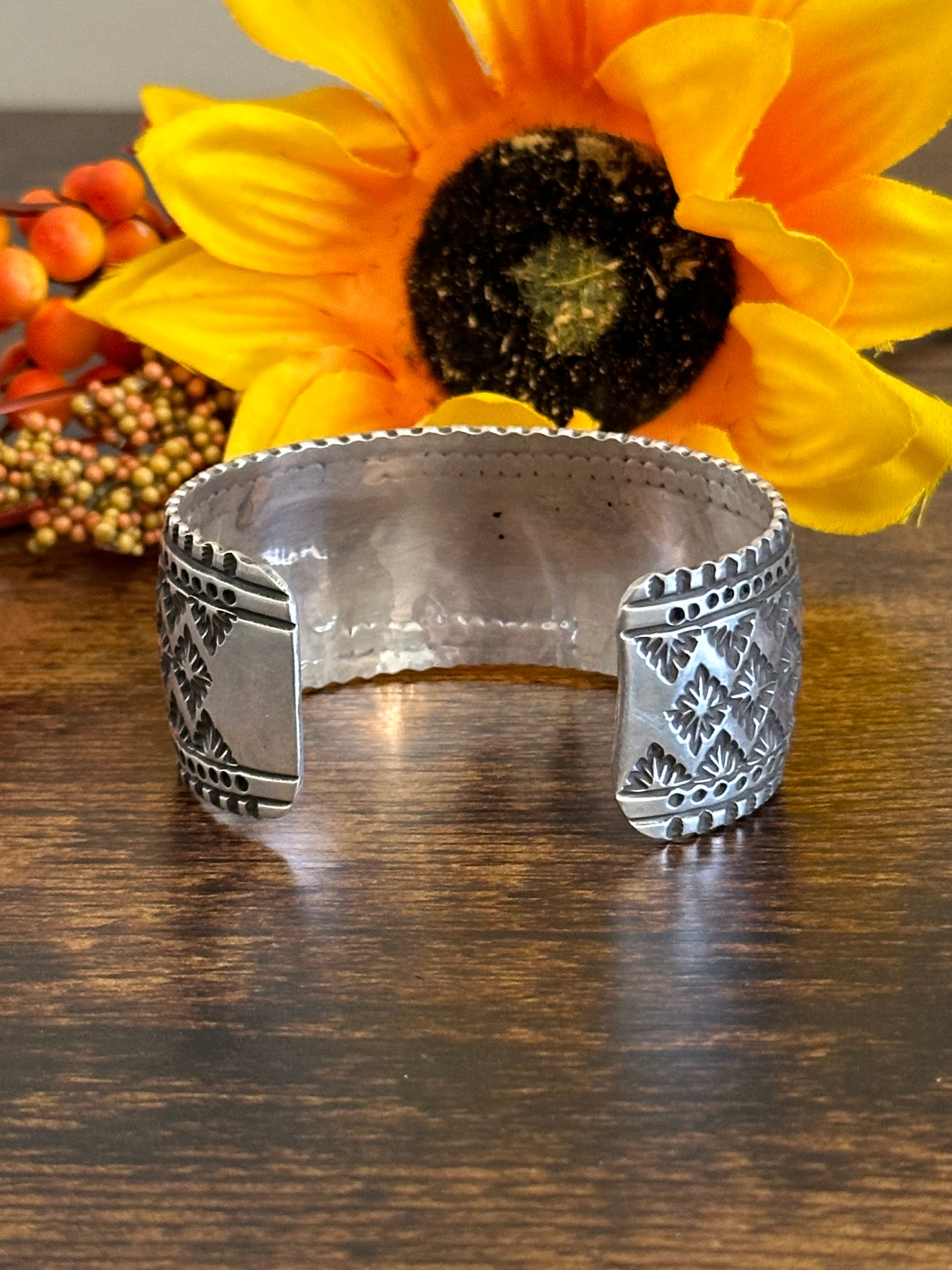 Navajo Made Sterling Silver Cuff Bracelet. It measures just over 1 1/8 inches wide with an inside circumference of 6 inches and a gap of 1 1/4 inches. Signed by artist and stamped sterling silver. Cuff has flex to it.